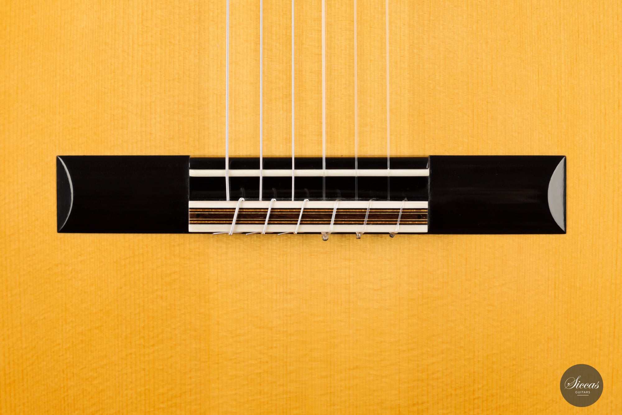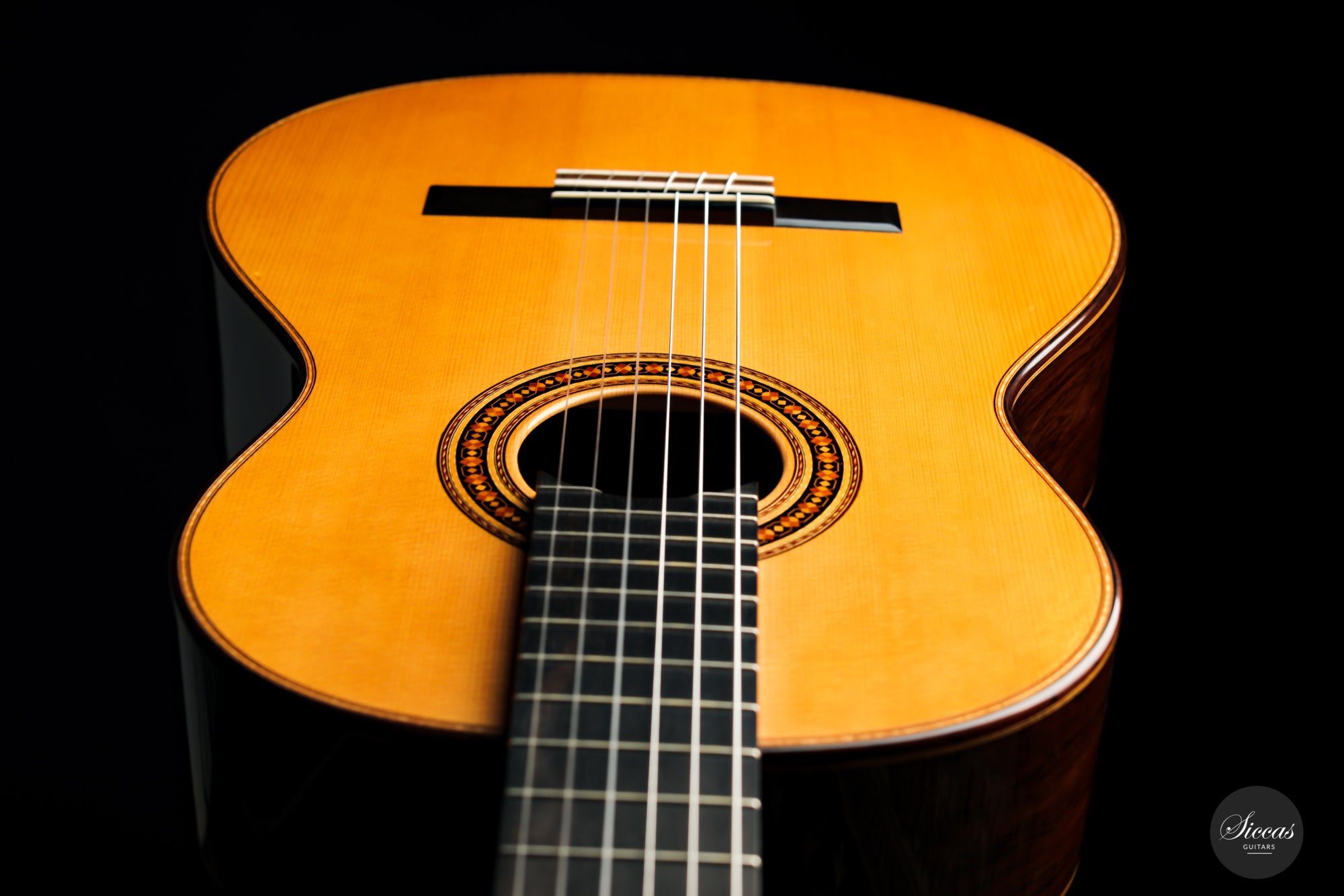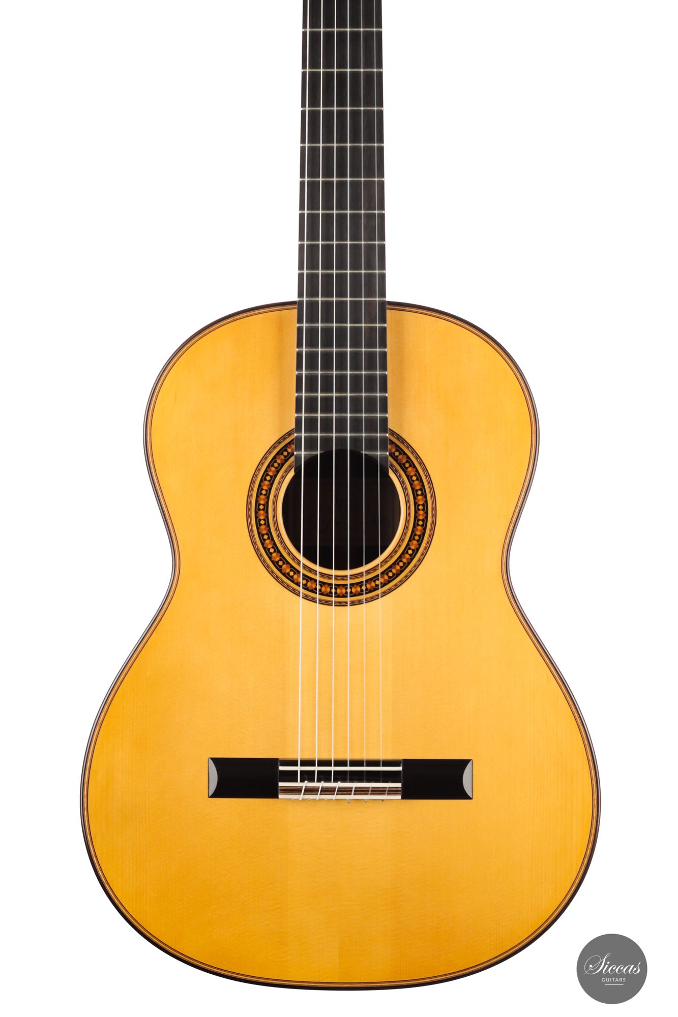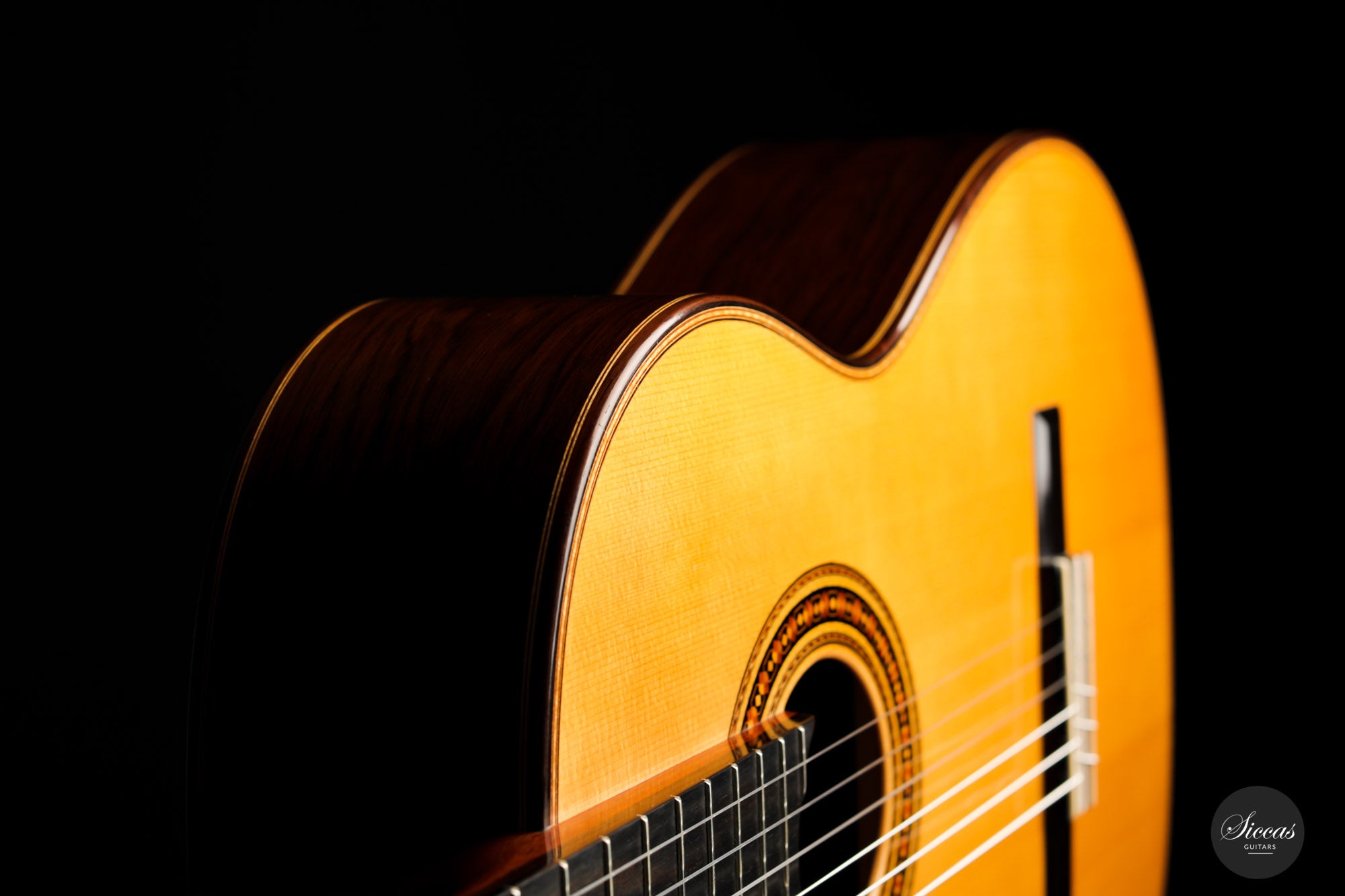This wonderful guitar is an absolute powerhouse, built with a spruce top and a fine CITES-certified Rio rosewood for the back and sides. The traditional fan bracing is composed of spruce and cedar bracing arranged in a unique way to optimize sound production. As a result, this instrument offers generous harmonic resonance, a full sound, and excellent dynamic capabilities. It is in very nice condition with only a few playing marks. The stylefully engraved Scheller tuners underline furthermore the classy character of this concert guitar of the highest quality.