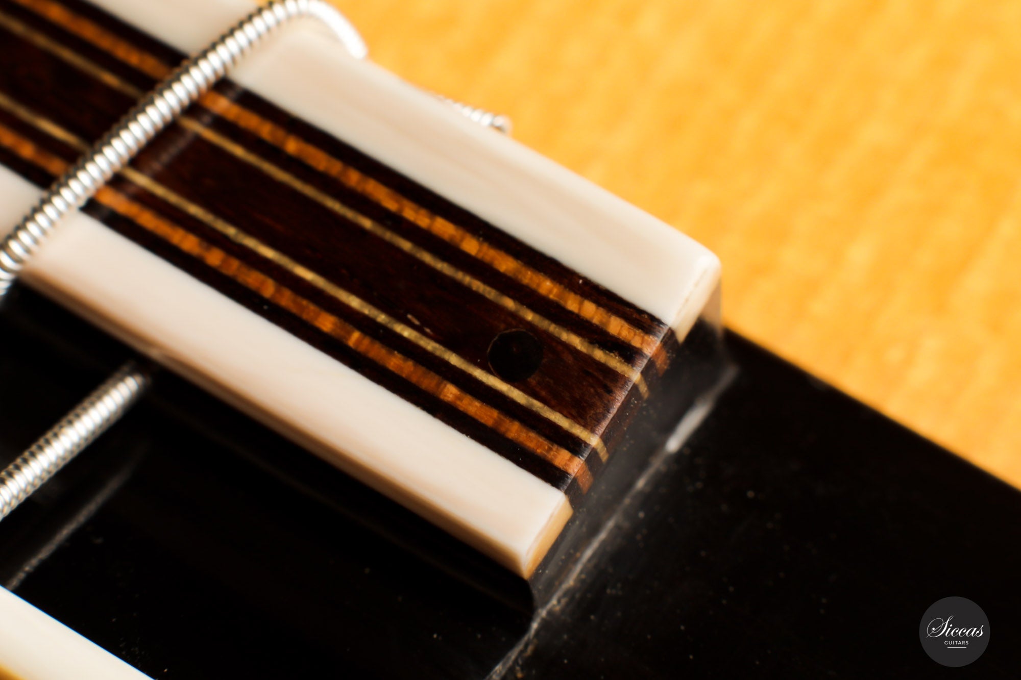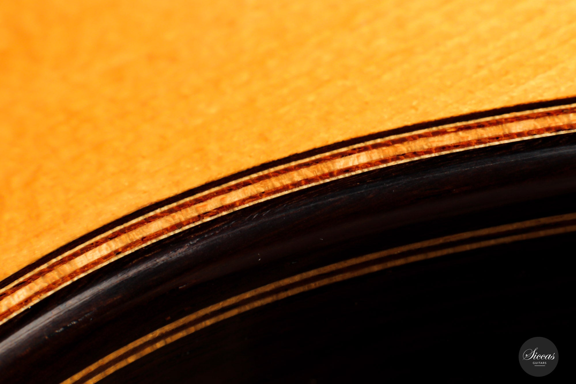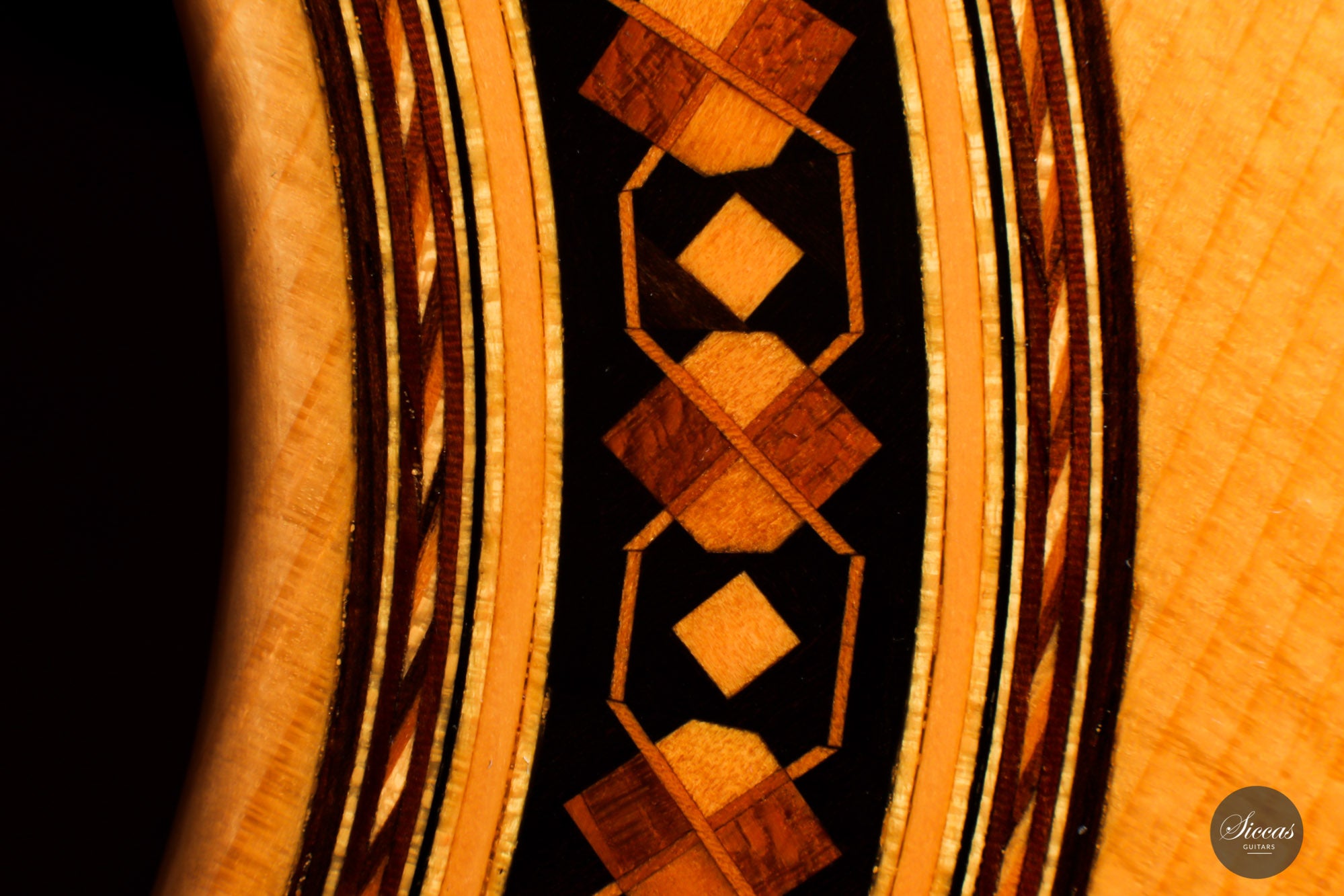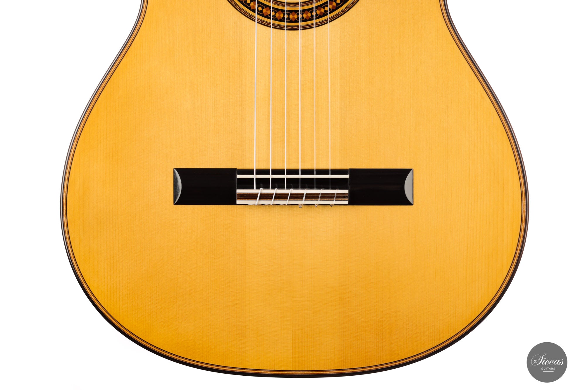 This wonderful guitar is an absolute powerhouse, built with a spruce top and a fine CITES-certified Rio rosewood for the back and sides. The traditional fan bracing is composed of spruce and cedar bracing arranged in a unique way to optimize sound production. As a result, this instrument offers generous harmonic resonance, a full sound, and excellent dynamic capabilities. It is in very nice condition with only a few playing marks. The stylefully engraved Scheller tuners underline furthermore the classy character of this concert guitar of the highest quality.