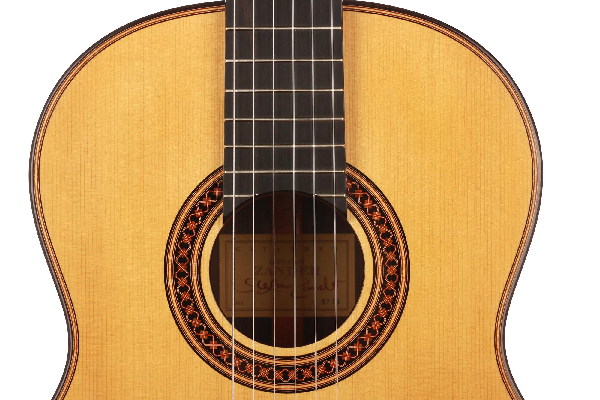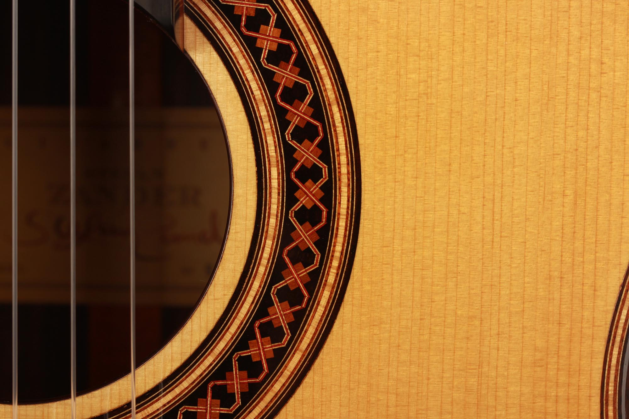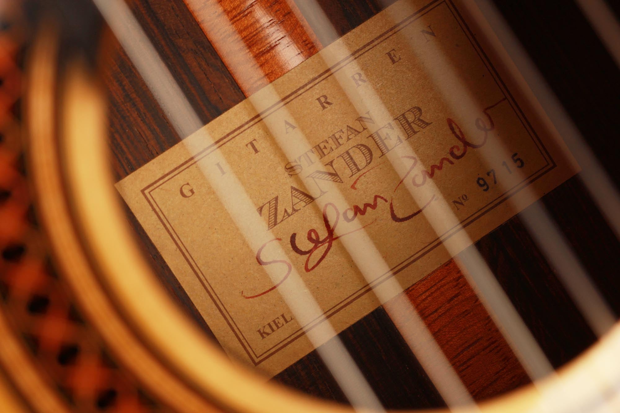 Stefan Zanders Gitarrenwerkstatt befindet sich in der Kieler Innenstadt. Er baut sowohl klassische als auch akustische Gitarren und seine Arbeit erfüllt höchste Ansprüche, dies ist unsere erste Gitarre von Stefan und wir sind mehr als überrascht. Es besteht aus einer Fichten-Doppelspitze und einem erhabenen CITES-zertifizierten brasilianischen Palisander für Boden und Seiten. Nicht nur die Qualität des Gitarrenbaus ist ausgezeichnet, auch diese Gitarre klingt hervorragend.