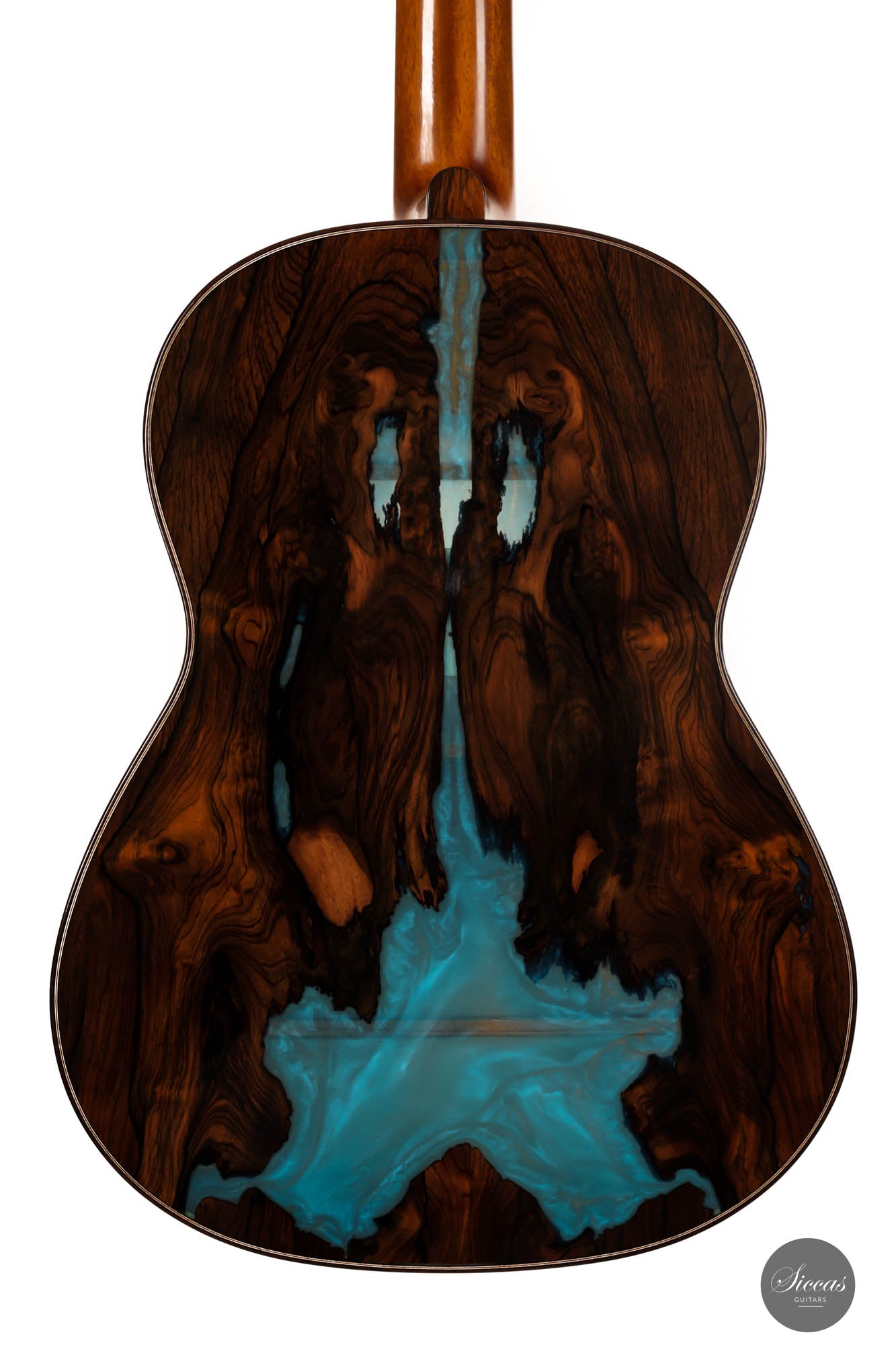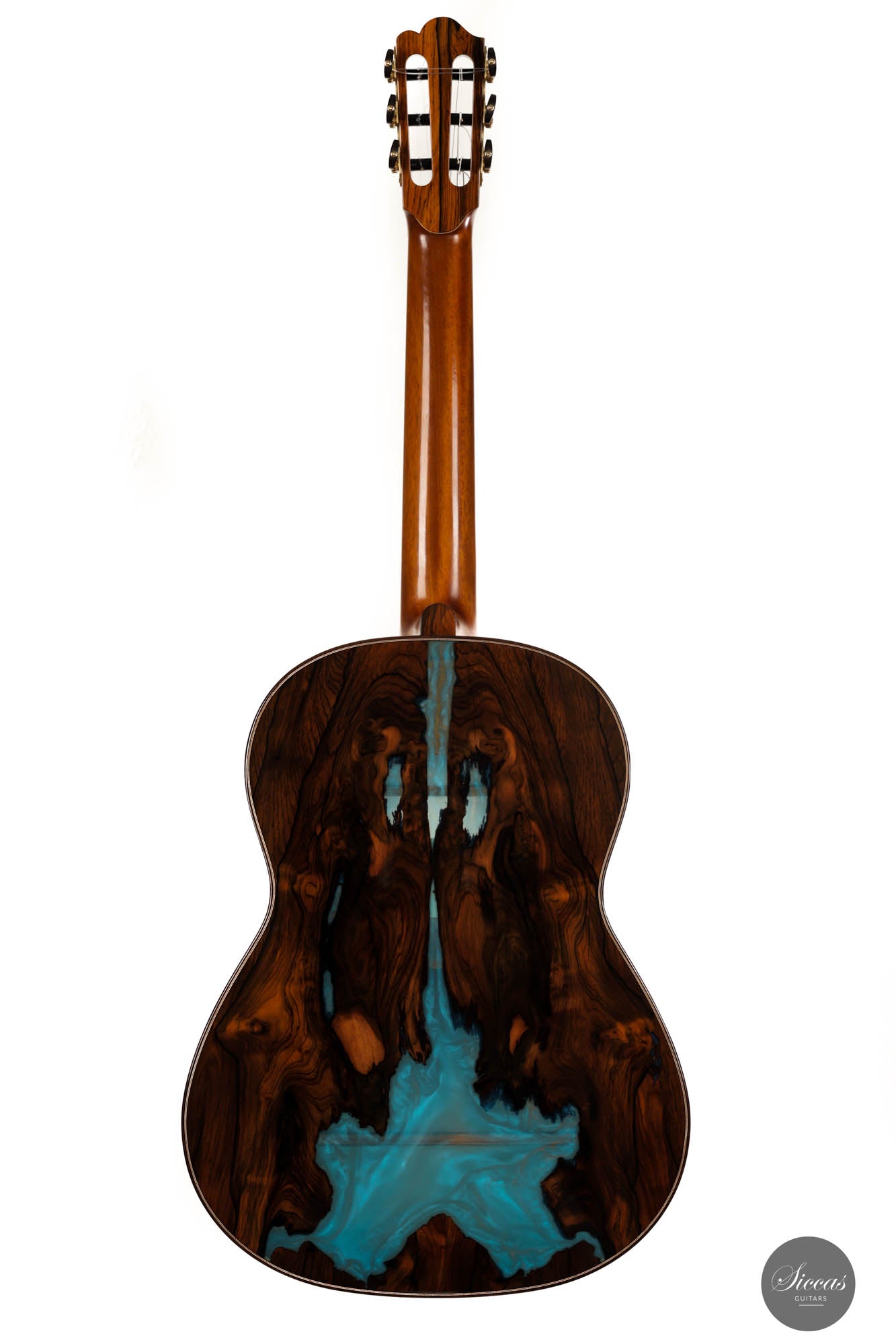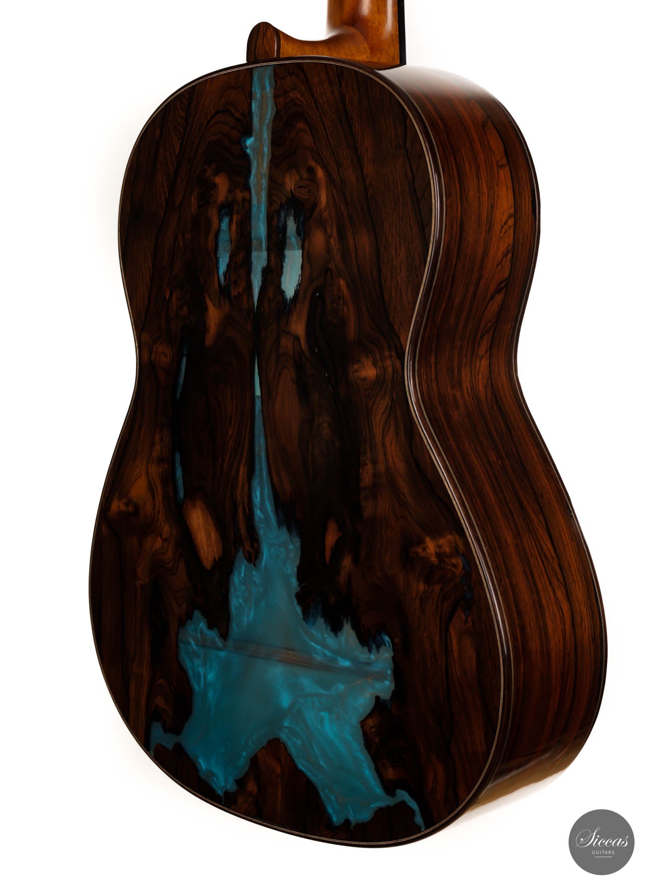 This new 2019 Stefano Poligenis guitar is a unique, one-of-a-kind classical guitar. This exceptional instrument boasts a stunning CITES-certified Brazilian rosewood back and sides, hand-selected for its breathtaking figured motifs and completed with vibrant blue epoxy filling for a truly mesmerizing visual contrast. This is, to our knowledge, absolutely unique in the classical guitar world, and Stefanos achieved it masterfully. The result is a classical guitar that looks stunning and offers top-notch performance.