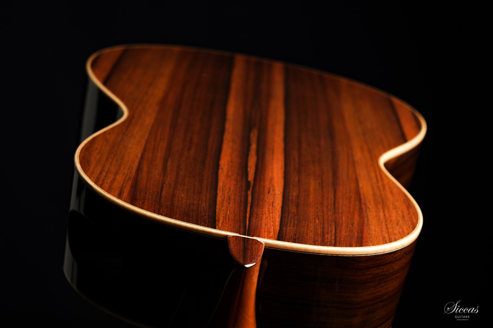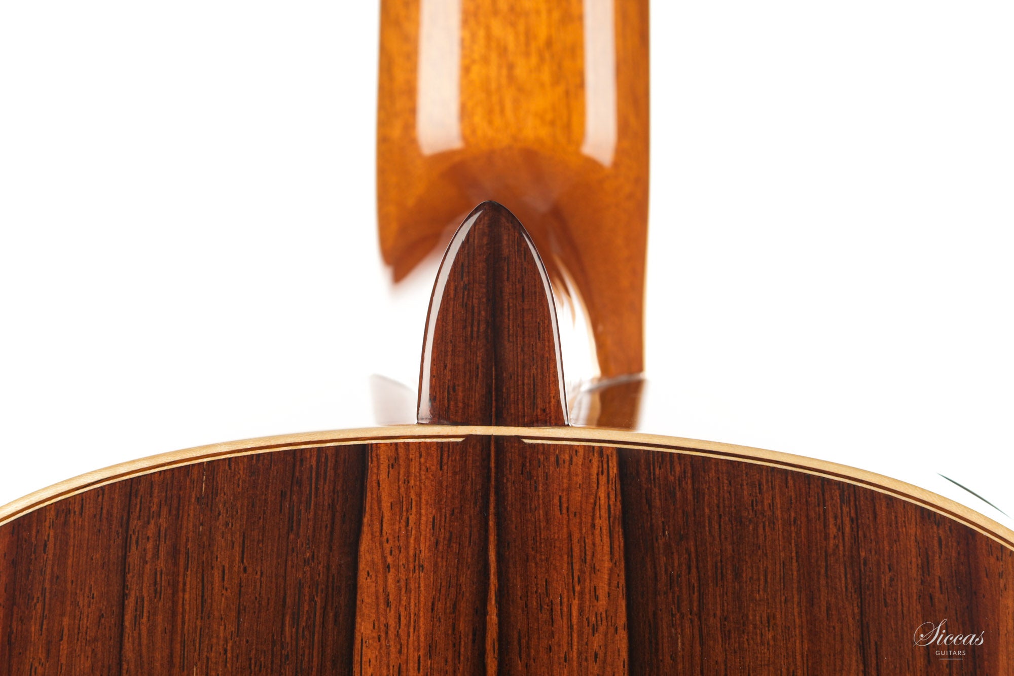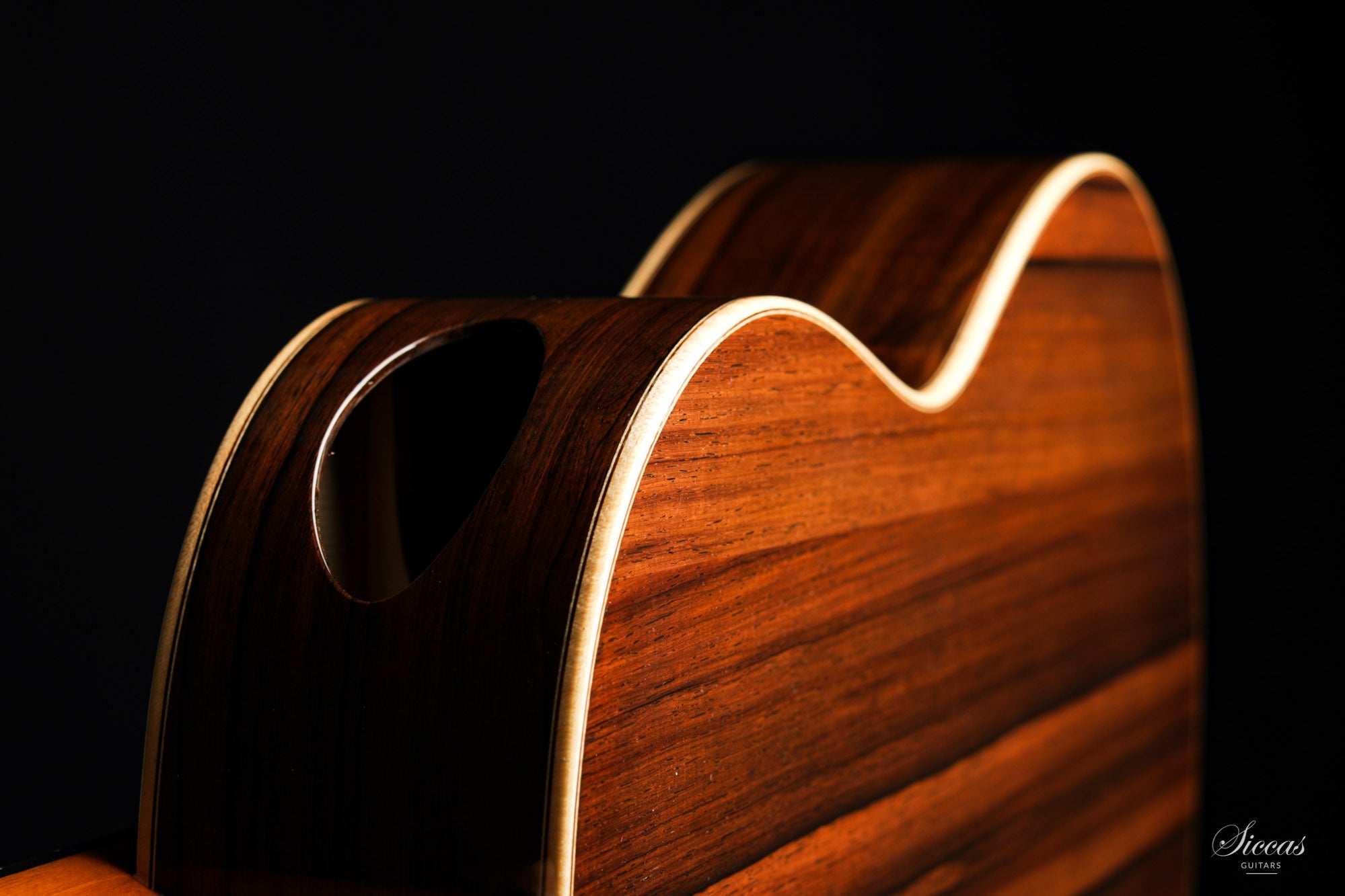 This guitar, in great condition, is built with a spruce top and Madagascar rosewood back and sides, which is a premium option in Stephan's workshop. Deeply rooted in modern aesthetics, this guitar has everything a guitarist seeking comfort dreams of: a raised fingerboard, a 64 cm scale, a slight radius on the fingerboard and an additional soundport on the side, which can also be closed with a belonging cover. Finally, the bracing is a subtle combination of both fan-shaped and lattice bracing, offering volume and richness of sound.