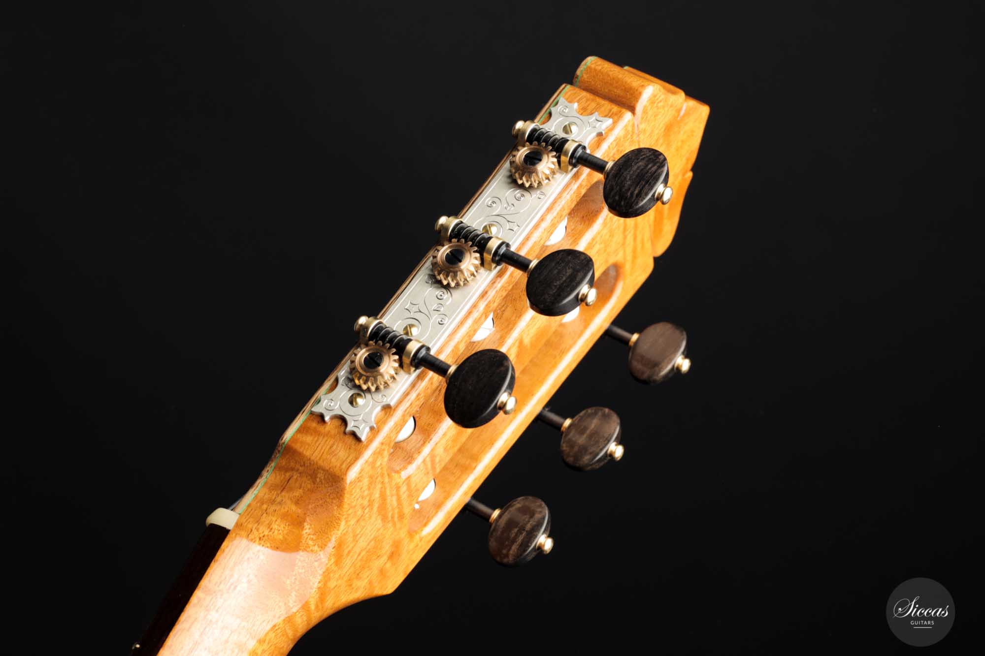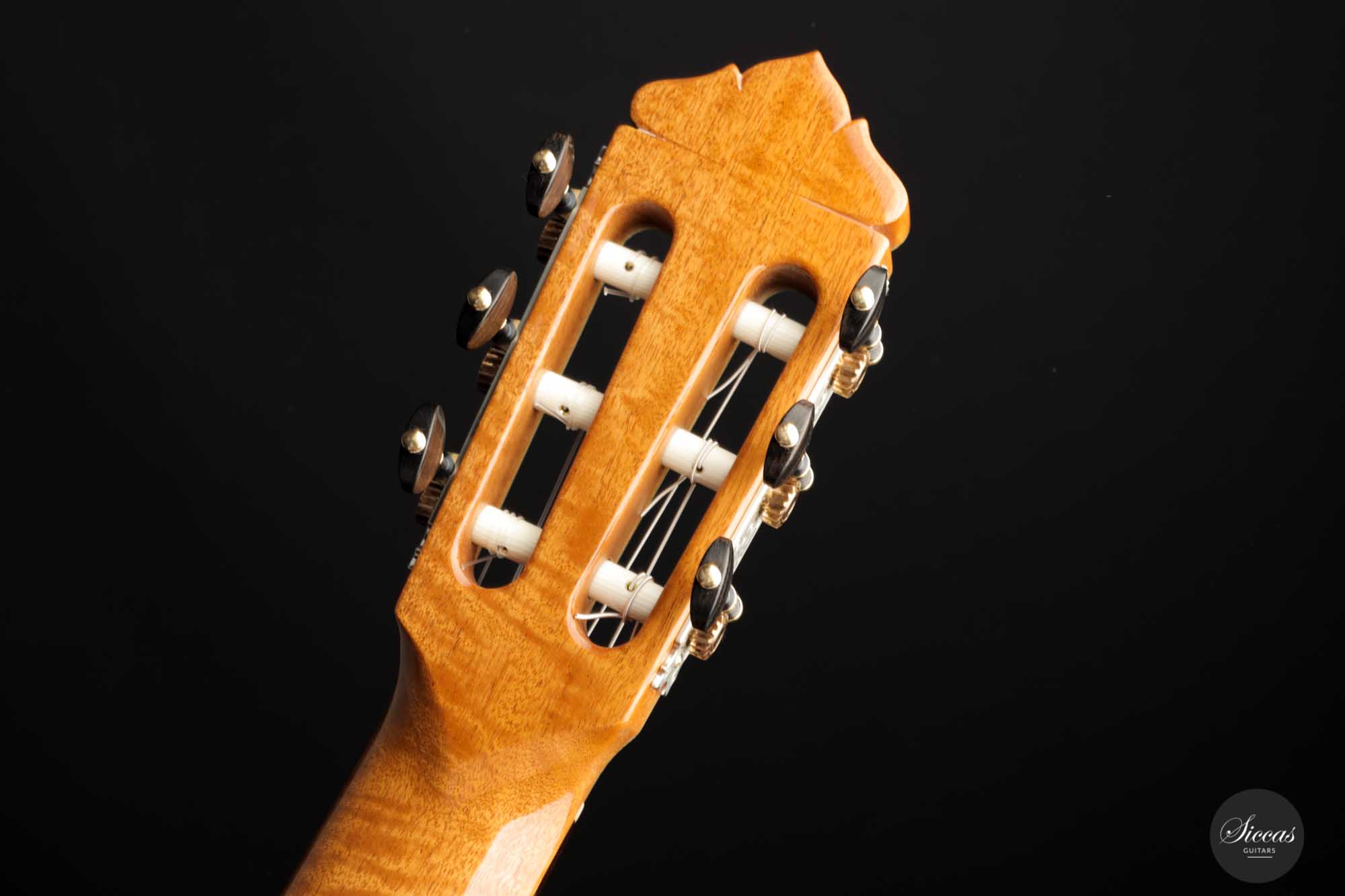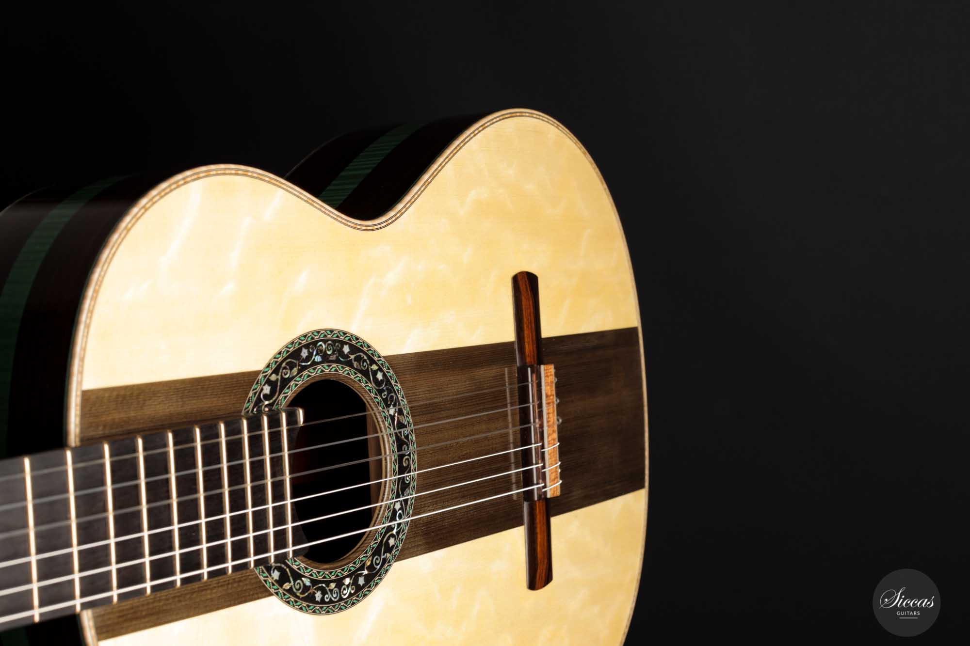 Diese 2022 gebaute Gitarre mit der Nummer 437 ist ein einzigartiges Kunstwerk. Das exklusive Modell mit dem Namen "Sueno en La Floresta" wurde mit den edelsten Hölzern gefertigt und ist eine Manifestation der Kunstfertigkeit Stephen Connors in seiner besten Form. Die dreiteilige Decke besteht an den Außenseiten aus europäischer Mondfichte, die eine atemberaubend schöne Haselung besitzt, und in der Mitte aus antikem Zedernholz, dessen Stamm jahrhundertelang im Wasser stand und durch Mineralien fast schwarz gefärbt wurde. Auf dem Weg zur Versteinerung erlangte es eine fantastische Dichte und hat nun einen glockenähnlichen Klang. Stephen hat dieses besondere Stück Zeder persönlich gerettet, als er im kanadischen British Columbia Stämme am Strand fand und sie anschließend selbst spaltete. Da es nicht breit genug für eine zweiteilige Decke war, entschied er sich, dieses Holz als Teil einer dreiteiligen Decke zu verwenden, wie es bereits Antonio de Torres oft tat, aber natürlich mit seinem eigenen Design und unter Verwendung einer Double-Top-Nomex-Konstruktion.