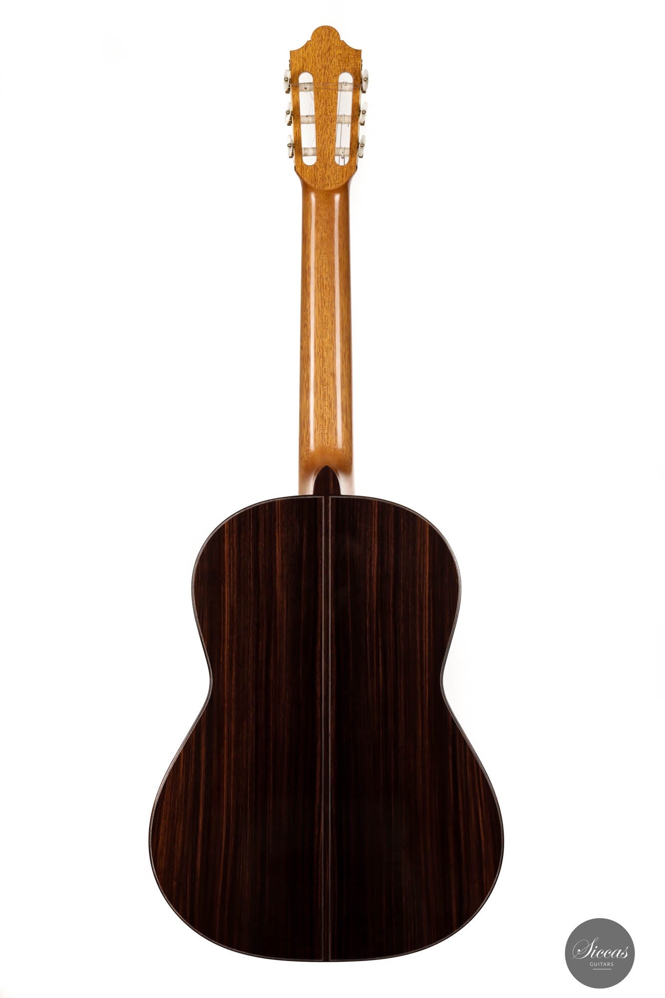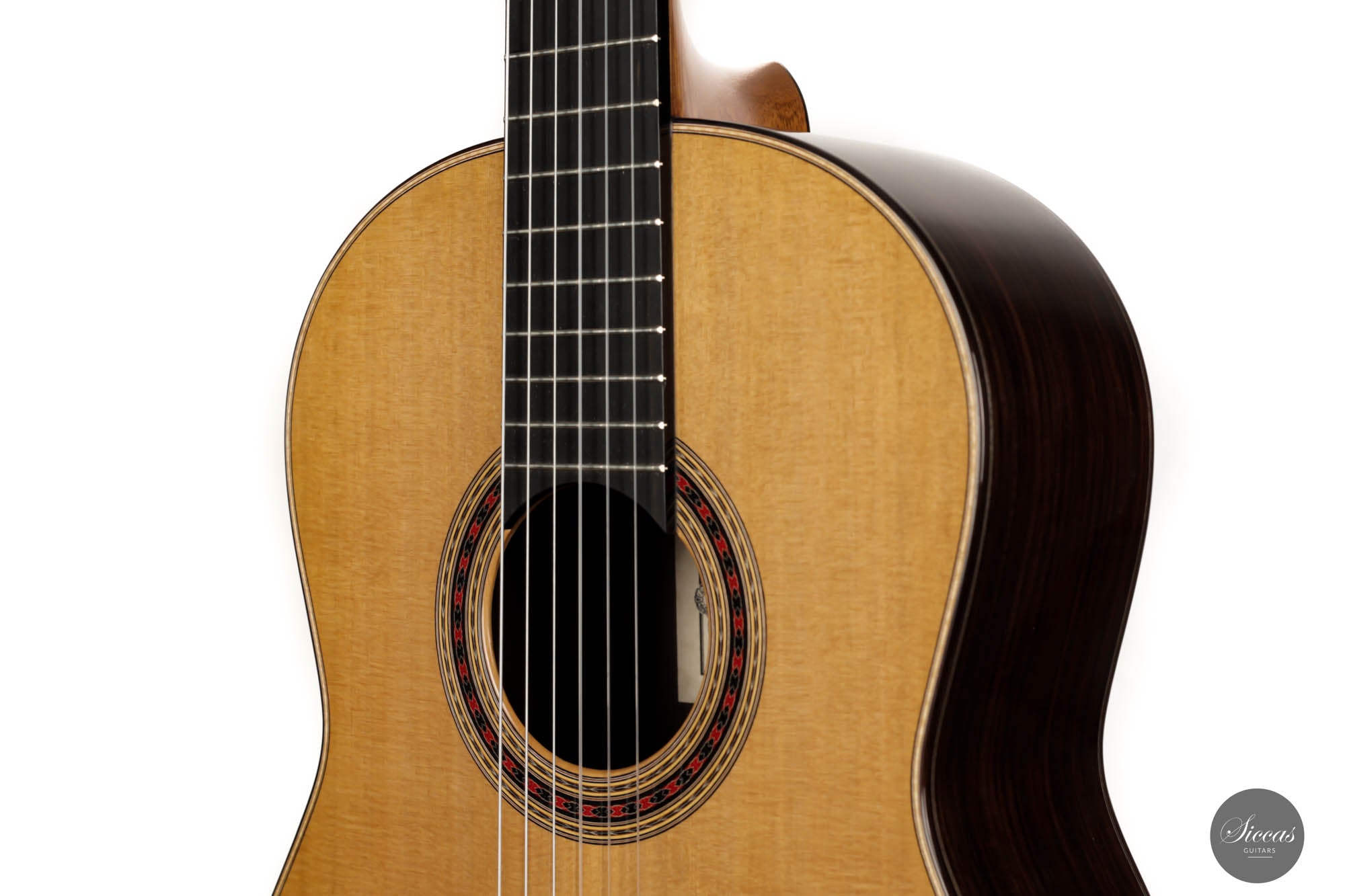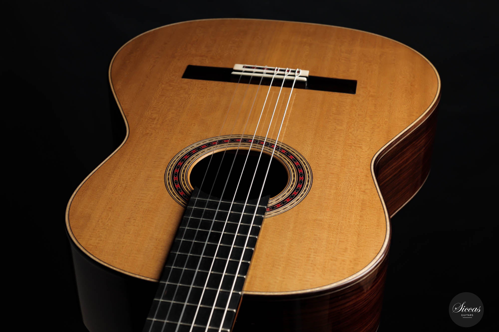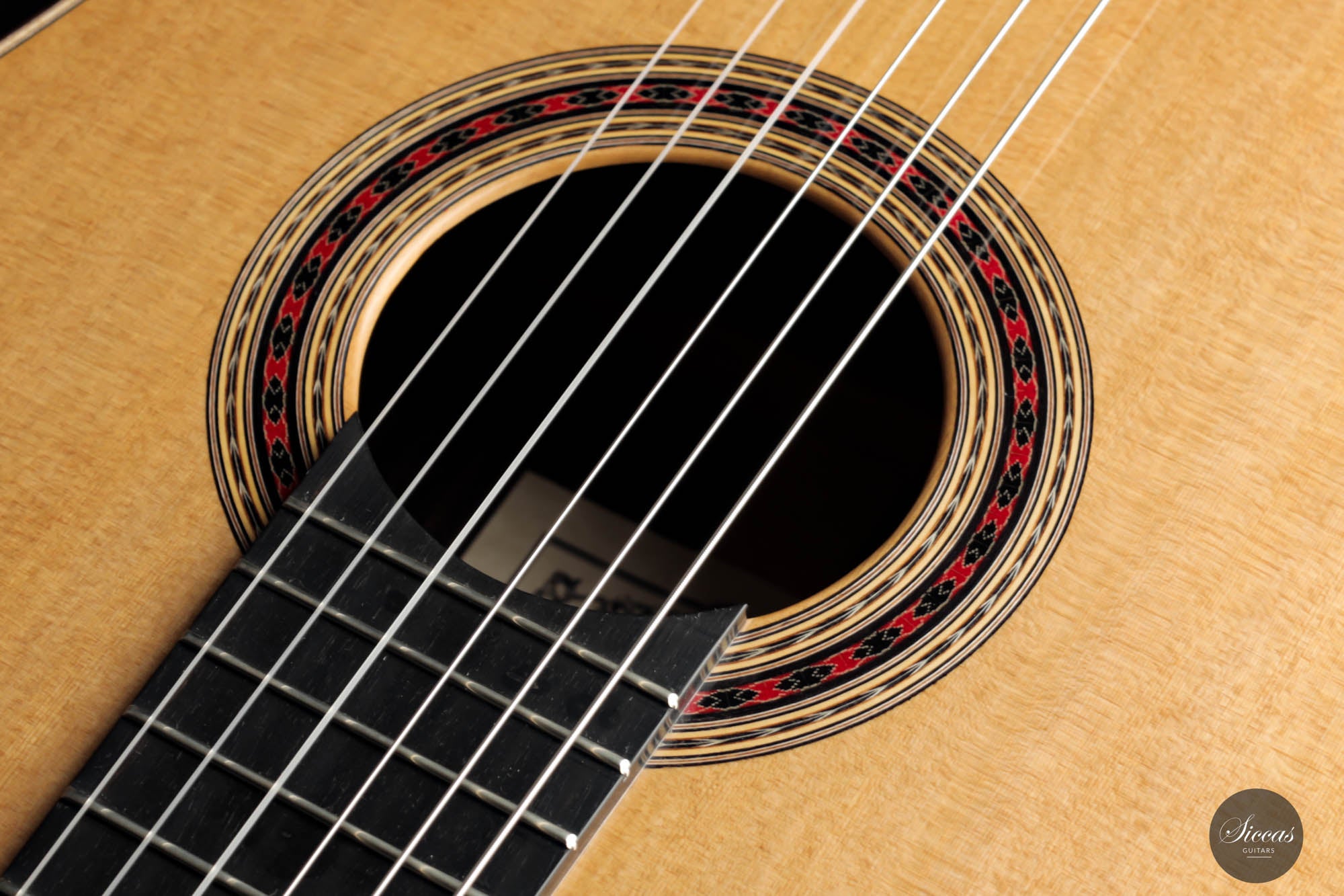 Diese wunderschöne Gitarre aus dem Jahr 2022 ist eine Eins-zu-Eins-Kopie der Daniel Friederich von 1980. Ästhetisch weist sie alle Aspekte der originalen Friederich-Gitarre von 1980 auf. Dieses neue Instrument hat eine Zederndecke und einen atemberaubenden Boden und Zargen aus indischem Palisander. Darüber hinaus ist die Zederndecke mit dem Friederich-7-Fächer-Bracing-System ausgestattet, wodurch diese Gitarre die klangliche Essenz von Daniel Friederichs Gitarre repräsentiert. Die komplex klingenden und doch sehr lyrischen Höhen, kombiniert mit den tiefen und druckvollen Bässen, machen diese Gitarre zu einer wunderschönen Konzertgitarre, die die Bedürfnisse eines jeden Konzertinterpreten problemlos erfüllt.
