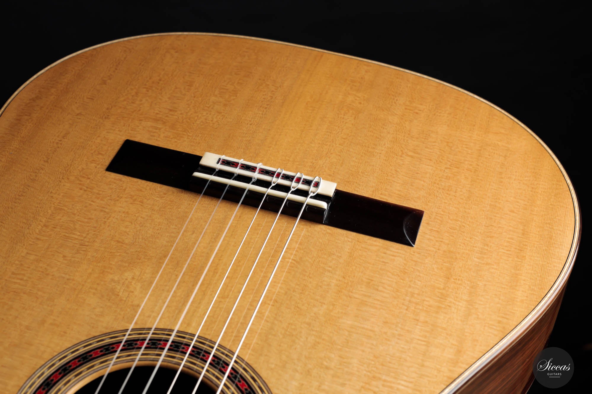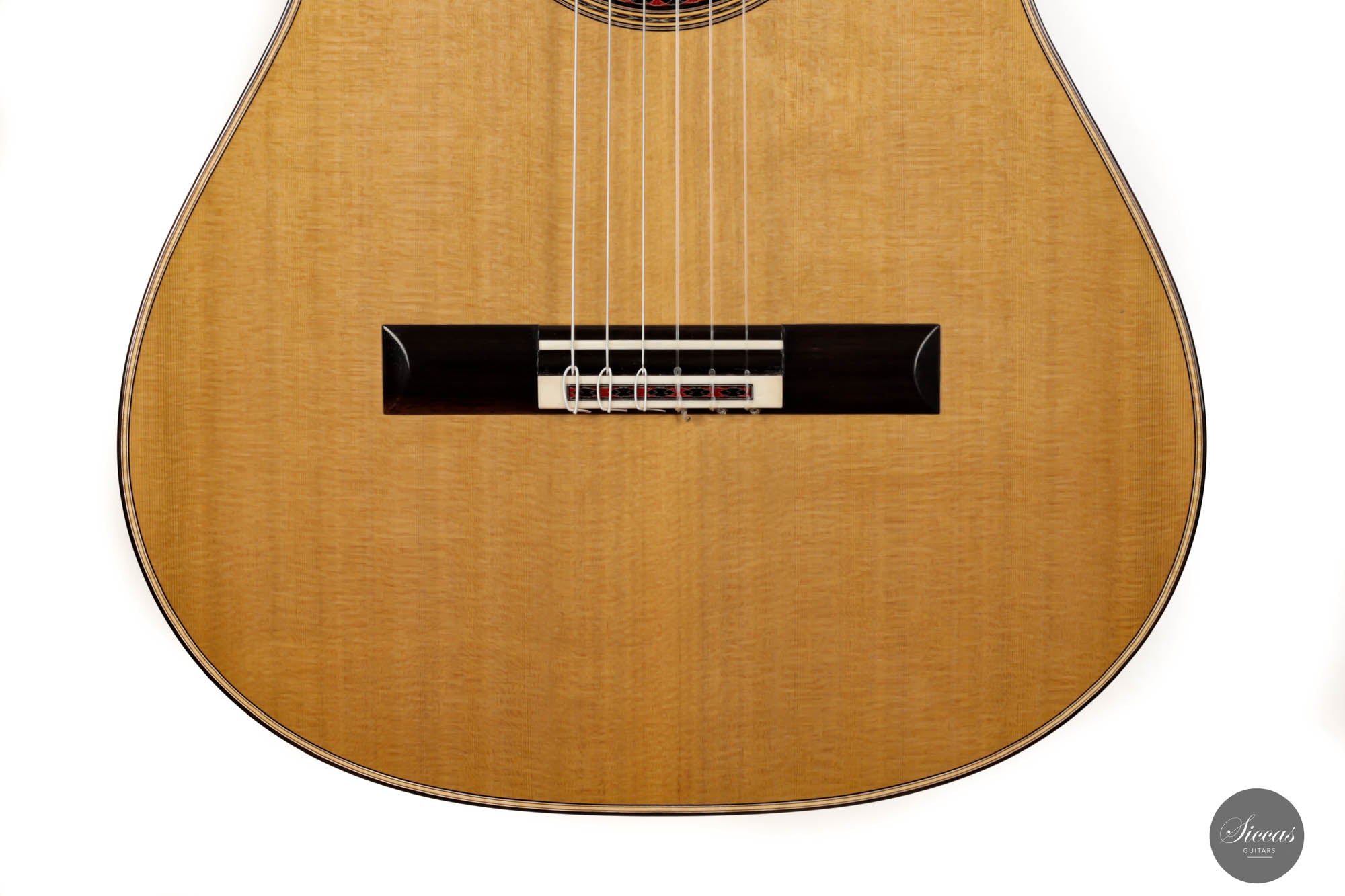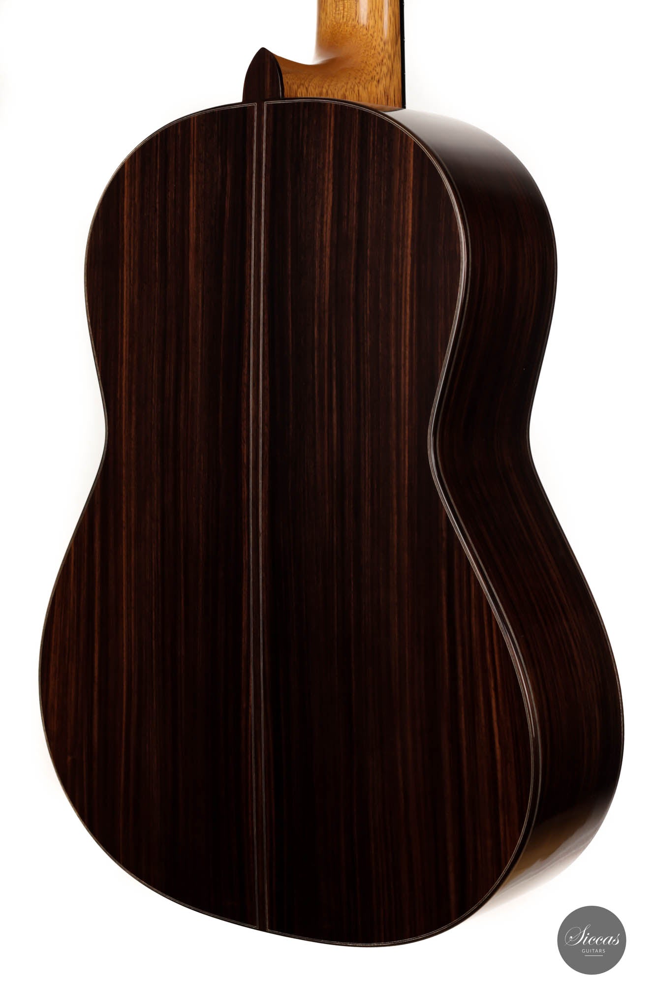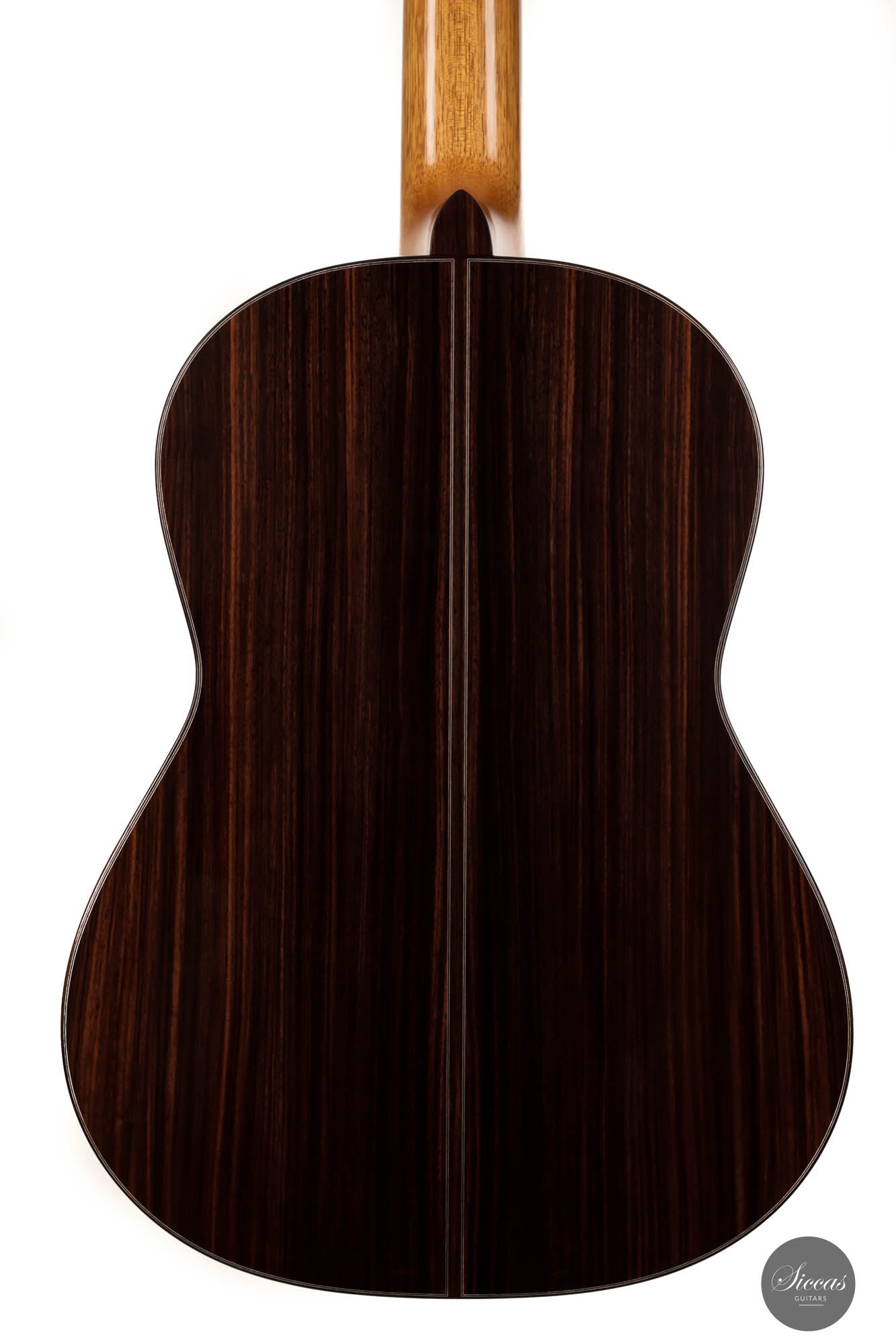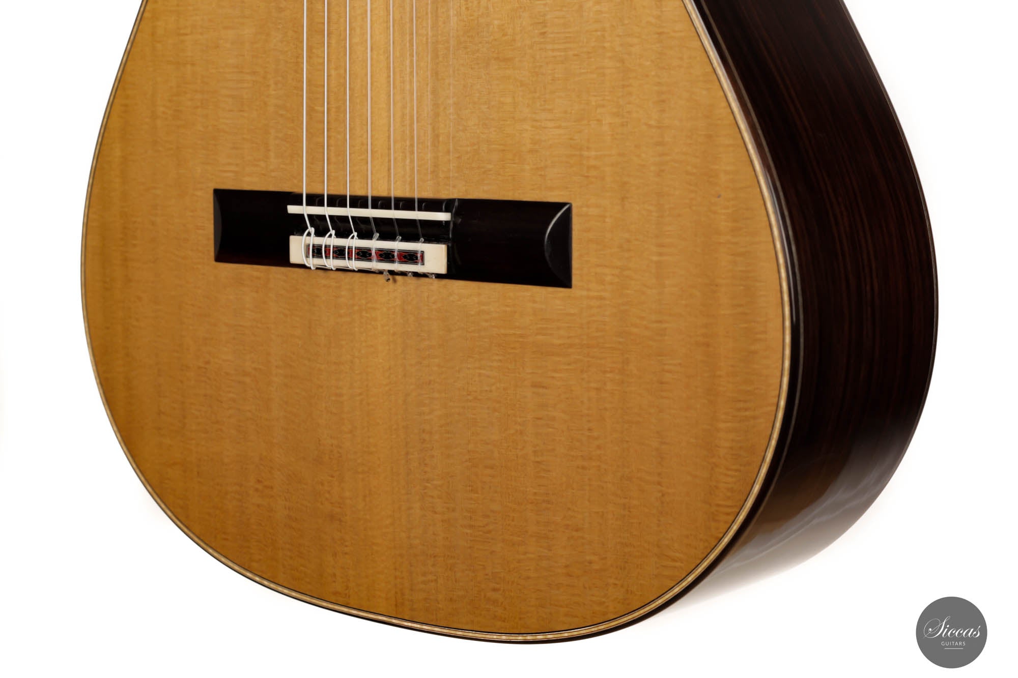 Diese wunderschöne Gitarre aus dem Jahr 2022 ist eine Eins-zu-Eins-Kopie der Daniel Friederich von 1980. Ästhetisch weist sie alle Aspekte der originalen Friederich-Gitarre von 1980 auf. Dieses neue Instrument hat eine Zederndecke und einen atemberaubenden Boden und Zargen aus indischem Palisander. Darüber hinaus ist die Zederndecke mit dem Friederich-7-Fächer-Bracing-System ausgestattet, wodurch diese Gitarre die klangliche Essenz von Daniel Friederichs Gitarre repräsentiert. Die komplex klingenden und doch sehr lyrischen Höhen, kombiniert mit den tiefen und druckvollen Bässen, machen diese Gitarre zu einer wunderschönen Konzertgitarre, die die Bedürfnisse eines jeden Konzertinterpreten problemlos erfüllt.