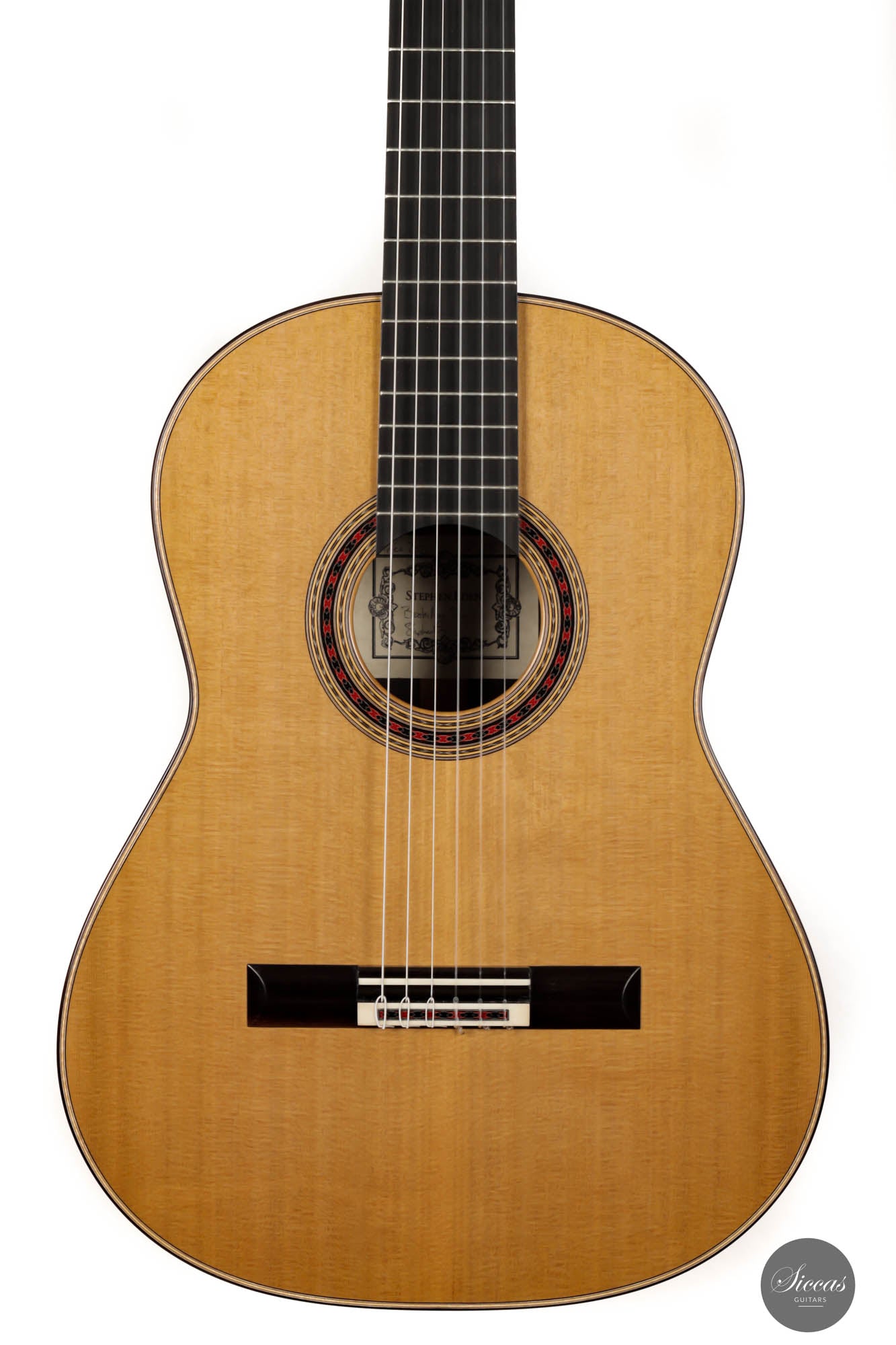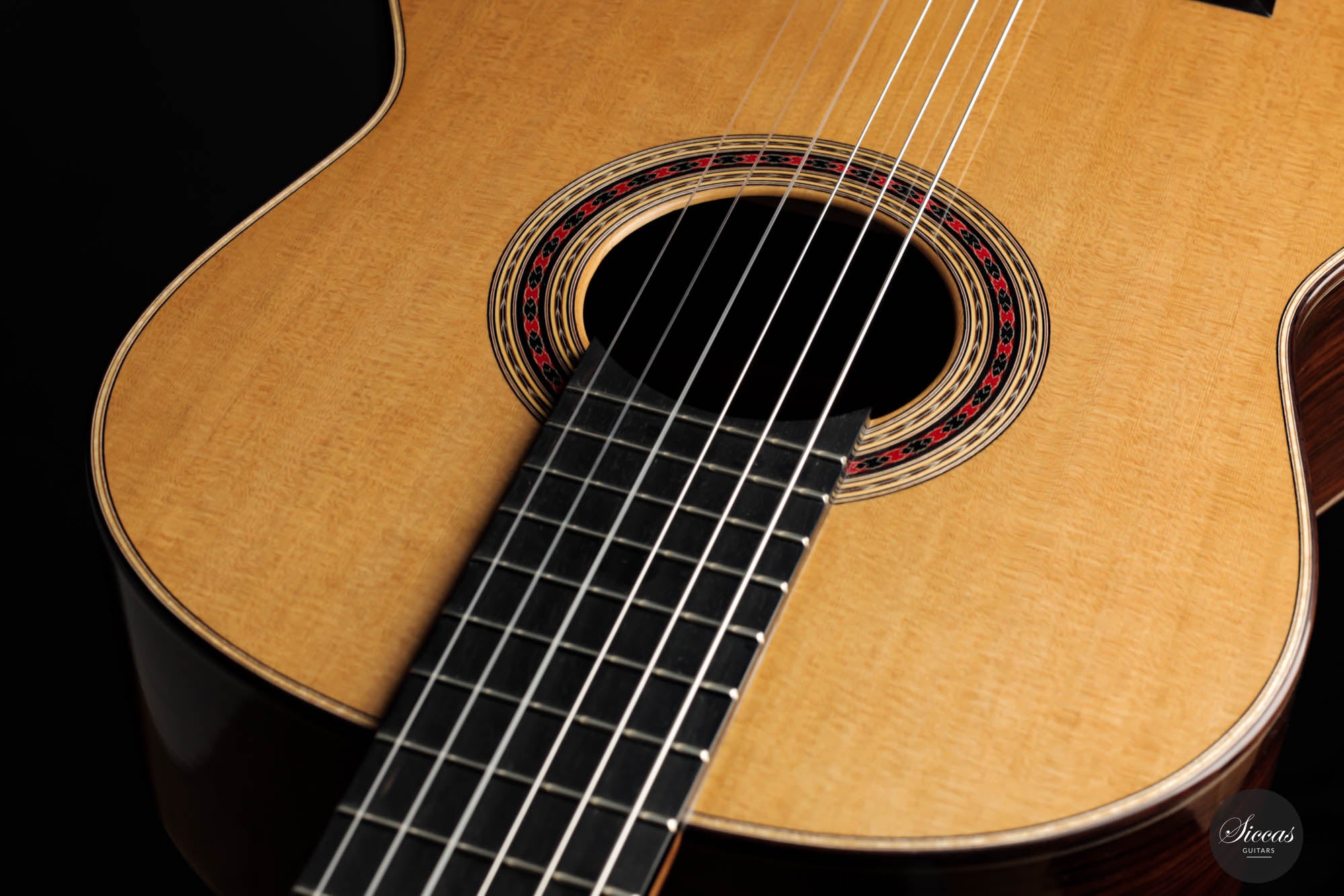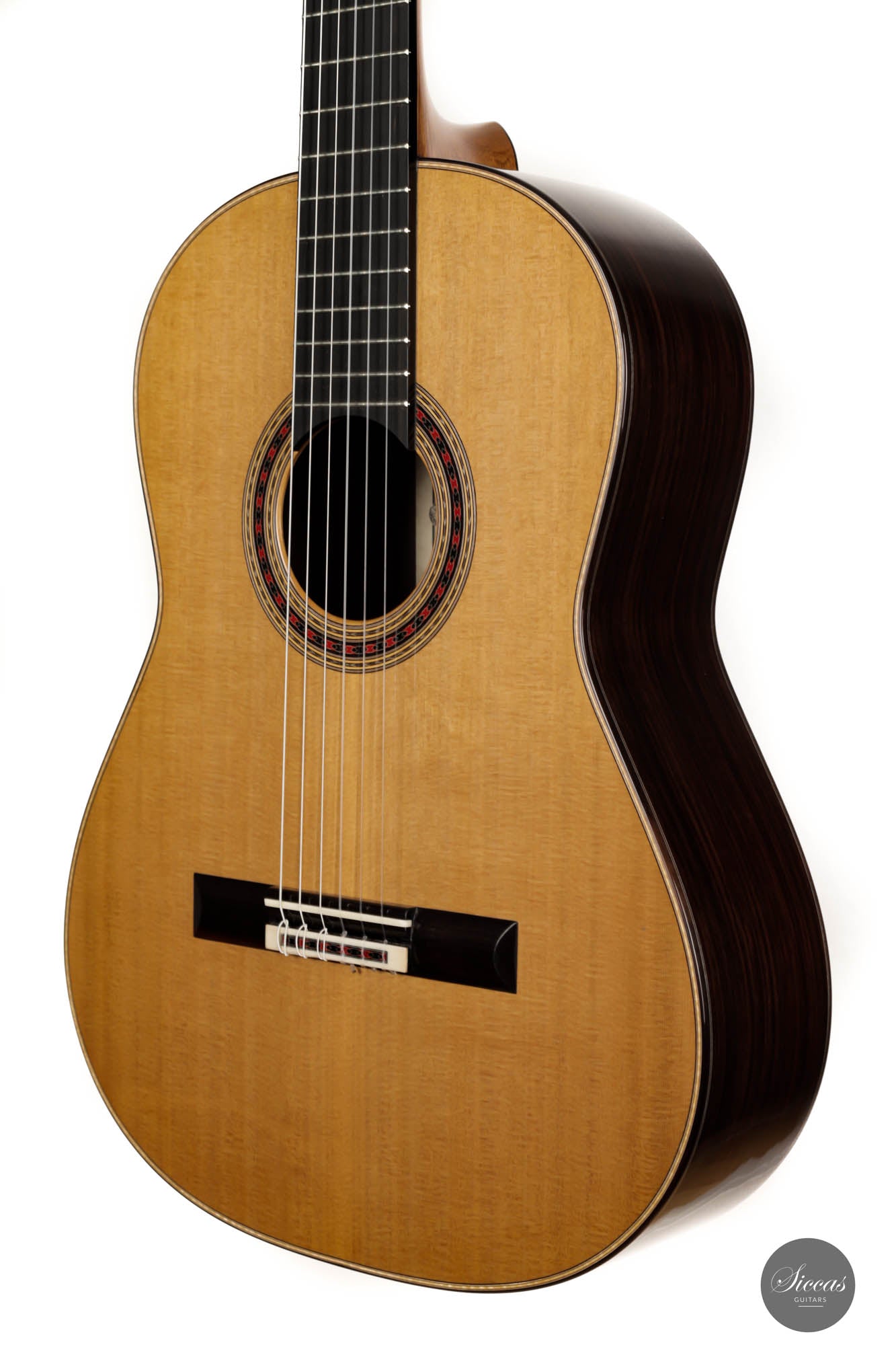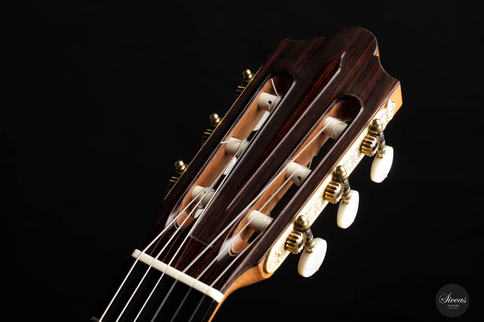 Diese wunderschöne Gitarre aus dem Jahr 2022 ist eine Eins-zu-Eins-Kopie der Daniel Friederich von 1980. Ästhetisch weist sie alle Aspekte der originalen Friederich-Gitarre von 1980 auf. Dieses neue Instrument hat eine Zederndecke und einen atemberaubenden Boden und Zargen aus indischem Palisander. Darüber hinaus ist die Zederndecke mit dem Friederich-7-Fächer-Bracing-System ausgestattet, wodurch diese Gitarre die klangliche Essenz von Daniel Friederichs Gitarre repräsentiert. Die komplex klingenden und doch sehr lyrischen Höhen, kombiniert mit den tiefen und druckvollen Bässen, machen diese Gitarre zu einer wunderschönen Konzertgitarre, die die Bedürfnisse eines jeden Konzertinterpreten problemlos erfüllt.