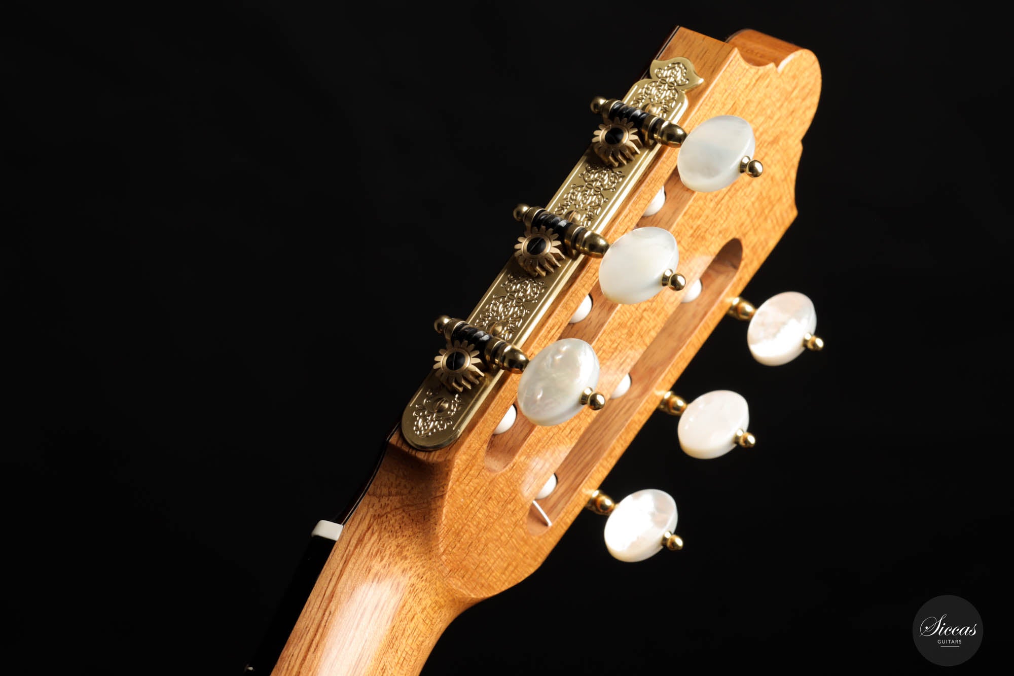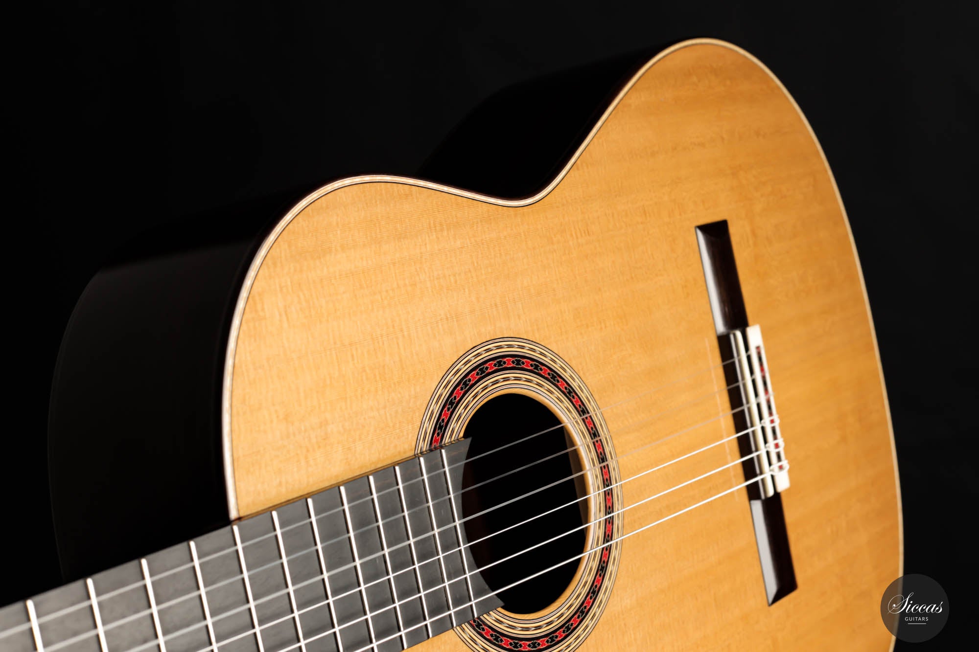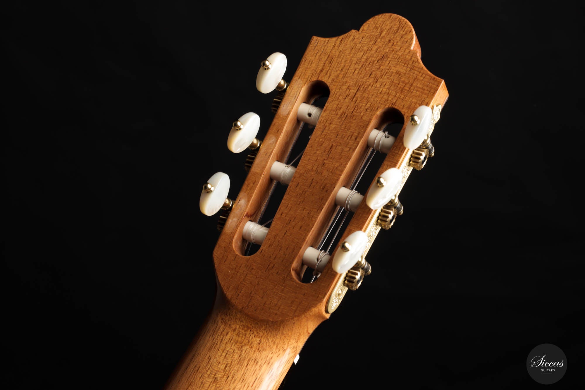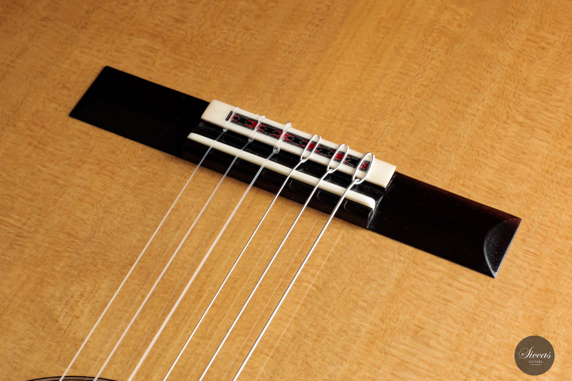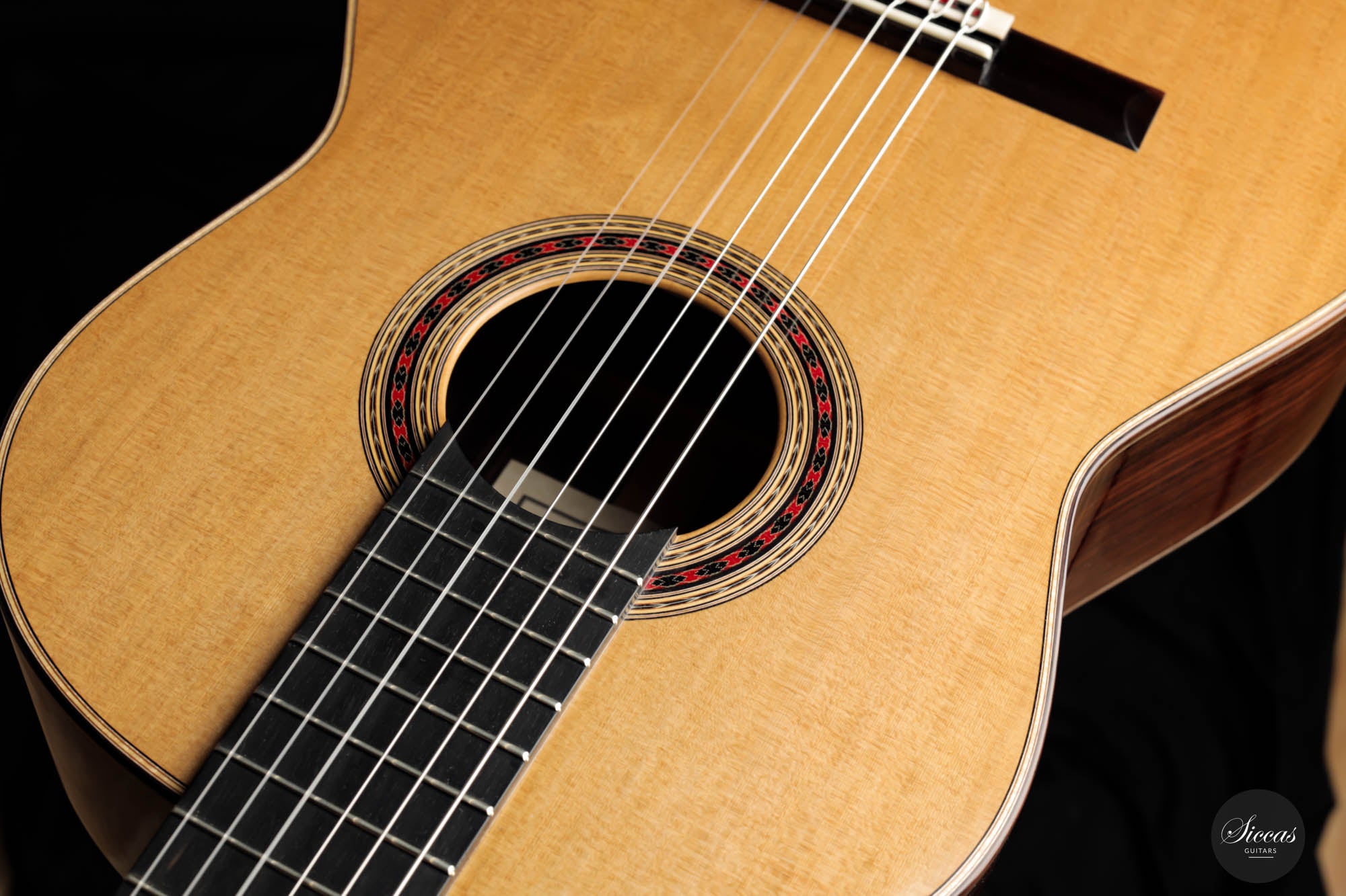 Diese wunderschöne Gitarre aus dem Jahr 2022 ist eine Eins-zu-Eins-Kopie der Daniel Friederich von 1980. Ästhetisch weist sie alle Aspekte der originalen Friederich-Gitarre von 1980 auf. Dieses neue Instrument hat eine Zederndecke und einen atemberaubenden Boden und Zargen aus indischem Palisander. Darüber hinaus ist die Zederndecke mit dem Friederich-7-Fächer-Bracing-System ausgestattet, wodurch diese Gitarre die klangliche Essenz von Daniel Friederichs Gitarre repräsentiert. Die komplex klingenden und doch sehr lyrischen Höhen, kombiniert mit den tiefen und druckvollen Bässen, machen diese Gitarre zu einer wunderschönen Konzertgitarre, die die Bedürfnisse eines jeden Konzertinterpreten problemlos erfüllt.