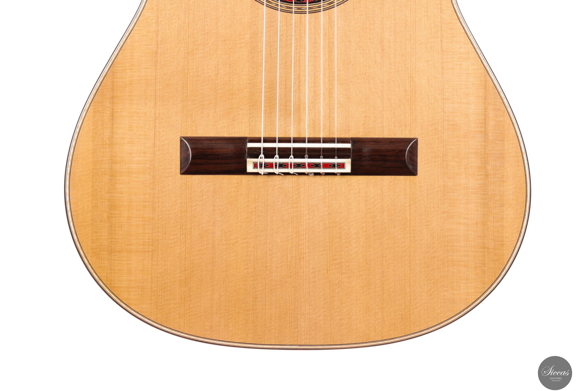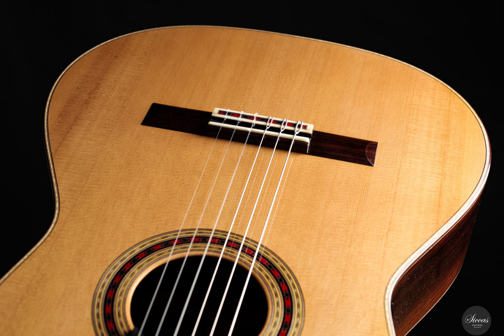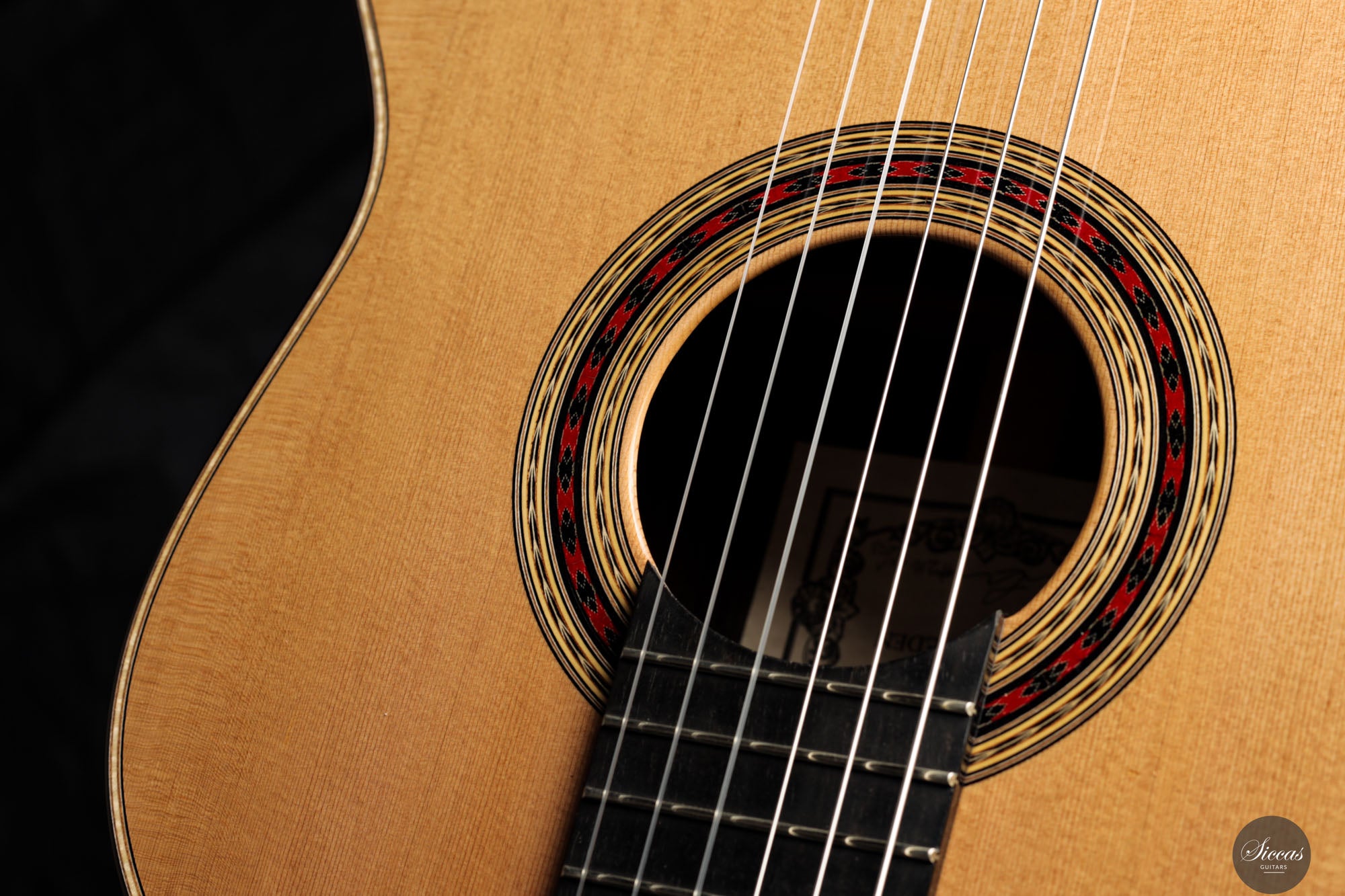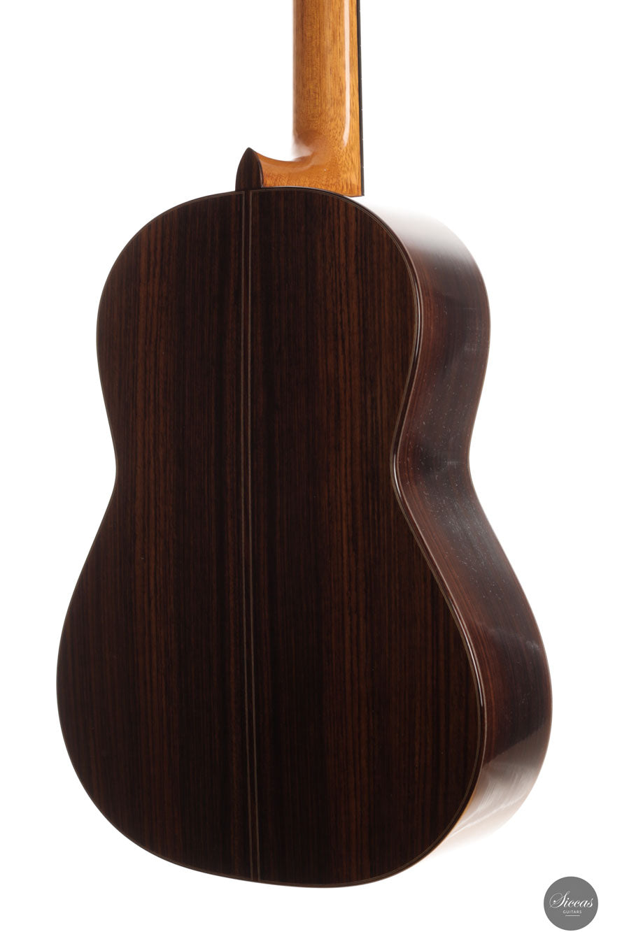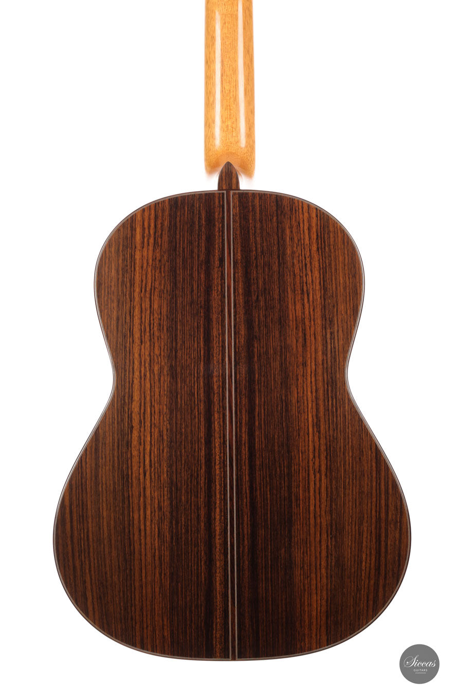 Diese Gitarre aus dem Jahr 2025 ist eine sorgfältig gefertigte Nachbildung des renommierten Modells von Daniel Friederich aus dem Jahr 1980, die jedes Detail des visuellen und strukturellen Designs originalgetreu wiedergibt. Sie verfügt über eine Zederndecke, kombiniert mit atemberaubendem indischen Palisander für Boden und Zargen, und verkörpert die ästhetische Eleganz und den akustischen Reichtum des Originals. Ein besonderes Merkmal dieses Modells ist Friederichs charakteristisches 7-Fächer-Bracing-System, das aus Zeder statt aus dem traditionell verwendeten Fichtenholz gefertigt ist. Diese durchdachte Wahl verbessert die strukturelle Integrität der Gitarre, ohne unnötiges Gewicht hinzuzufügen, und trägt wesentlich zu ihrem bemerkenswerten Klangvolumen und ihrer Resonanz bei.