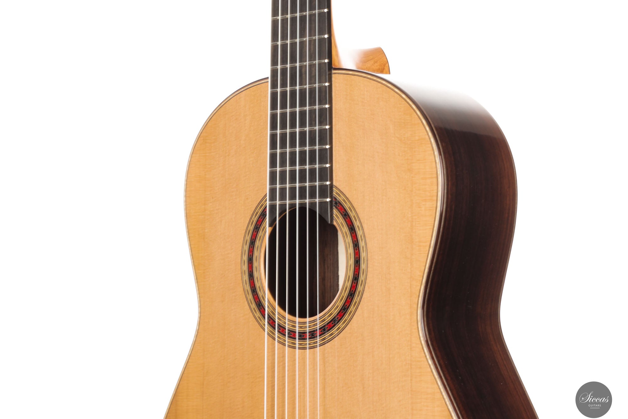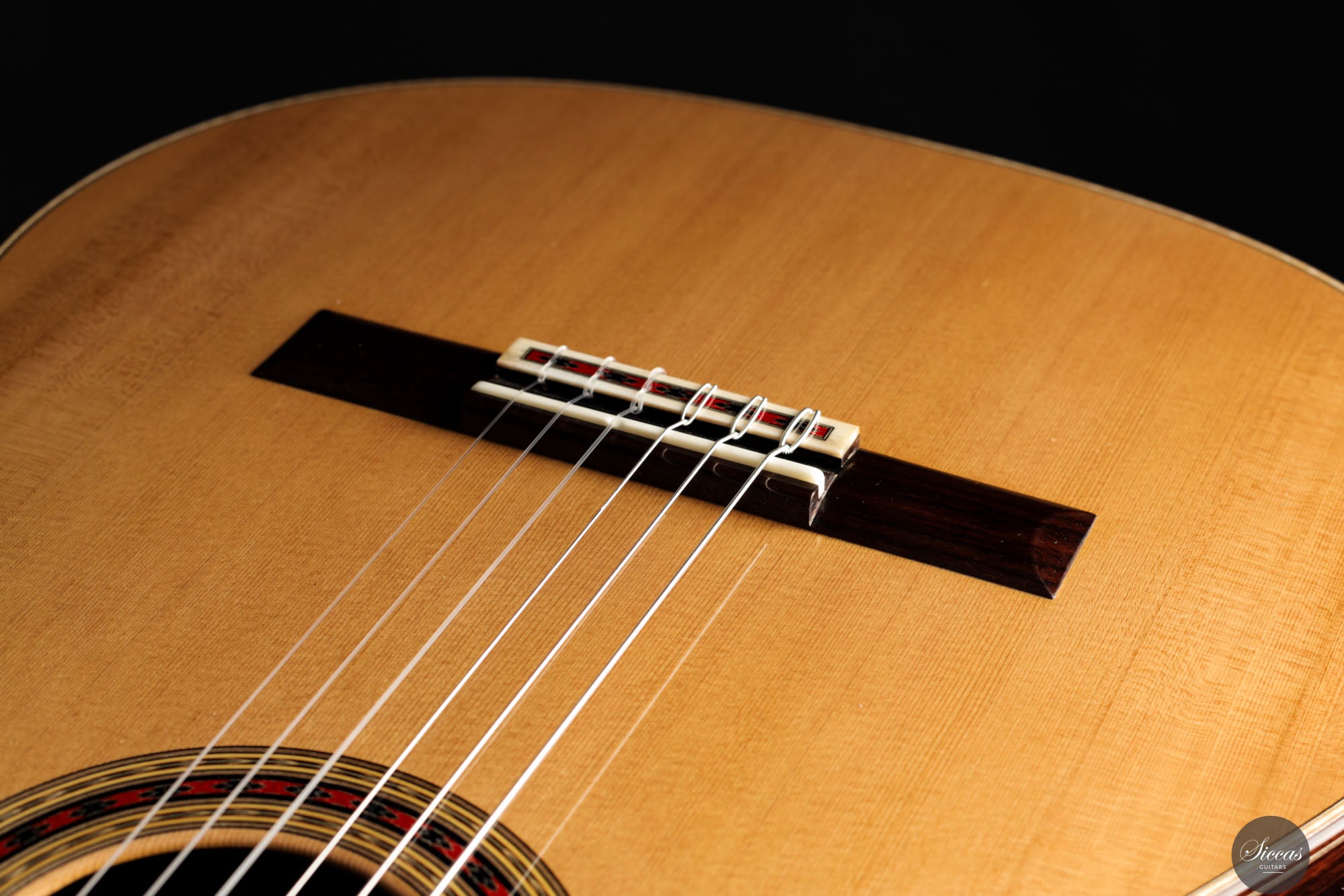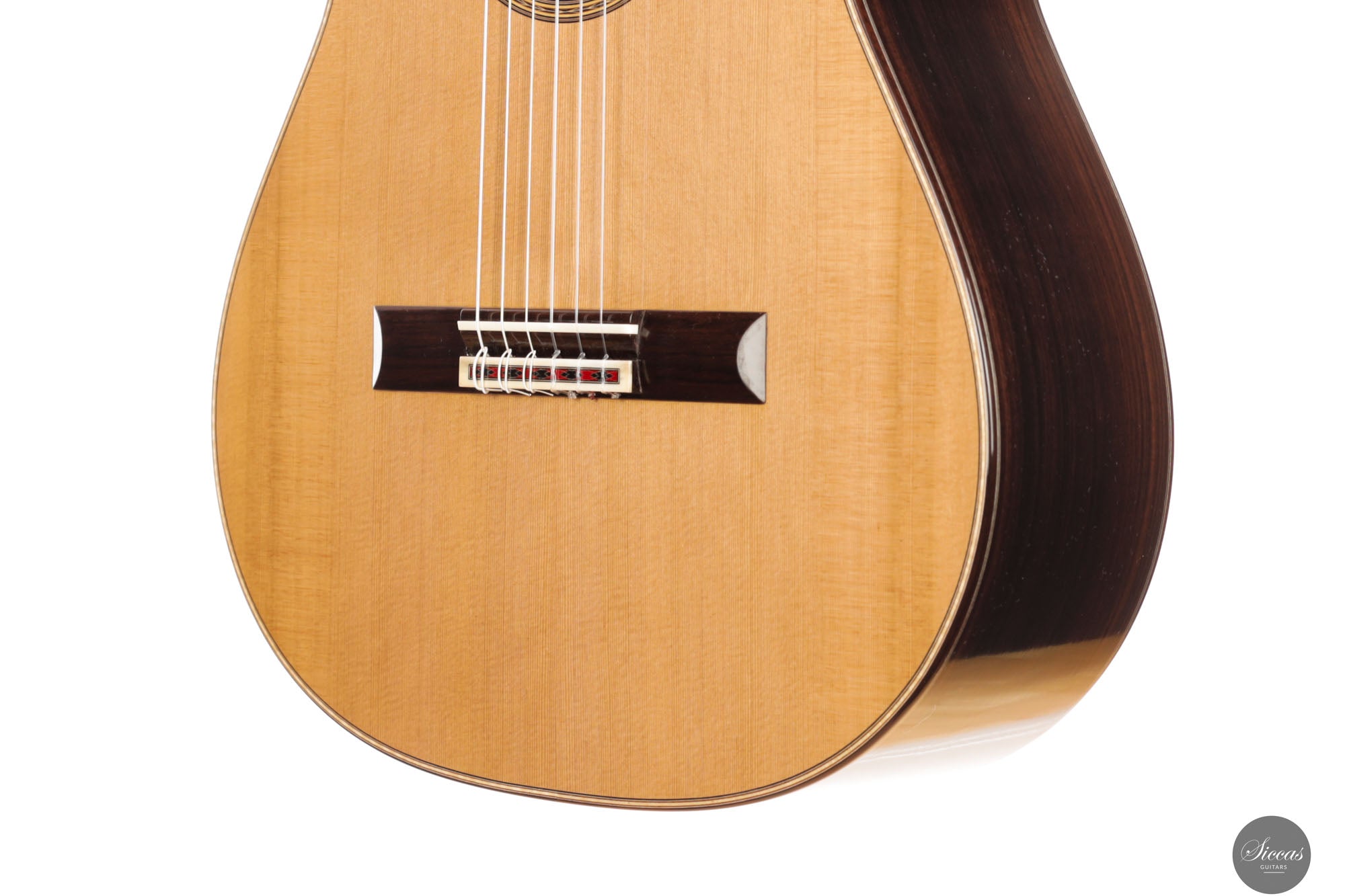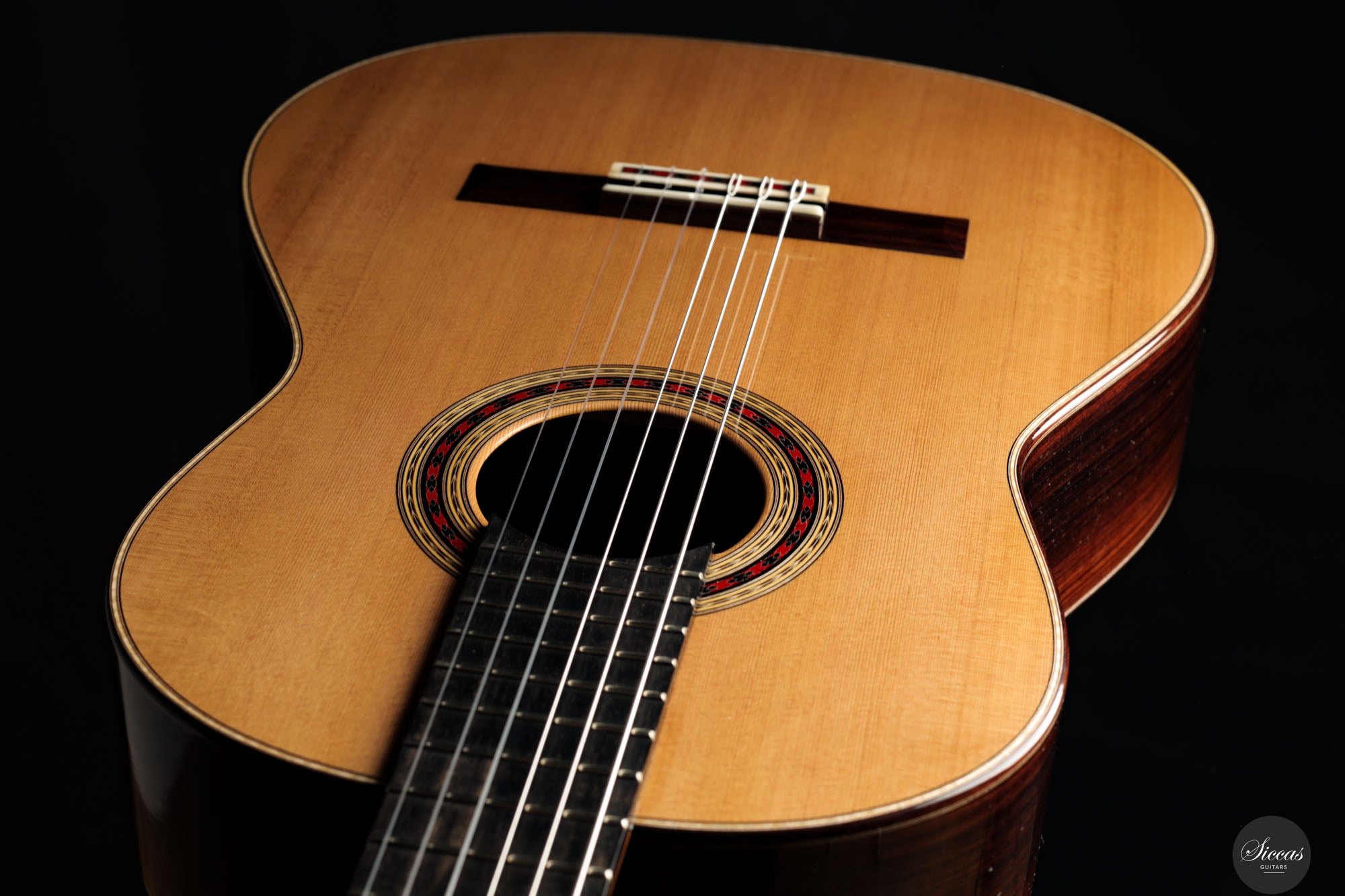 Diese Gitarre aus dem Jahr 2025 ist eine sorgfältig gefertigte Nachbildung des renommierten Modells von Daniel Friederich aus dem Jahr 1980, die jedes Detail des visuellen und strukturellen Designs originalgetreu wiedergibt. Sie verfügt über eine Zederndecke, kombiniert mit atemberaubendem indischen Palisander für Boden und Zargen, und verkörpert die ästhetische Eleganz und den akustischen Reichtum des Originals. Ein besonderes Merkmal dieses Modells ist Friederichs charakteristisches 7-Fächer-Bracing-System, das aus Zeder statt aus dem traditionell verwendeten Fichtenholz gefertigt ist. Diese durchdachte Wahl verbessert die strukturelle Integrität der Gitarre, ohne unnötiges Gewicht hinzuzufügen, und trägt wesentlich zu ihrem bemerkenswerten Klangvolumen und ihrer Resonanz bei.