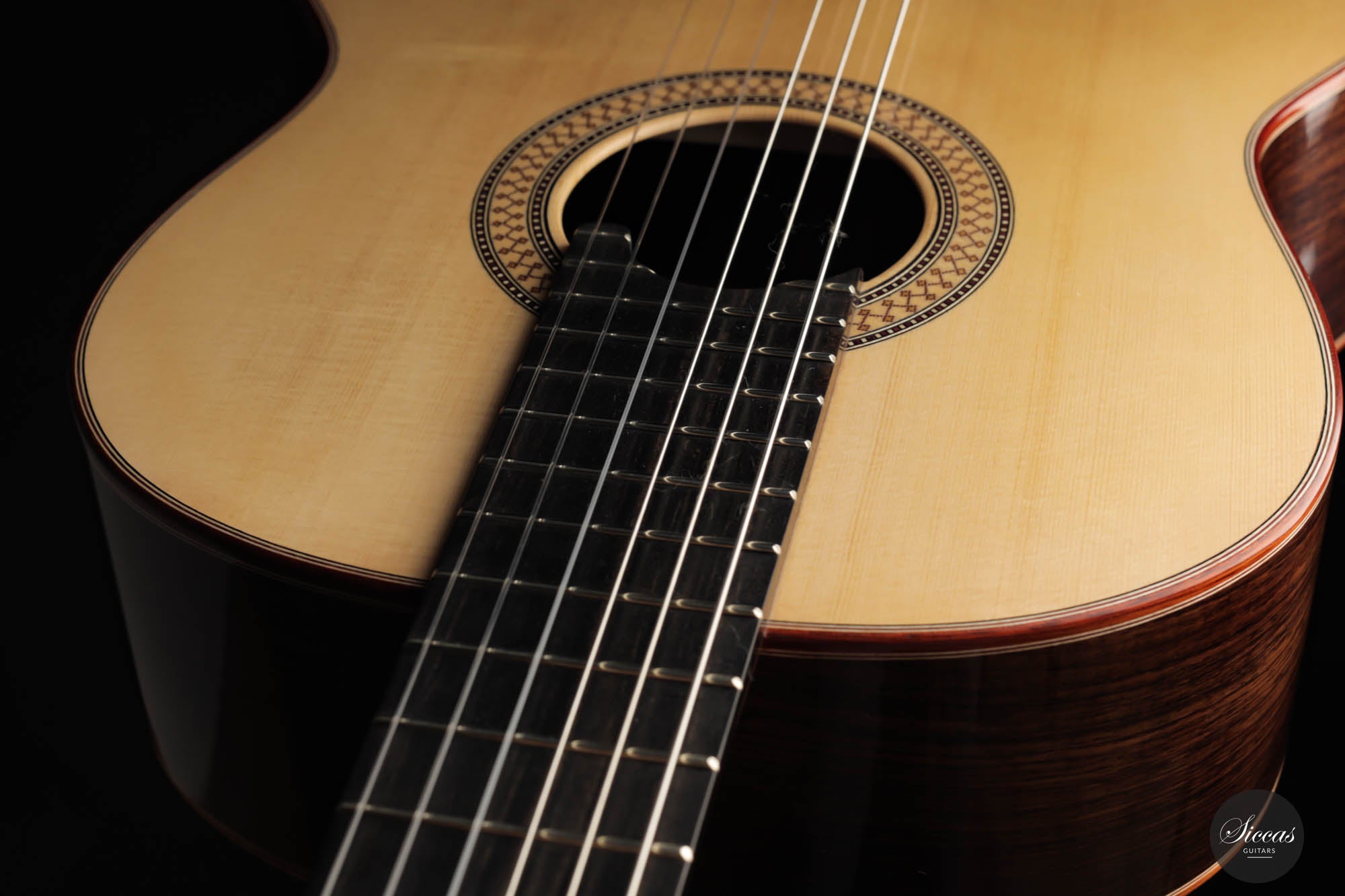 Stephen Hill has spent most of his career perfecting the art of traditional guitar building, and his most recent venture into double-top instruments showcases his exceptional ability to adapt and excel in new construction methods. The natural-sounding tone of this instrument is imposing, offering a rich and powerful sound enhanced by the double-top construction. This innovative design features a spruce soundboard expertly layered with cedar underneath, providing the guitar with unparalleled tonal quality. Reinforcing the instrument's structure is a 5x5 wood lattice bracing system, a testament to Hill's ability to blend modern construction techniques with the timeless beauty of Spanish tradition. One of the standout features of the 2023 Stephen Hill double-top guitar is its incredible playability. Players will be supported and inspired by the instrument's effortless response and remarkable tonal range. The left hand enjoys freedom and ease, allowing unparalleled creativity and expression.
