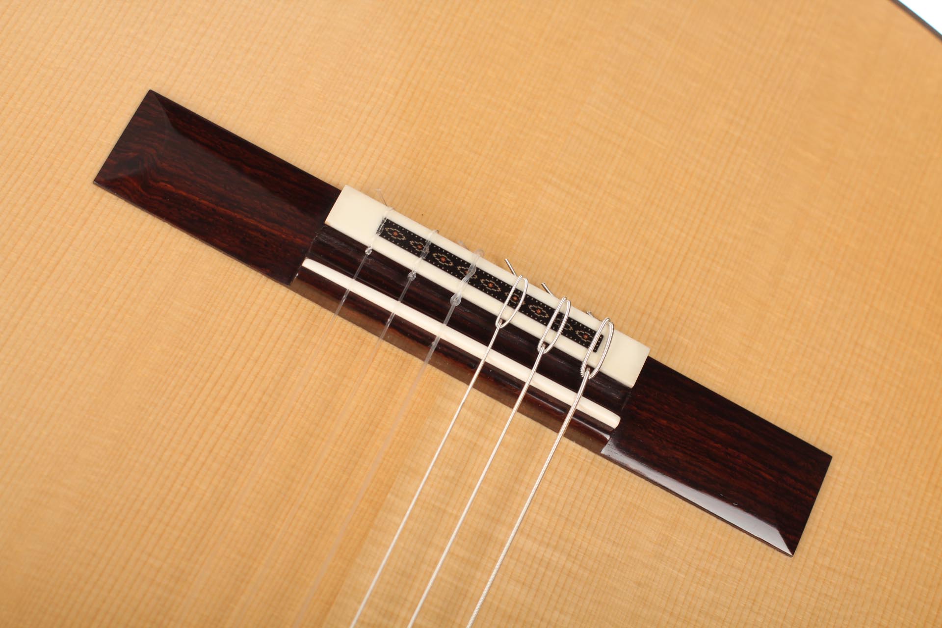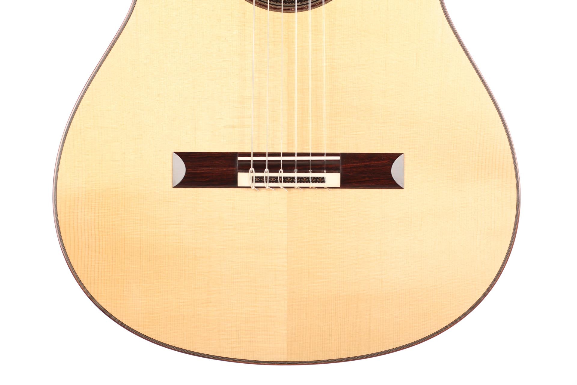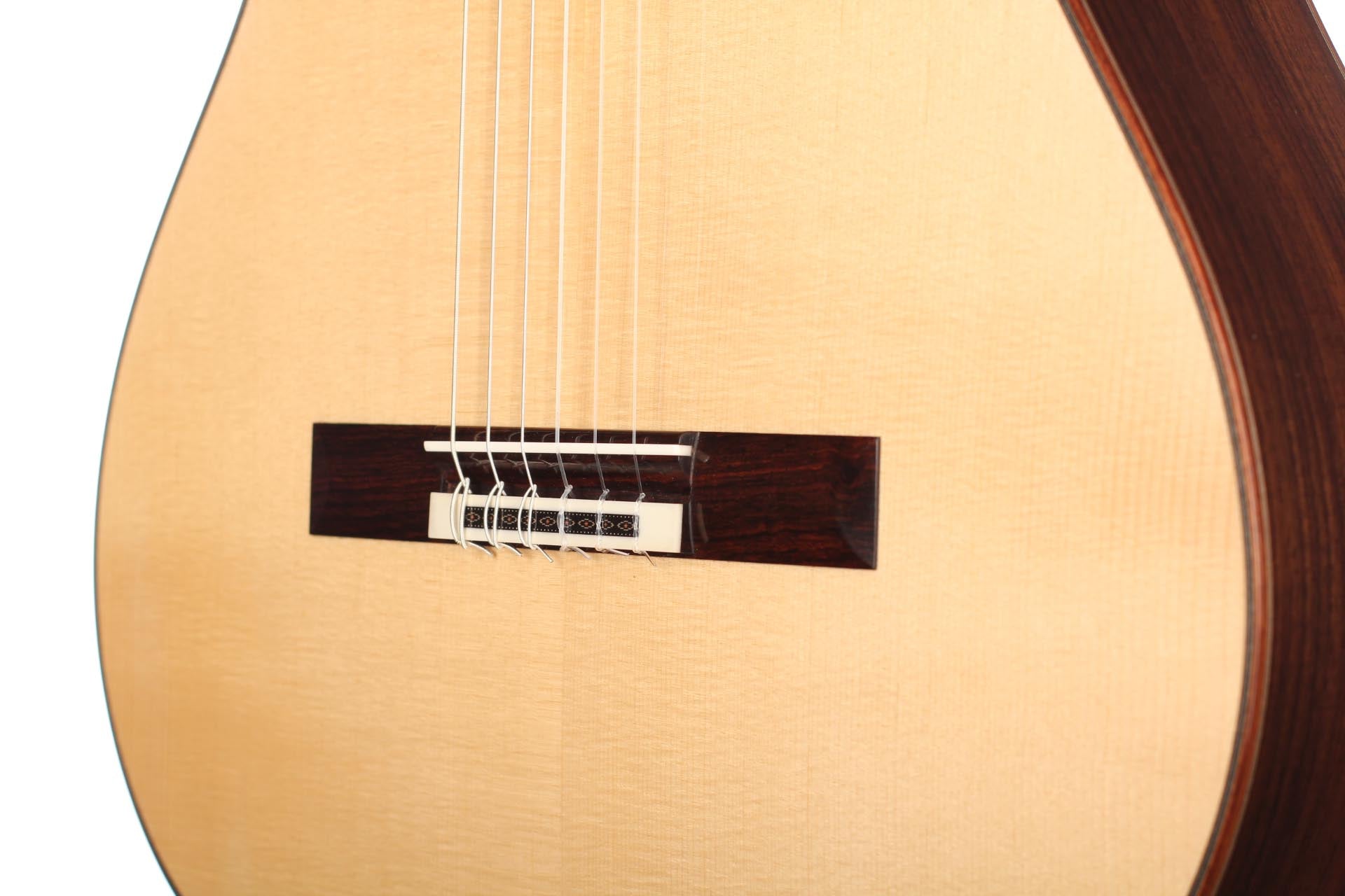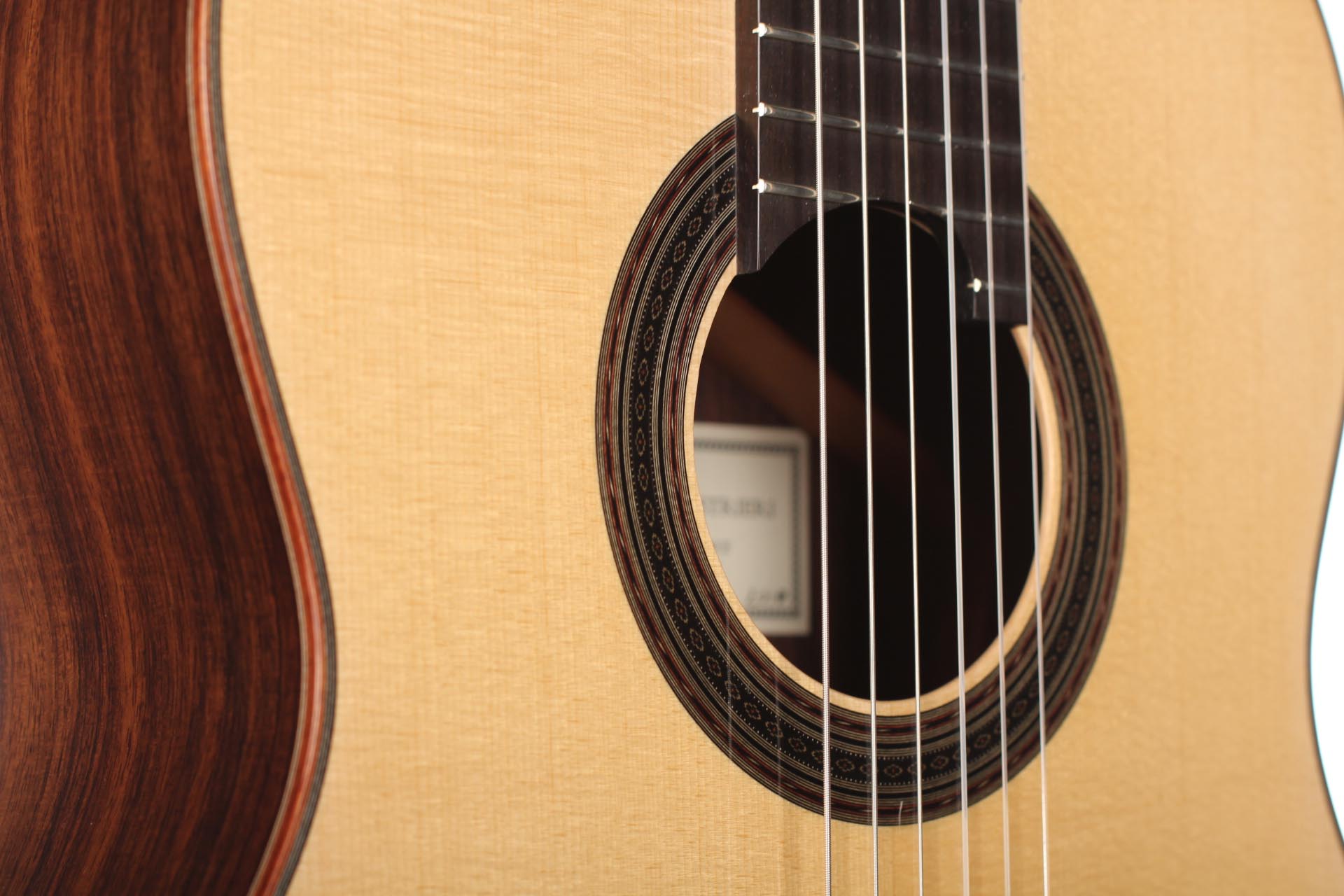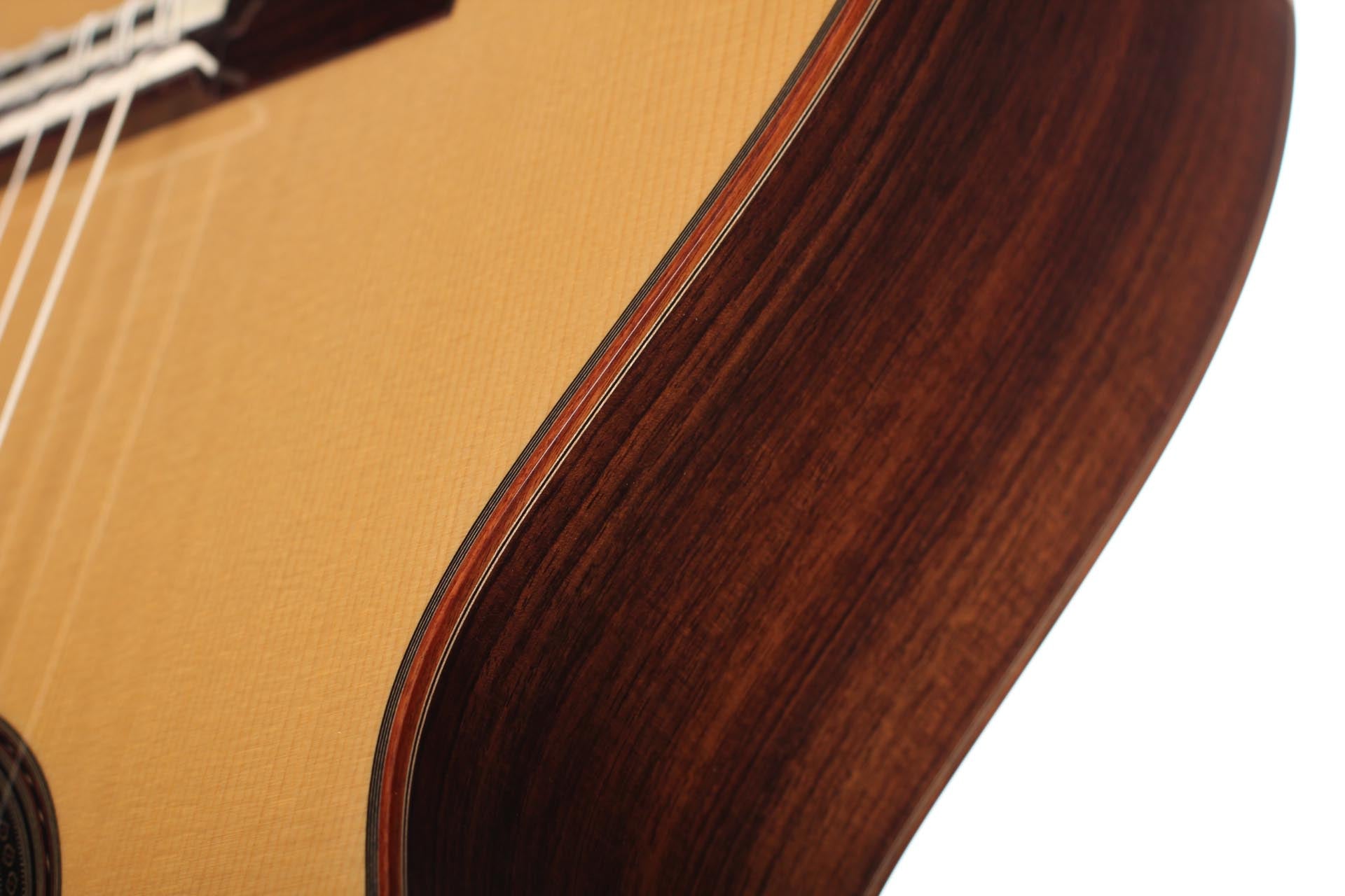 This 2018 guitar, comes as a result of a solid and deep understanding of the art of guitar making and reflects his ideal of sound, aesthetics and playability. This instrument is designed to fill concert halls, projecting a rich direct sound pleasing the player as well as the audience. A 40 years dried ebony fingerboard is used as well as a first quality spruce top and thoroughly selected Indian rosewood back and sides. The rosette and marquetry details are tremendously fine, with only a few tenth of millimetre sized elements. One of the most remarkable part of his guitars is probably one of the subtlest: the perfectly even and clear French polish that seals the wood and gives these refined deep colours and reflects to the top, back and sides. Definitely an amazing concert instrument from a promising guitar maker who will surely mark a turn in the French guitar-making tradition.