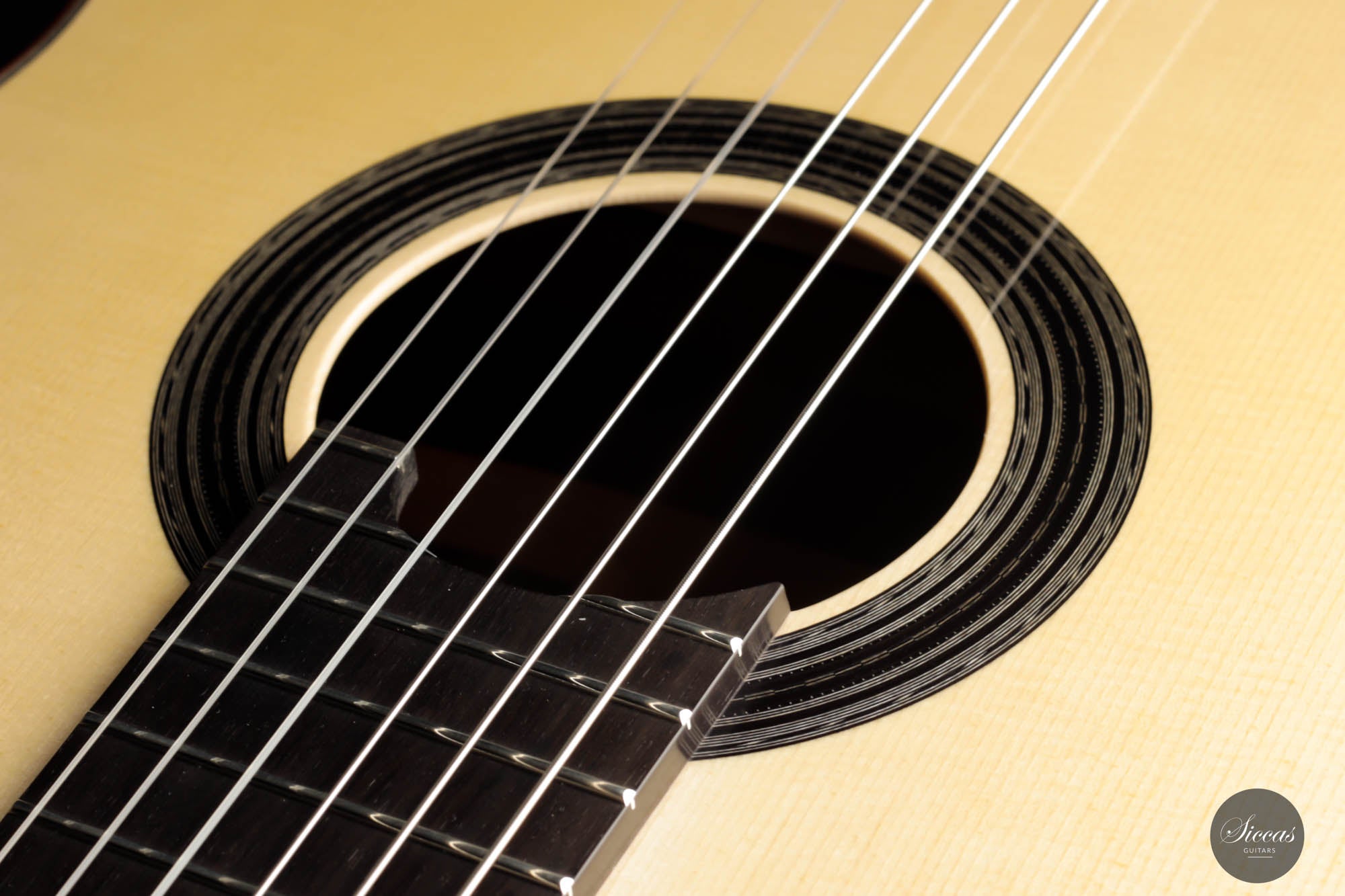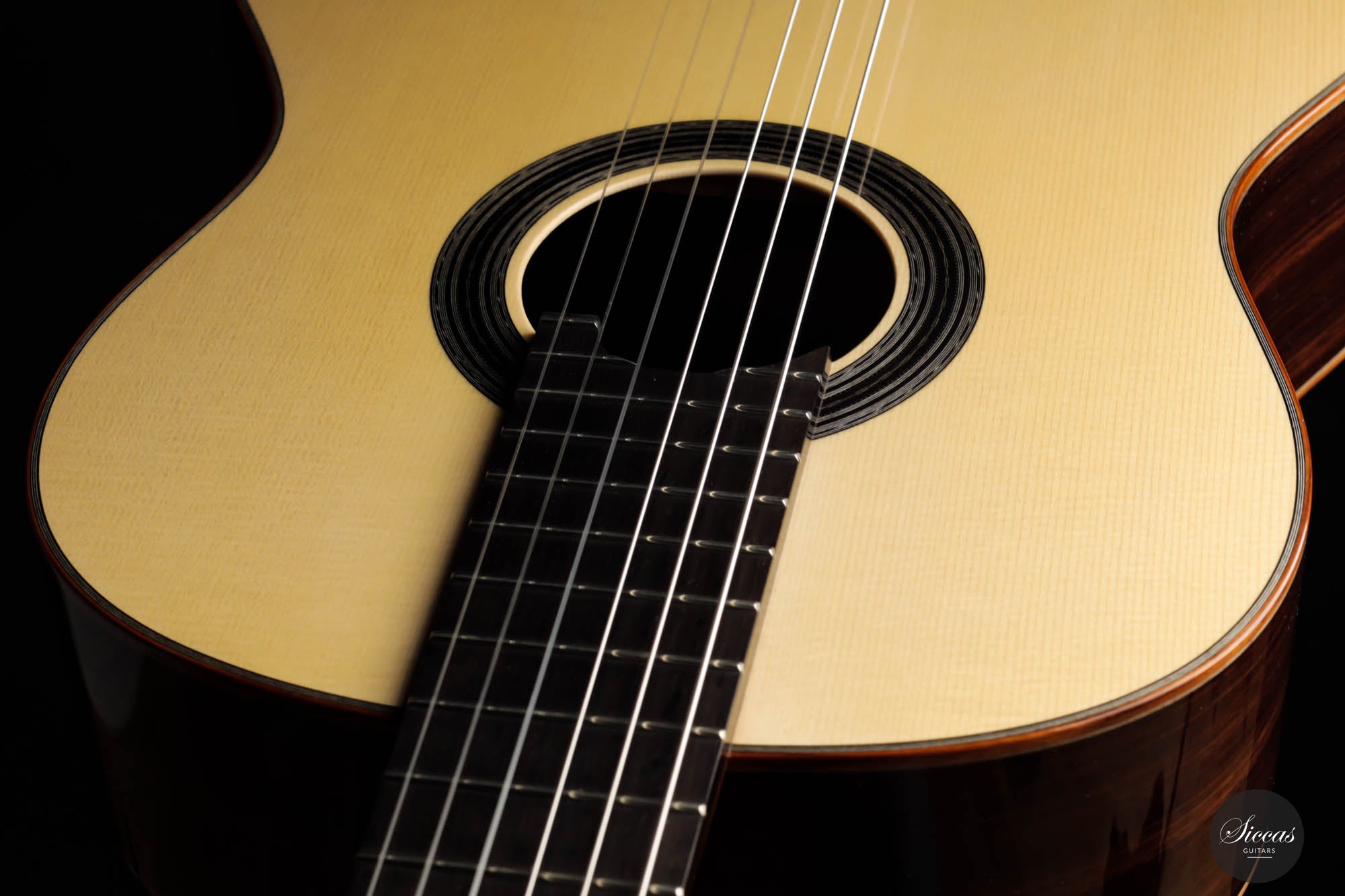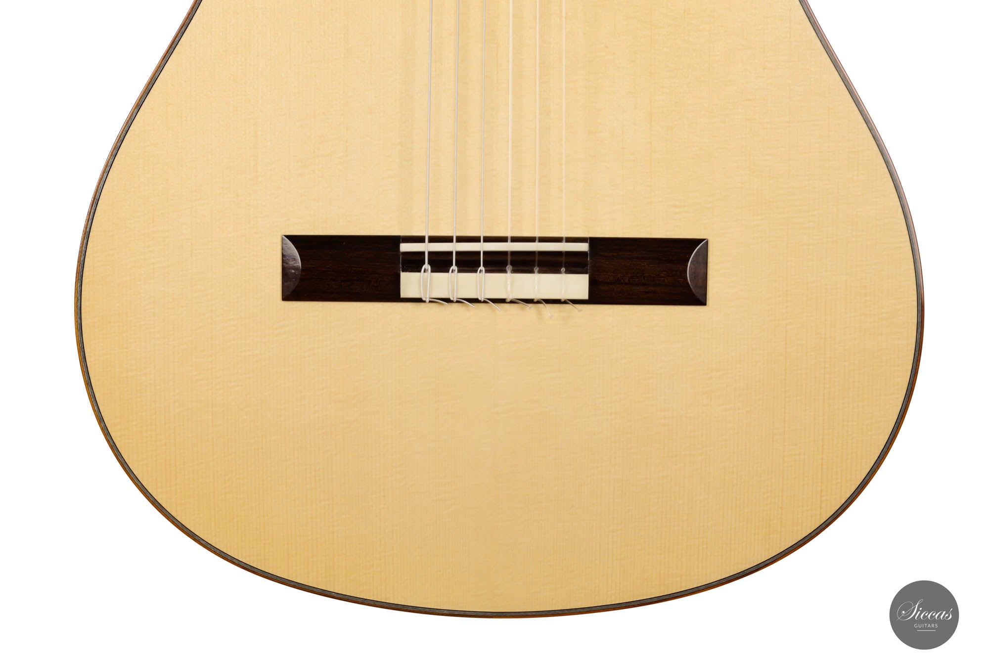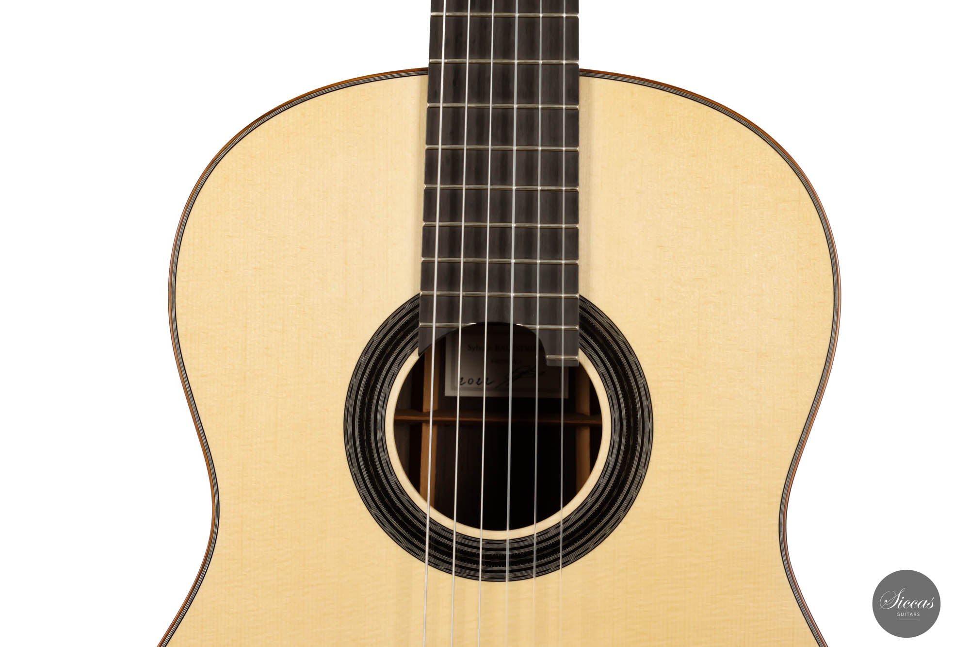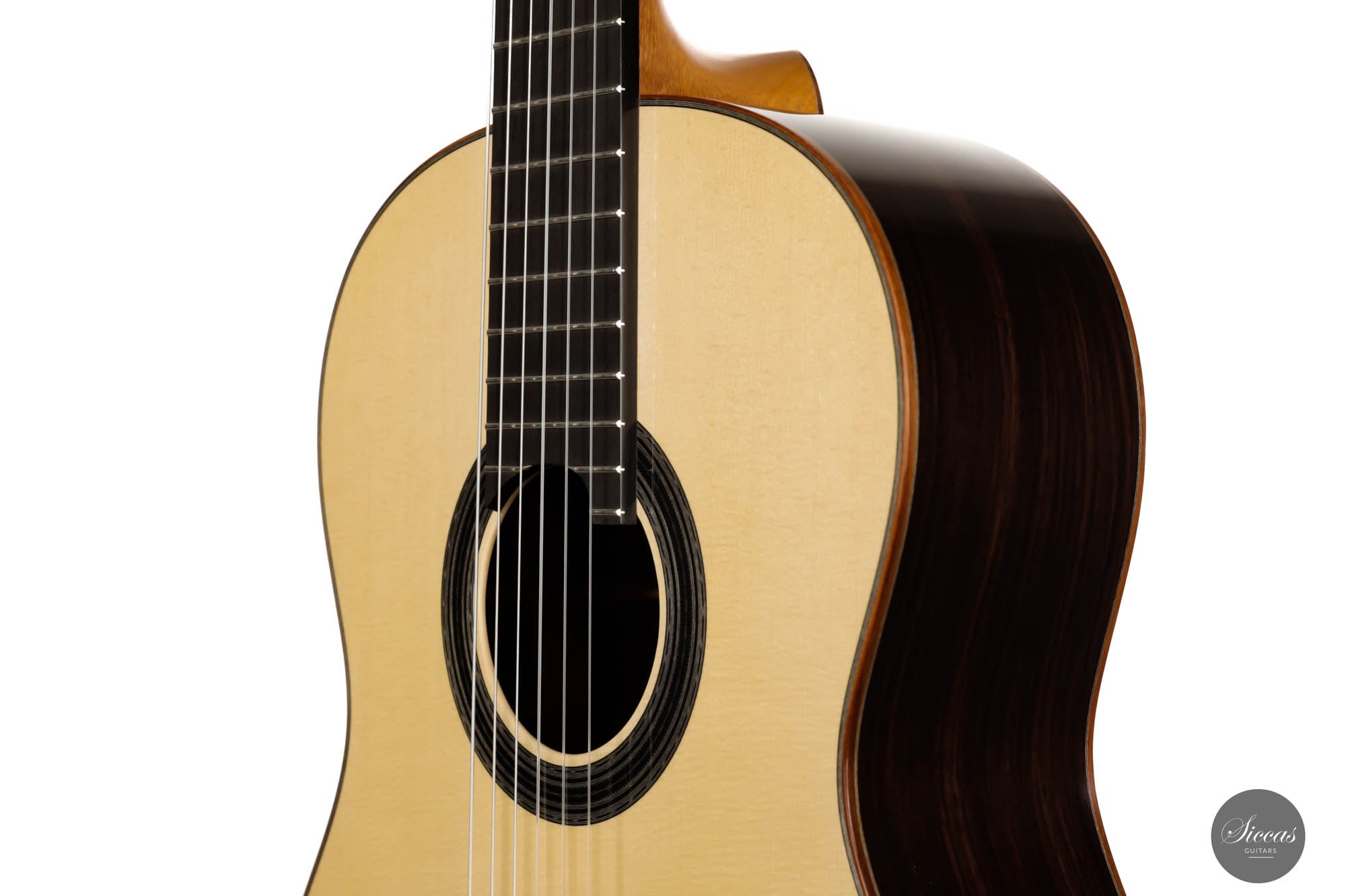 Diese feine Gitarre aus der Hand des sehr talentierten und beeindruckend geschickten Franzosen erfüllt alle Aspekte, die man von einem exzellenten Kunsthandwerker erwarten kann. Sylvain hat mit diesem schönen Instrument wieder einmal seinen Perfektionismus unter Beweis gestellt. Jedes einzelne Teil wurde perfekt ausgeführt. Auch die schwarz-weiße und doch schlichte Rosette zeigt deutlich Sylvains eleganten Kunstsinn. Die helle Fichtendecke und der dunkle Boden und die Zargen aus indischem Palisander ergänzen das gesamte Farbkonzept dieser Gitarre. Dieses schöne Instrument ist auch akustisch fesselnd. Sie hat alle Attribute einer fantastischen Konzertgitarre, wie z.B. gute Lautstärke, komfortable Spielbarkeit und allgemeine Ausgewogenheit. Diese Gitarre ist ein Premium-Instrument aus der nächsten Generation französischer Gitarrenbau-Traditionsträger.