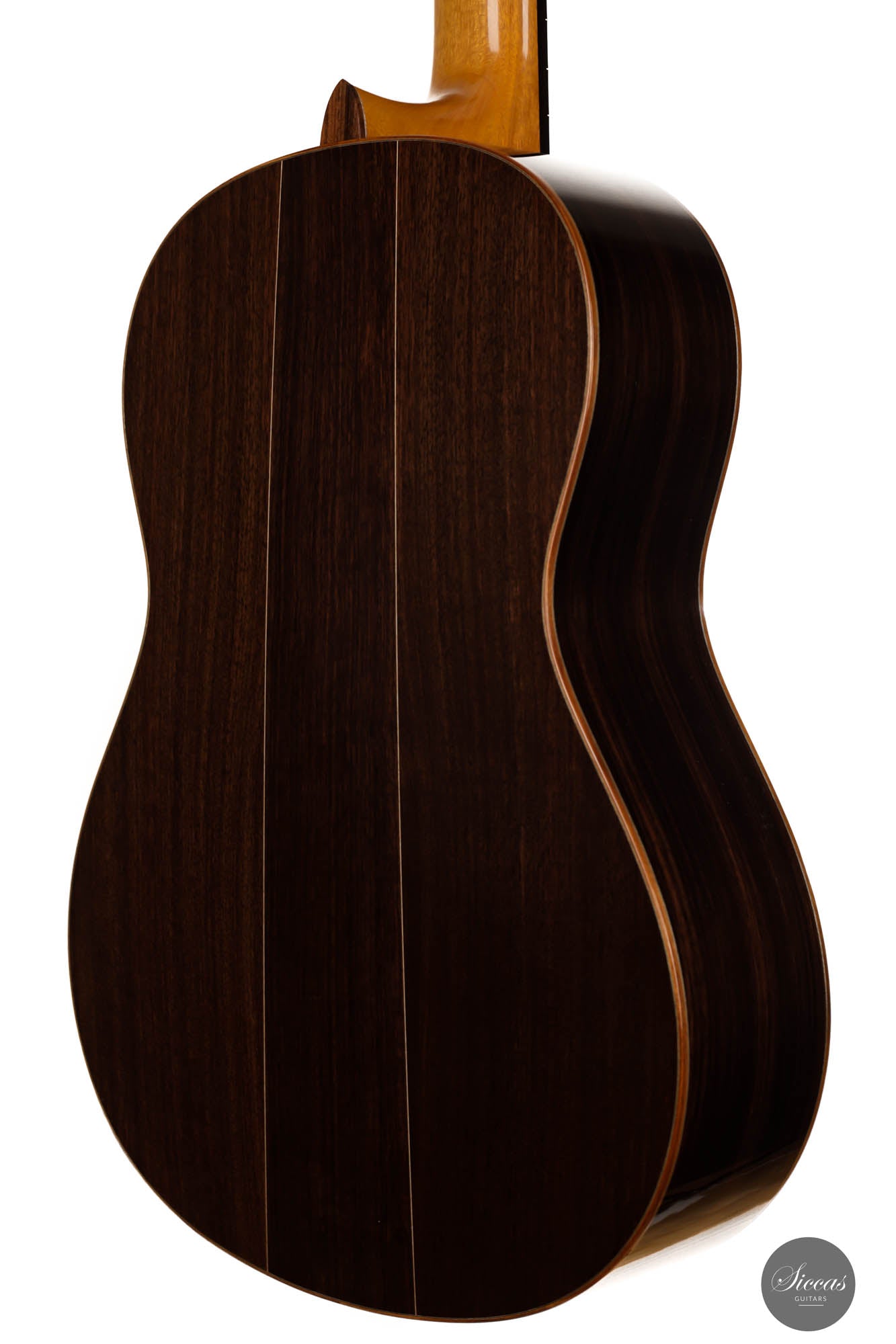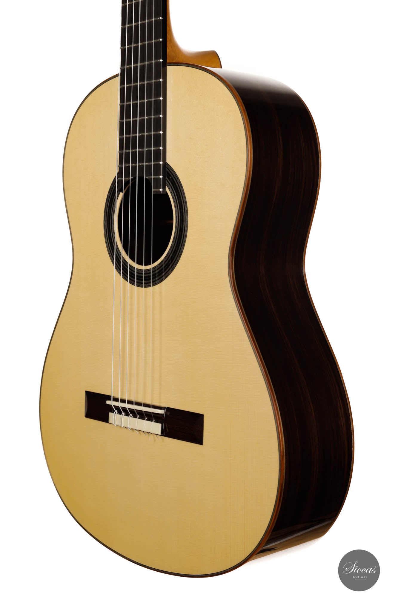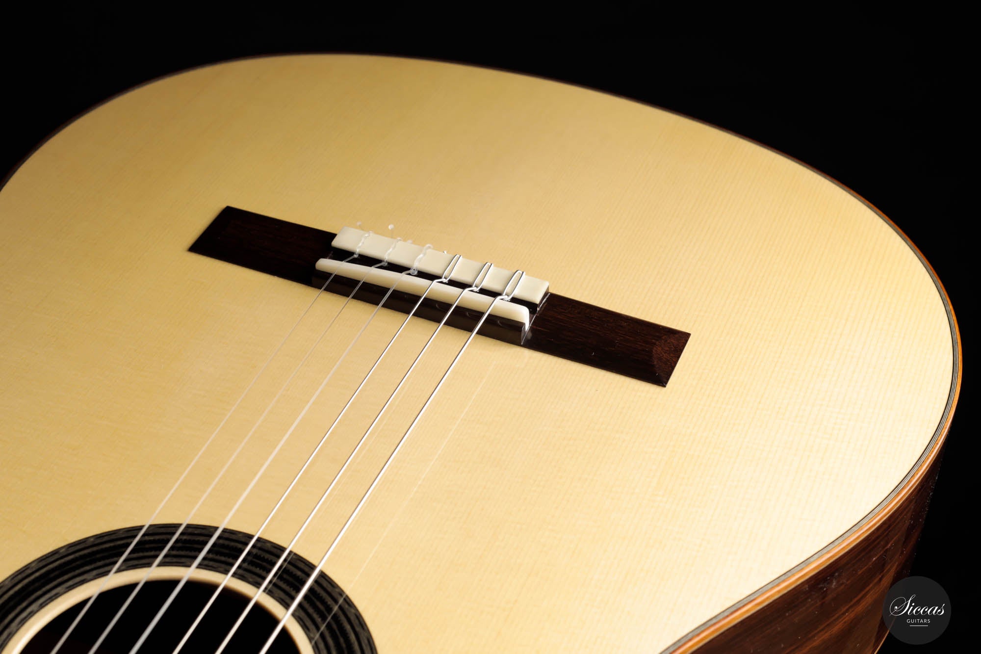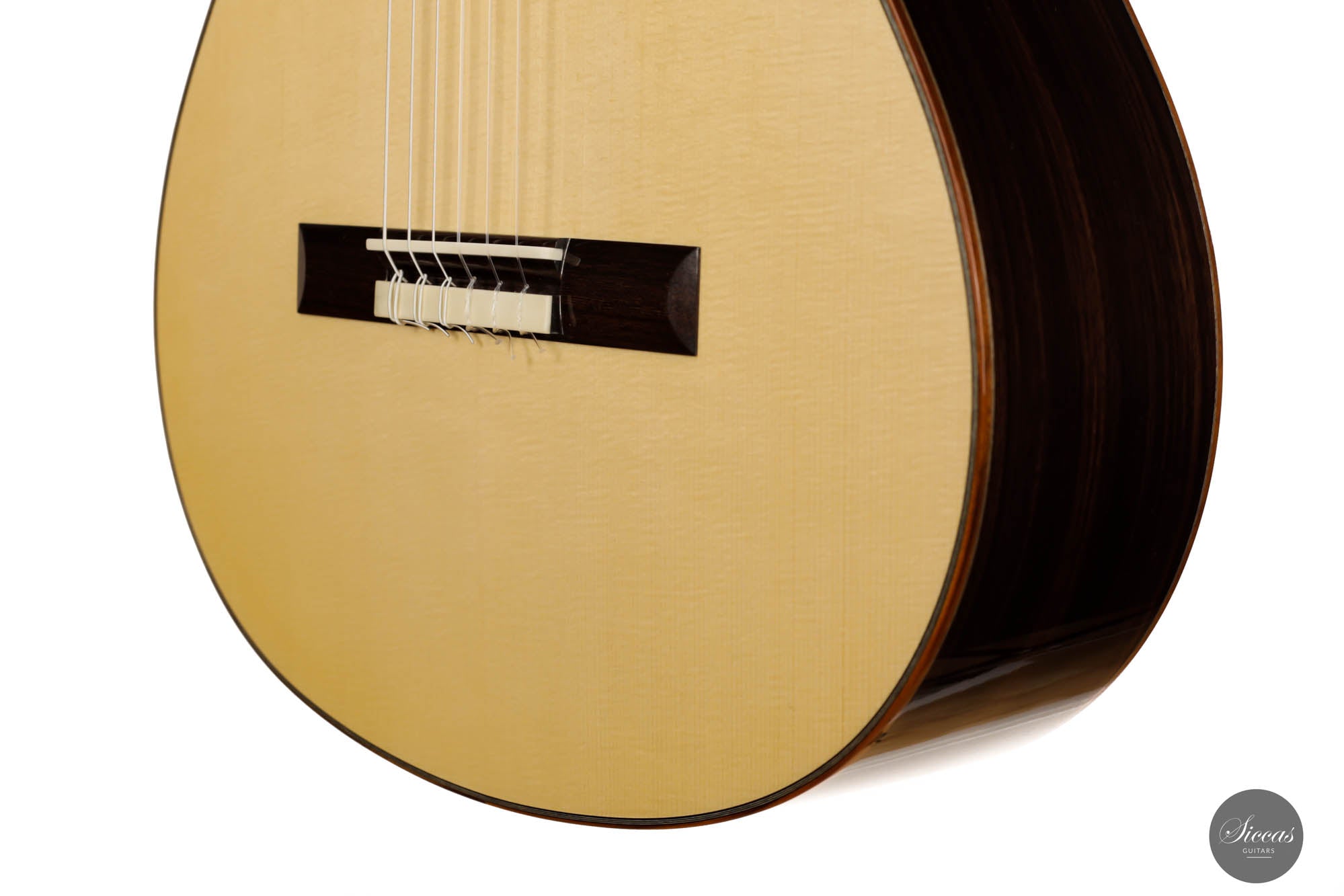 Diese feine Gitarre aus der Hand des sehr talentierten und beeindruckend geschickten Franzosen erfüllt alle Aspekte, die man von einem exzellenten Kunsthandwerker erwarten kann. Sylvain hat mit diesem schönen Instrument wieder einmal seinen Perfektionismus unter Beweis gestellt. Jedes einzelne Teil wurde perfekt ausgeführt. Auch die schwarz-weiße und doch schlichte Rosette zeigt deutlich Sylvains eleganten Kunstsinn. Die helle Fichtendecke und der dunkle Boden und die Zargen aus indischem Palisander ergänzen das gesamte Farbkonzept dieser Gitarre. Dieses schöne Instrument ist auch akustisch fesselnd. Sie hat alle Attribute einer fantastischen Konzertgitarre, wie z.B. gute Lautstärke, komfortable Spielbarkeit und allgemeine Ausgewogenheit. Diese Gitarre ist ein Premium-Instrument aus der nächsten Generation französischer Gitarrenbau-Traditionsträger.
