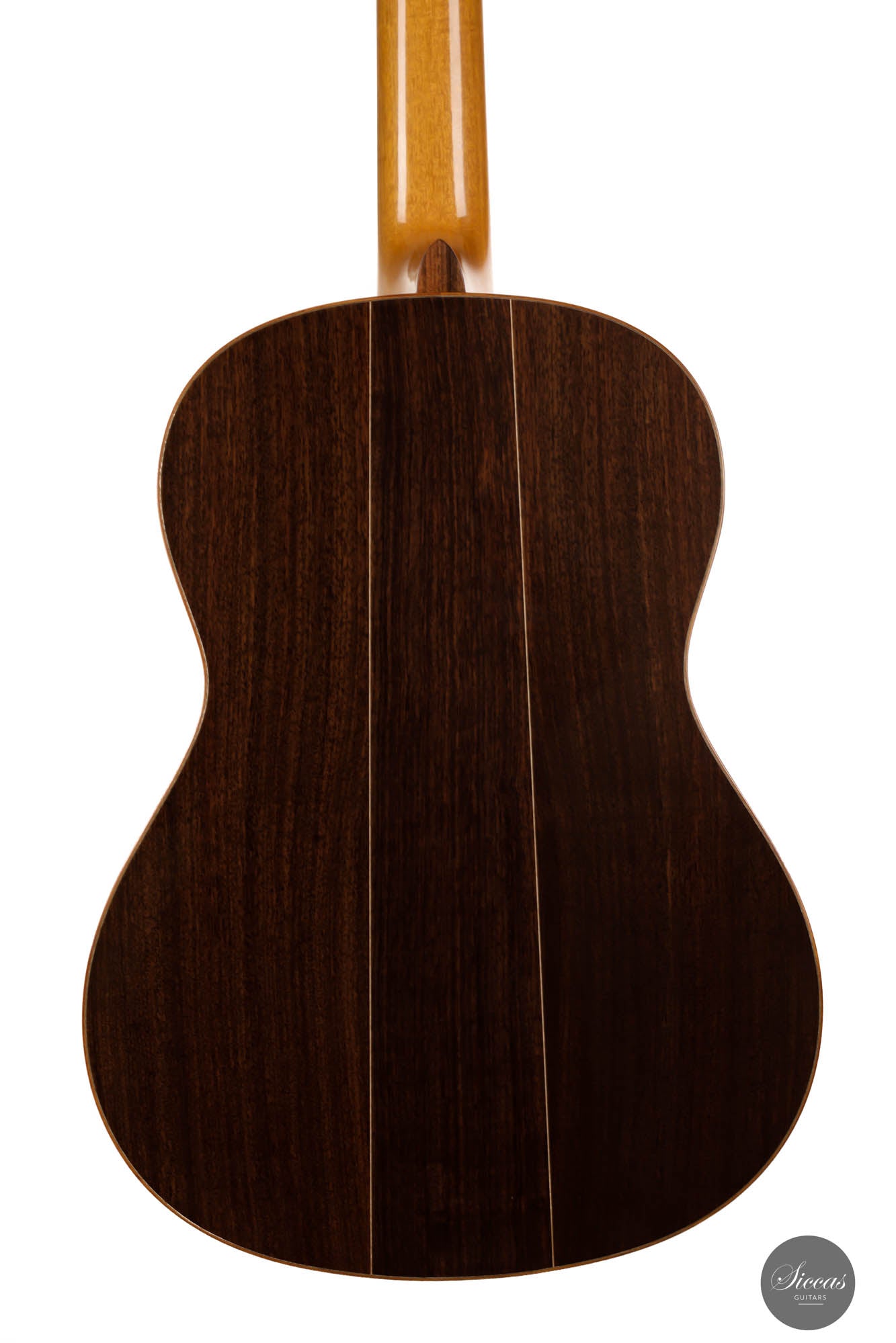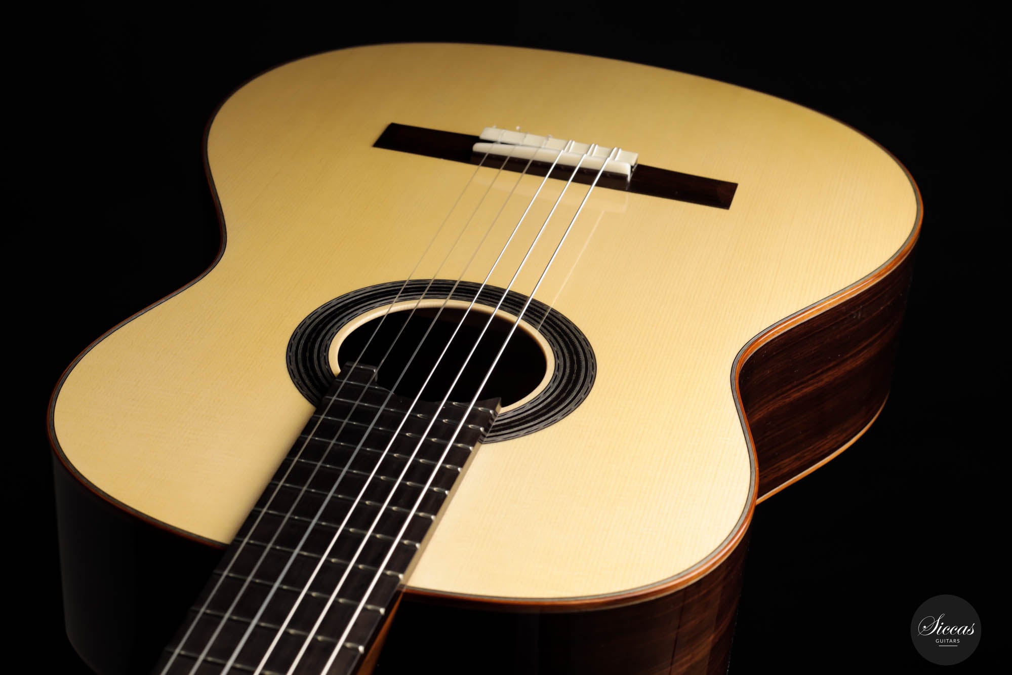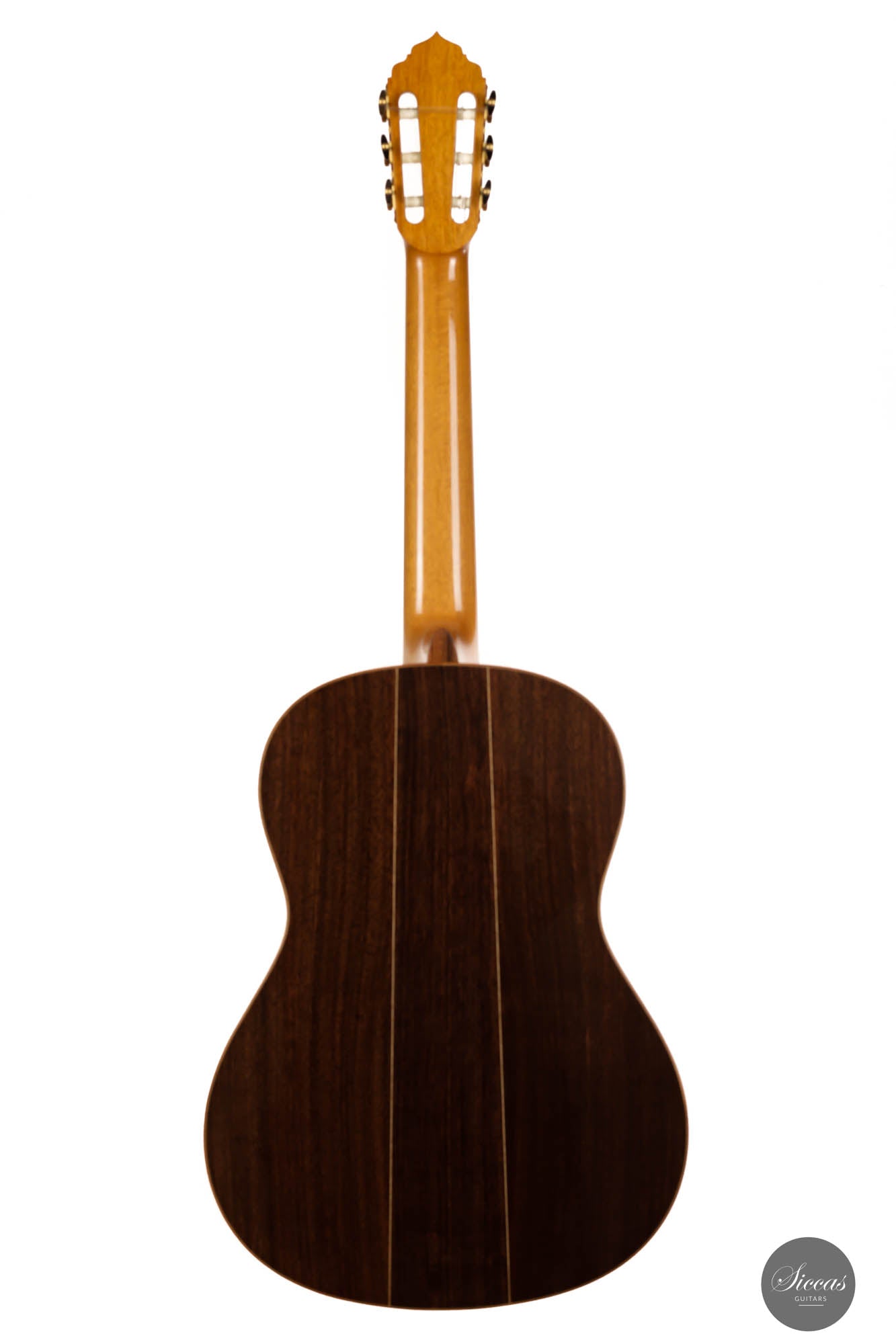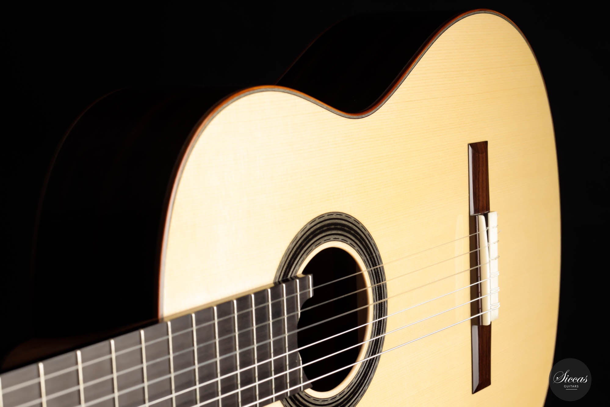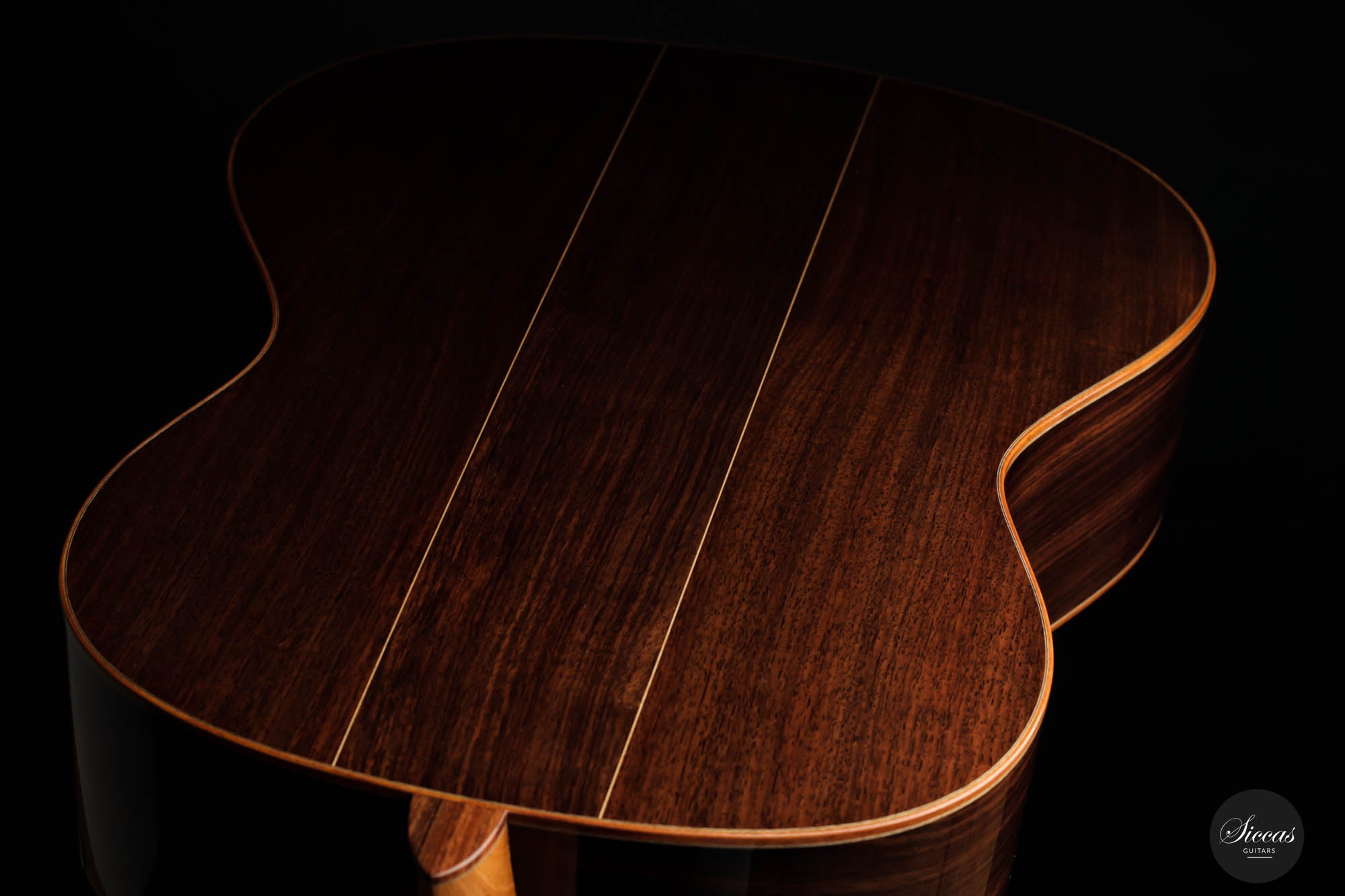 Diese feine Gitarre aus der Hand des sehr talentierten und beeindruckend geschickten Franzosen erfüllt alle Aspekte, die man von einem exzellenten Kunsthandwerker erwarten kann. Sylvain hat mit diesem schönen Instrument wieder einmal seinen Perfektionismus unter Beweis gestellt. Jedes einzelne Teil wurde perfekt ausgeführt. Auch die schwarz-weiße und doch schlichte Rosette zeigt deutlich Sylvains eleganten Kunstsinn. Die helle Fichtendecke und der dunkle Boden und die Zargen aus indischem Palisander ergänzen das gesamte Farbkonzept dieser Gitarre. Dieses schöne Instrument ist auch akustisch fesselnd. Sie hat alle Attribute einer fantastischen Konzertgitarre, wie z.B. gute Lautstärke, komfortable Spielbarkeit und allgemeine Ausgewogenheit. Diese Gitarre ist ein Premium-Instrument aus der nächsten Generation französischer Gitarrenbau-Traditionsträger.