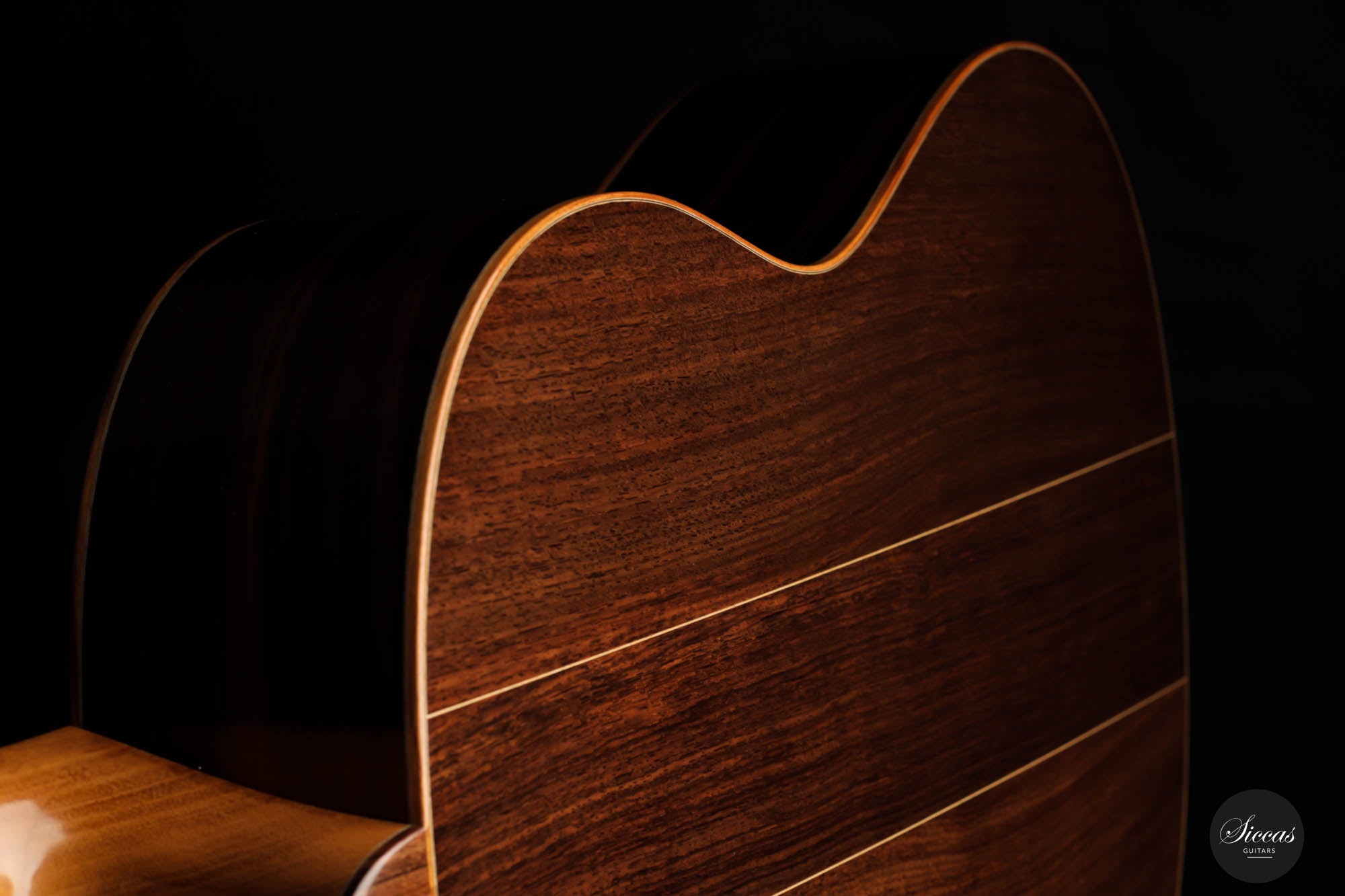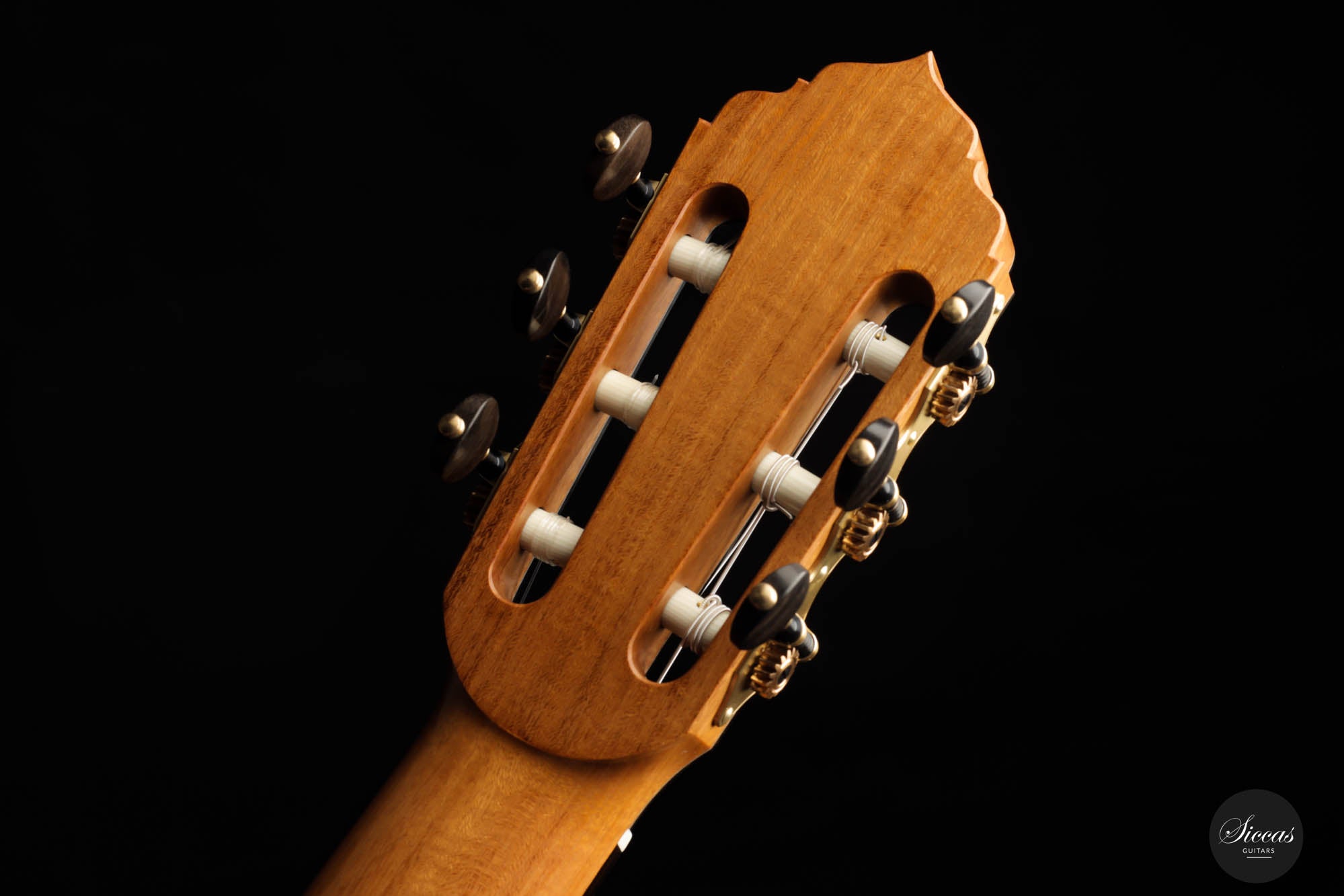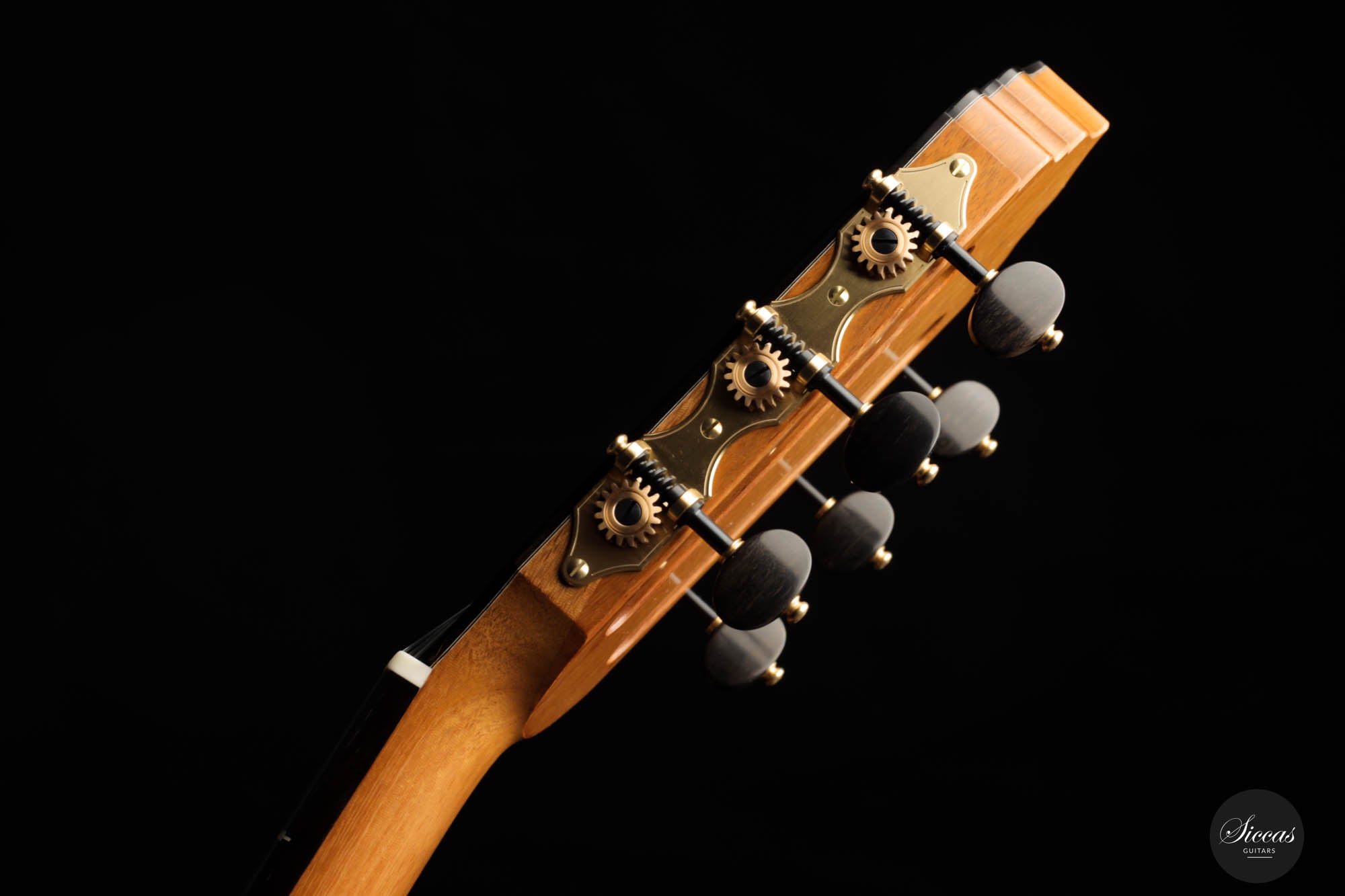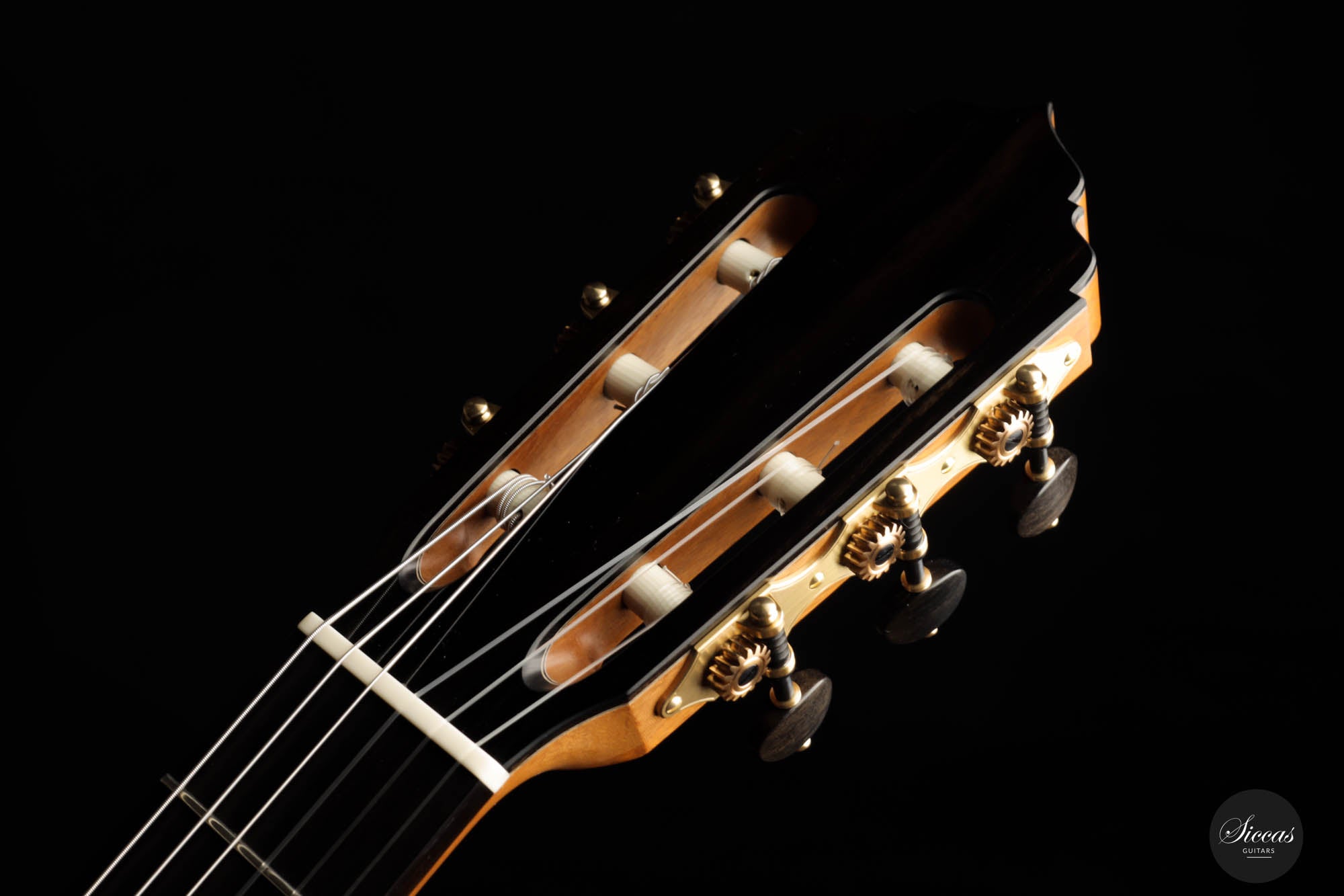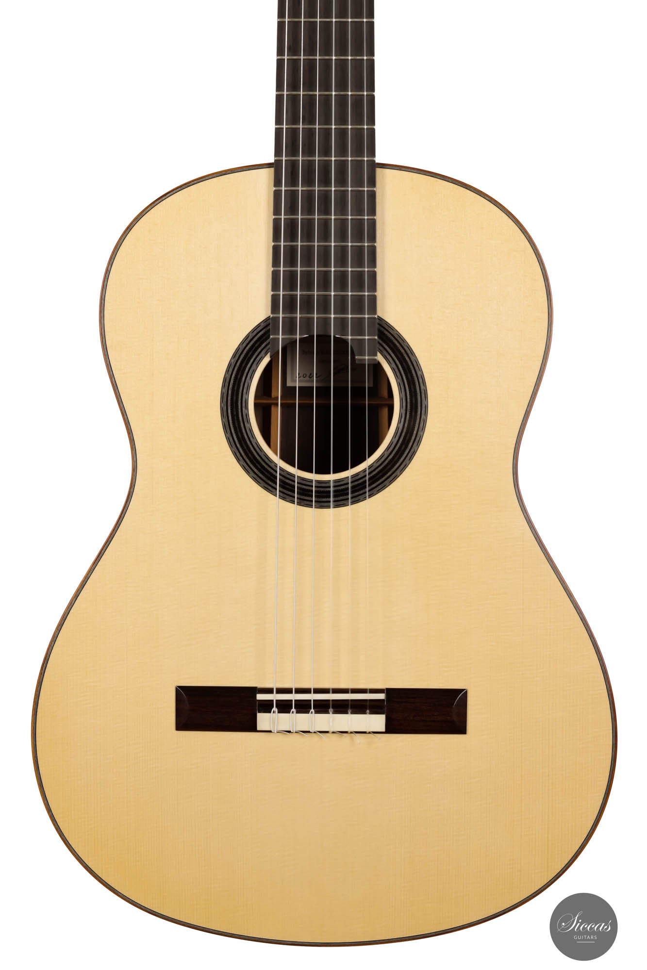 Diese feine Gitarre aus der Hand des sehr talentierten und beeindruckend geschickten Franzosen erfüllt alle Aspekte, die man von einem exzellenten Kunsthandwerker erwarten kann. Sylvain hat mit diesem schönen Instrument wieder einmal seinen Perfektionismus unter Beweis gestellt. Jedes einzelne Teil wurde perfekt ausgeführt. Auch die schwarz-weiße und doch schlichte Rosette zeigt deutlich Sylvains eleganten Kunstsinn. Die helle Fichtendecke und der dunkle Boden und die Zargen aus indischem Palisander ergänzen das gesamte Farbkonzept dieser Gitarre. Dieses schöne Instrument ist auch akustisch fesselnd. Sie hat alle Attribute einer fantastischen Konzertgitarre, wie z.B. gute Lautstärke, komfortable Spielbarkeit und allgemeine Ausgewogenheit. Diese Gitarre ist ein Premium-Instrument aus der nächsten Generation französischer Gitarrenbau-Traditionsträger.