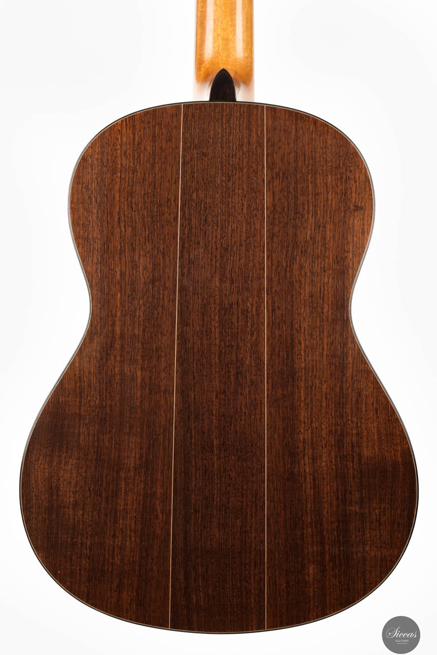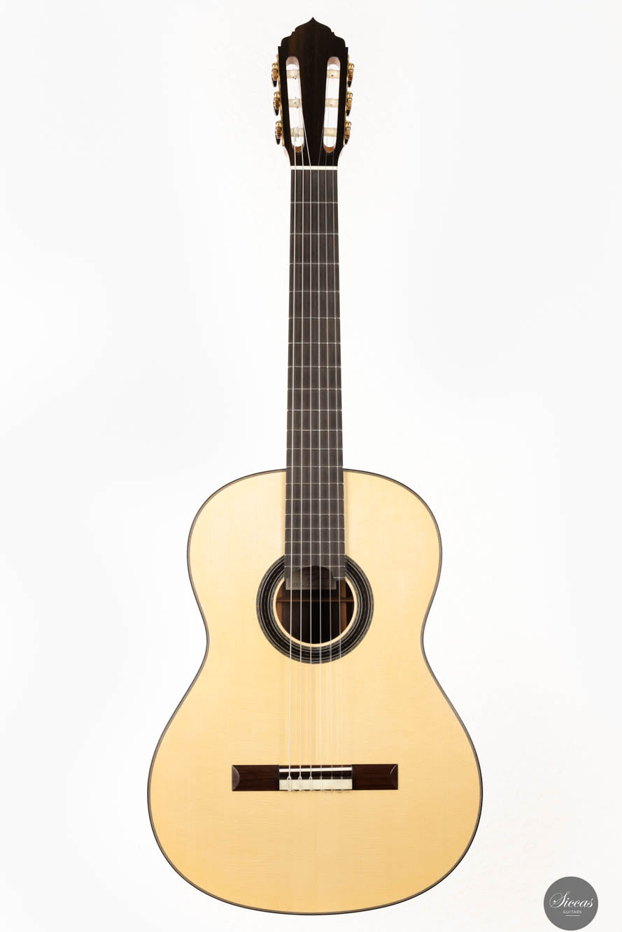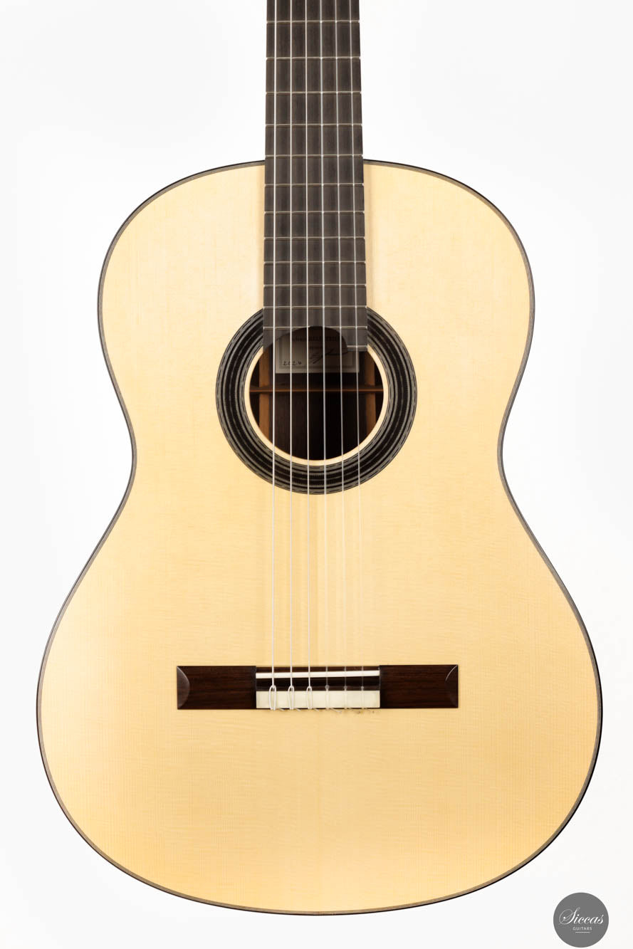 Auf akustischer Ebene liefert Sylvains Gitarre die für ein Konzertinstrument essentiellen Qualitäten: reichliches Volumen, leichte Spielbarkeit und ein ausgewogenes Klangprofil. Diese Attribute machen die Gitarre für Musiker verschiedener Fähigkeitsstufen zugänglich und genießbar. Bemerkenswert ist auch, dass Sylvain Bünde aus rostfreiem Stahl verwendet, um die hohen Obertöne zu verstärken und eine lange Lebensdauer zu gewährleisten, die die traditionellen Bundmaterialien in Bezug auf die Härte deutlich übertrifft. Sie repräsentiert eine Fortsetzung der französischen Tradition im Gitarrenbau, indem sie klassische Ansätze mit zeitgenössischem Design und Klangüberlegungen verbindet. Sylvains Arbeit an dieser Gitarre unterstreicht die anhaltende Evolution des französischen Gitarrenbaus, wo Tradition und Innovation zusammenkommen, um Instrumente von außergewöhnlicher Qualität und Charakter zu produzieren.