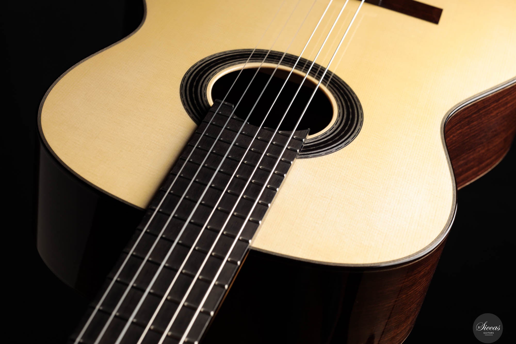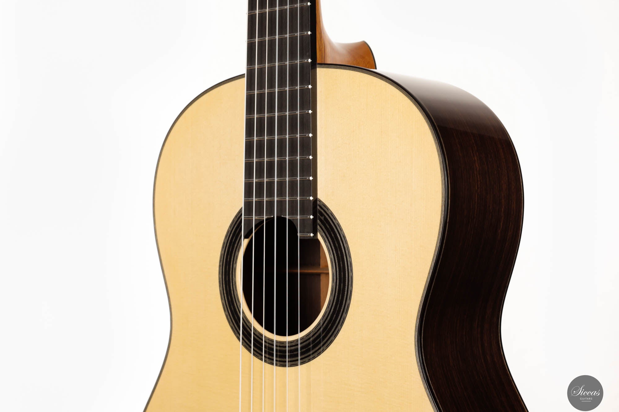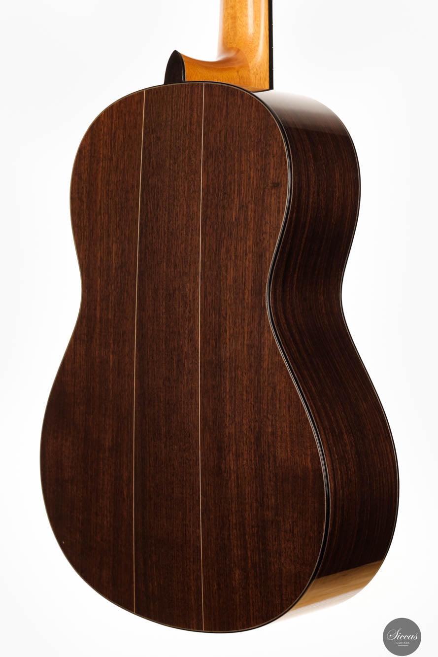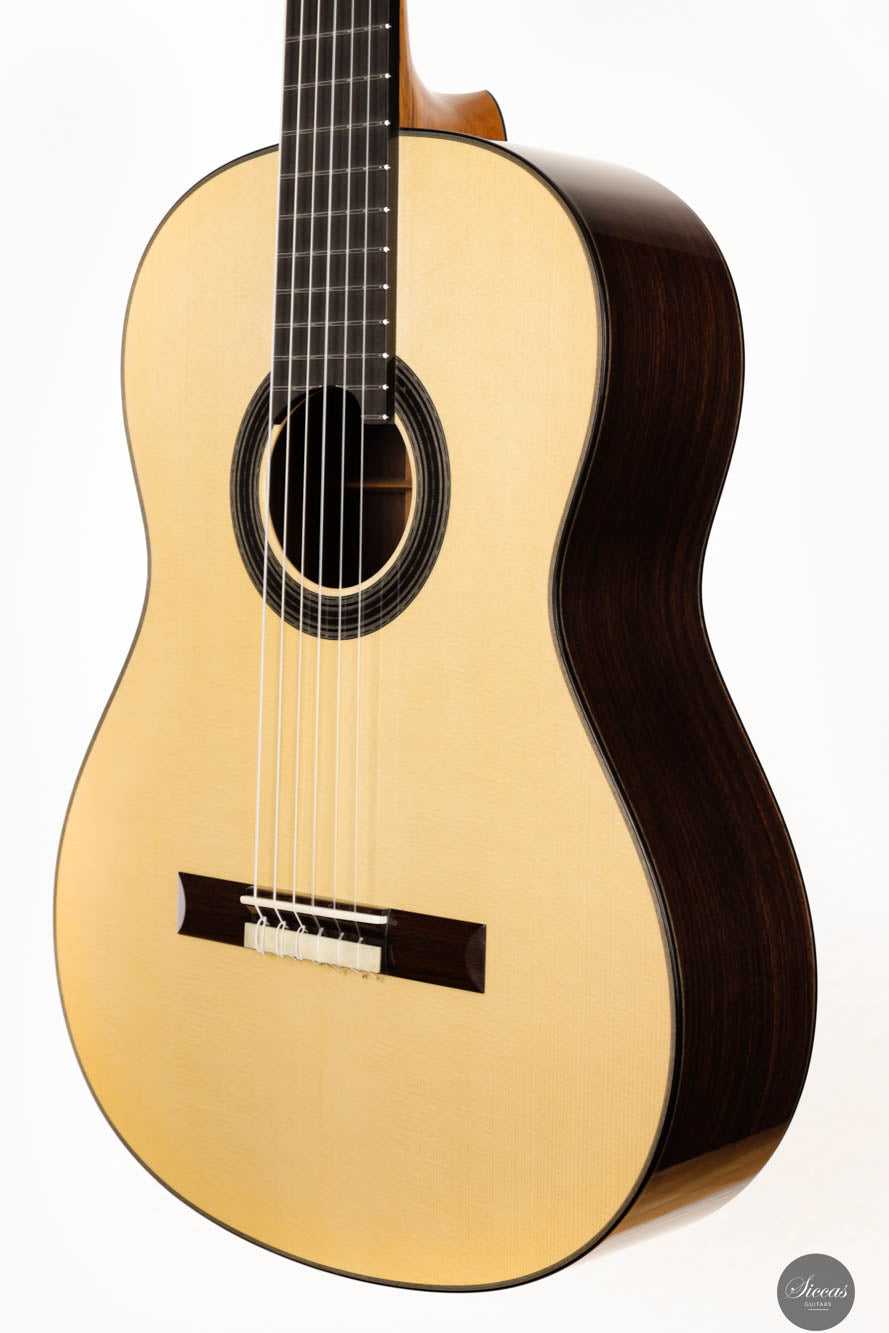 Diese Gitarre, gefertigt vom geschickten französischen Gitarrenbauer Sylvain, zeigt akribisches Handwerk und eine scharfe Aufmerksamkeit für Details in jedem Bestandteil. Sylvains Engagement für Exzellenz spiegelt sich in der makellosen Ausführung des Instruments wider, von der präzisen Konstruktion bis zur elegant schlichten schwarz-weißen Rosette, die sein ausgefeiltes künstlerisches Empfinden unterstreicht. Die Kombination einer hellen Fichtendecke mit dem kontrastierenden dunklen indischen Palisander für Rücken und Seiten harmonisiert nicht nur die visuelle Anziehungskraft der Gitarre, sondern verbessert auch ihre akustischen Eigenschaften und macht sie zu einem herausragenden Stück.