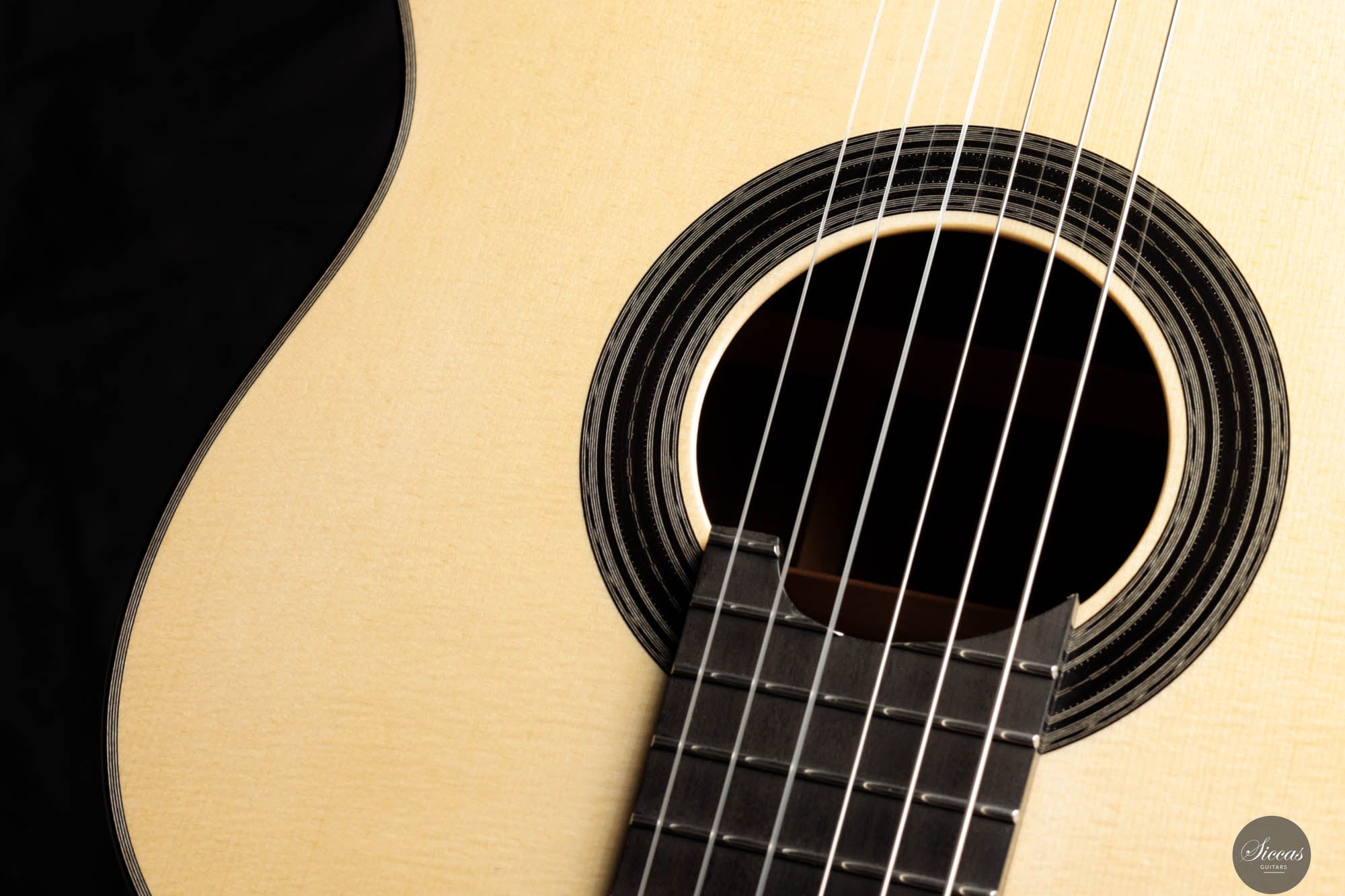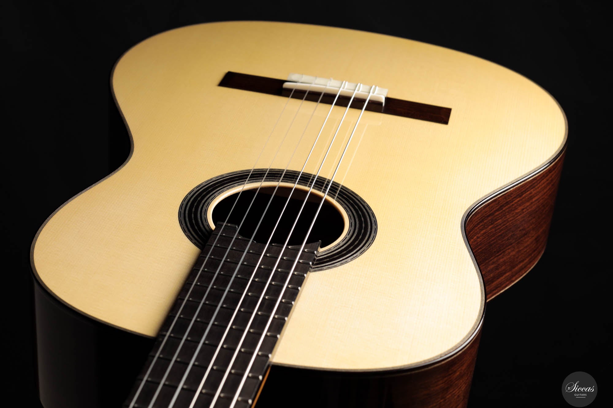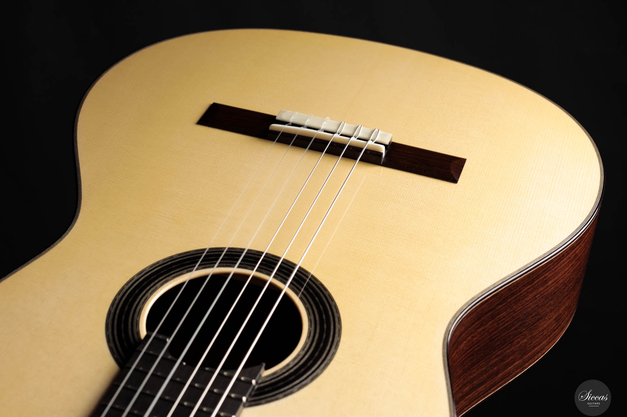 Diese Gitarre, gefertigt vom geschickten französischen Gitarrenbauer Sylvain, zeigt akribisches Handwerk und eine scharfe Aufmerksamkeit für Details in jedem Bestandteil. Sylvains Engagement für Exzellenz spiegelt sich in der makellosen Ausführung des Instruments wider, von der präzisen Konstruktion bis zur elegant schlichten schwarz-weißen Rosette, die sein ausgefeiltes künstlerisches Empfinden unterstreicht. Die Kombination einer hellen Fichtendecke mit dem kontrastierenden dunklen indischen Palisander für Rücken und Seiten harmonisiert nicht nur die visuelle Anziehungskraft der Gitarre, sondern verbessert auch ihre akustischen Eigenschaften und macht sie zu einem herausragenden Stück.
