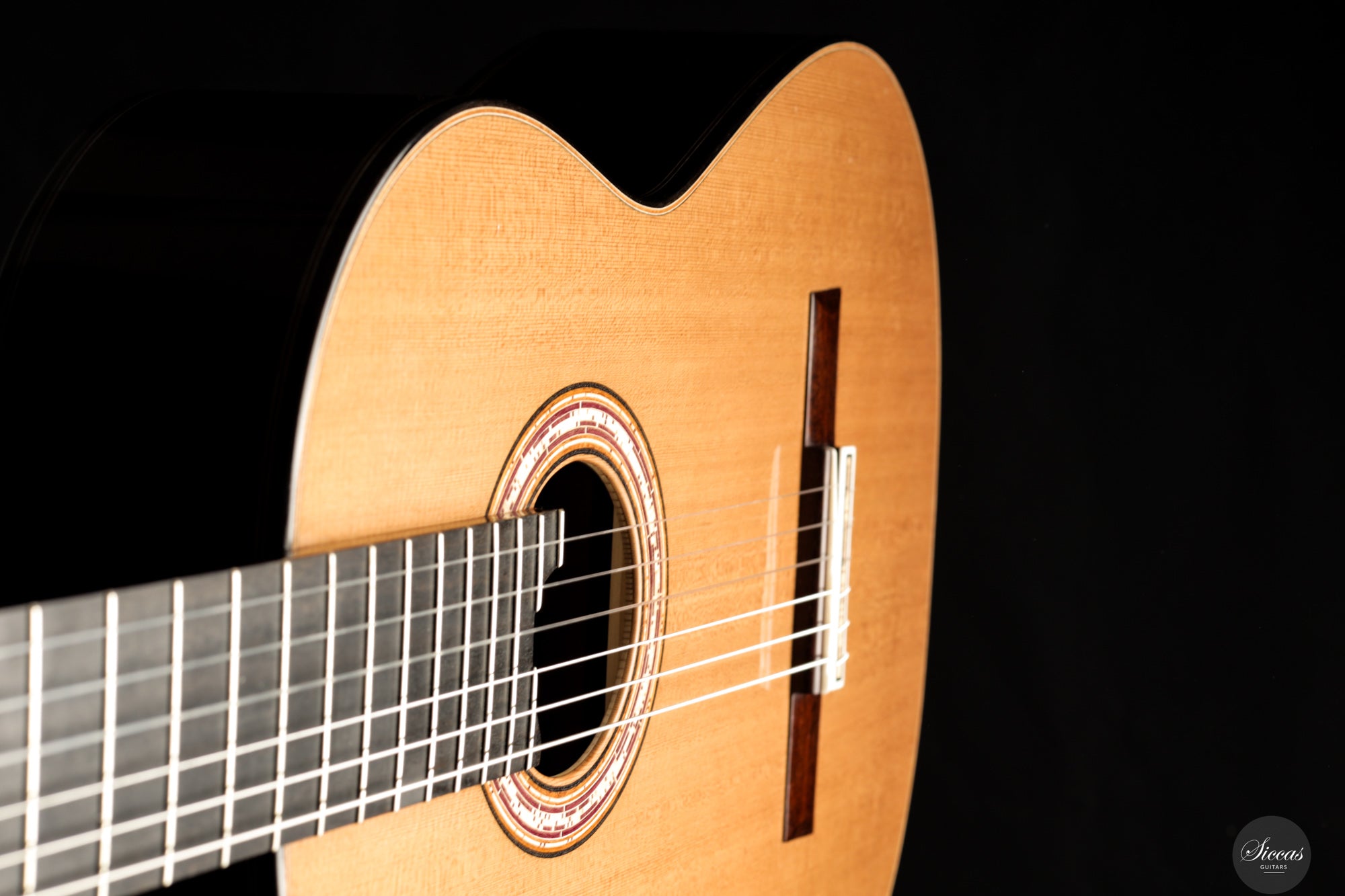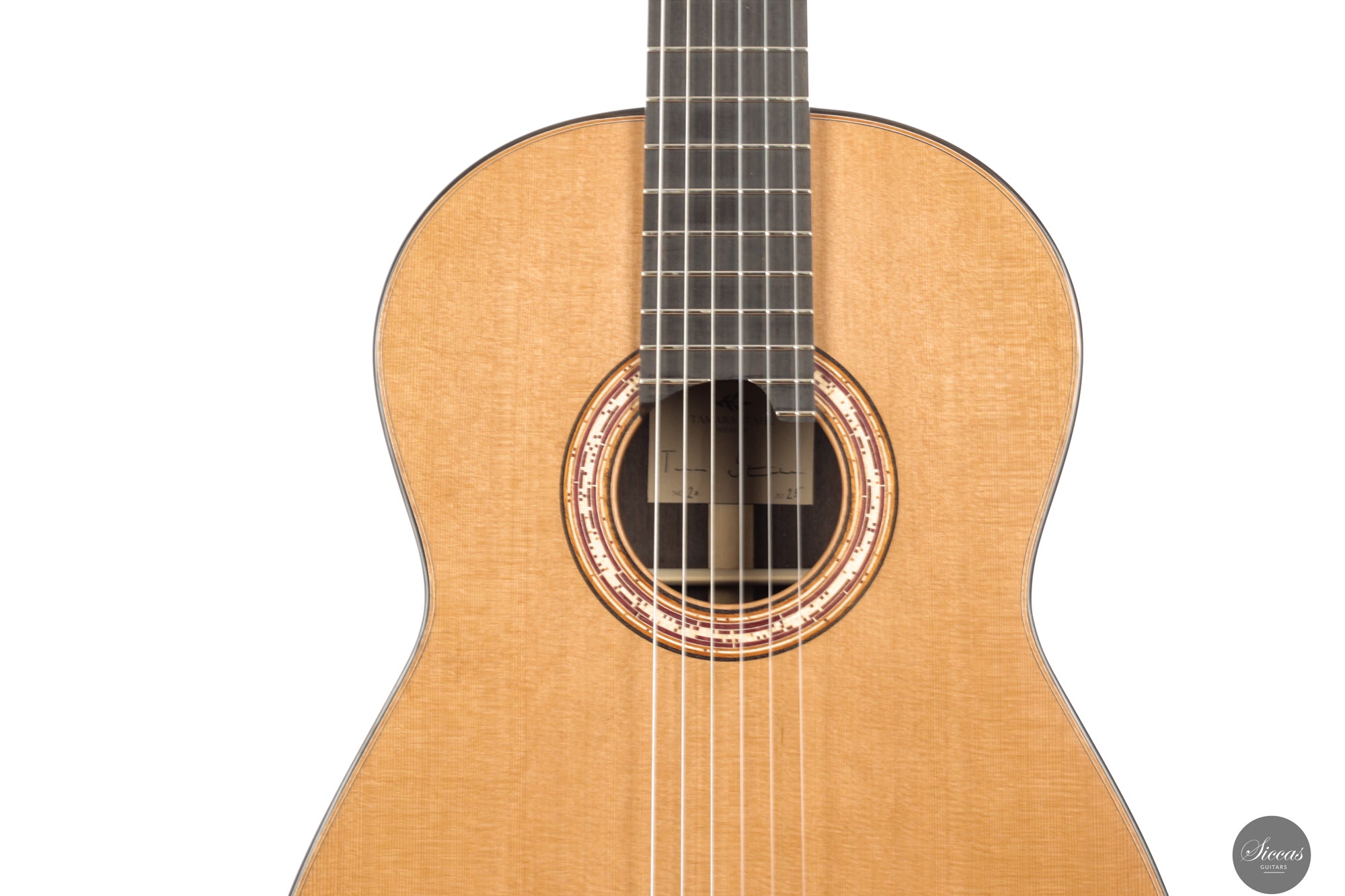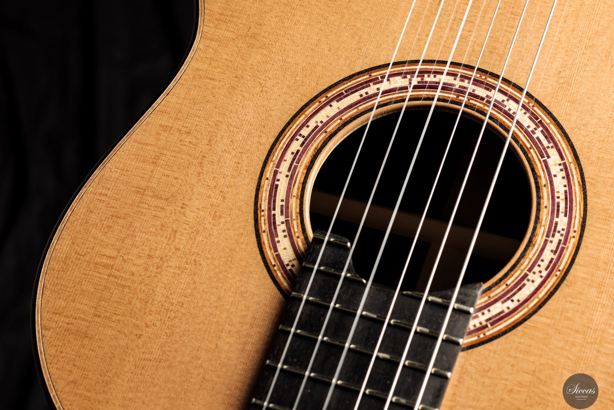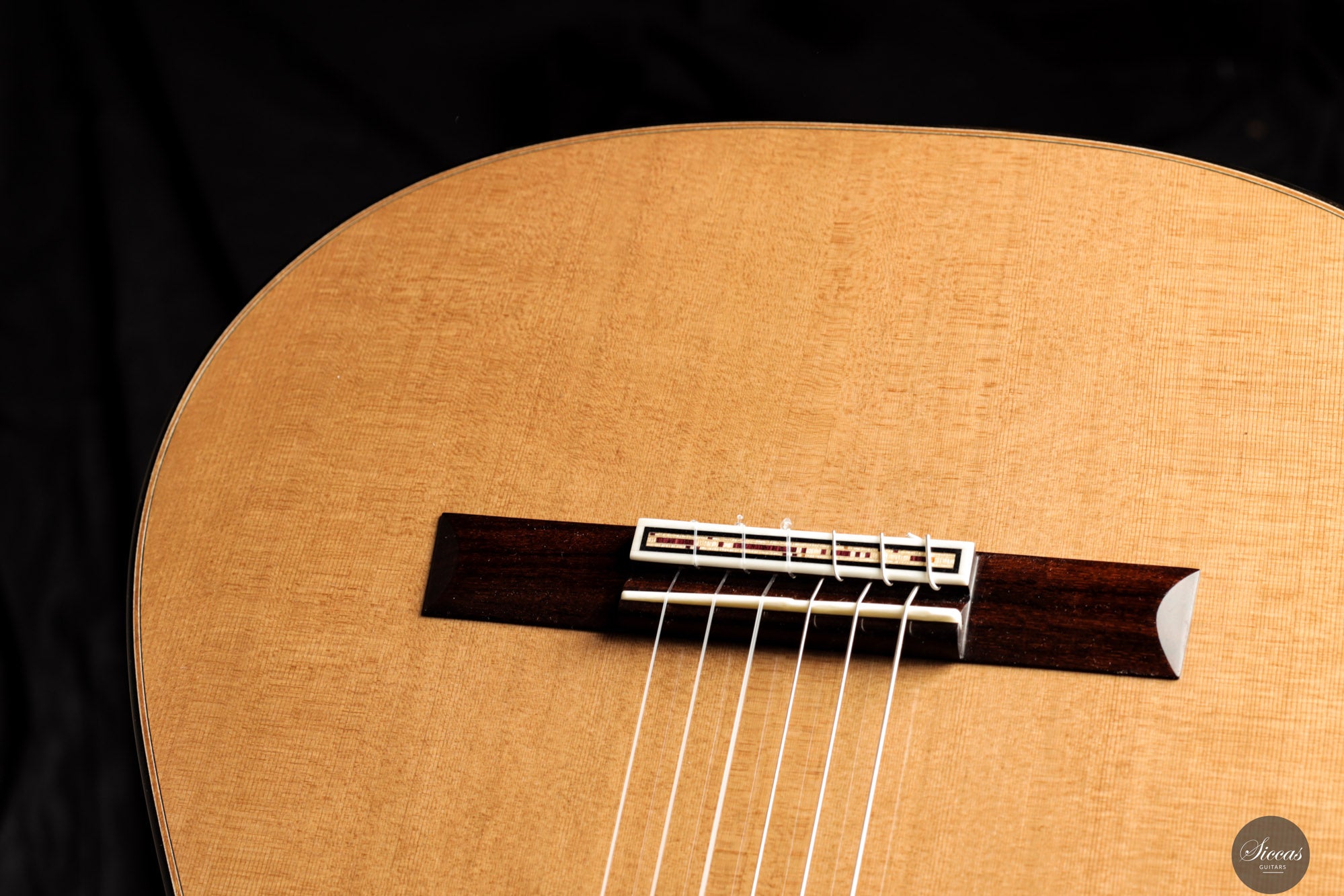 Eine traditionelle Konzertgitarre aus dem Jahr 2025 von Tamara Stahl mit Zederndecke und indischem Palisander. Sie klingt luftig und voll, leicht dunkel gefärbt und sehr rund, reagiert schnell und trägt weit und verbindet traditionelle Intimität mit moderner Projektionskraft.