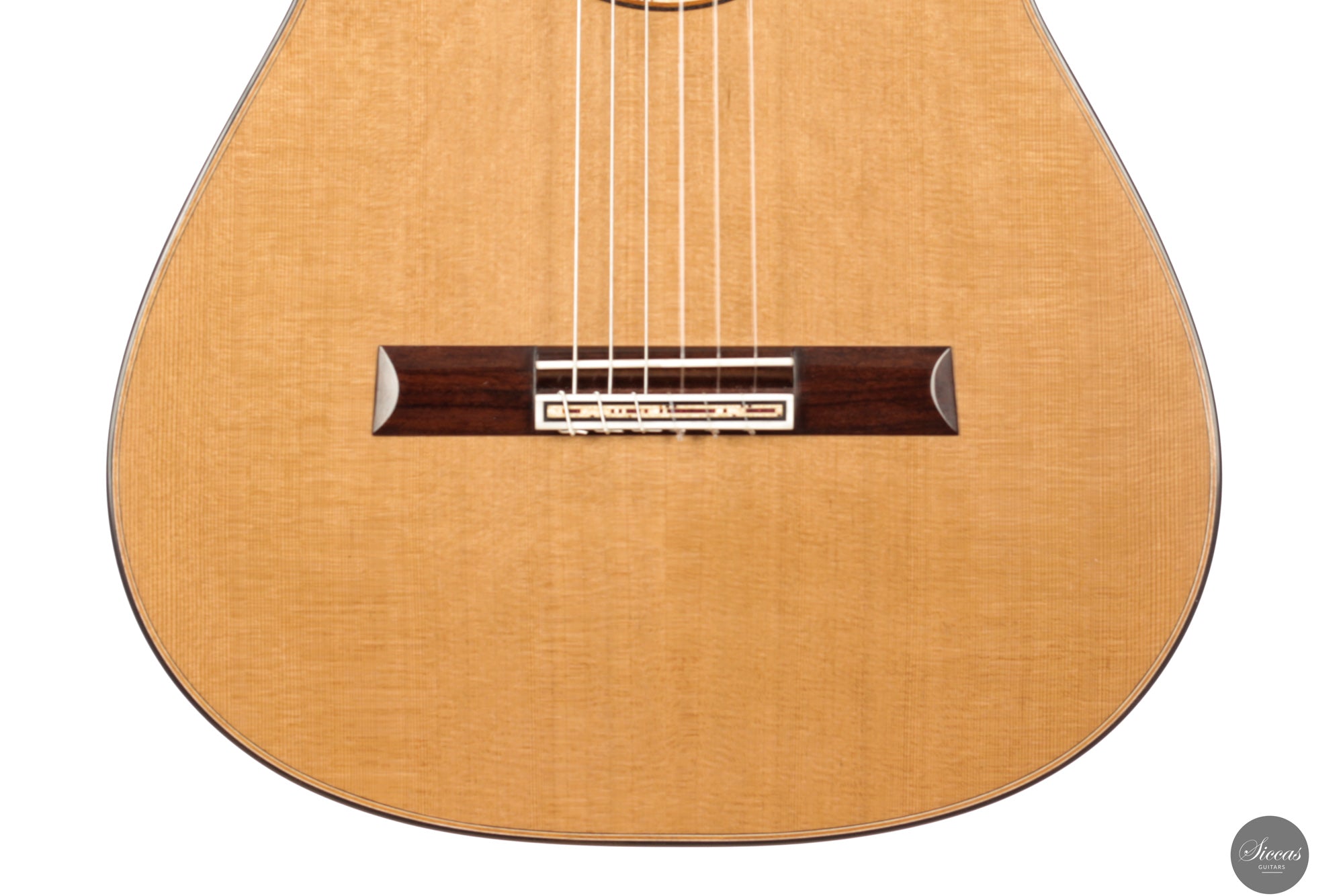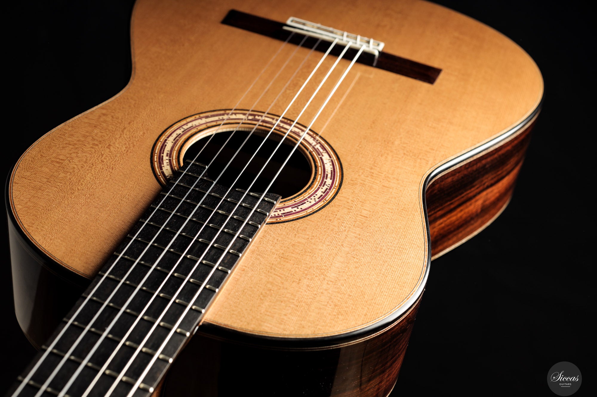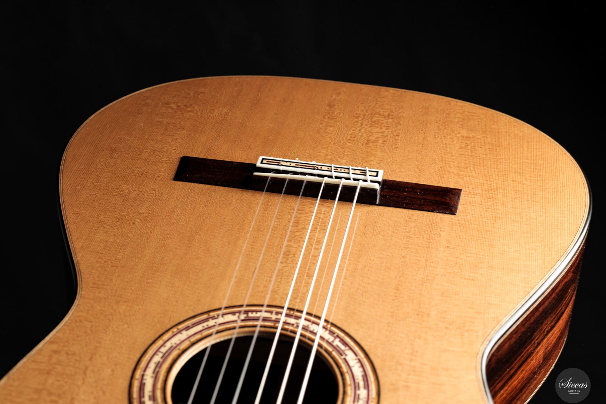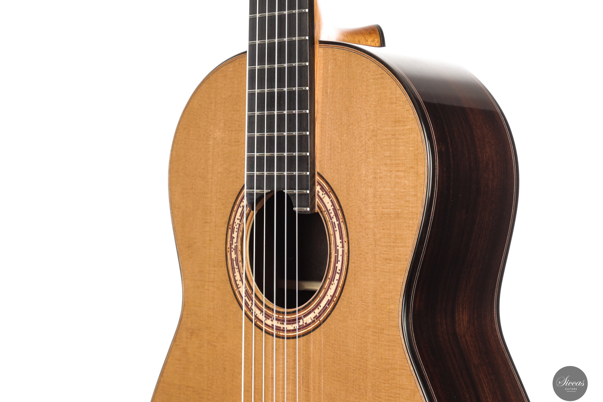 Eine traditionelle Konzertgitarre aus dem Jahr 2025 von Tamara Stahl mit Zederndecke und indischem Palisander. Sie klingt luftig und voll, leicht dunkel gefärbt und sehr rund, reagiert schnell und trägt weit und verbindet traditionelle Intimität mit moderner Projektionskraft.