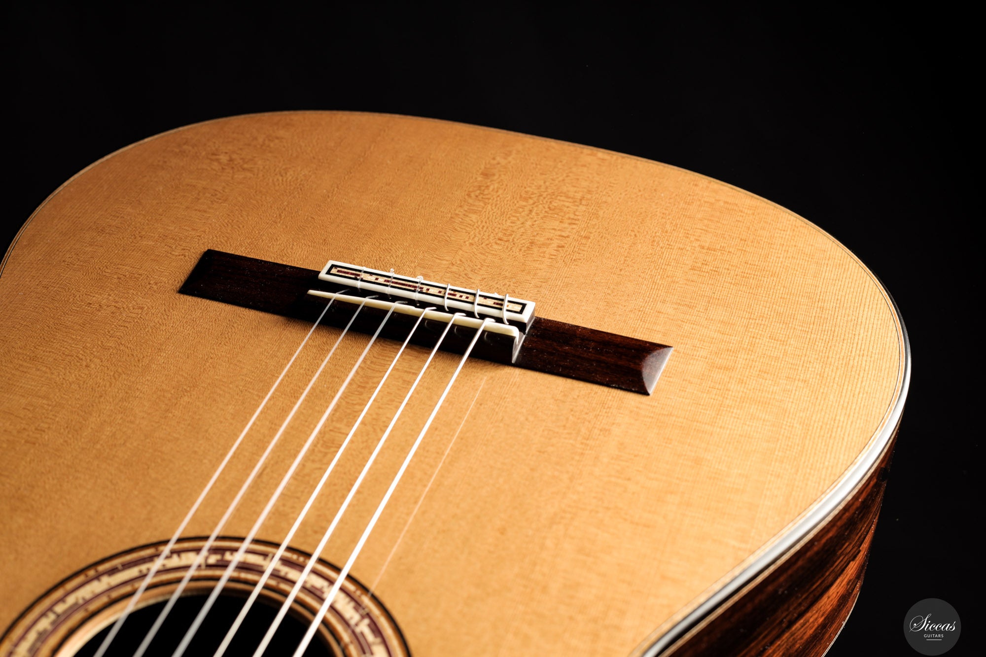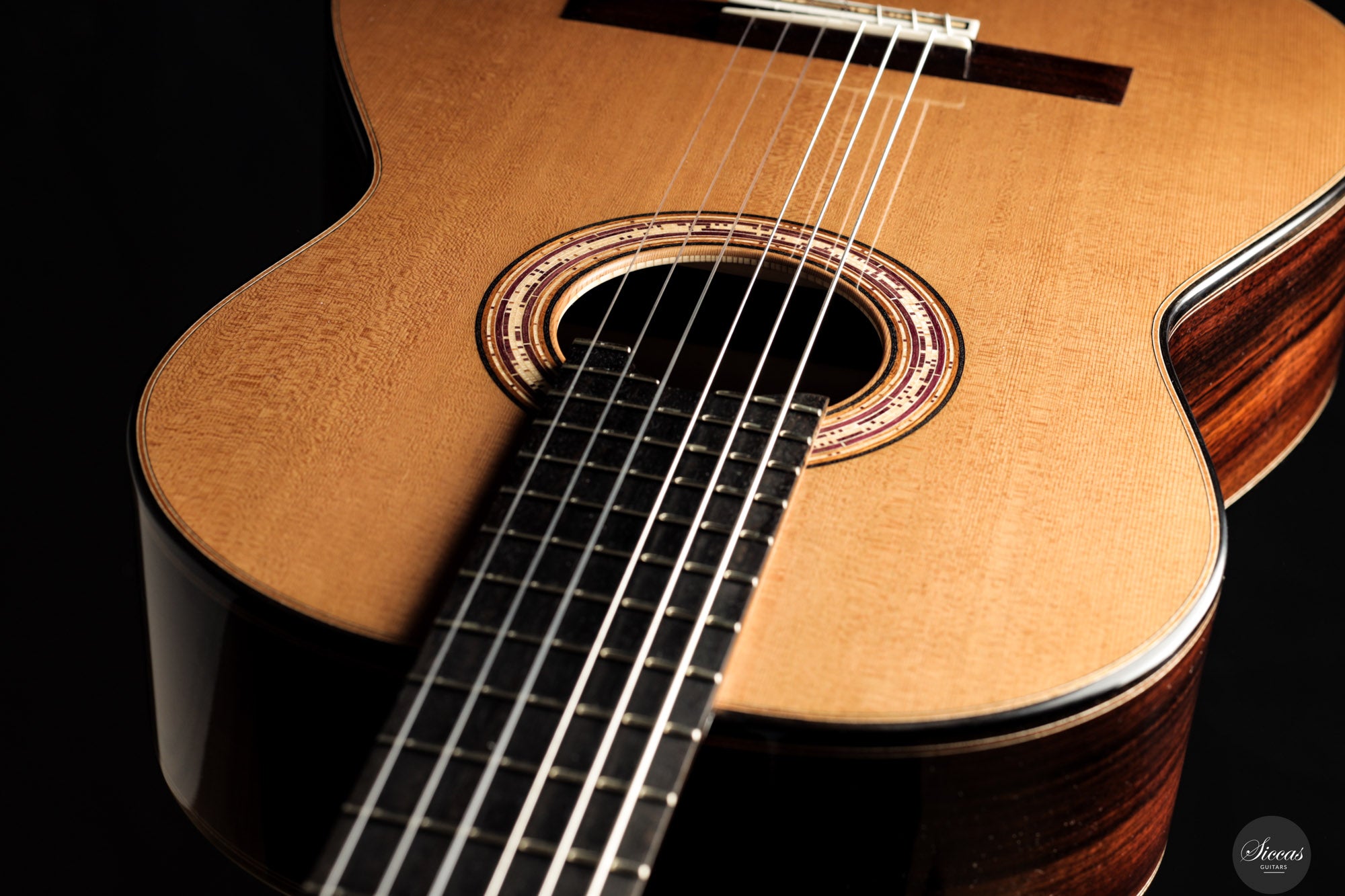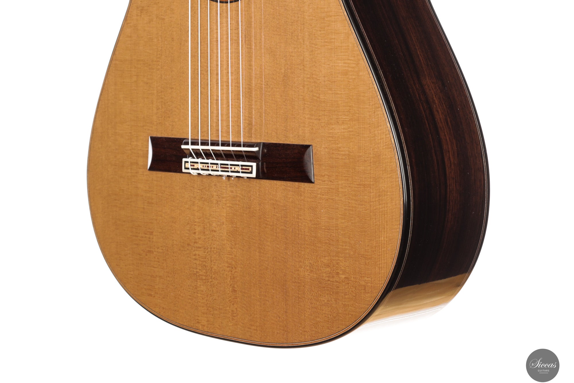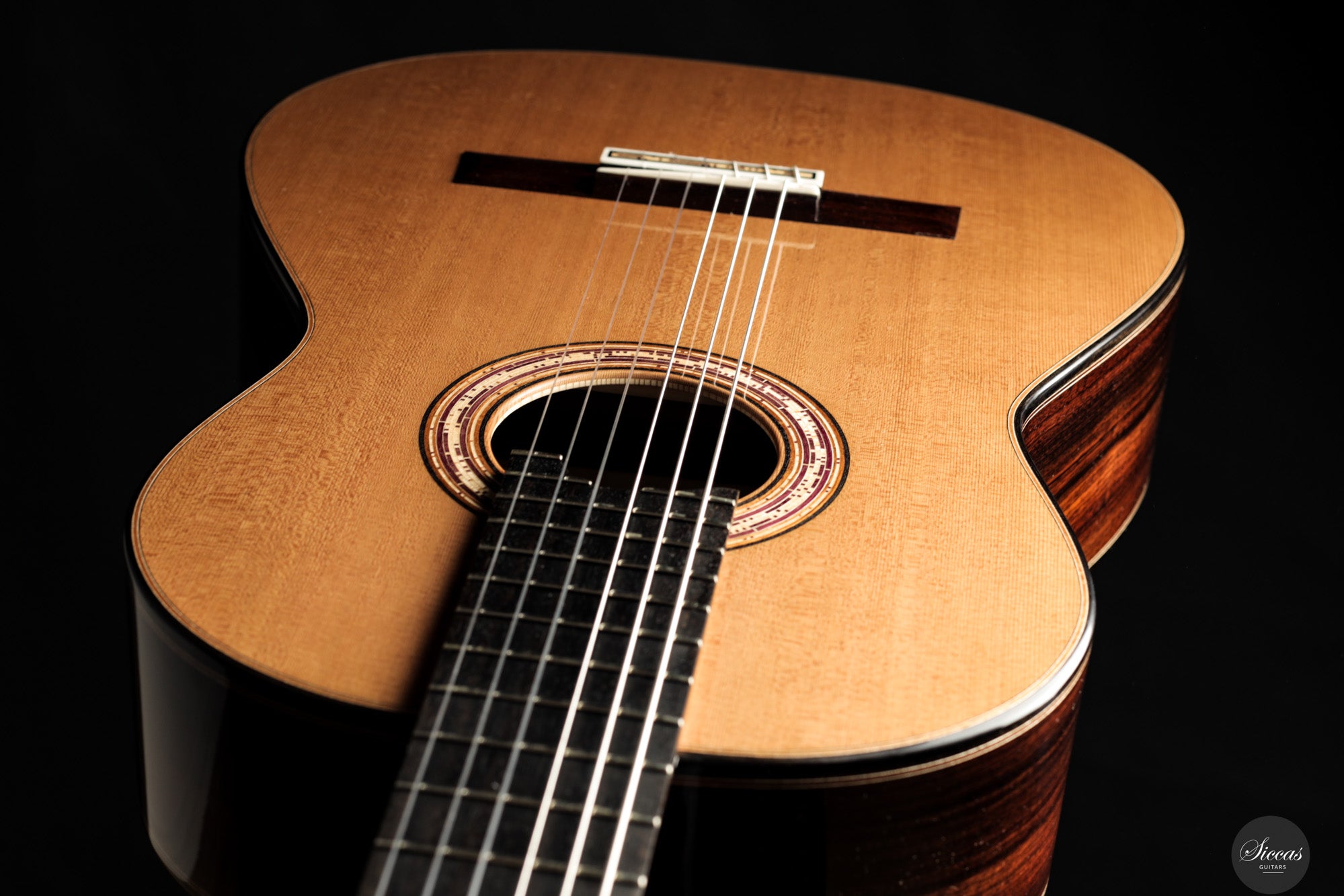 Eine traditionelle Konzertgitarre aus dem Jahr 2025 von Tamara Stahl mit Zederndecke und indischem Palisander. Sie klingt luftig und voll, leicht dunkel gefärbt und sehr rund, reagiert schnell und trägt weit und verbindet traditionelle Intimität mit moderner Projektionskraft.
