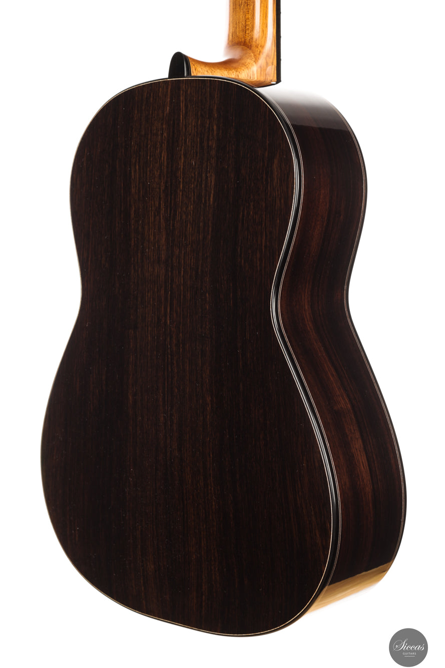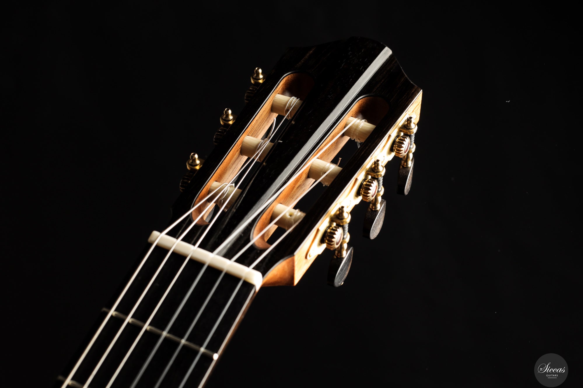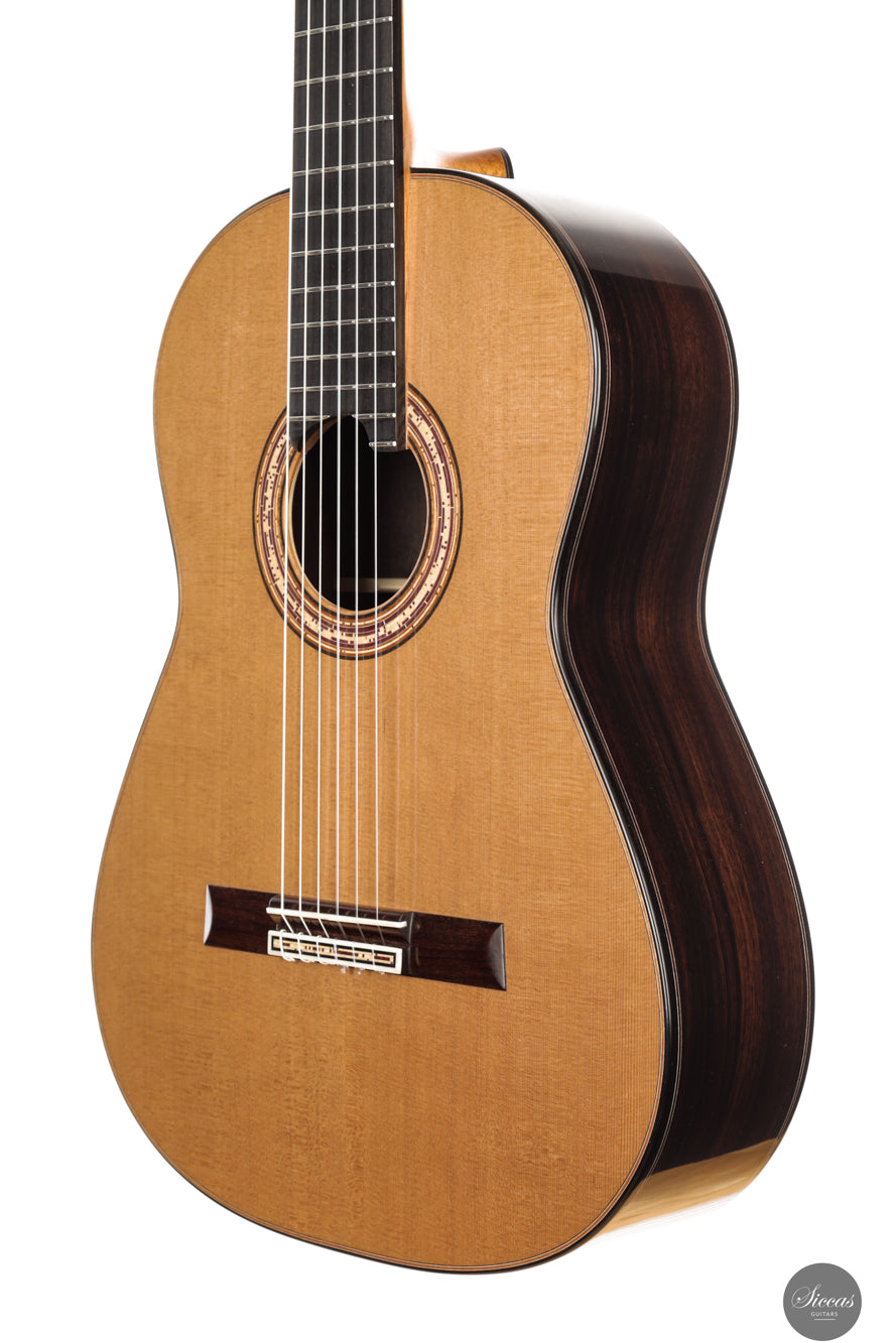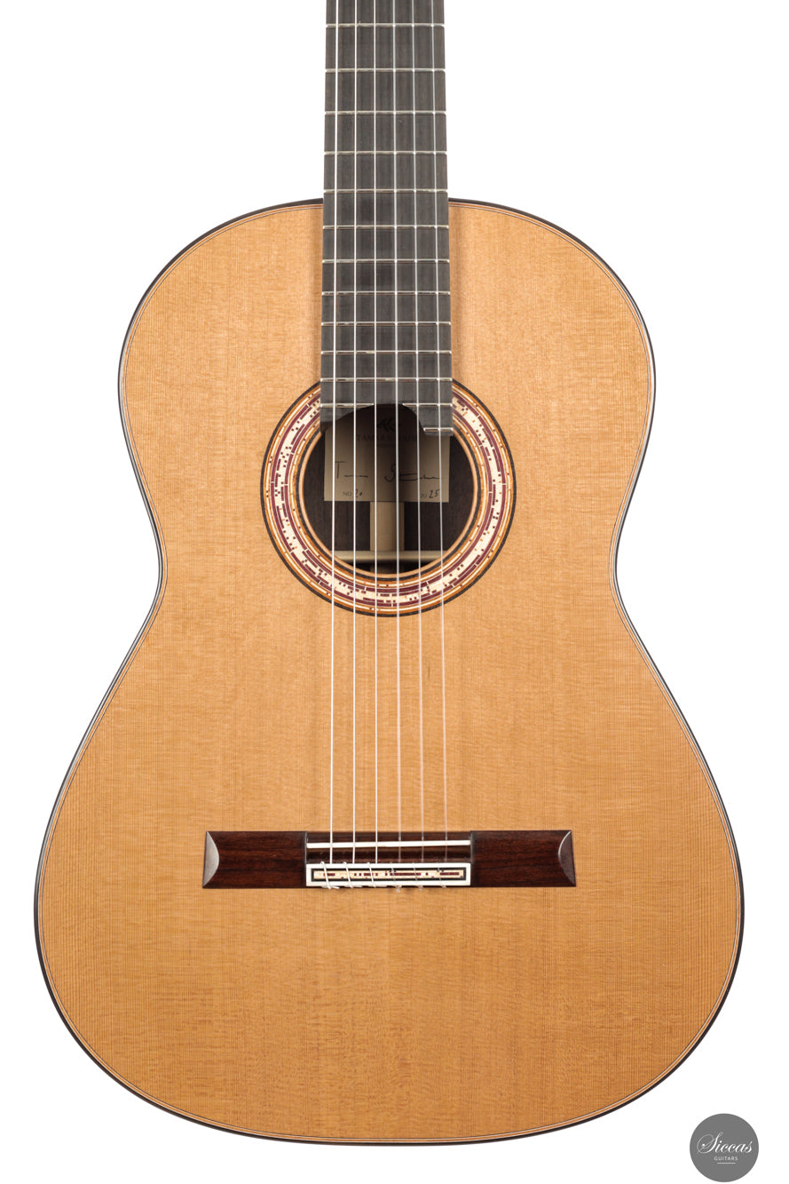 Eine traditionelle Konzertgitarre aus dem Jahr 2025 von Tamara Stahl mit Zederndecke und indischem Palisander. Sie klingt luftig und voll, leicht dunkel gefärbt und sehr rund, reagiert schnell und trägt weit und verbindet traditionelle Intimität mit moderner Projektionskraft.