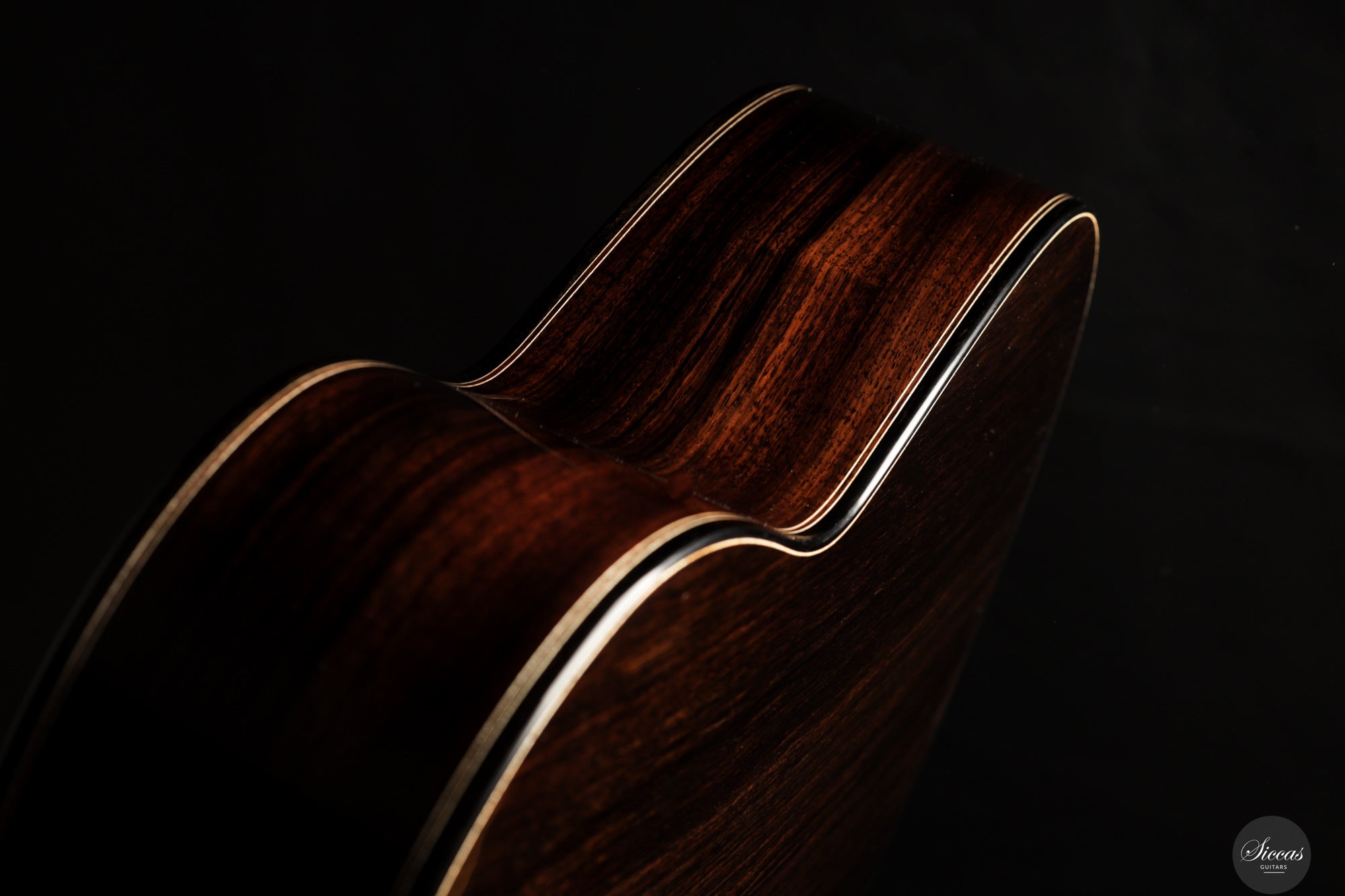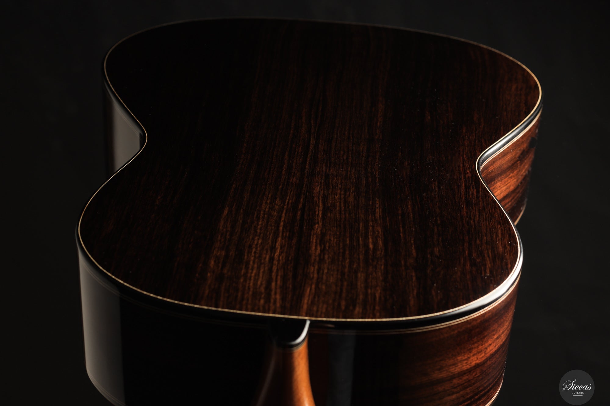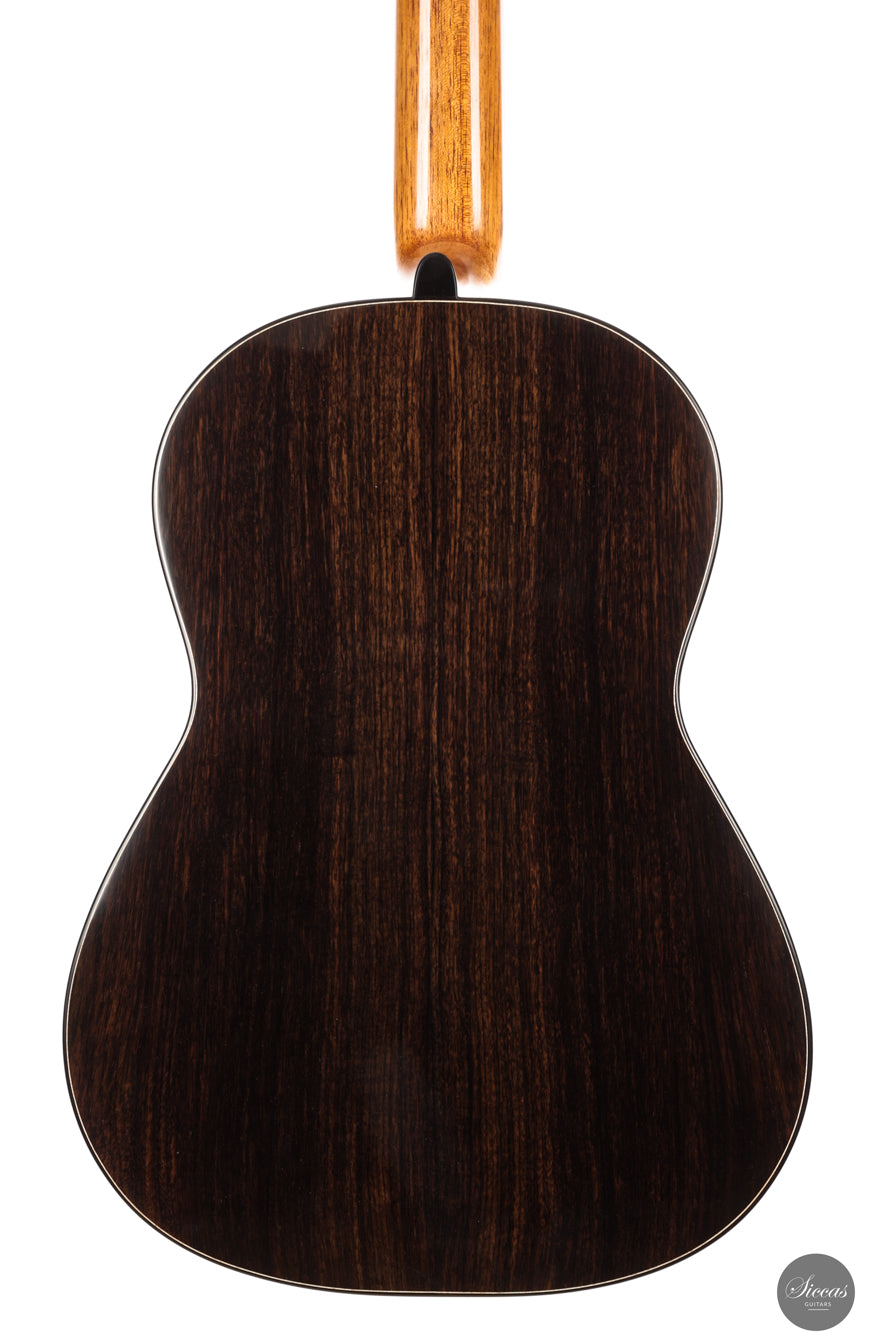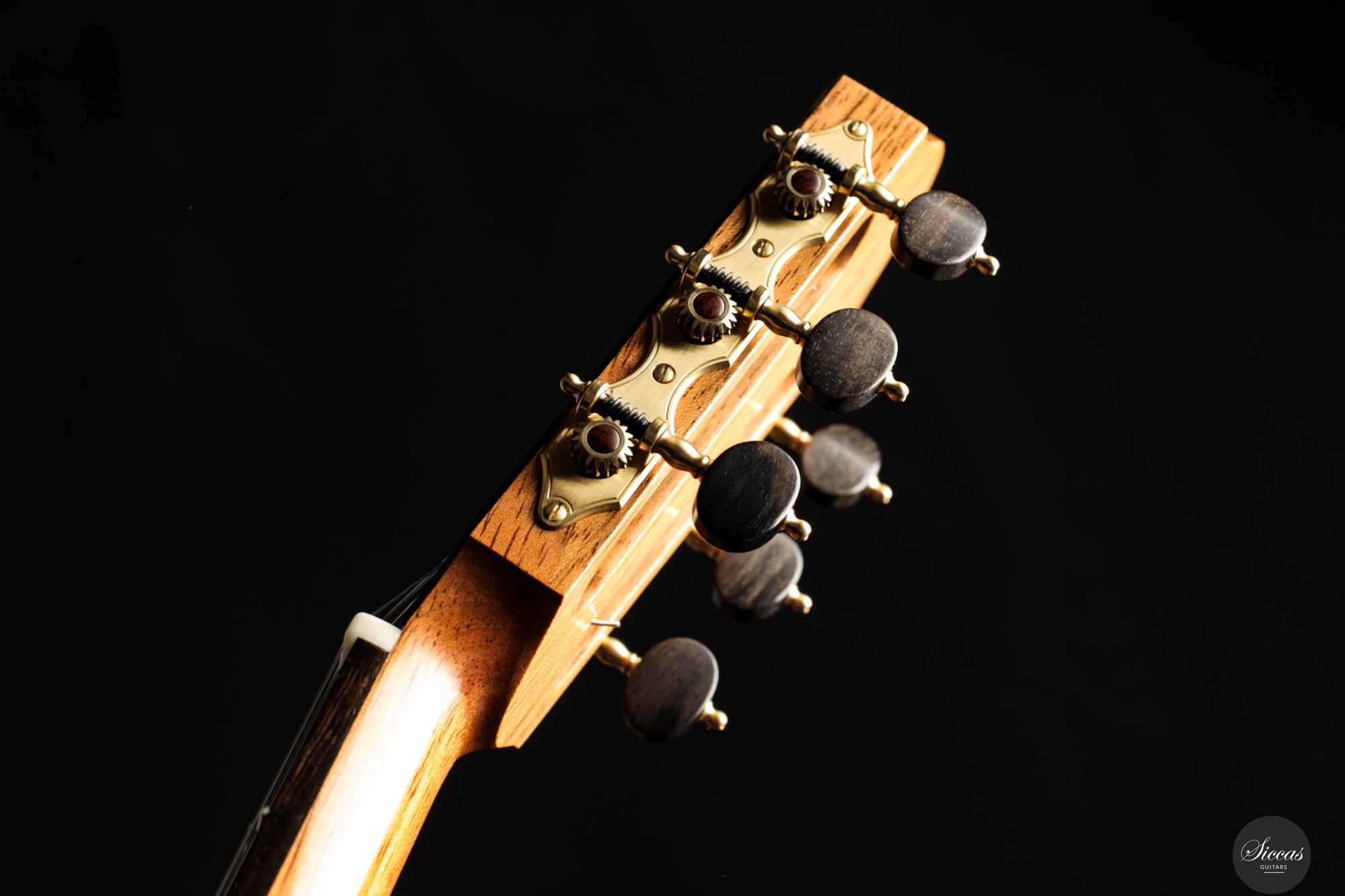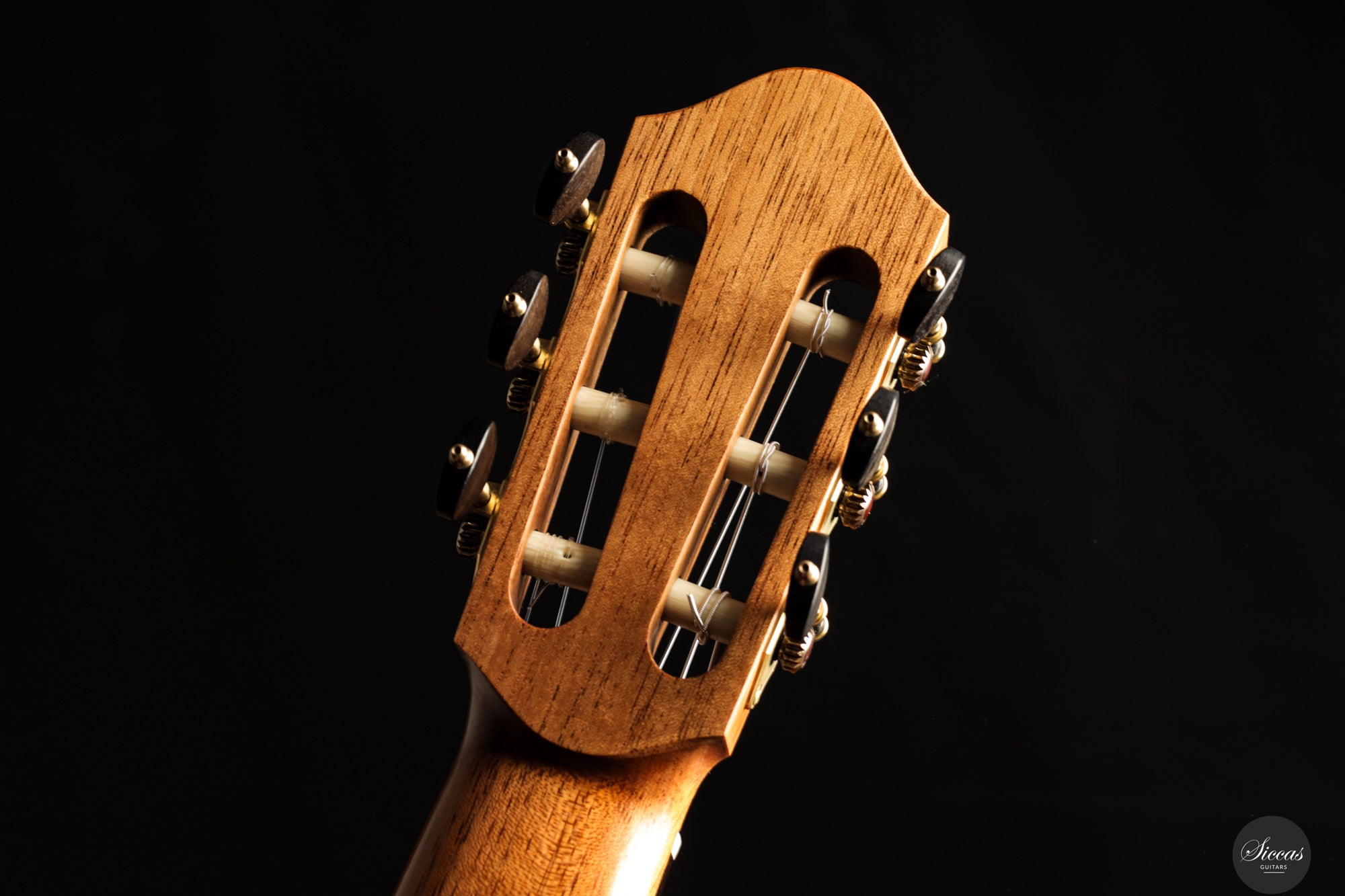 Diese Gitarre aus dem Jahr 2025 mit der Nummer 20 zeigt die gereifte Handschrift von Tamara Stahl. Sie ist in traditioneller Bauweise gefertigt und besitzt eine Zederndecke sowie einen Korpus aus indischem Palisander. Die Schellackpolitur verleiht der Oberfläche Glanz und eine feine Resonanzfähigkeit. Die gedoppelten Zargen und der sorgfältig ausbalancierte Steg unterstützen Tragfähigkeit und Stabilität und vermitteln eine kompakte Struktur die dennoch sehr sensibel reagiert. Kris Barnett Mechaniken sorgen für präzises und geschmeidiges Stimmen.
