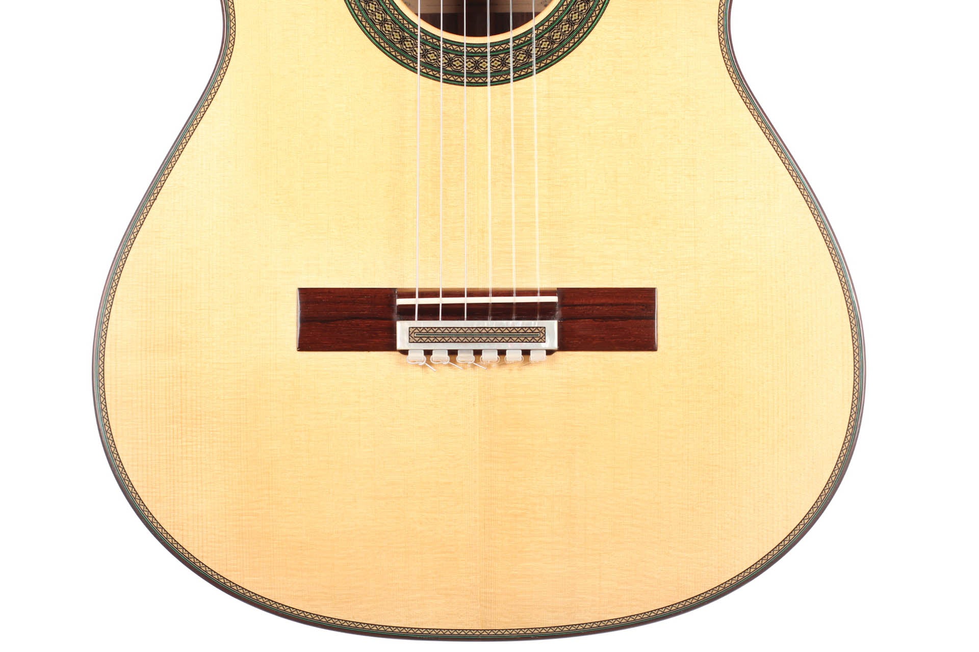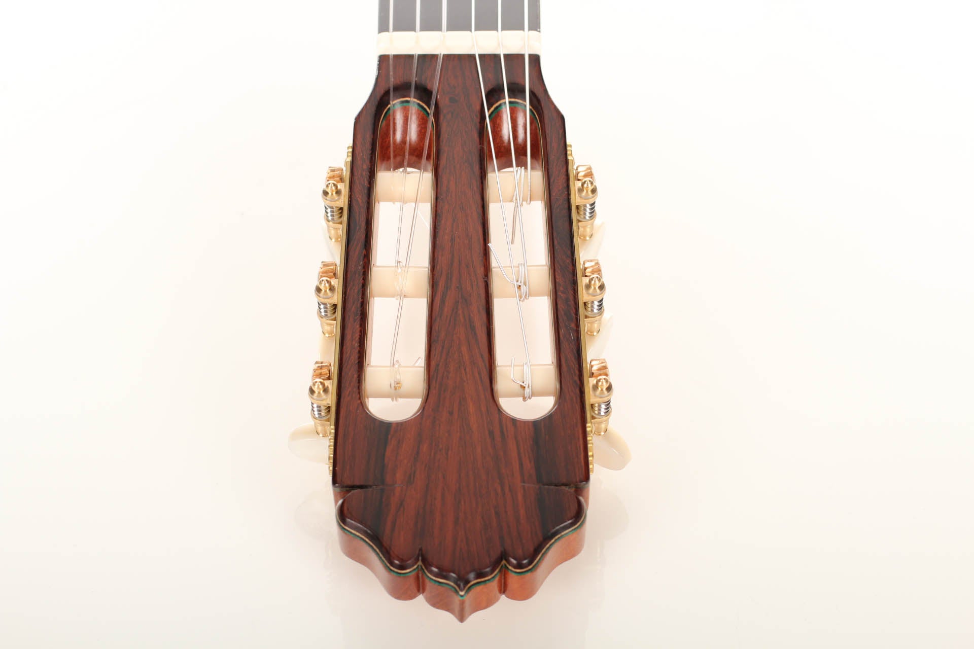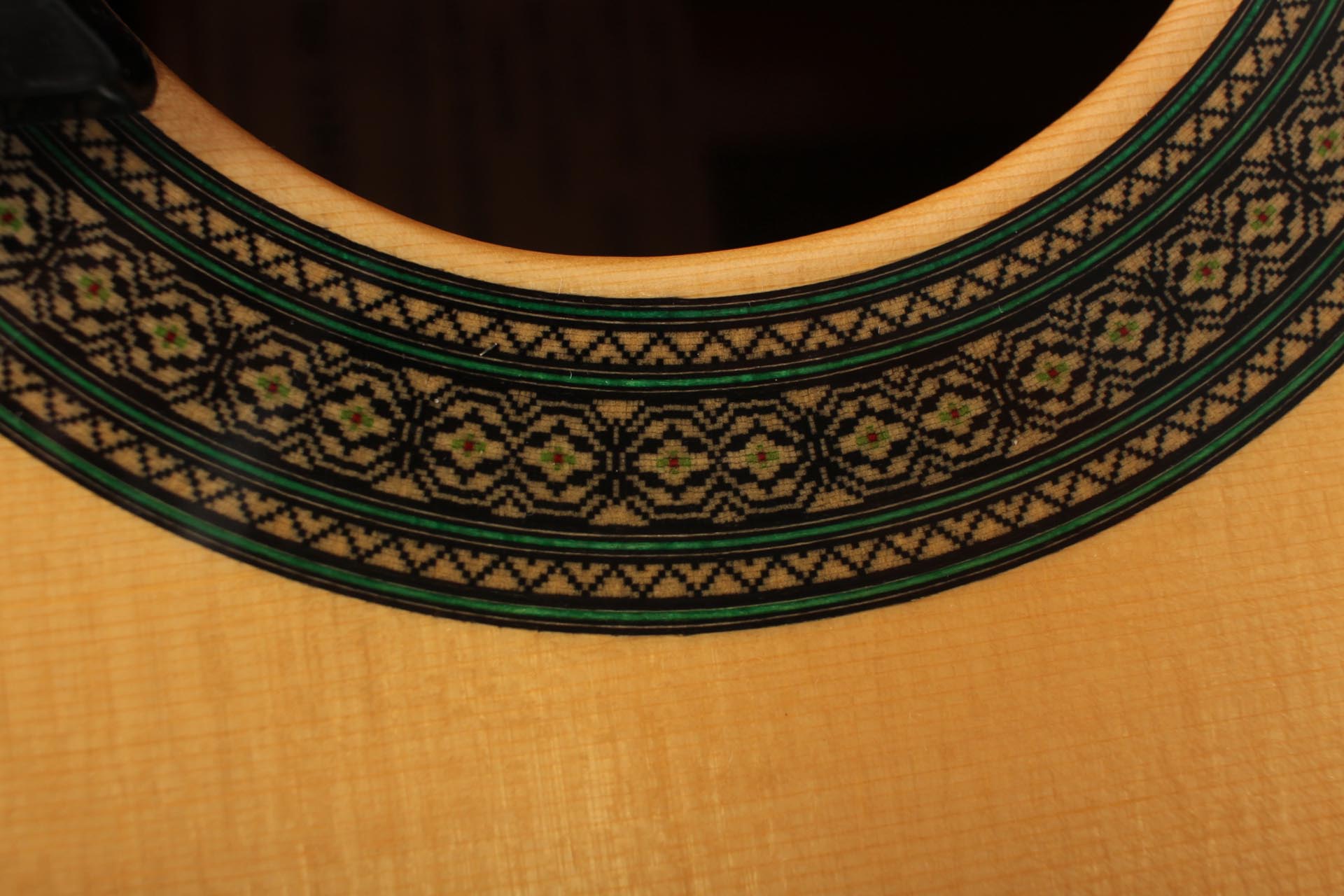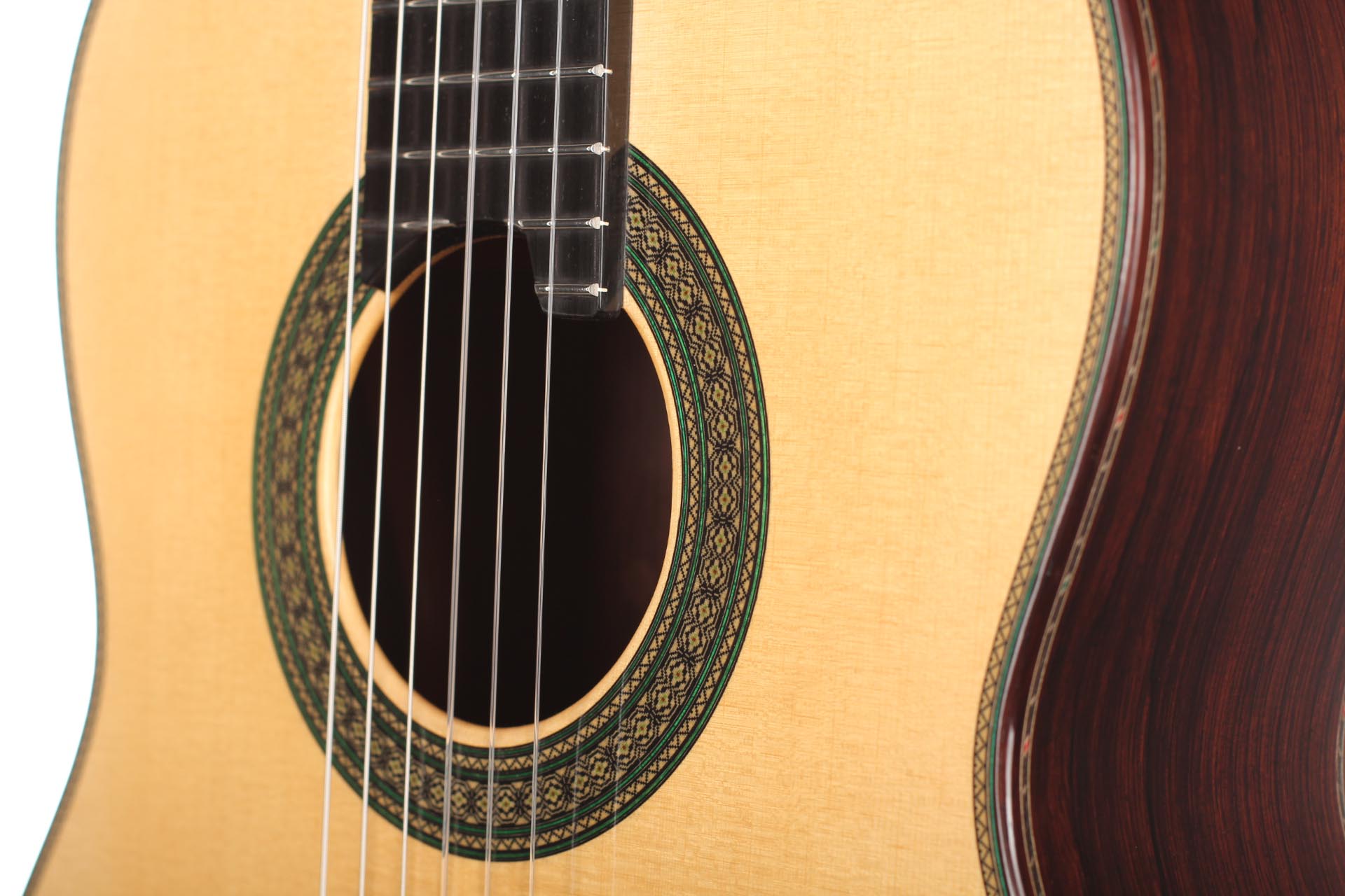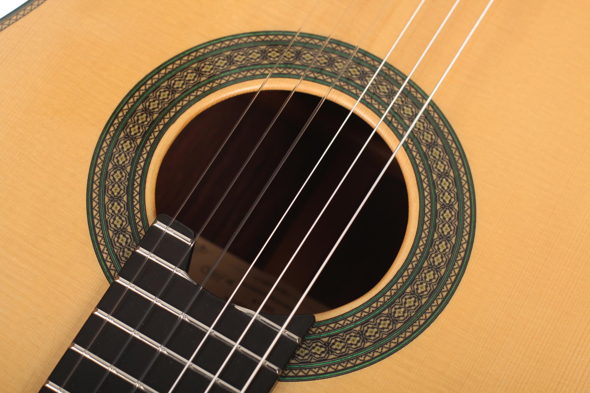 This Maestro Especial model from 2017 is strikingly beautiful with finely worked snake-like green mosaic in rosette, bridge and biding. The light spruce top forms a magnificent contrast to back and sides which are made of gorgeously grained Madagascar Rosewood. The sound is wonderfully balanced, direct and responsive with marvelous singing trebles, unfolding superbly in the room. The tuners are made by Alessi. A hard-shell case is included.