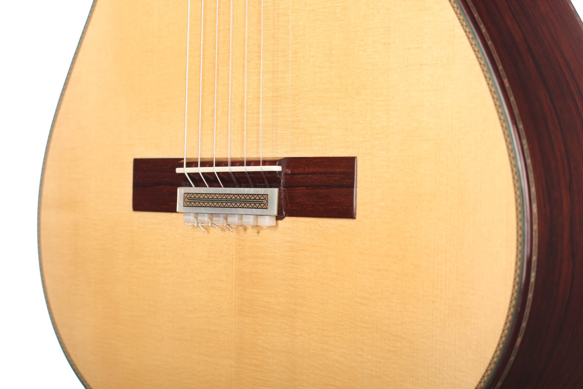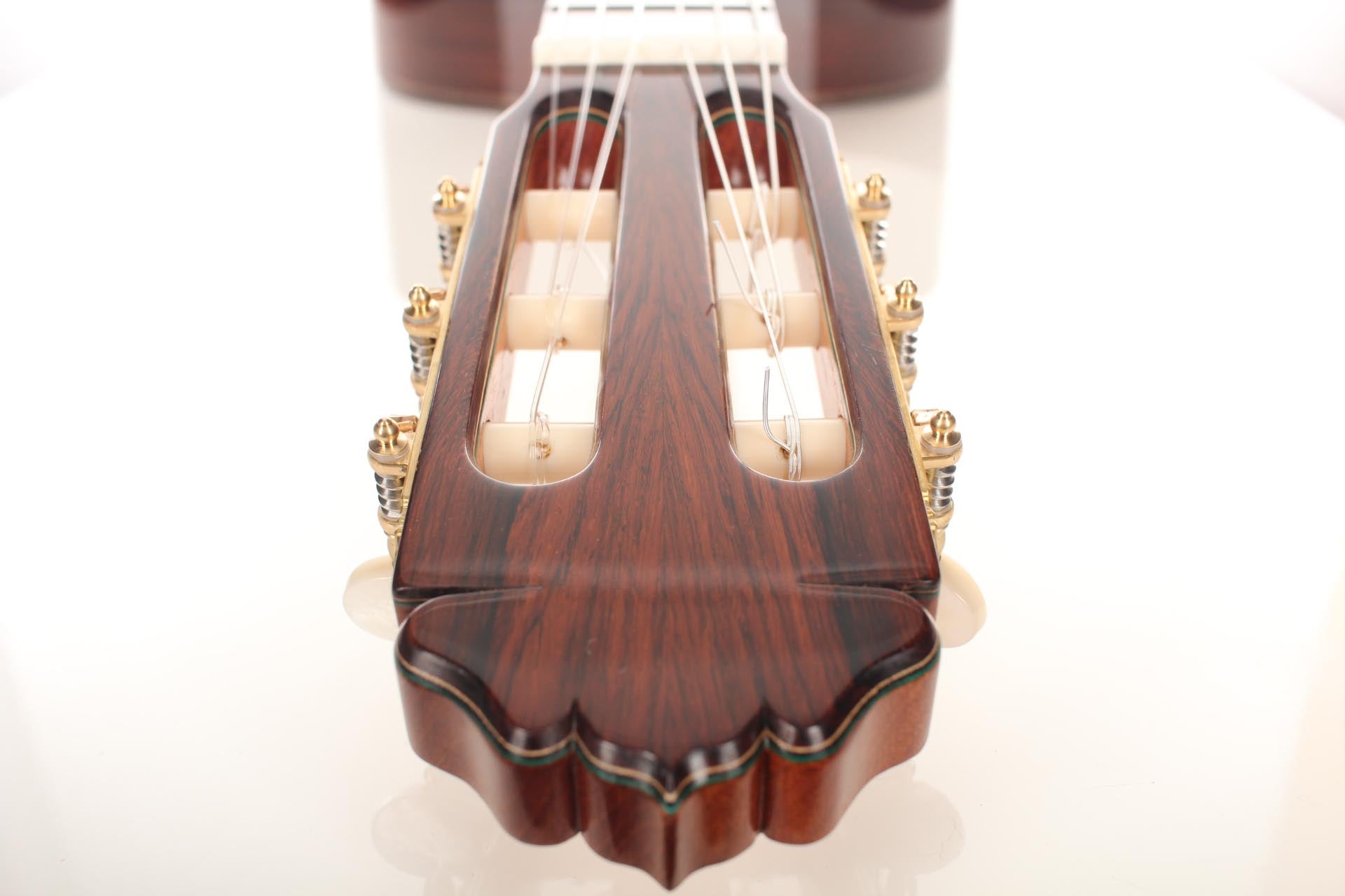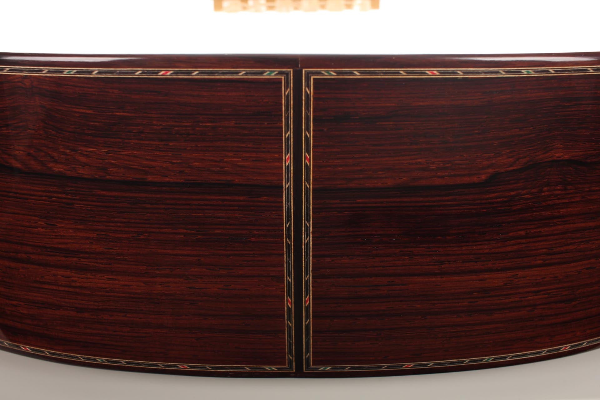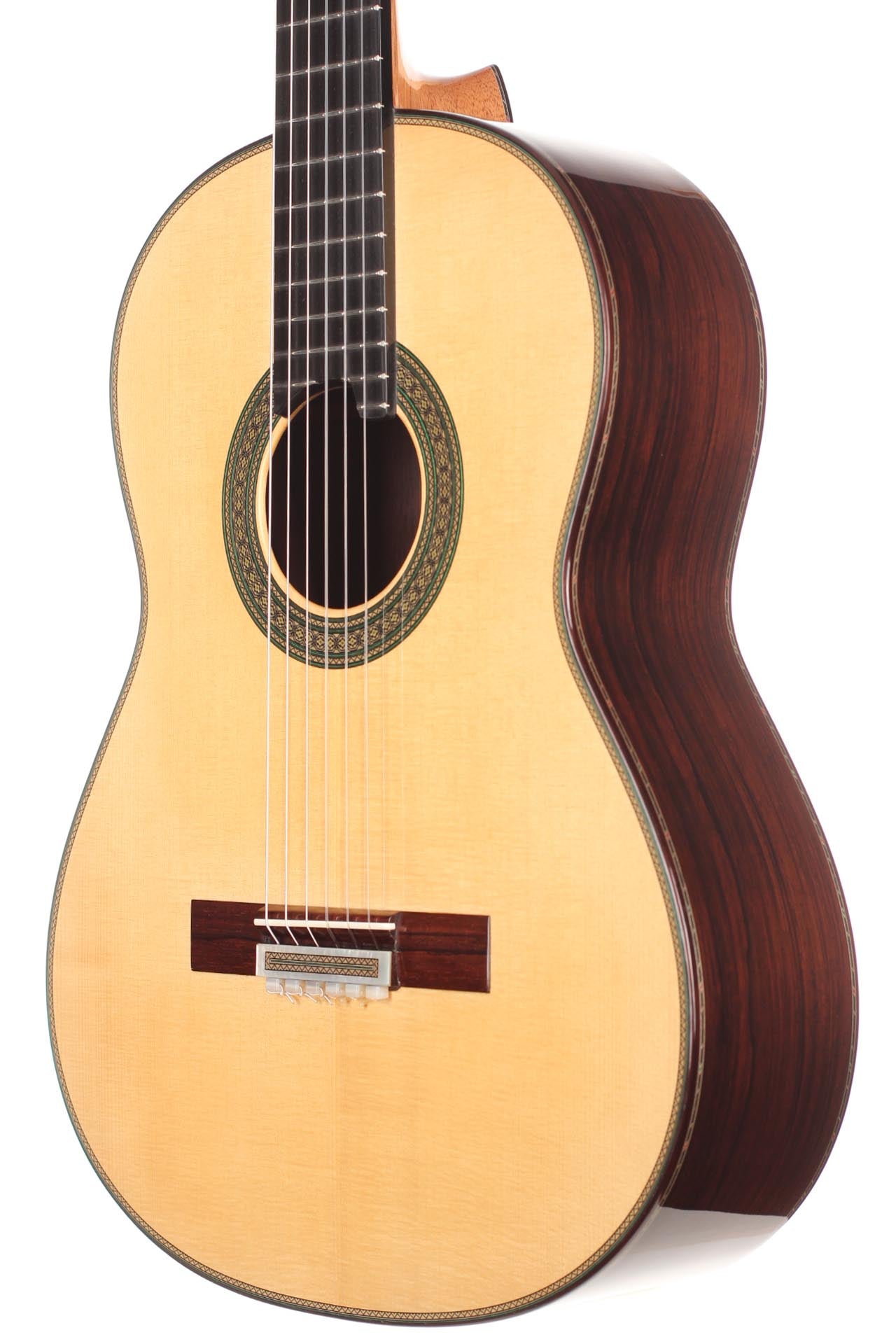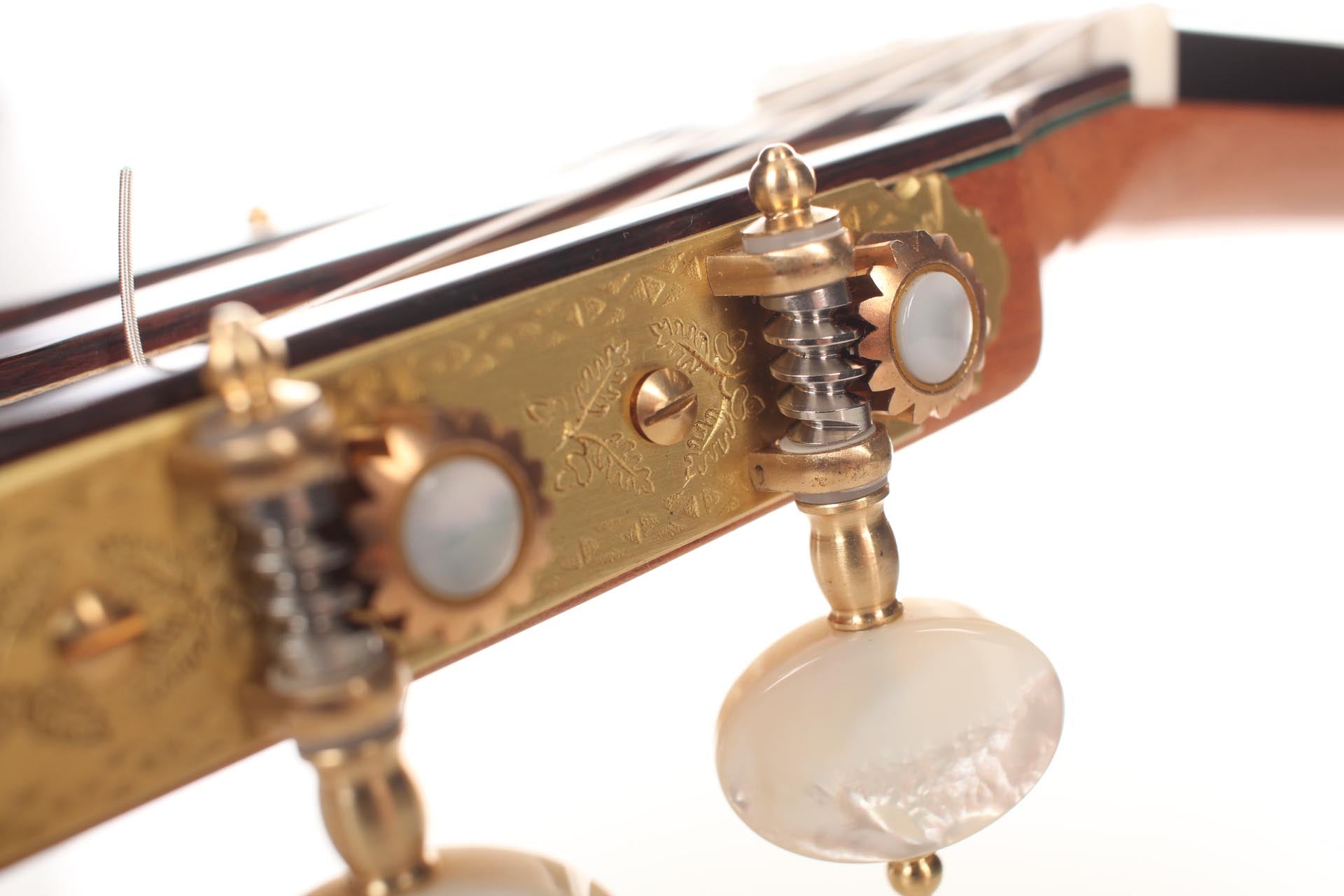 This Maestro Especial model from 2017 is strikingly beautiful with finely worked snake-like green mosaic in rosette, bridge and biding. The light spruce top forms a magnificent contrast to back and sides which are made of gorgeously grained Madagascar Rosewood. The sound is wonderfully balanced, direct and responsive with marvelous singing trebles, unfolding superbly in the room. The tuners are made by Alessi. A hard-shell case is included.
