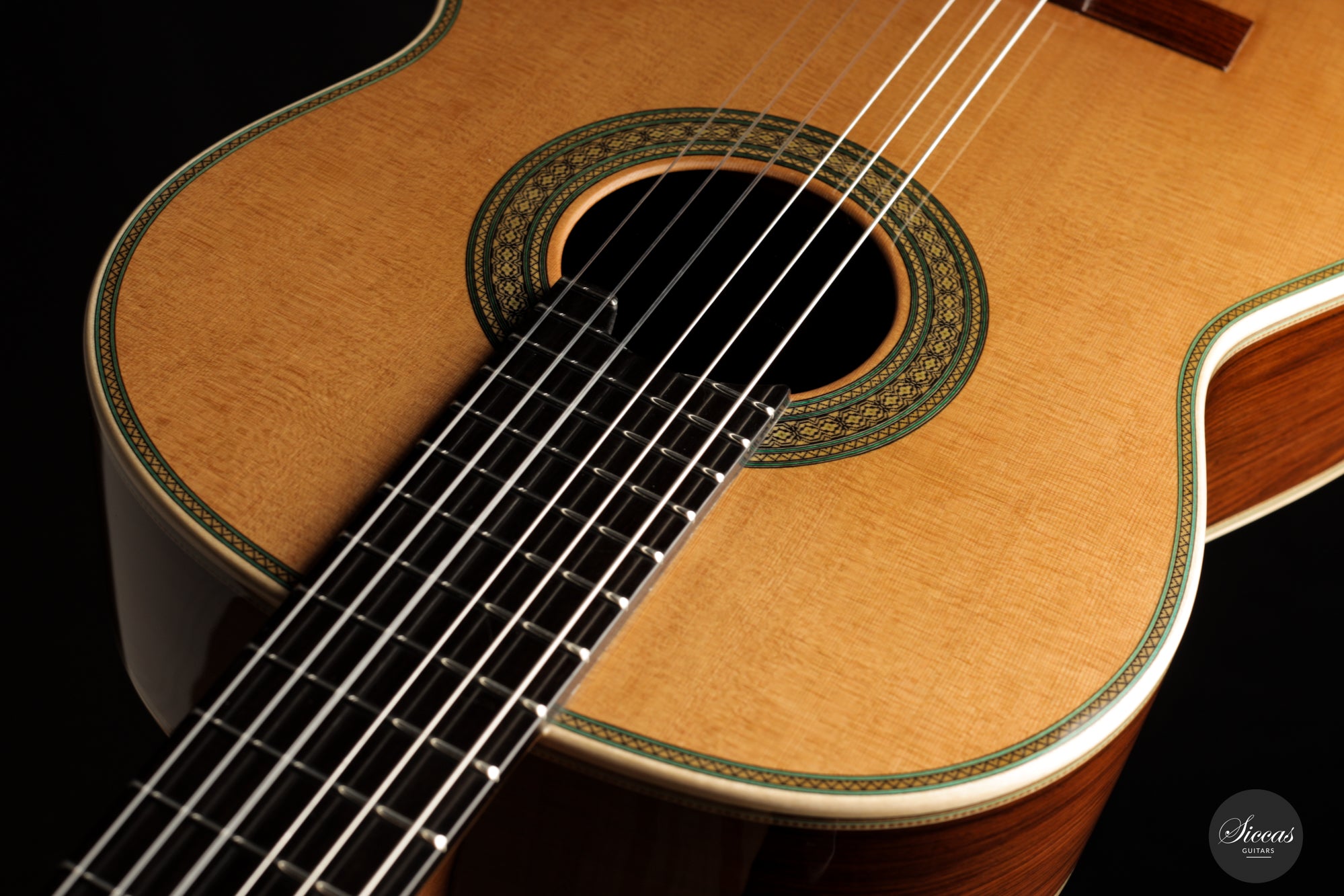 Die akribische Detailverliebtheit im Design zeigt sich in den schlangenartigen grünen Mosaikmustern, die die Rosette, die Brücke und das Binding schmücken und sie zu einem absoluten optischen Genuss für jeden Gitarrenliebhaber machen.