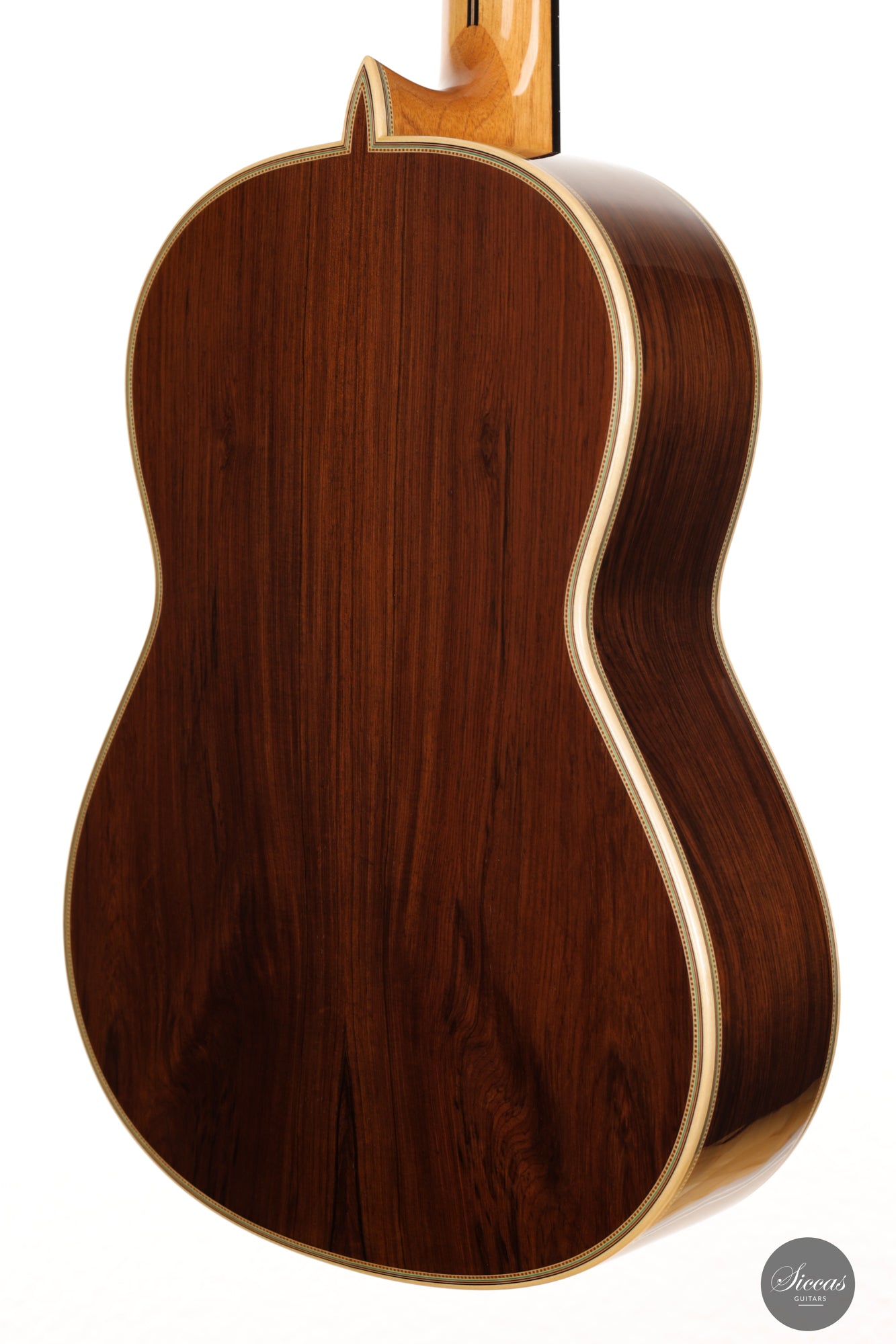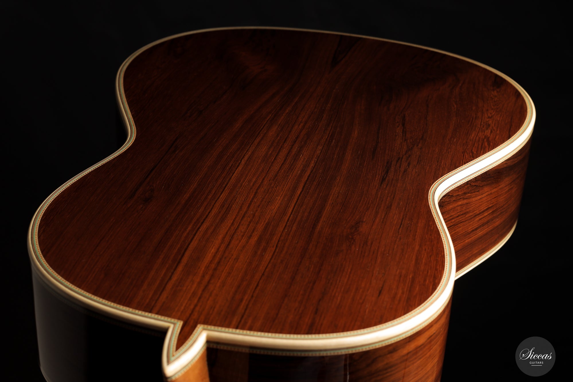 Die dunkle Zederndecke dieser Gitarre verleiht nicht nur eine anspruchsvolle optische Anziehungskraft, sondern spielt auch eine entscheidende Rolle bei der Klangformung. Der Rücken und die Seiten aus Madagaskar-Palisander sind ein Meisterwerk für sich und zeigen ein reichhaltiges Maserungsmuster, das als Zeugnis für die Kunstfertigkeit der Natur steht.