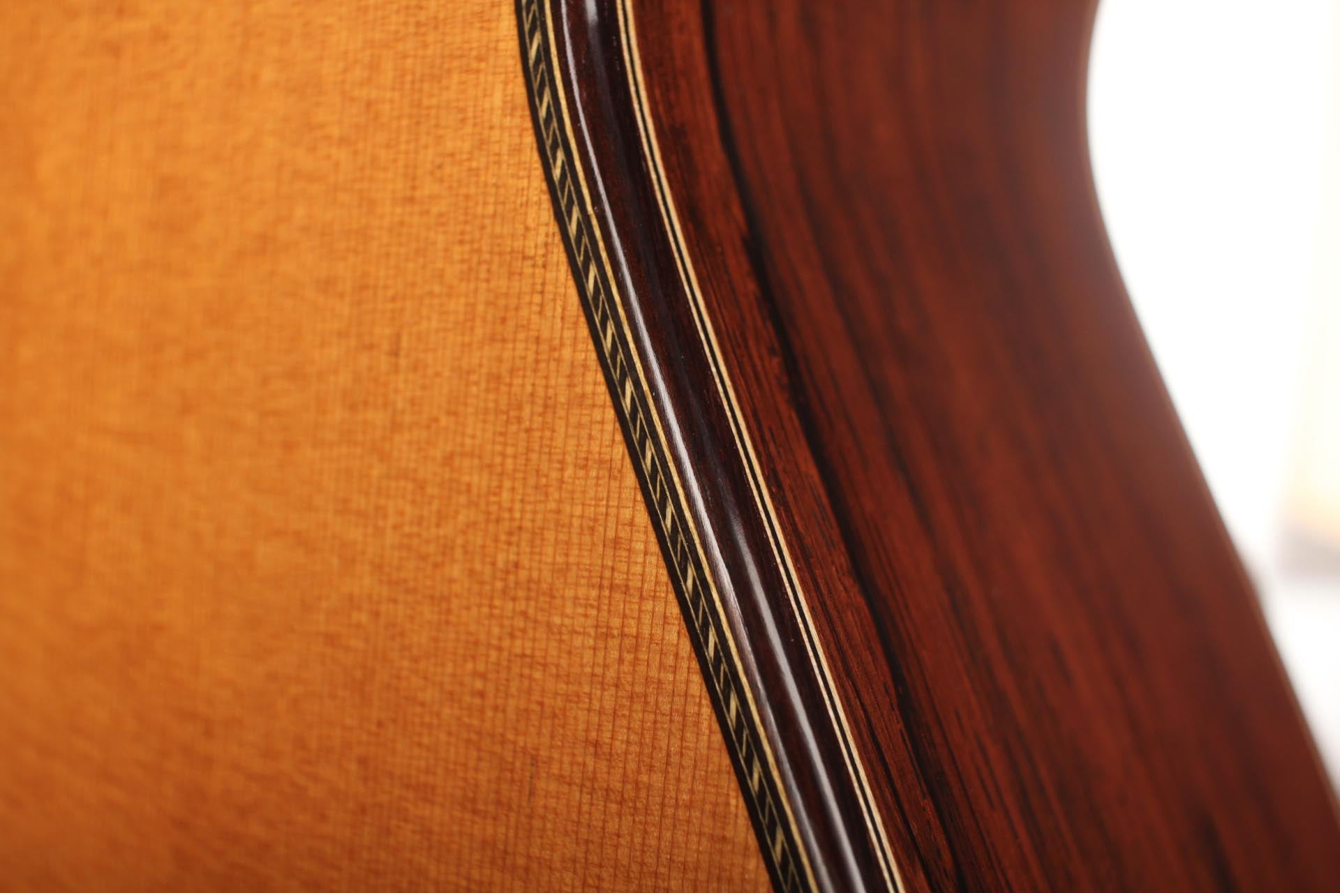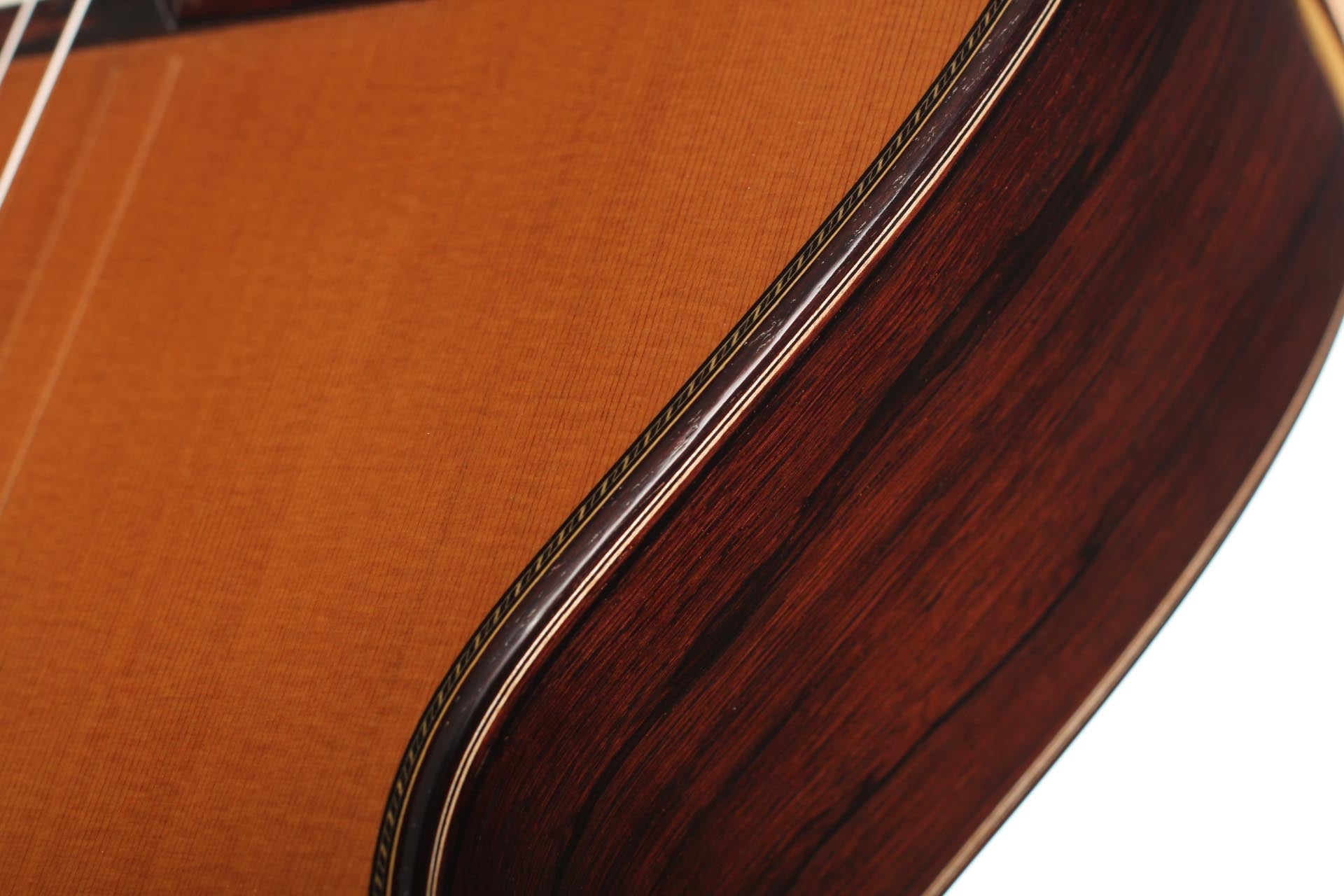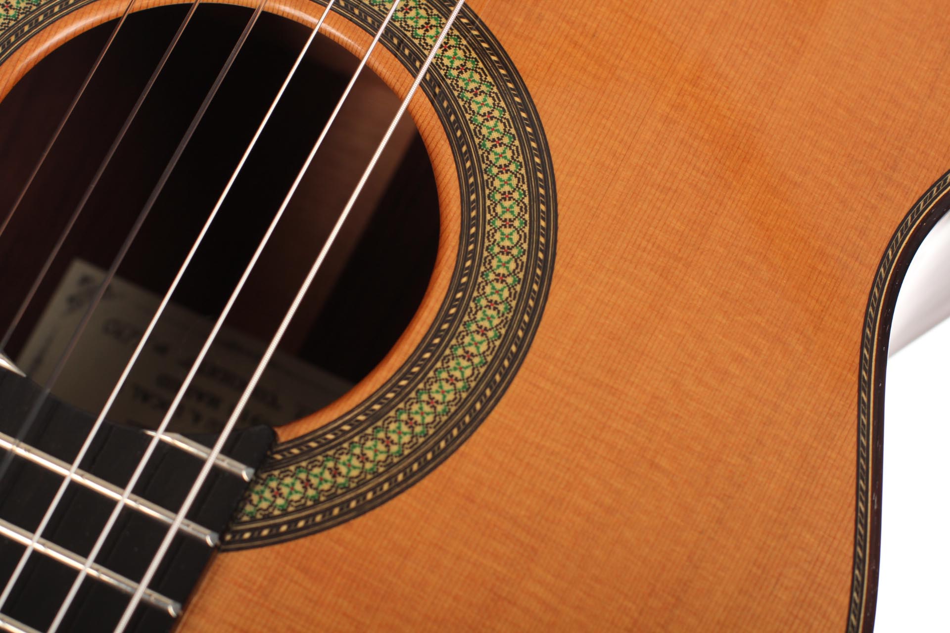 This Concierto model from 2017 is strikingly beautiful with finely worked green mosaic in rosette, bridge and binding. The light cedar top forms a lovely symbiosis with back and sides, which are made of gorgeously grained Madagascar rosewood. The guitar has a differentiated, present and yet mellow sound, which develops marvelously in the room. The tuners are made by Alessi. A hard-shell case is included.