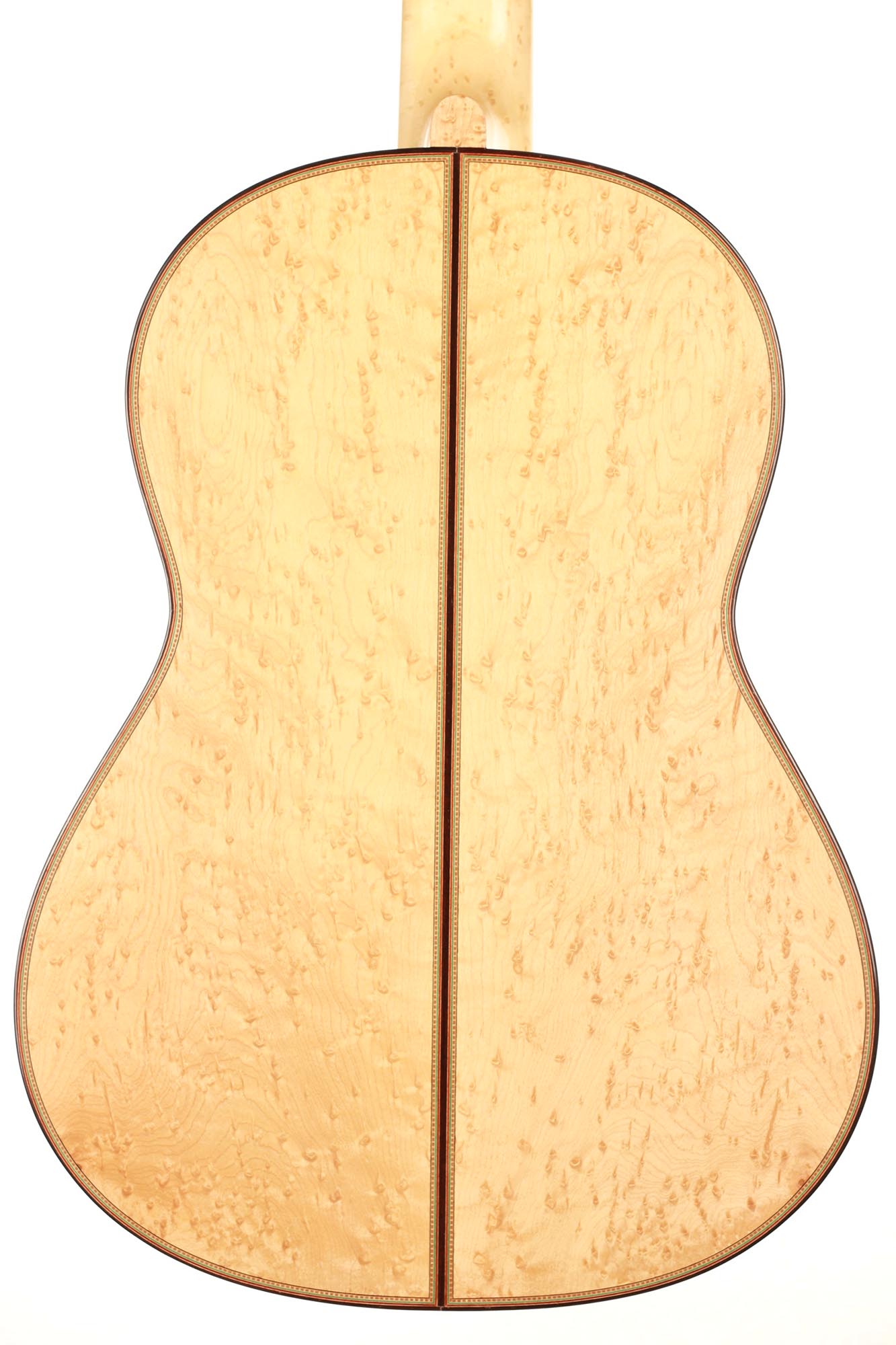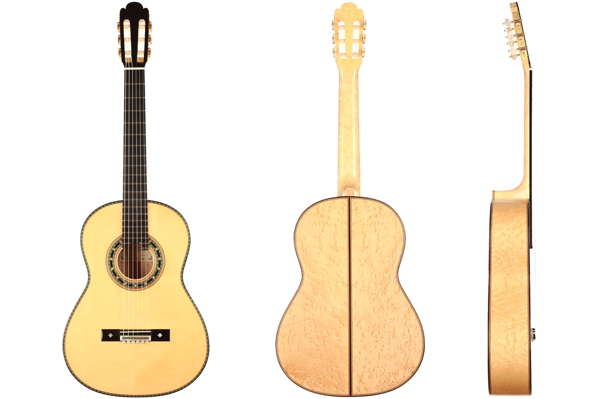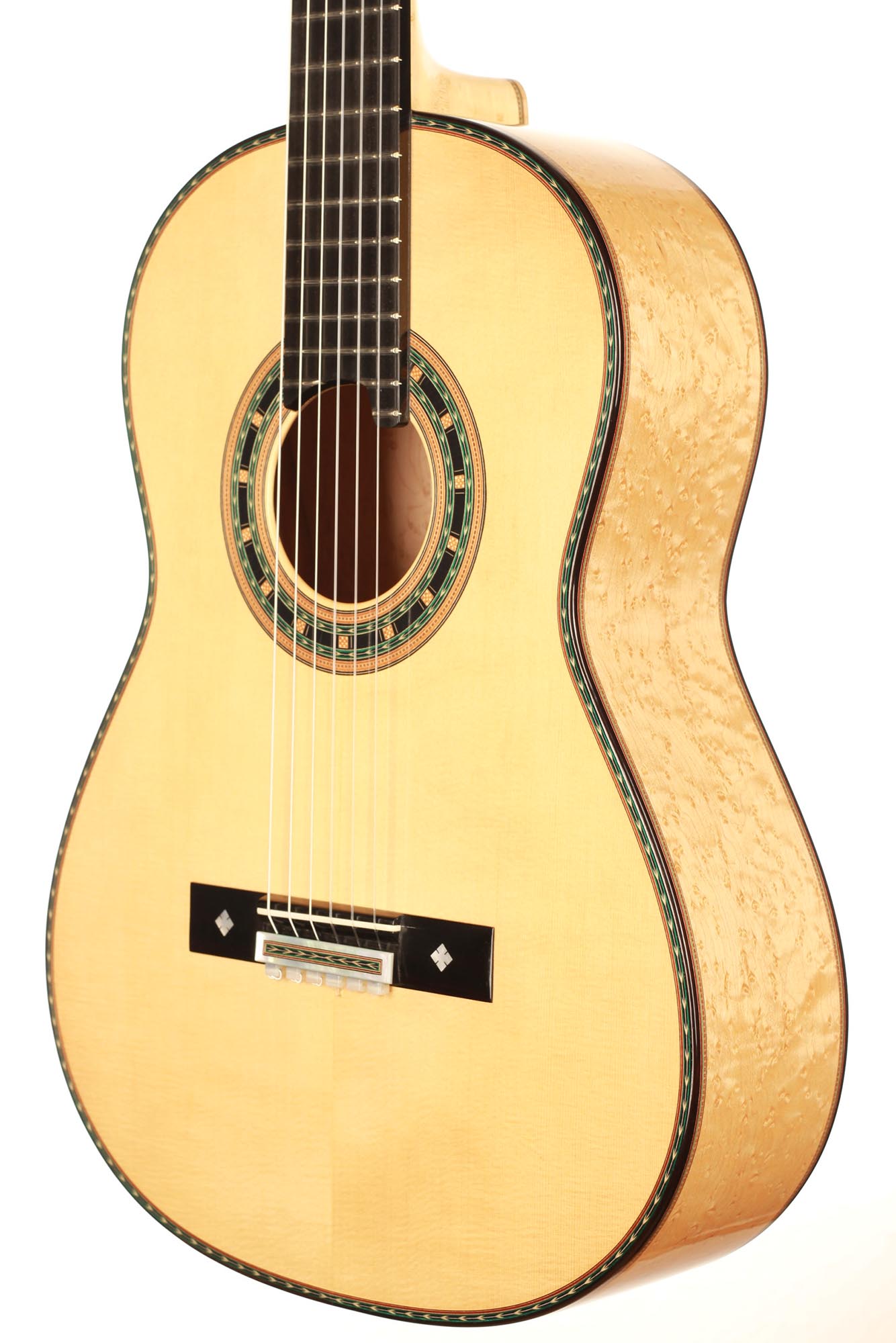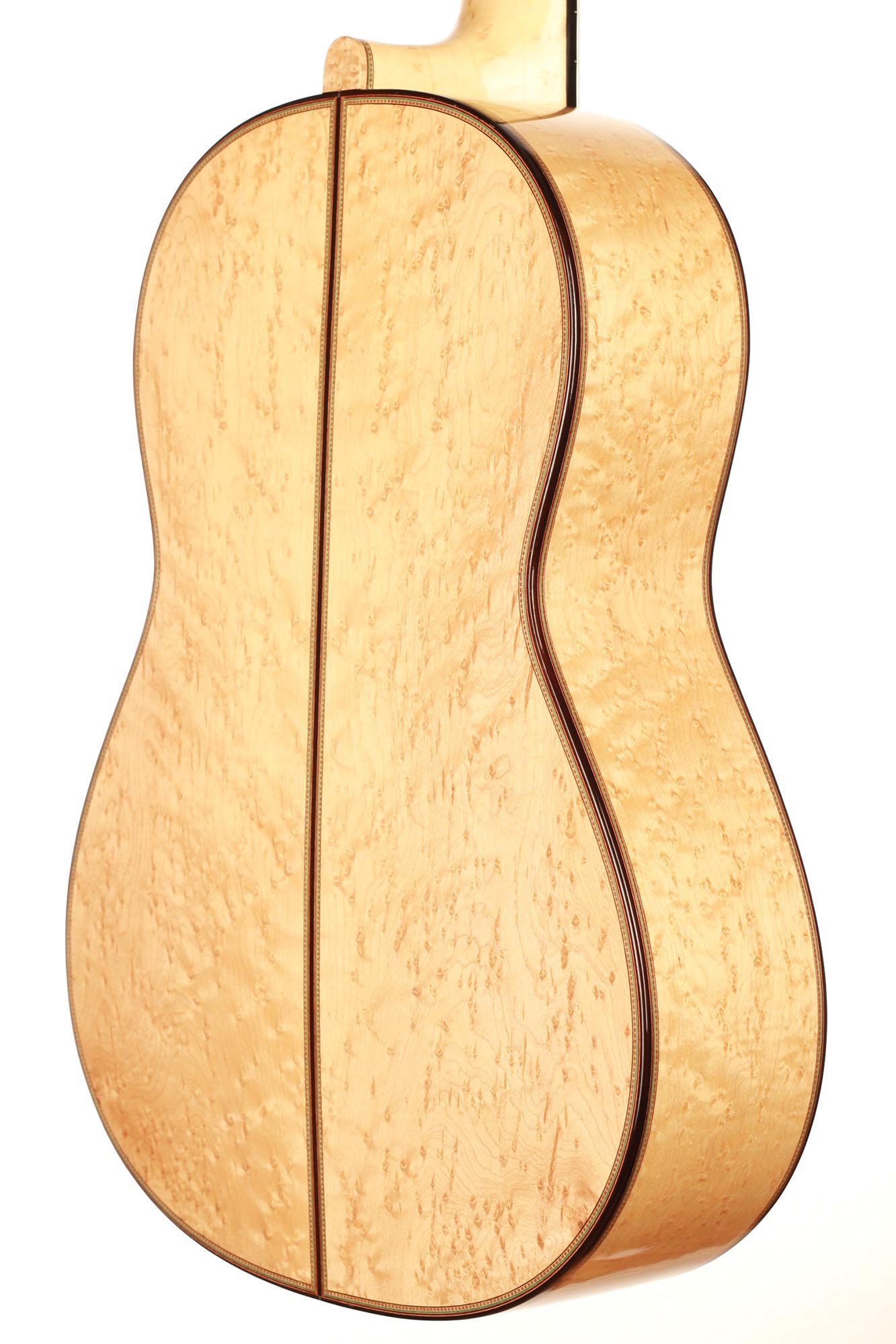 This unique guitar was built as a replica of the famous 1884 Antonio de Torres guitar named “La Emperatriz”. It has beautifully figured bird’s eye maple back and sides. The neck is also built of this fantastic wood, which is a very rare feature. Top-quality Rodgers tuners are holding a perfect pitch. This guitar has a smooth old-world sound with marvellous trebles and very deep basses. The playability is perfect, and this instrument takes both listener and player back in time.
