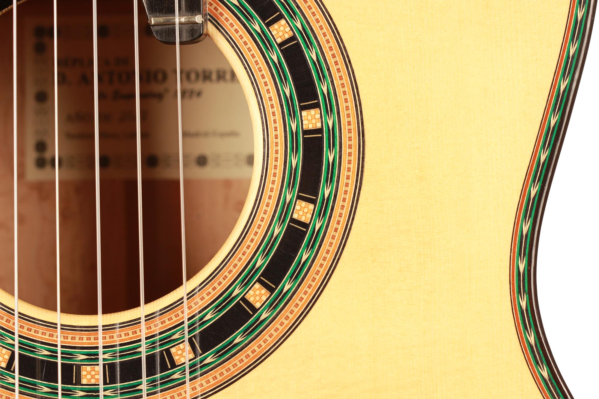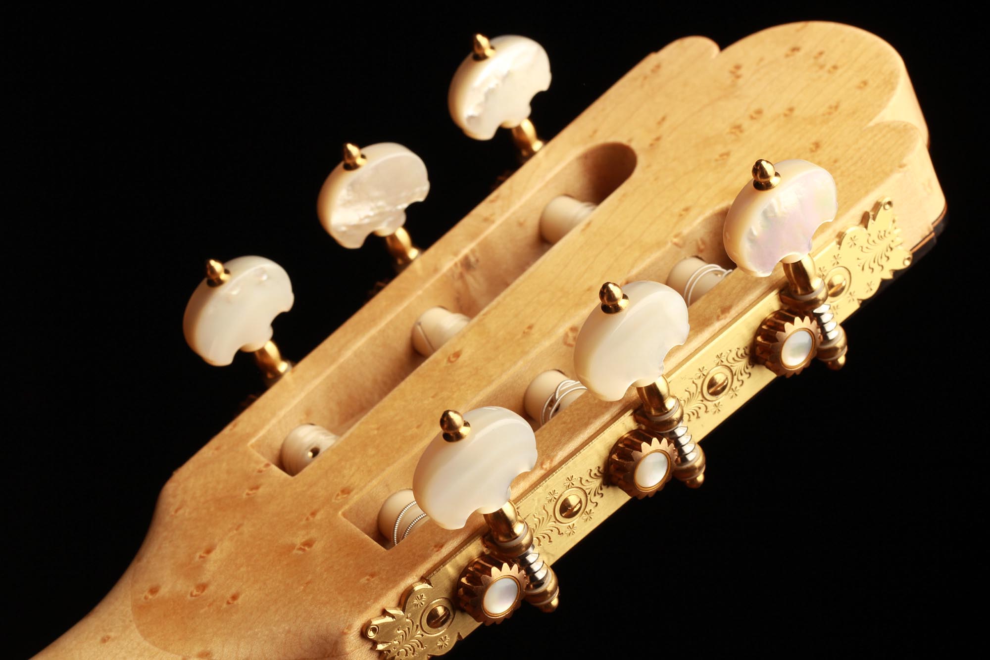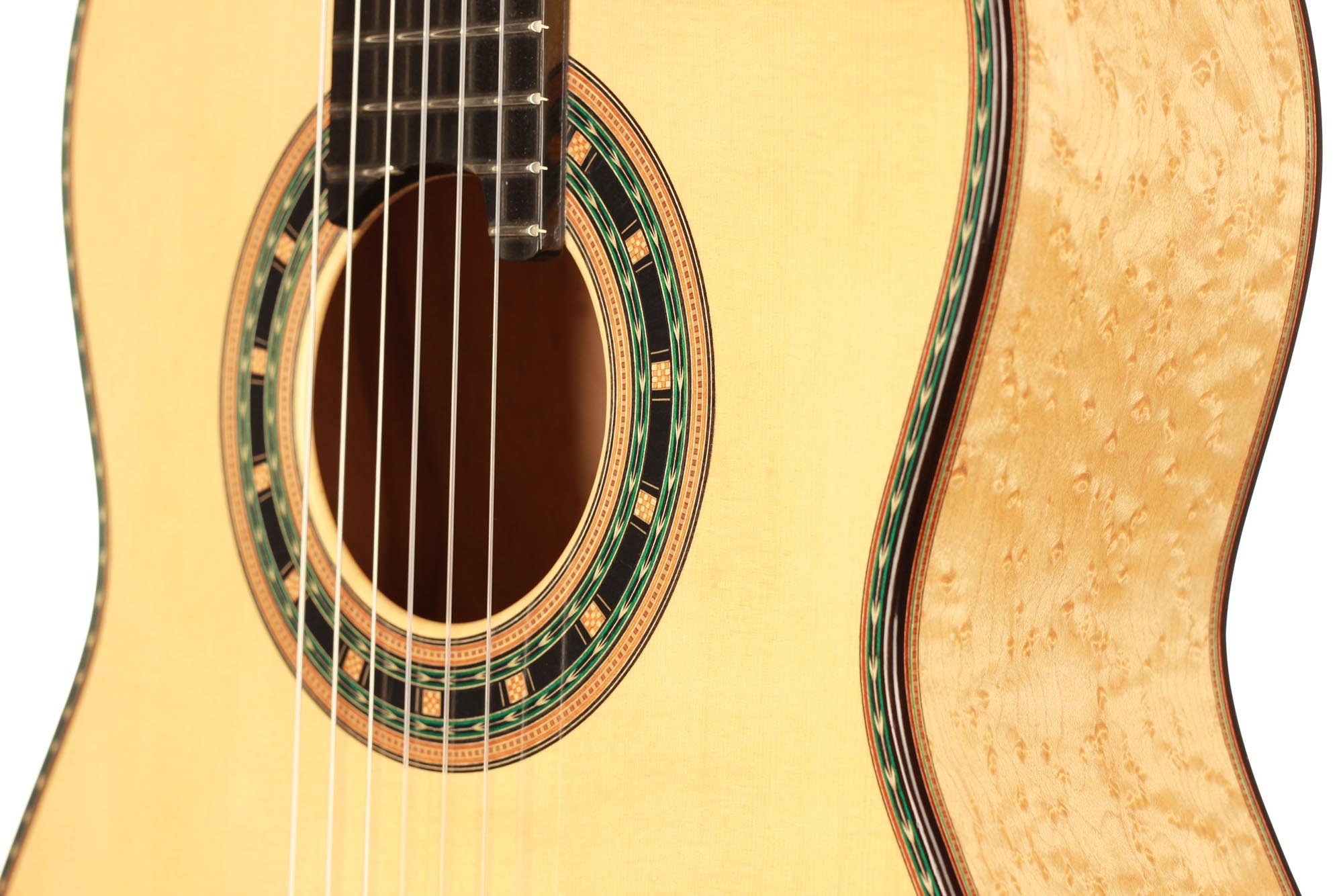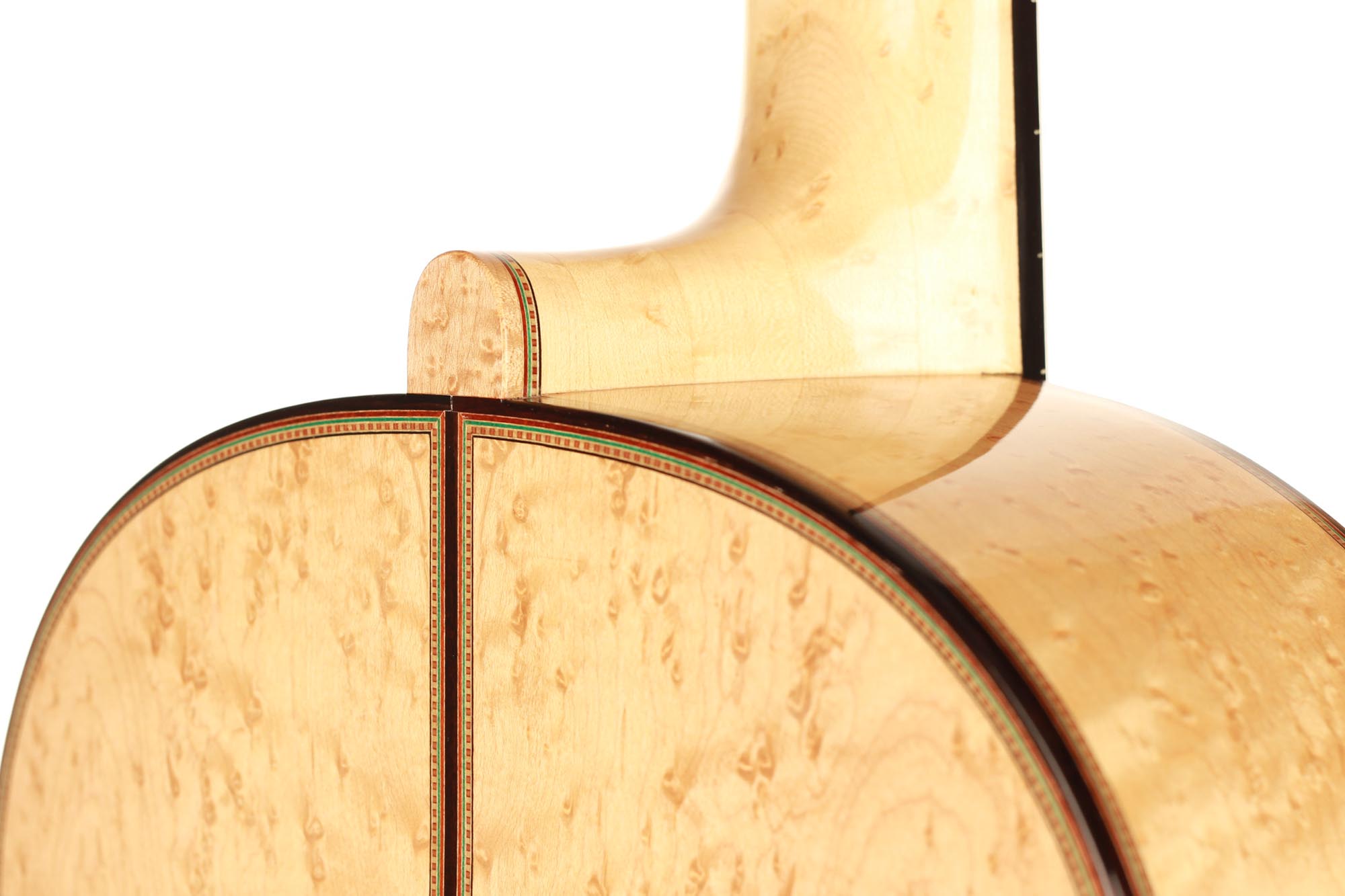 This unique guitar was built as a replica of the famous 1884 Antonio de Torres guitar named “La Emperatriz”. It has beautifully figured bird’s eye maple back and sides. The neck is also built of this fantastic wood, which is a very rare feature. Top-quality Rodgers tuners are holding a perfect pitch. This guitar has a smooth old-world sound with marvellous trebles and very deep basses. The playability is perfect, and this instrument takes both listener and player back in time.