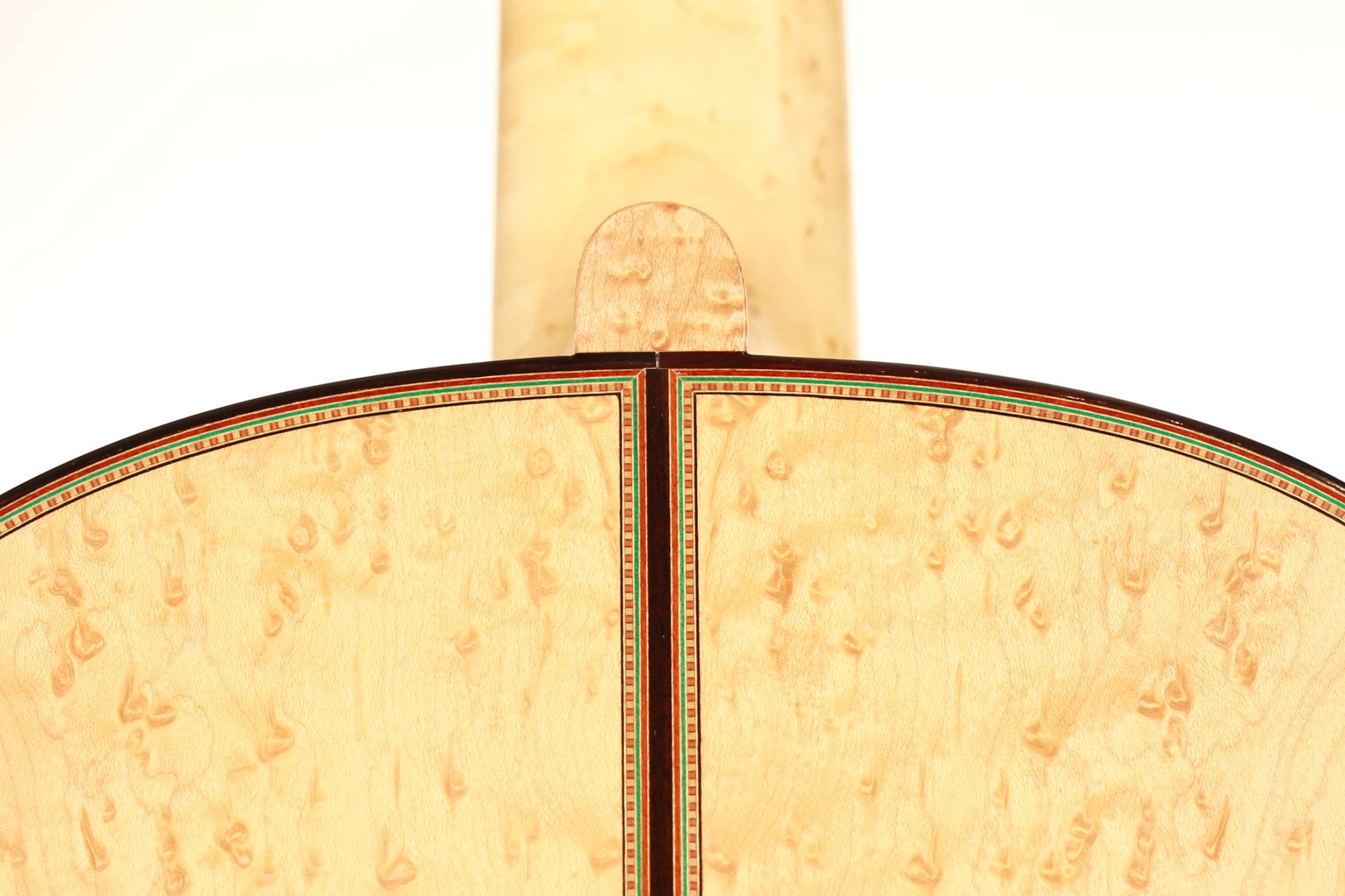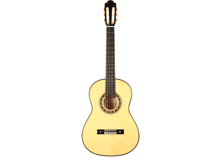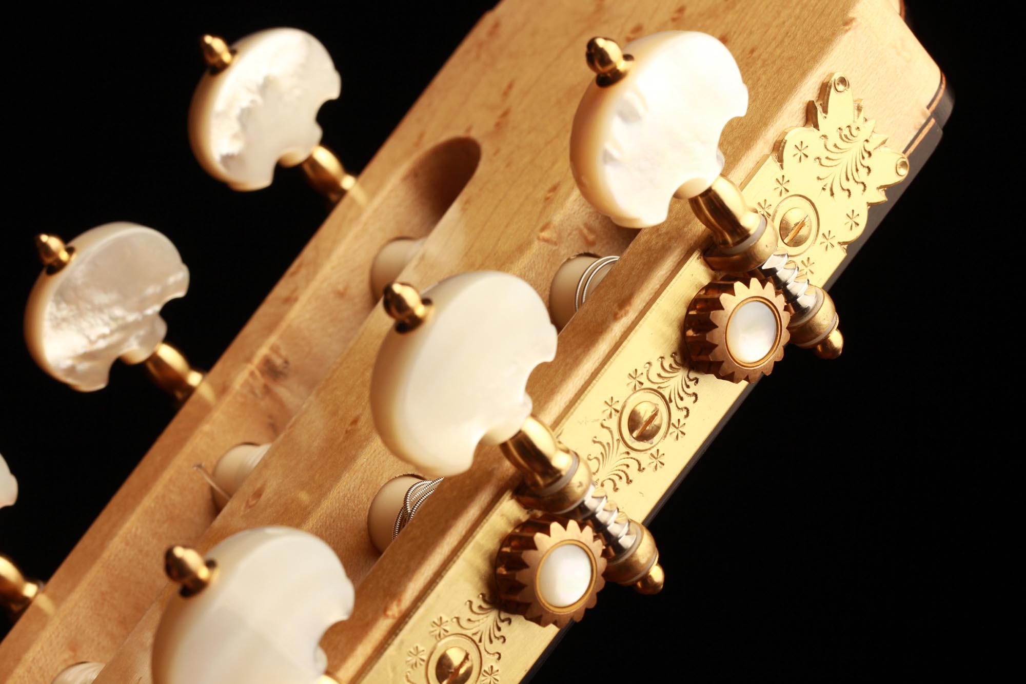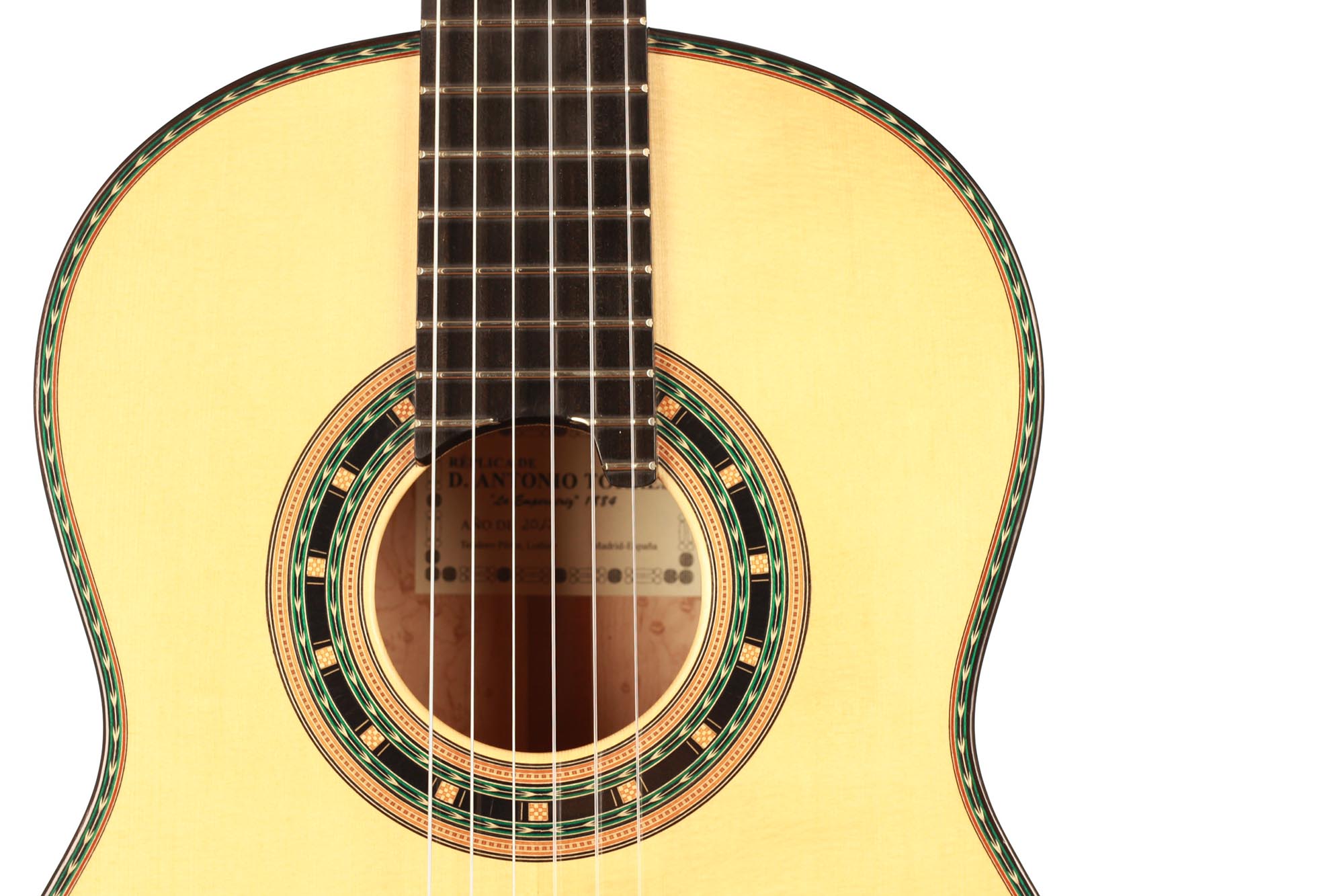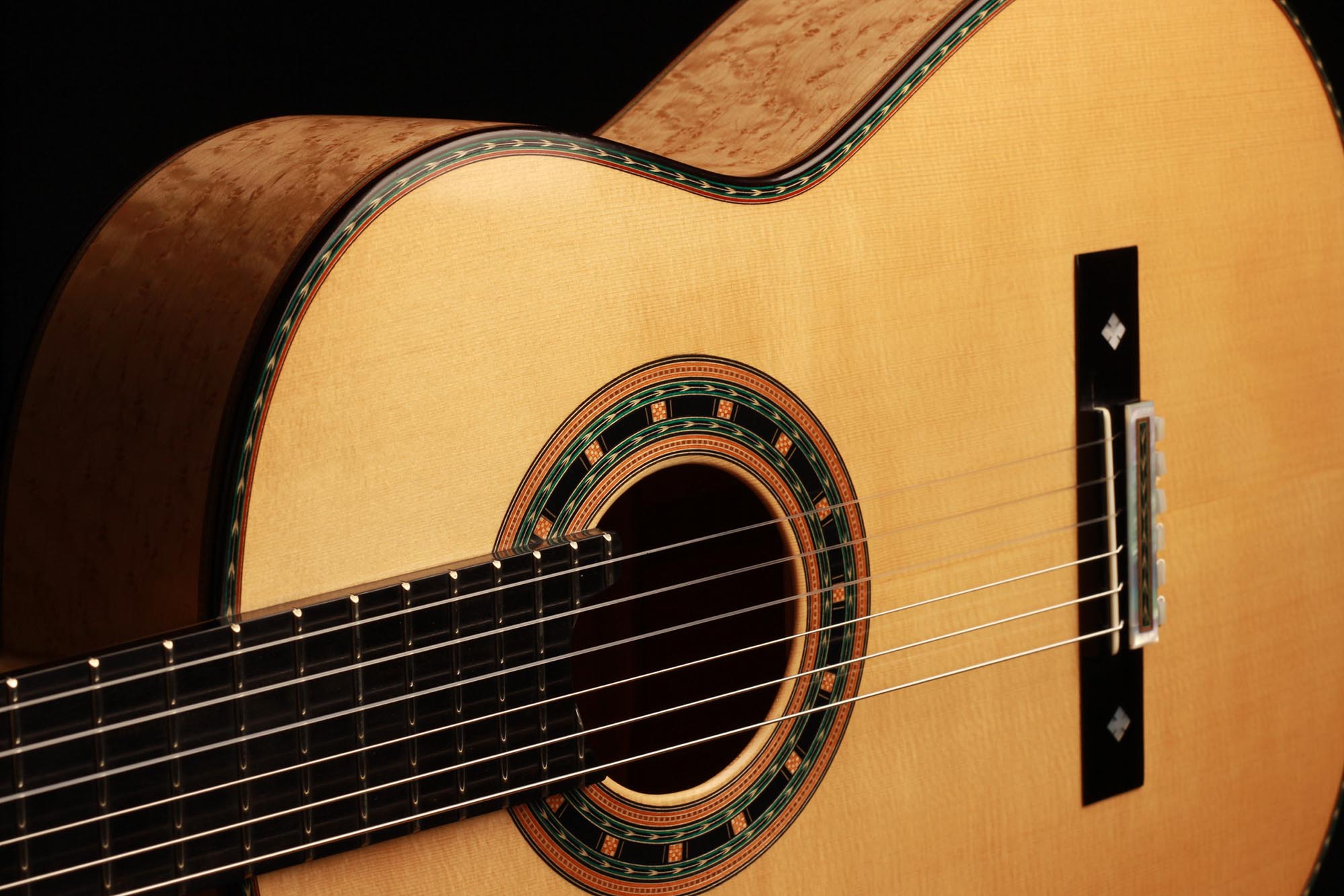 This unique guitar was built as a replica of the famous 1884 Antonio de Torres guitar named “La Emperatriz”. It has beautifully figured bird’s eye maple back and sides. The neck is also built of this fantastic wood, which is a very rare feature. Top-quality Rodgers tuners are holding a perfect pitch. This guitar has a smooth old-world sound with marvellous trebles and very deep basses. The playability is perfect, and this instrument takes both listener and player back in time.