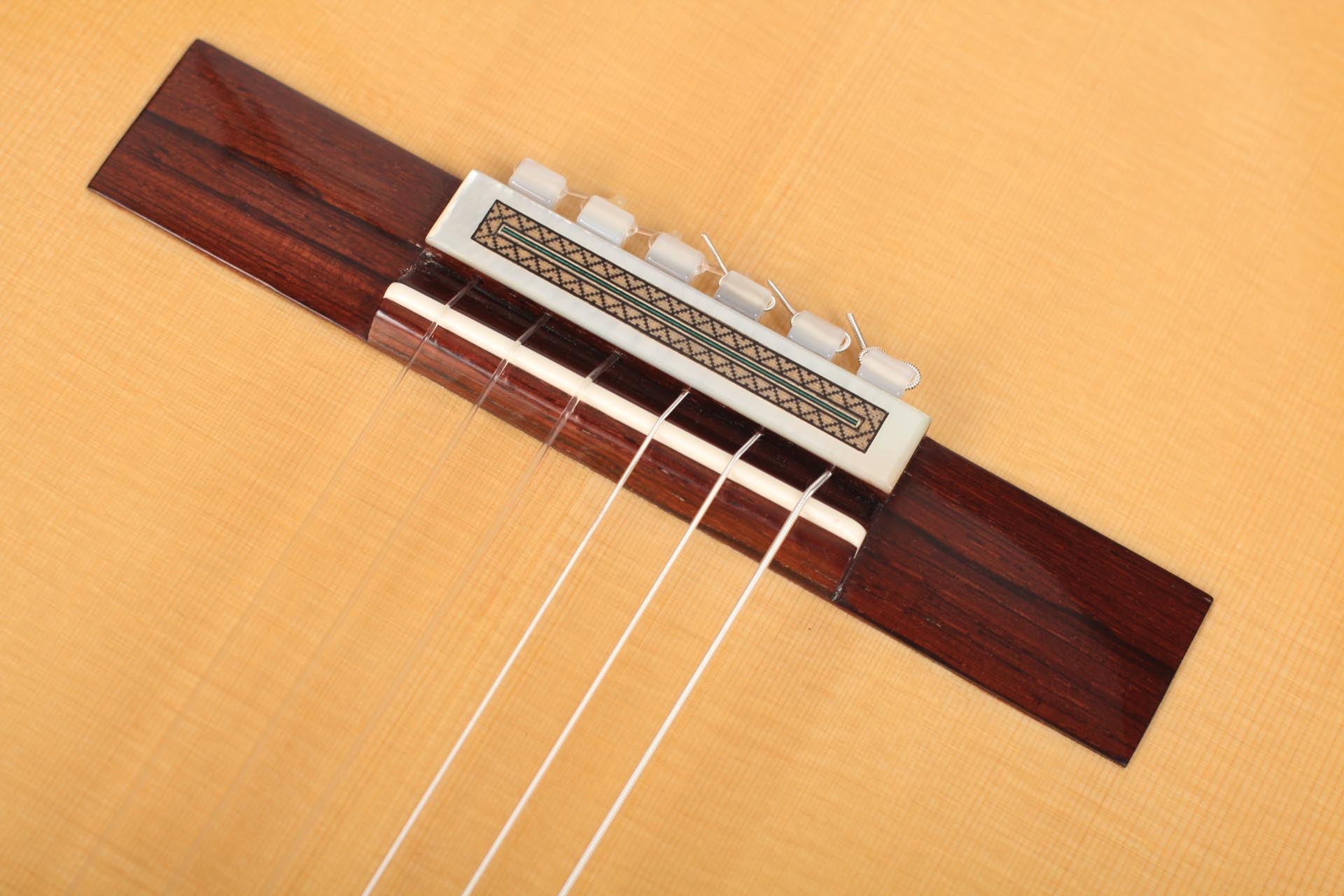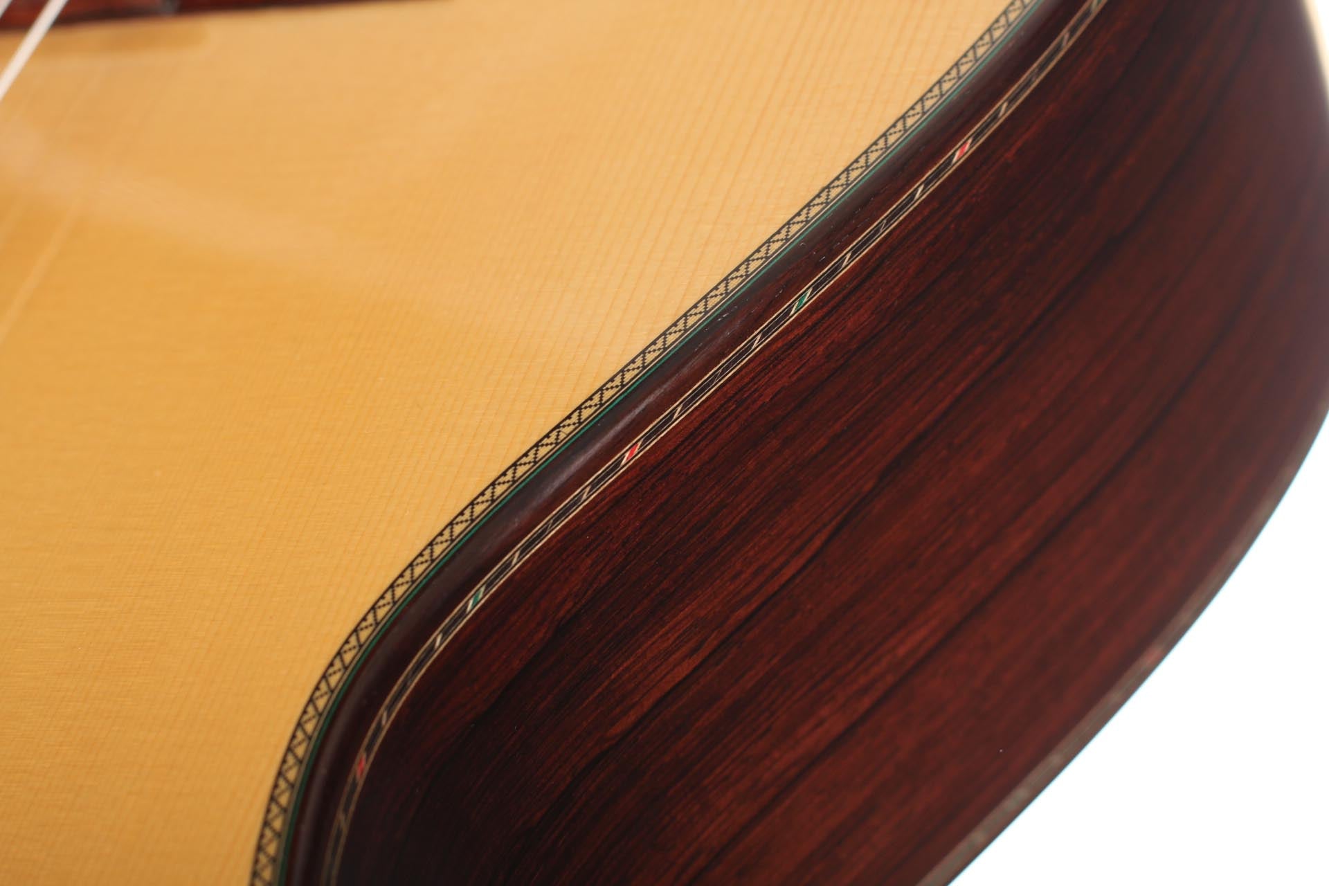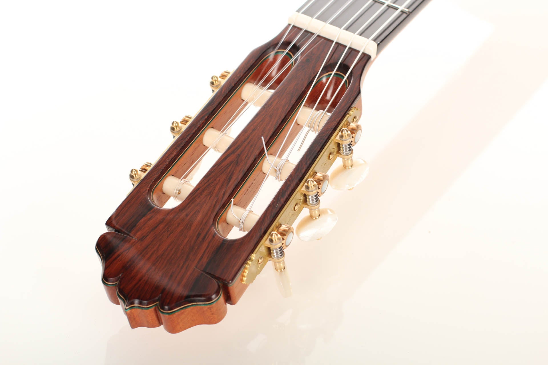 Dieses Maestro Especial Modell von 2017 ist auffällig schön mit fein gearbeitetem schlangenartigen grünen Mosaik in Rosette, Steg und Binding. Die helle Fichtendecke bildet einen großartigen Kontrast zu Boden und Zargen, die aus prächtig gemasertem Madagaskar-Palisander gebaut sind. Die Gitarre ist wunderbar eingeschwungen, der Klang direkt und ausgeglichen mit wunderschönen singenden Höhen, die sich herrlich im Raum entfalten. Die Mechaniken sind von Alessi. Ein Hartschalen-Koffer ist inklusive.