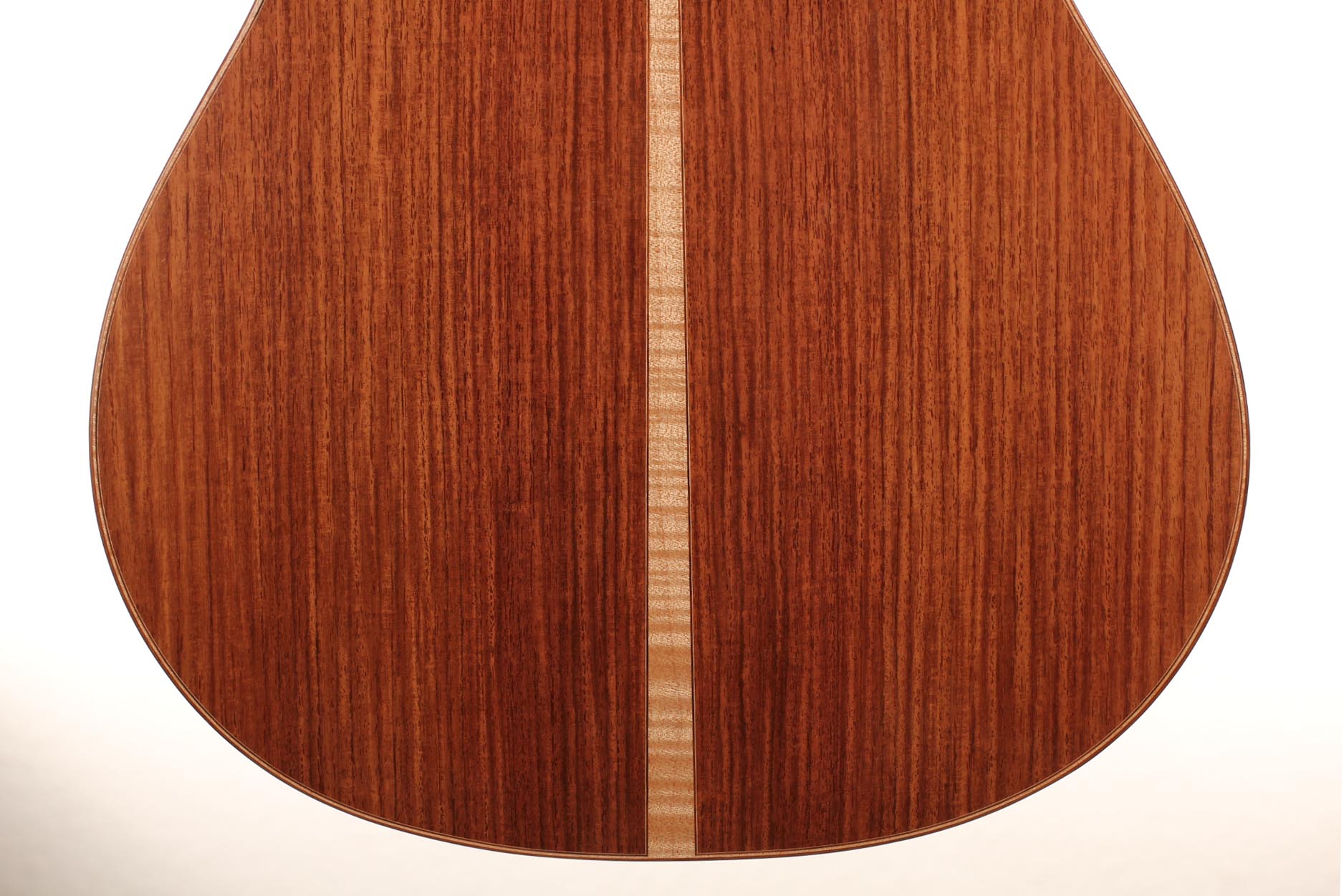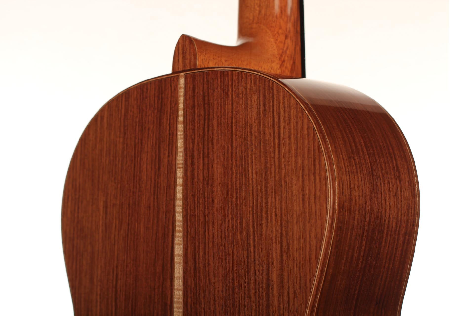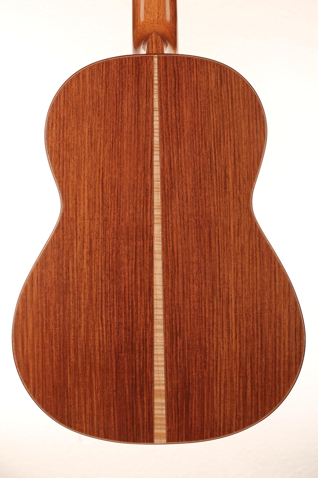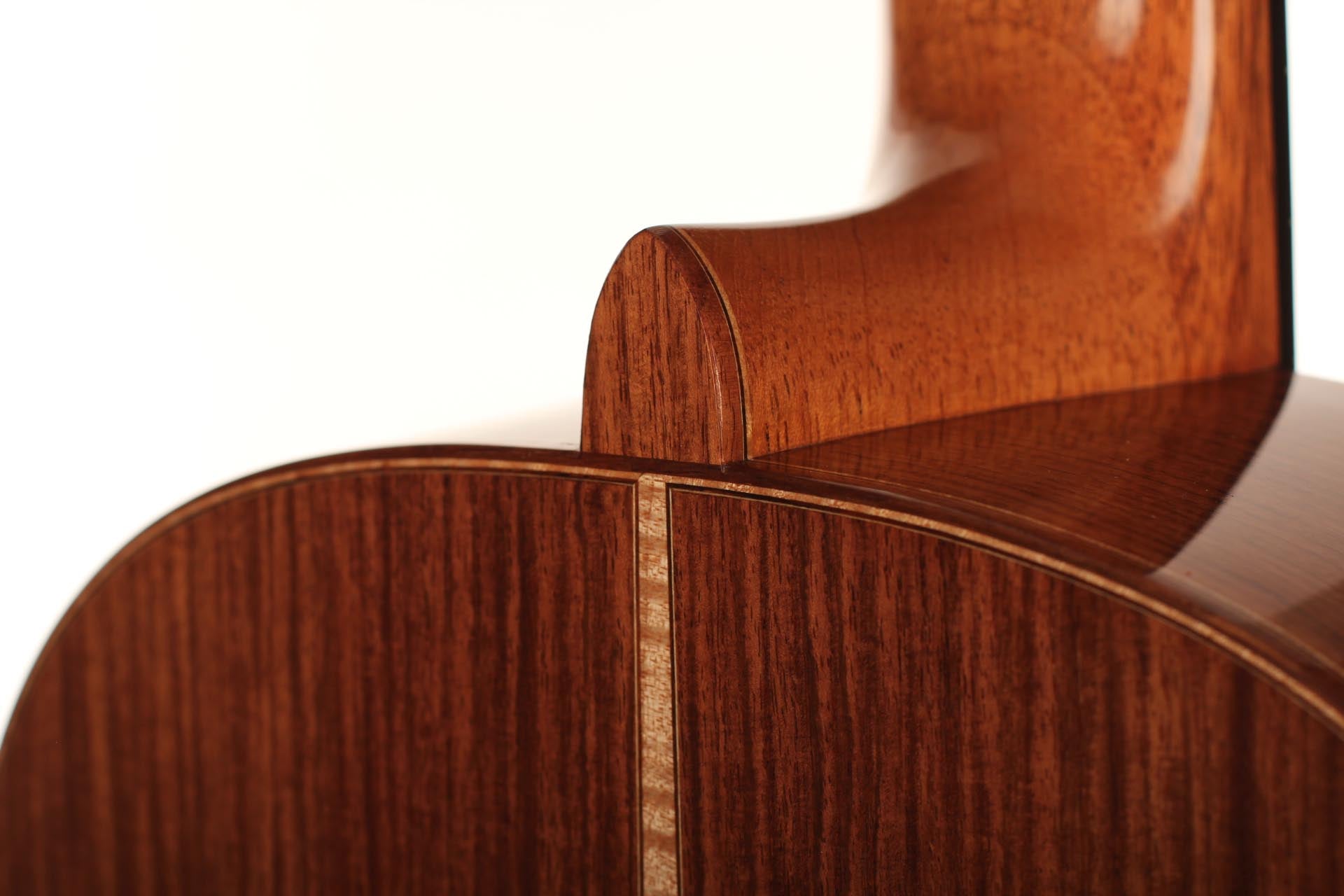 Boden und Zargen dieser Gitarre mit der Nummer 126 sind aus sehr schönem, CITES-freiem Muninga gefertigt; außerdem befindet sich auch ein herrlicher geflammter Ahorn in der Mitte des Bodens. Diese Gitarre ist überraschend leicht für ihr großes Volumen und für ihre tolle, direkte Projektion. Der Diskant klingt einladend und die Bässe tief und offen. Die Balance zwischen den verschiedenen Registern und das Sustain jeder Note in den Akkorden machen es zu einem sehr guten Konzertinstrument. Die Gitarre ist komplett mit einer Schellack-Politur veredelt. Ein Hartschalenkoffer ist inklusive.