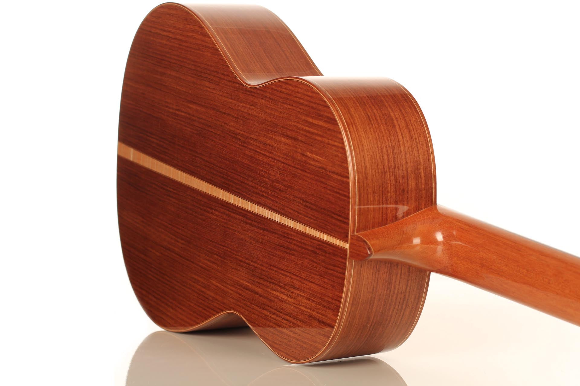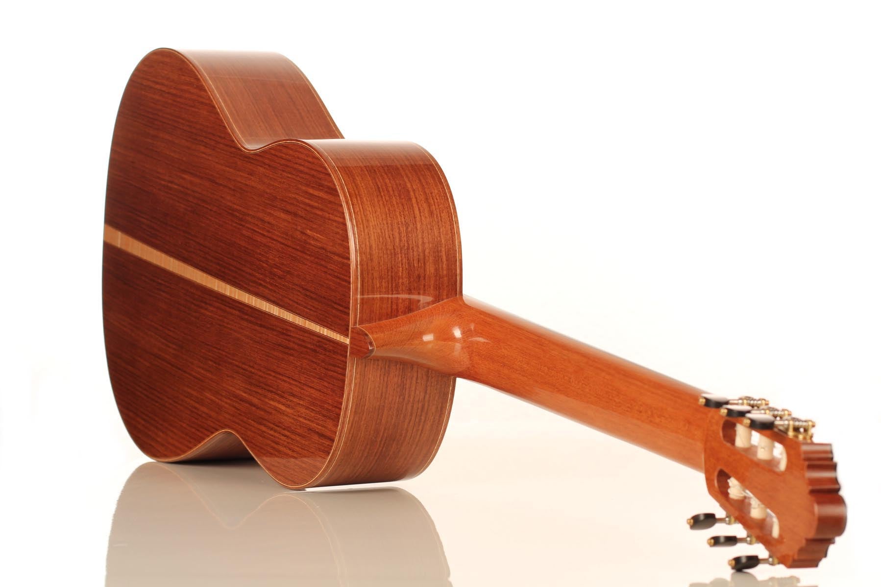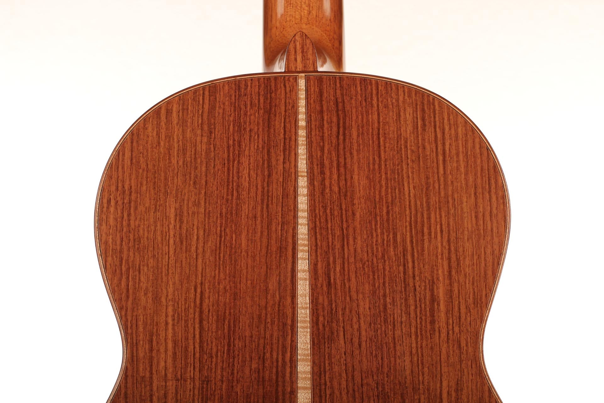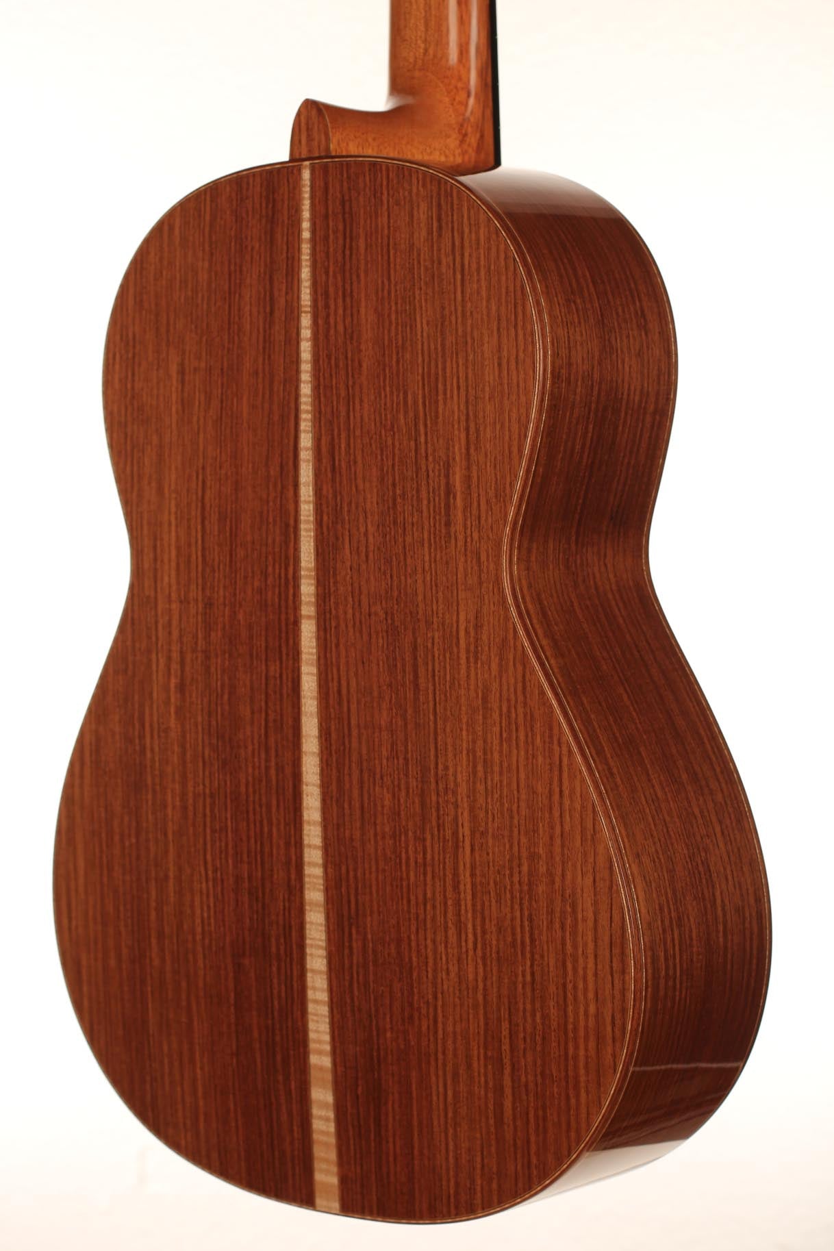 Boden und Zargen dieser Gitarre mit der Nummer 126 sind aus sehr schönem, CITES-freiem Muninga gefertigt; außerdem befindet sich auch ein herrlicher geflammter Ahorn in der Mitte des Bodens. Diese Gitarre ist überraschend leicht für ihr großes Volumen und für ihre tolle, direkte Projektion. Der Diskant klingt einladend und die Bässe tief und offen. Die Balance zwischen den verschiedenen Registern und das Sustain jeder Note in den Akkorden machen es zu einem sehr guten Konzertinstrument. Die Gitarre ist komplett mit einer Schellack-Politur veredelt. Ein Hartschalenkoffer ist inklusive.
