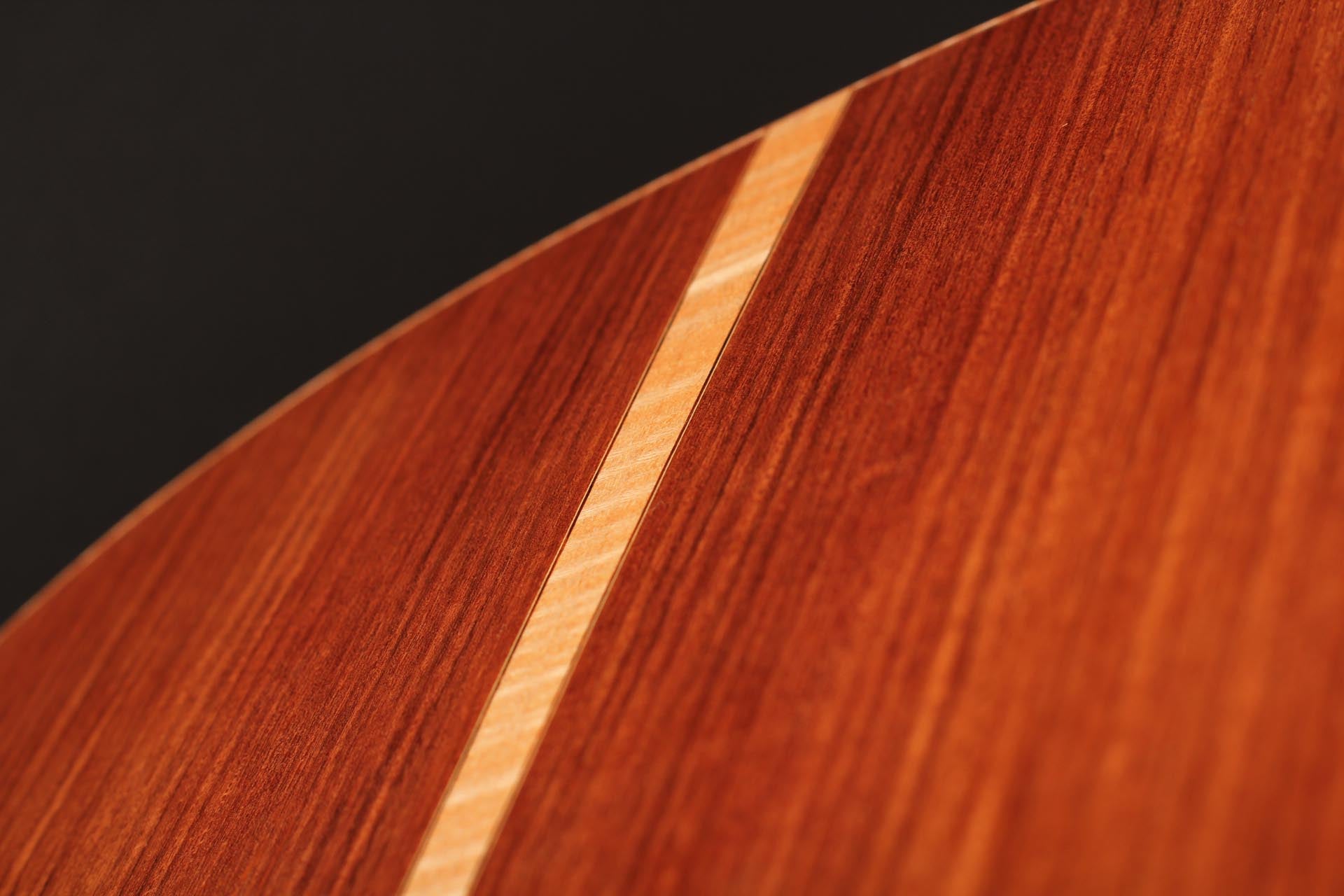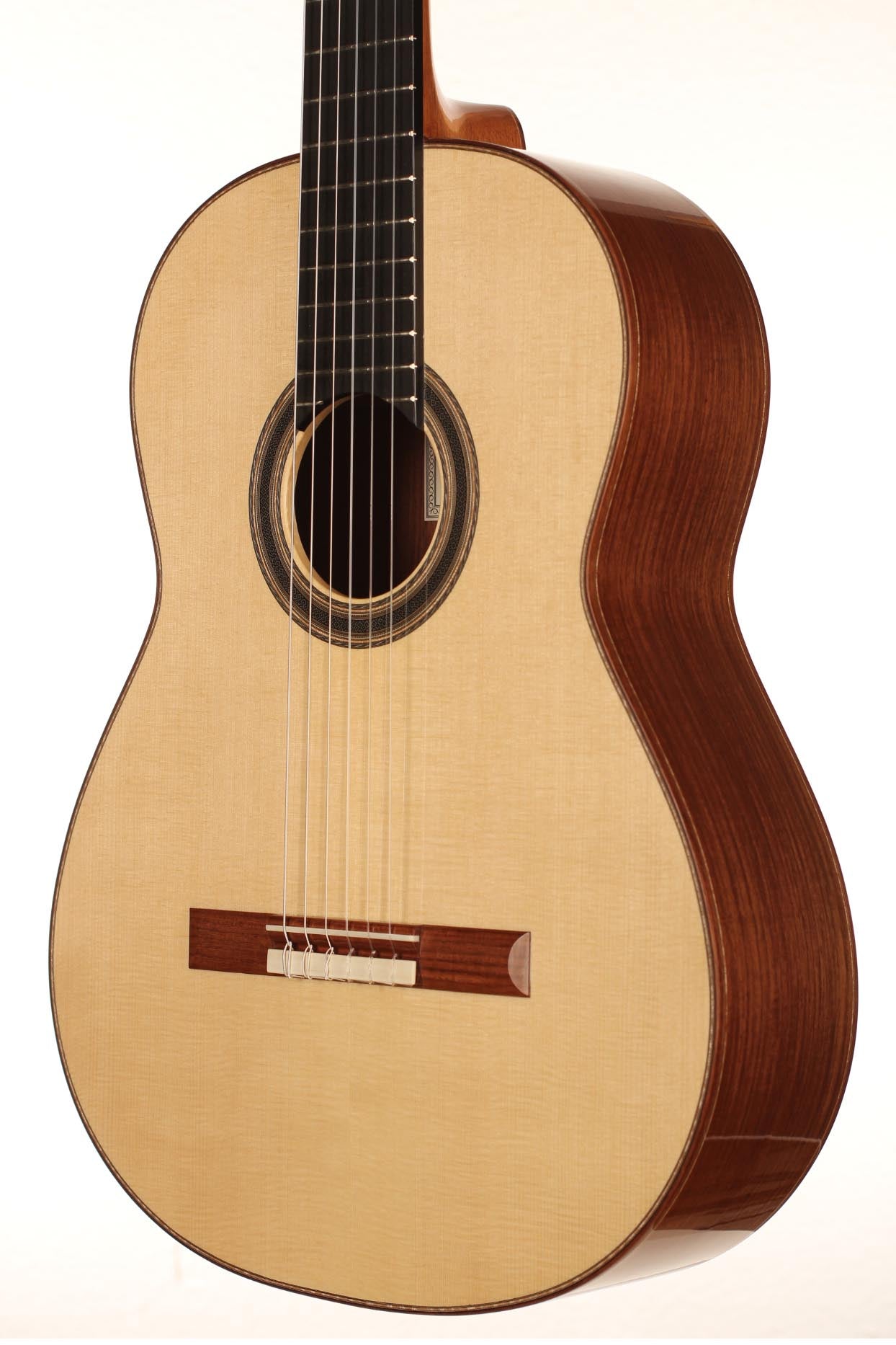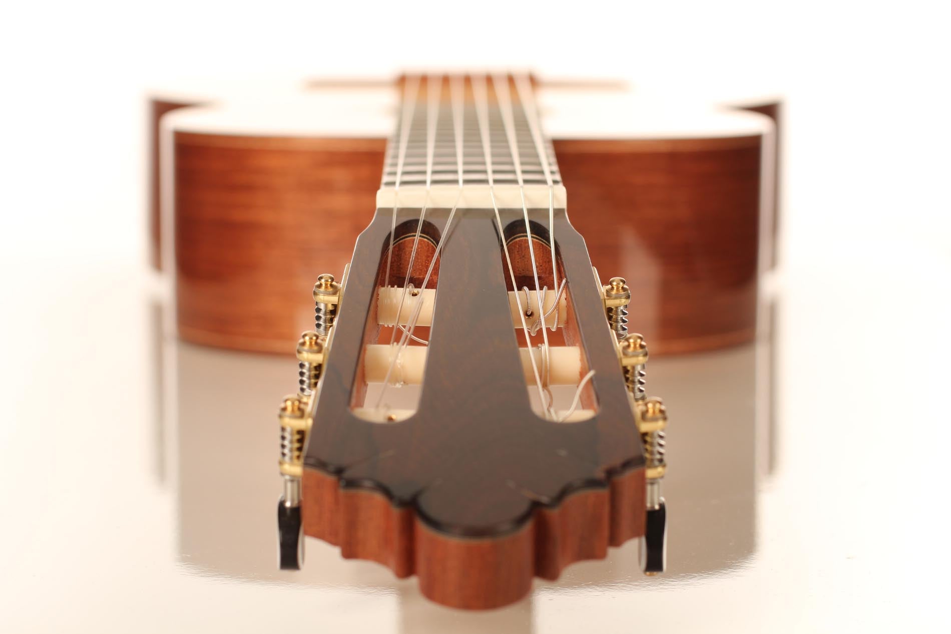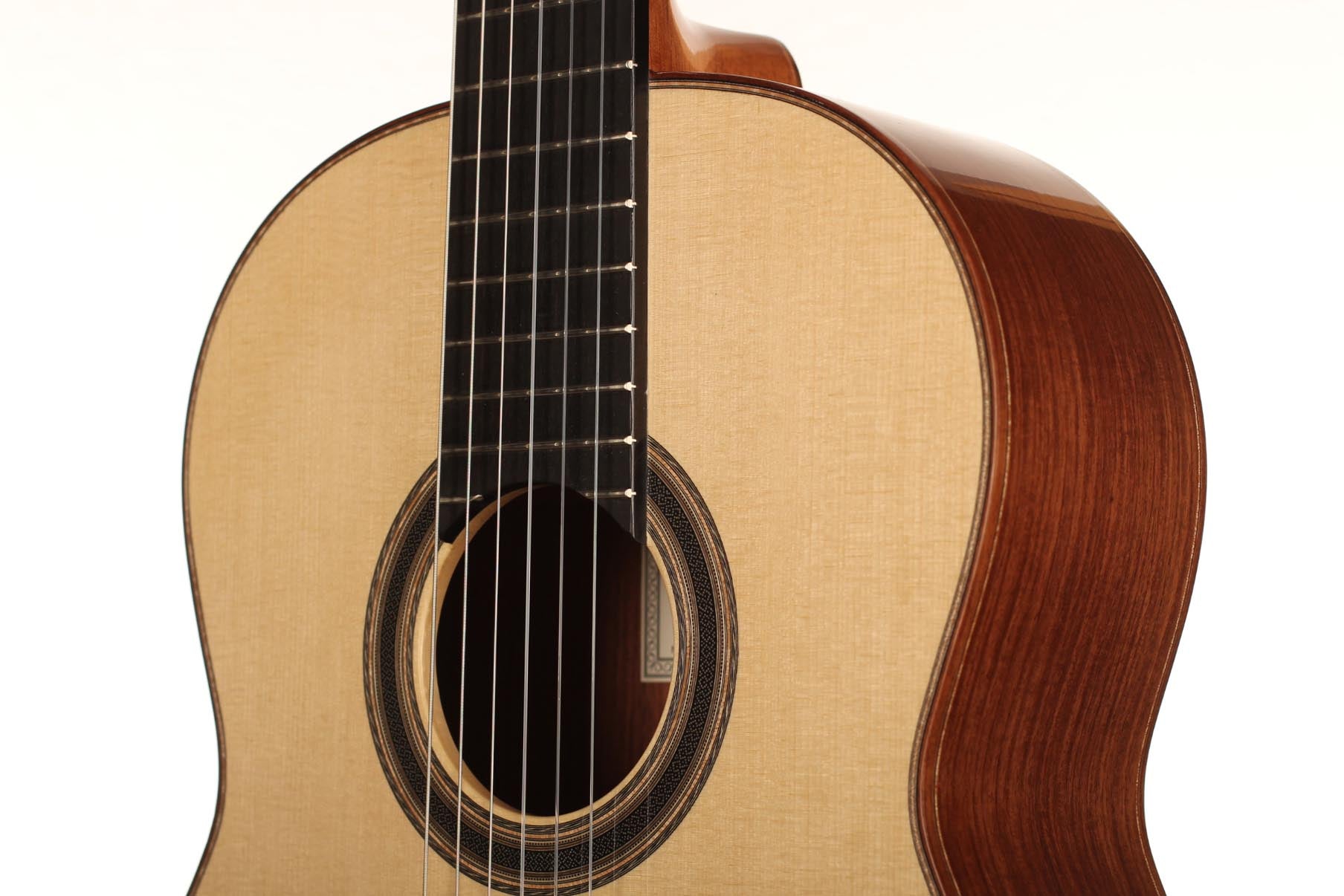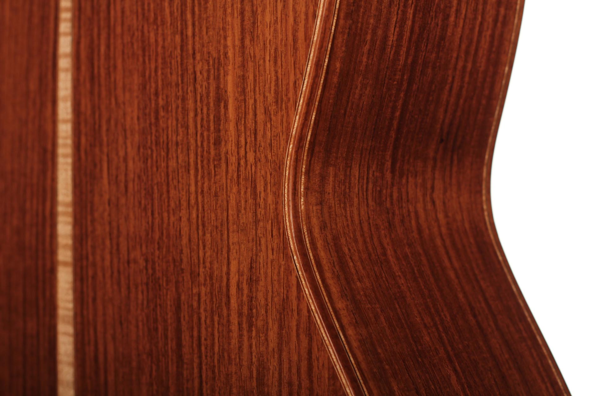Boden und Zargen dieser Gitarre mit der Nummer 126 sind aus sehr schönem, CITES-freiem Muninga gefertigt; außerdem befindet sich auch ein herrlicher geflammter Ahorn in der Mitte des Bodens. Diese Gitarre ist überraschend leicht für ihr großes Volumen und für ihre tolle, direkte Projektion. Der Diskant klingt einladend und die Bässe tief und offen. Die Balance zwischen den verschiedenen Registern und das Sustain jeder Note in den Akkorden machen es zu einem sehr guten Konzertinstrument. Die Gitarre ist komplett mit einer Schellack-Politur veredelt. Ein Hartschalenkoffer ist inklusive.