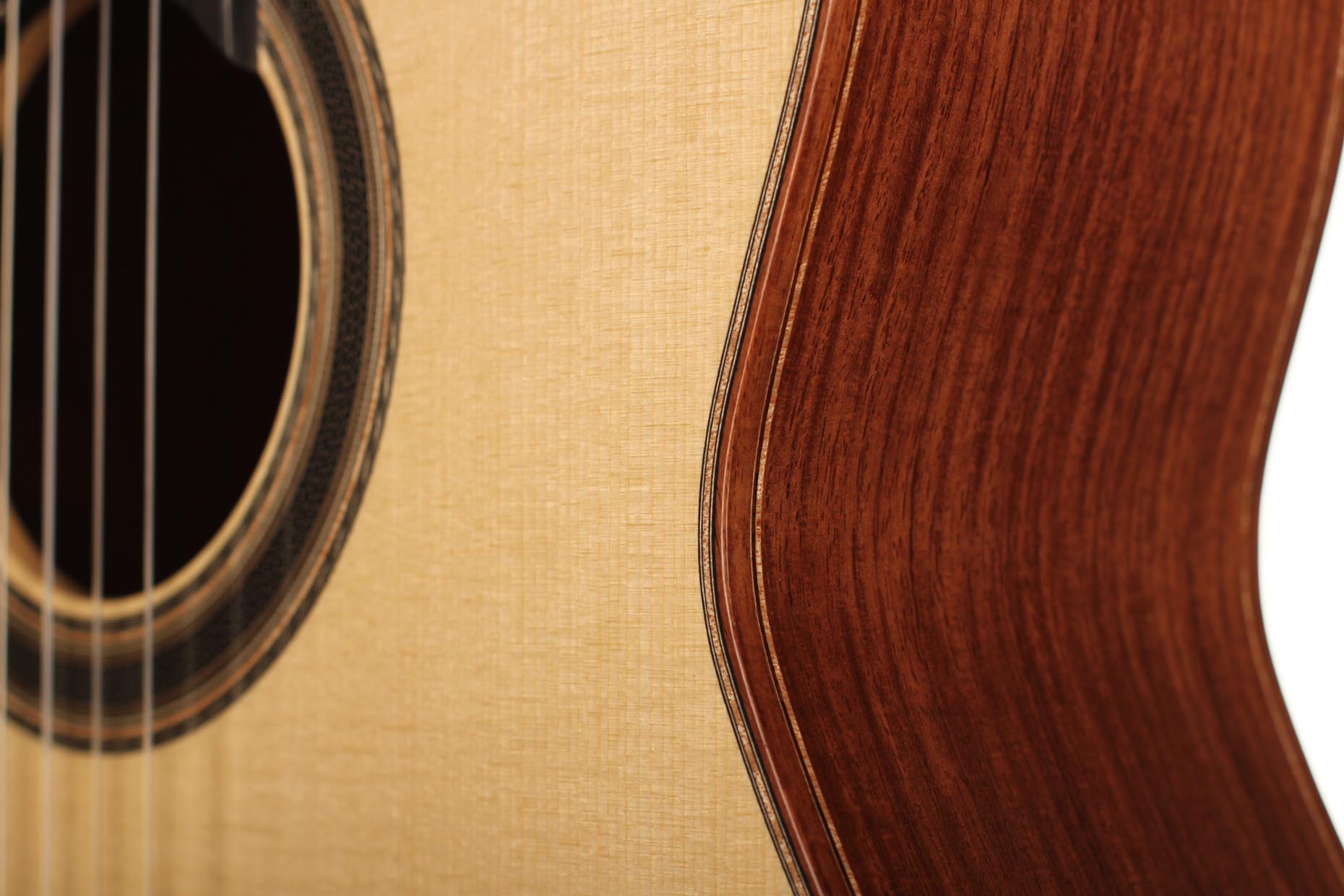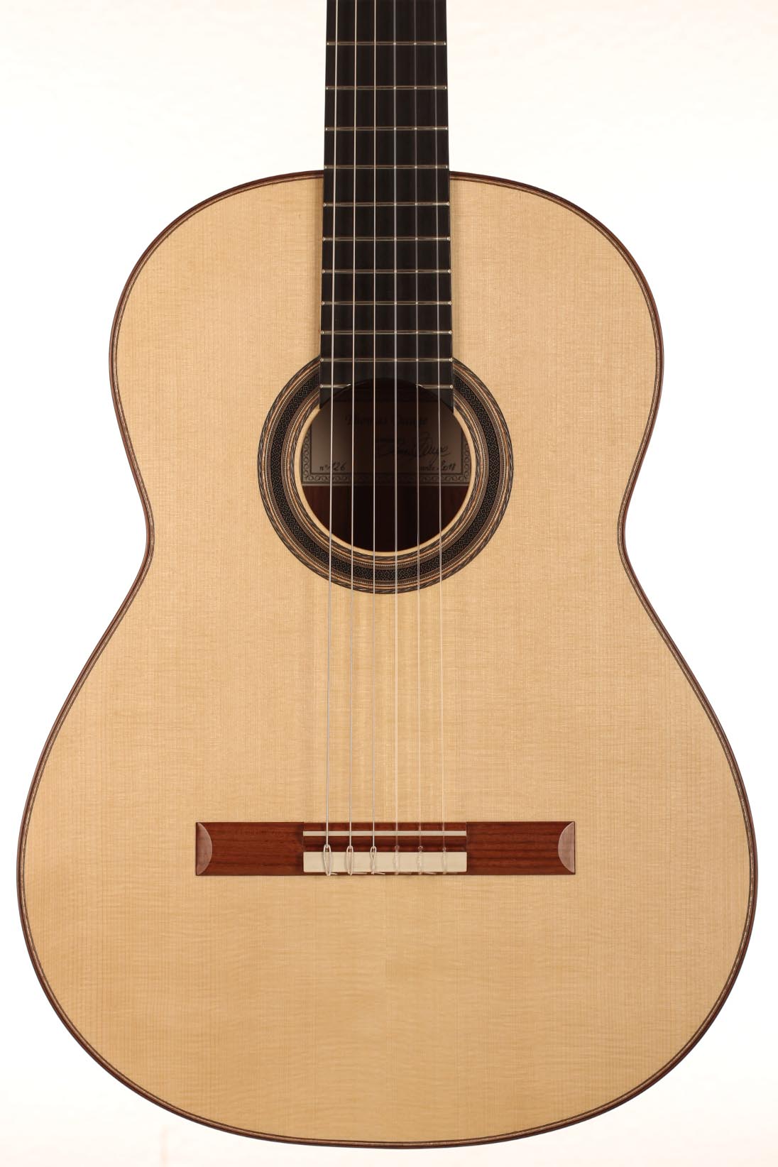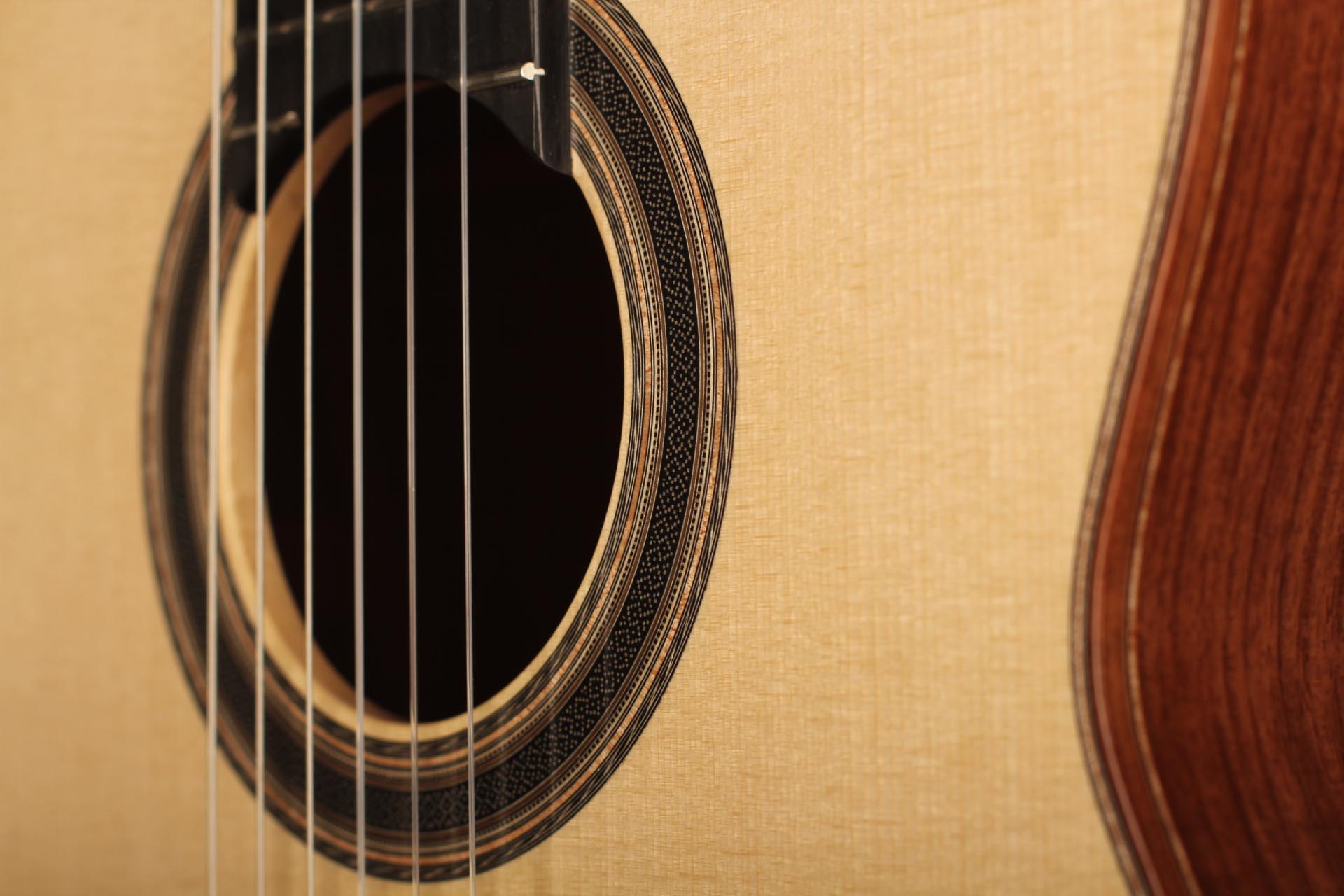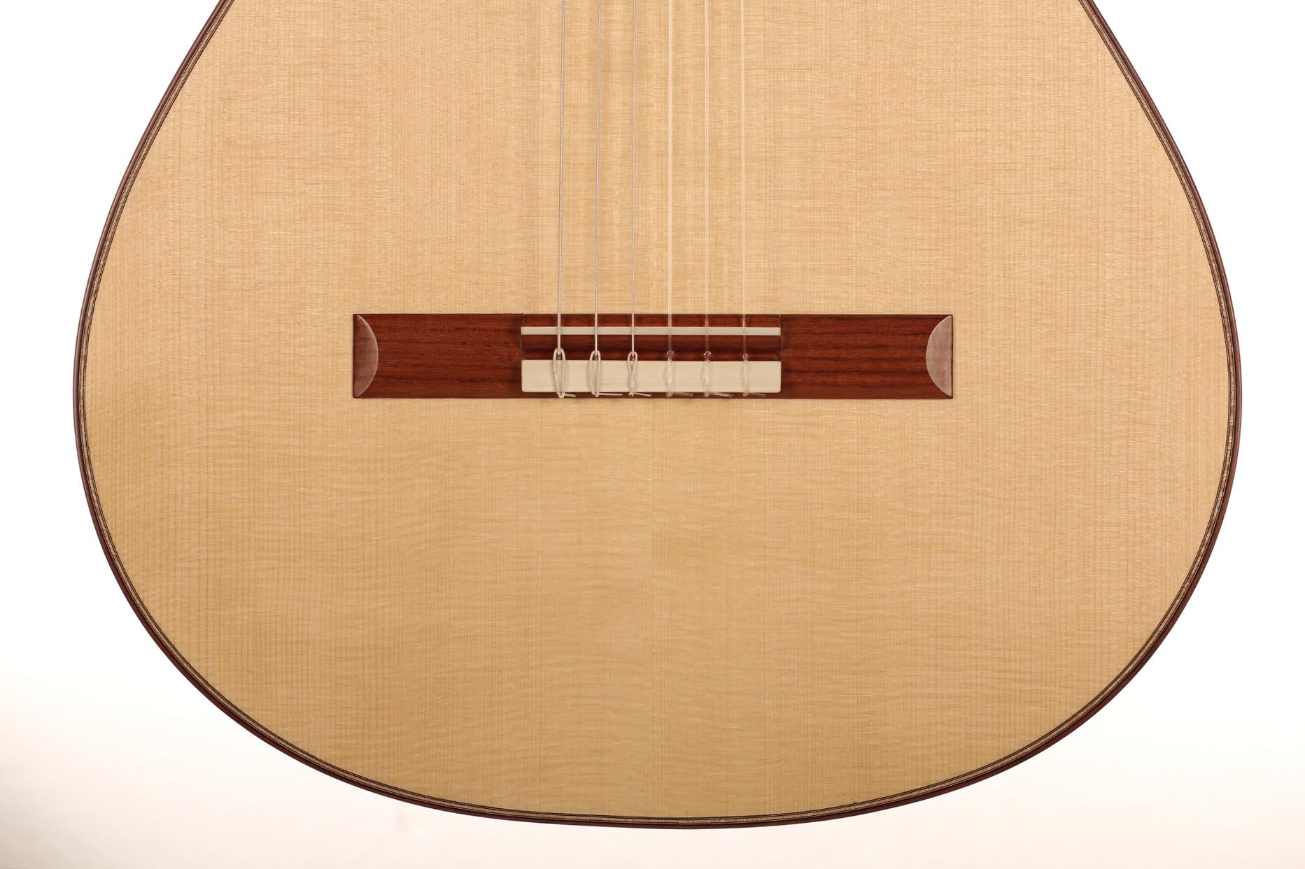 Boden und Zargen dieser Gitarre mit der Nummer 126 sind aus sehr schönem, CITES-freiem Muninga gefertigt; außerdem befindet sich auch ein herrlicher geflammter Ahorn in der Mitte des Bodens. Diese Gitarre ist überraschend leicht für ihr großes Volumen und für ihre tolle, direkte Projektion. Der Diskant klingt einladend und die Bässe tief und offen. Die Balance zwischen den verschiedenen Registern und das Sustain jeder Note in den Akkorden machen es zu einem sehr guten Konzertinstrument. Die Gitarre ist komplett mit einer Schellack-Politur veredelt. Ein Hartschalenkoffer ist inklusive.