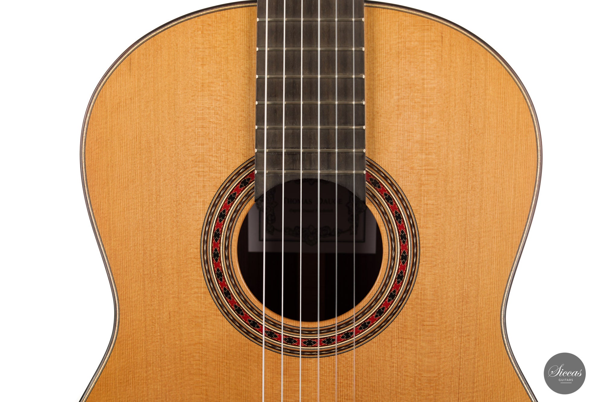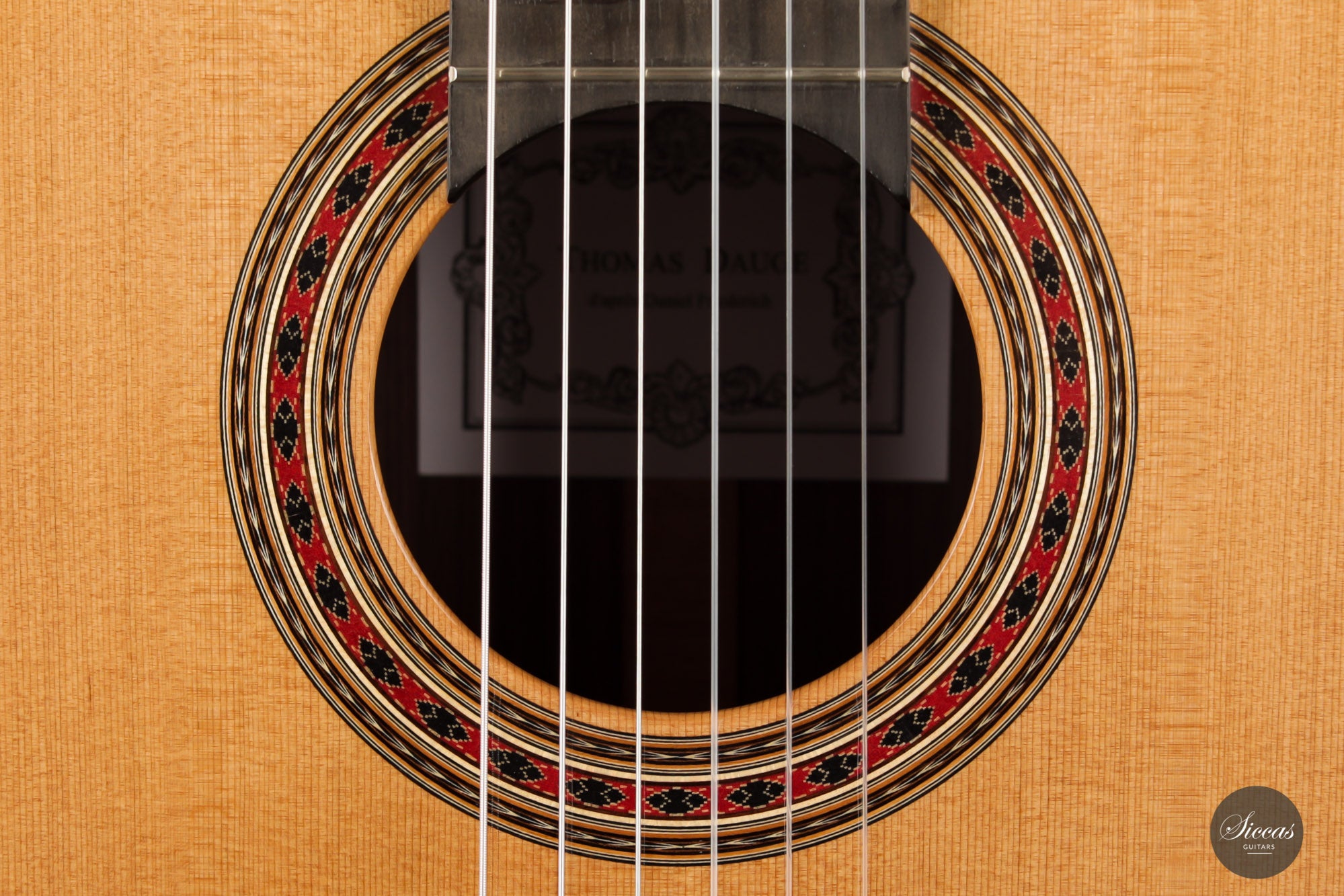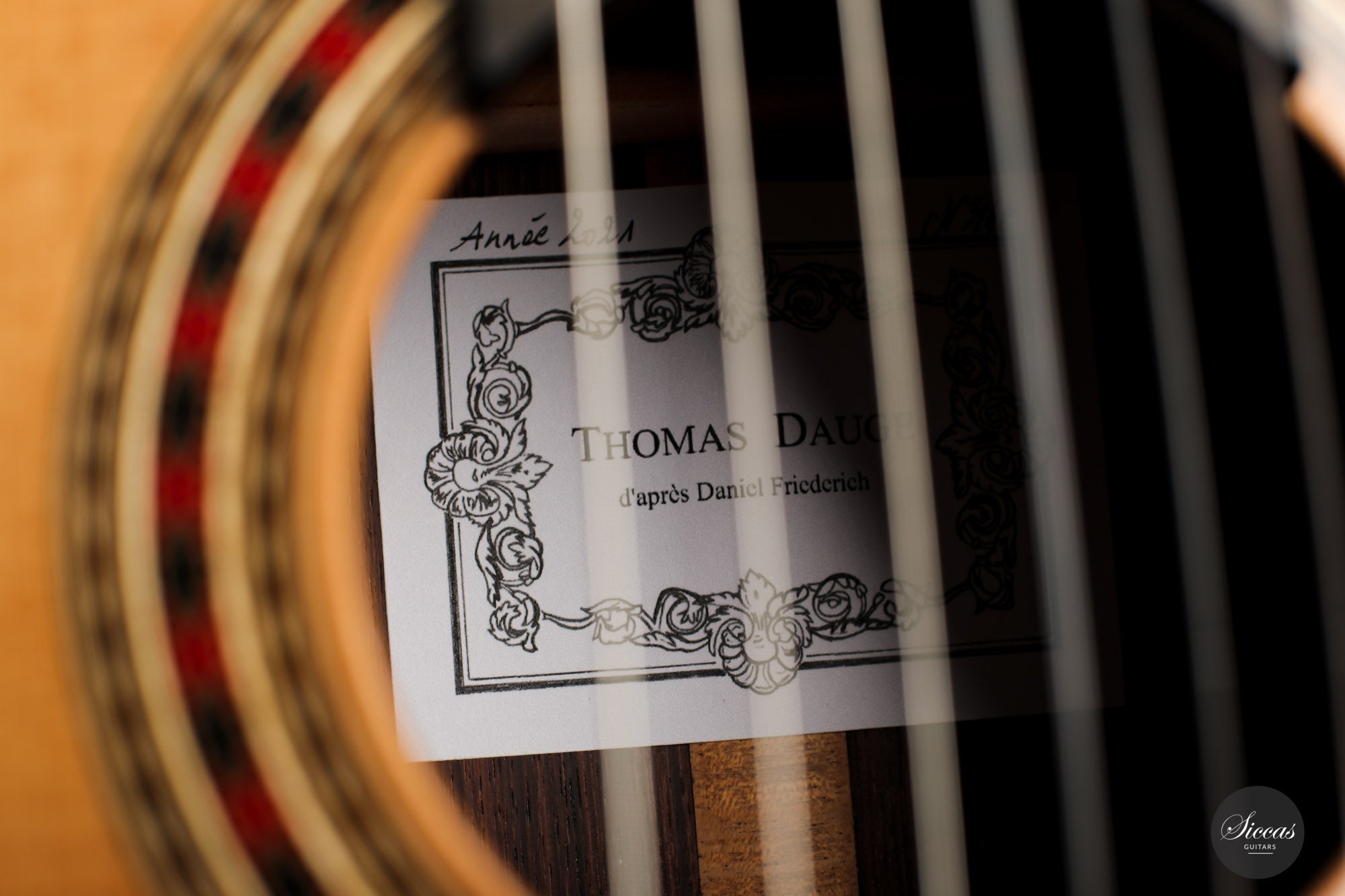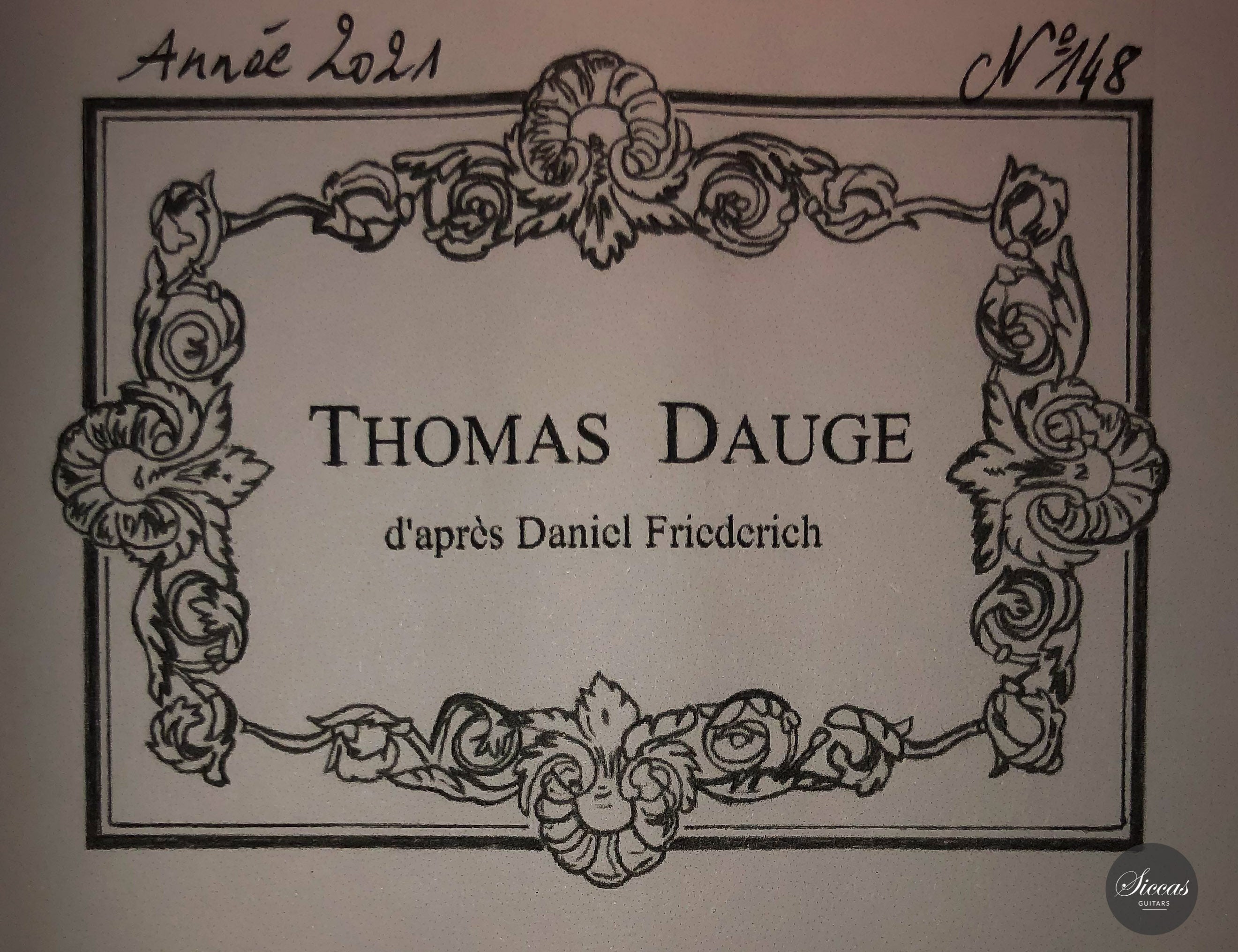 Thomas Dauge is a French guitar maker based in Bordeaux. He follows the French tradition of guitar making and proves great skills in the design and construction of the rosette and other marquetry elements. Thomas Dauge pays great attention to every detail of the instrument, such as the choice of wood, the quality of shellac polish, the clean execution of the joints and, above all, the sound characteristics of his guitars. He succeeds in building very well-balanced instruments with complex timbre and excellent playability.