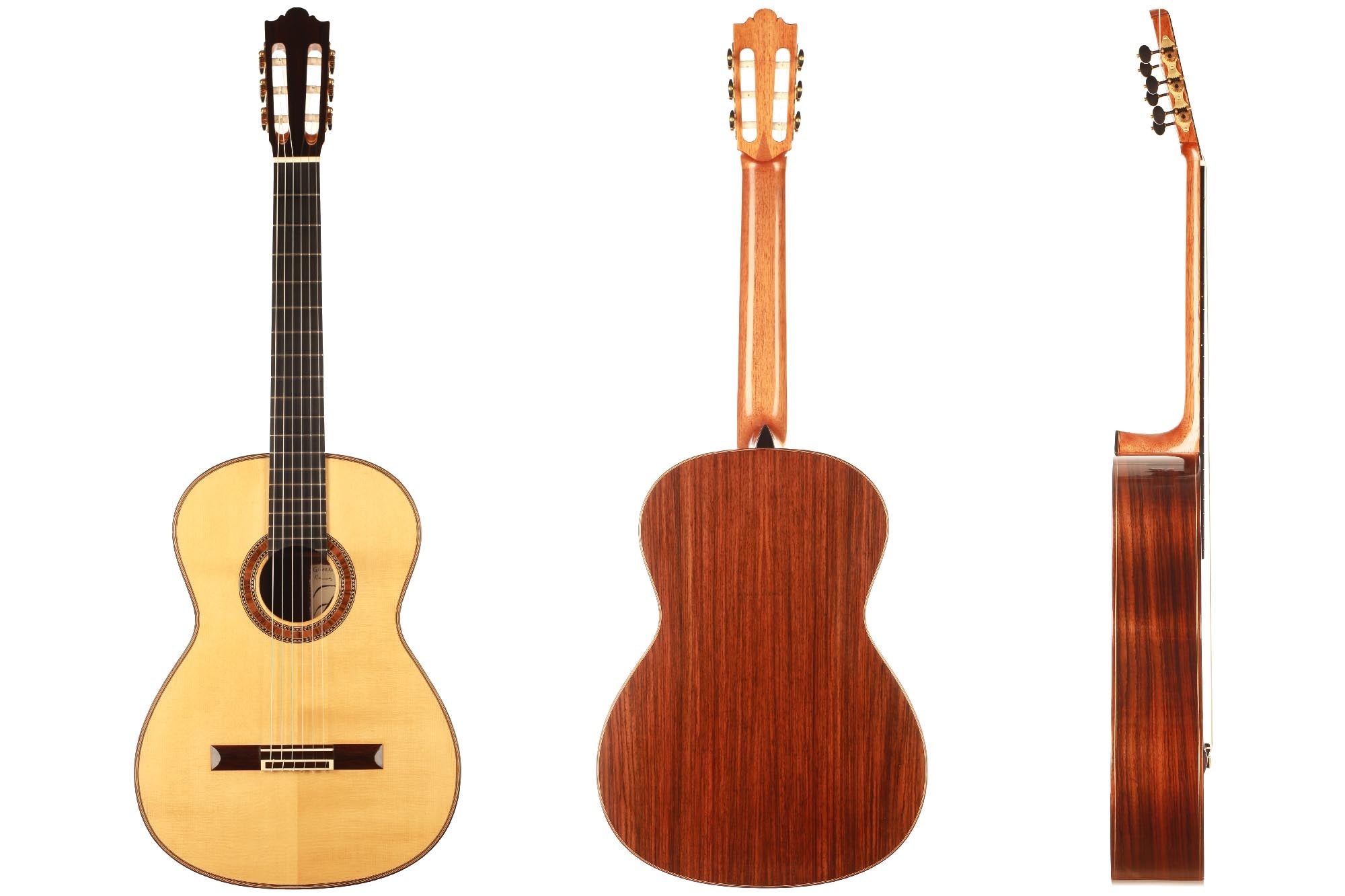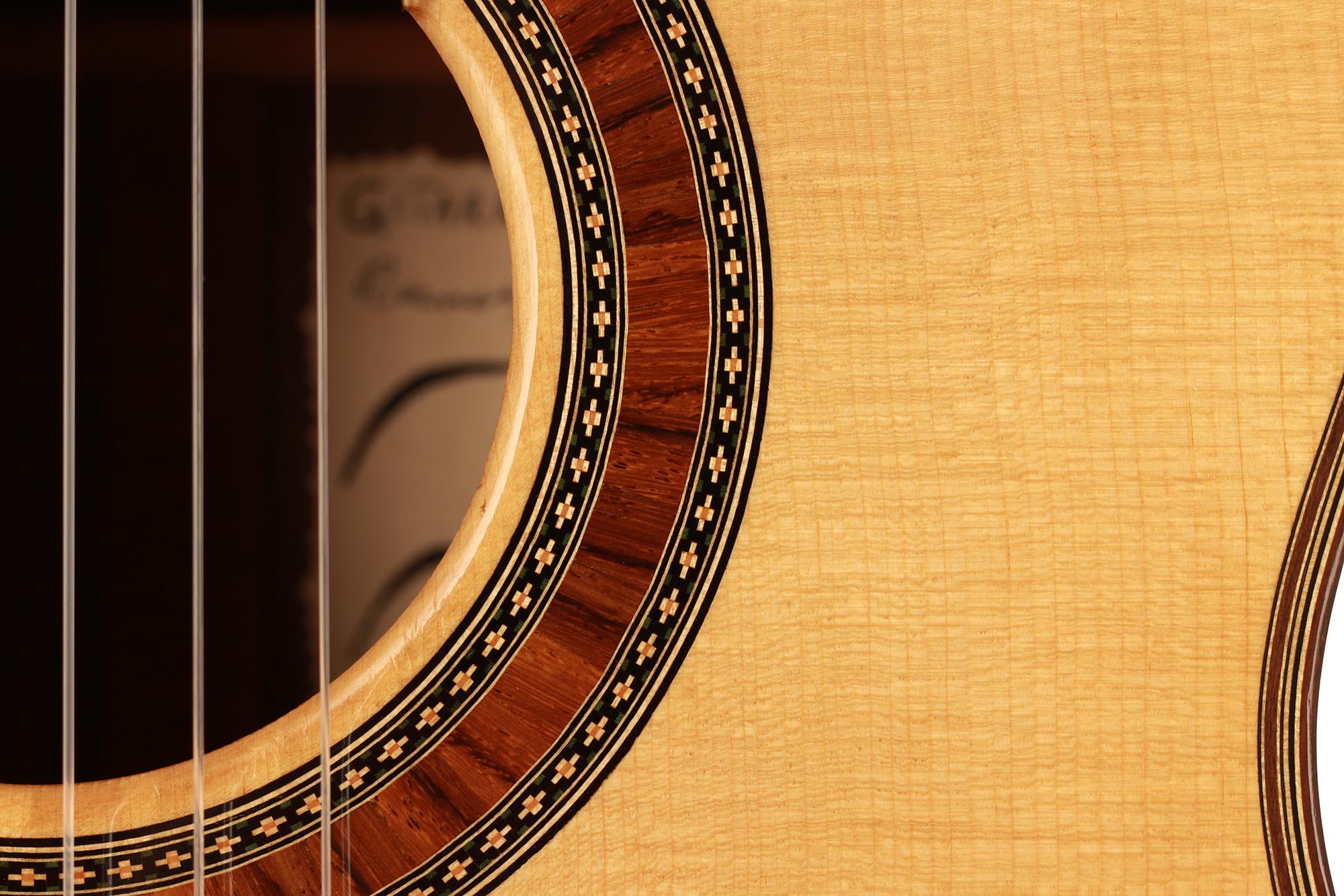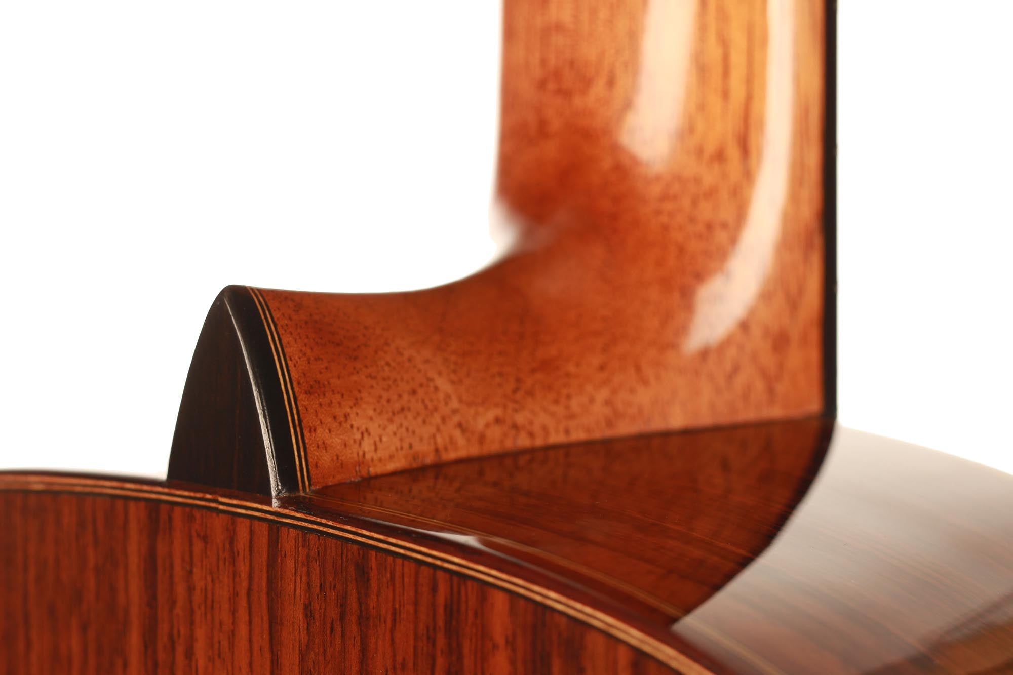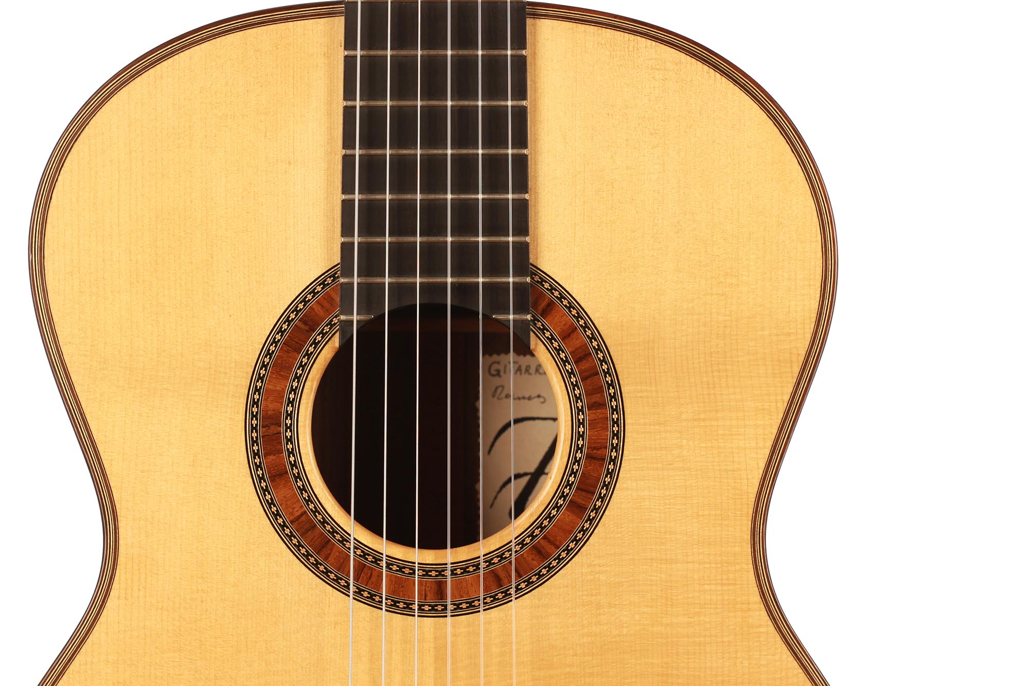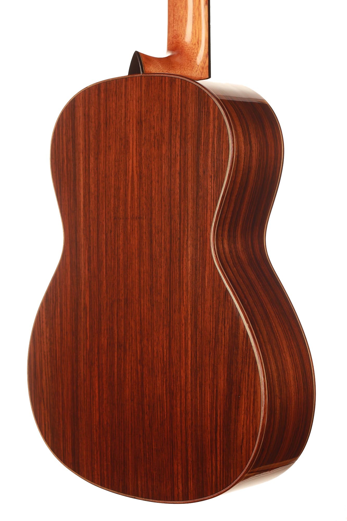 This 2016 built guitar has only few superficial signs of use and is in a very good condition. Back and sides are made of Indian rosewood and the spruce top is traditionally built with a 7-fan bracing. The guitar is equipped with Scheller quality tuners and has a very clear and appealing sound character. Especially the good separation of the voices and the crystalline treble merit special mention. The basses sound warm and give the instrument a beautiful carrying depth.