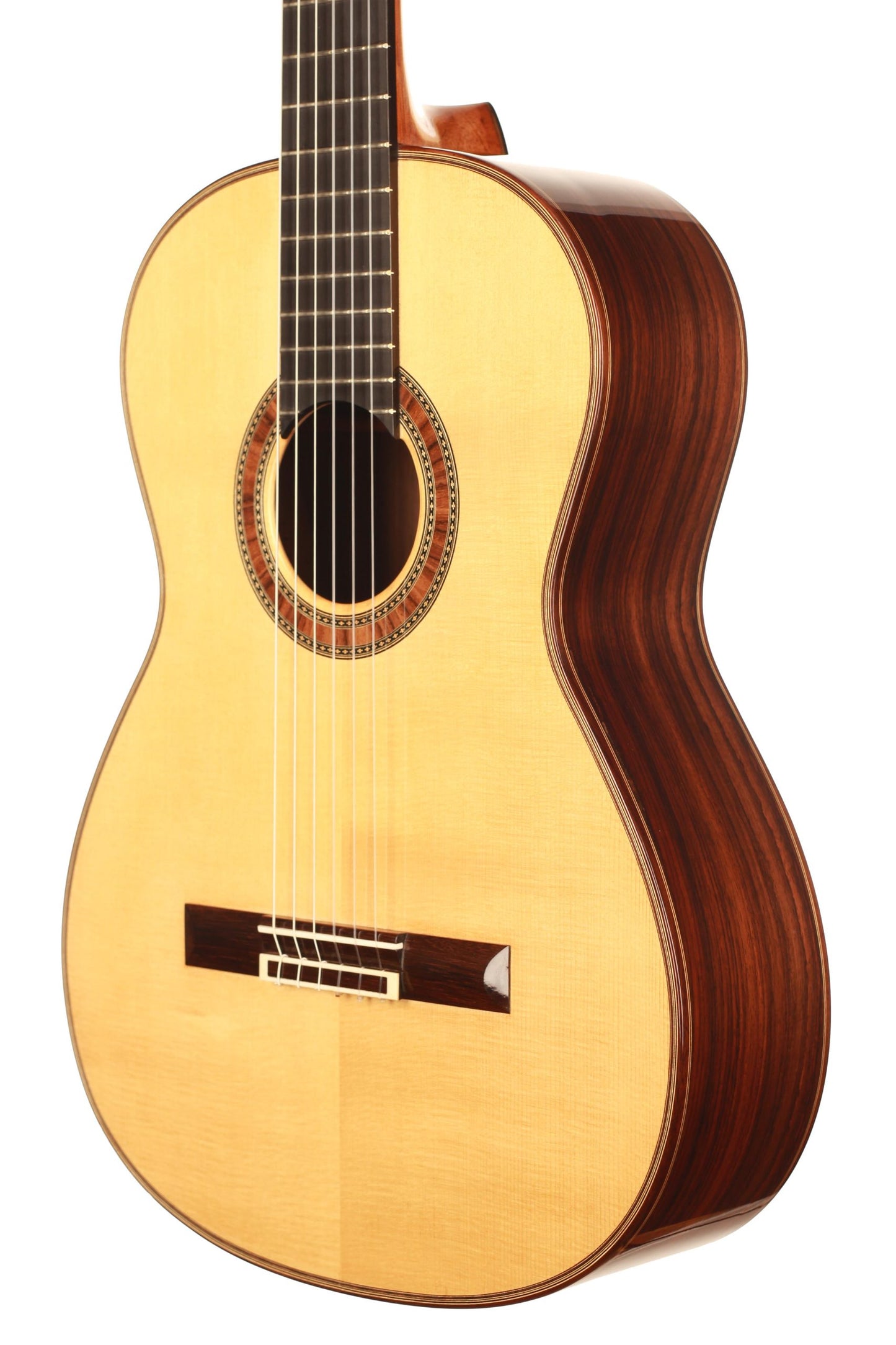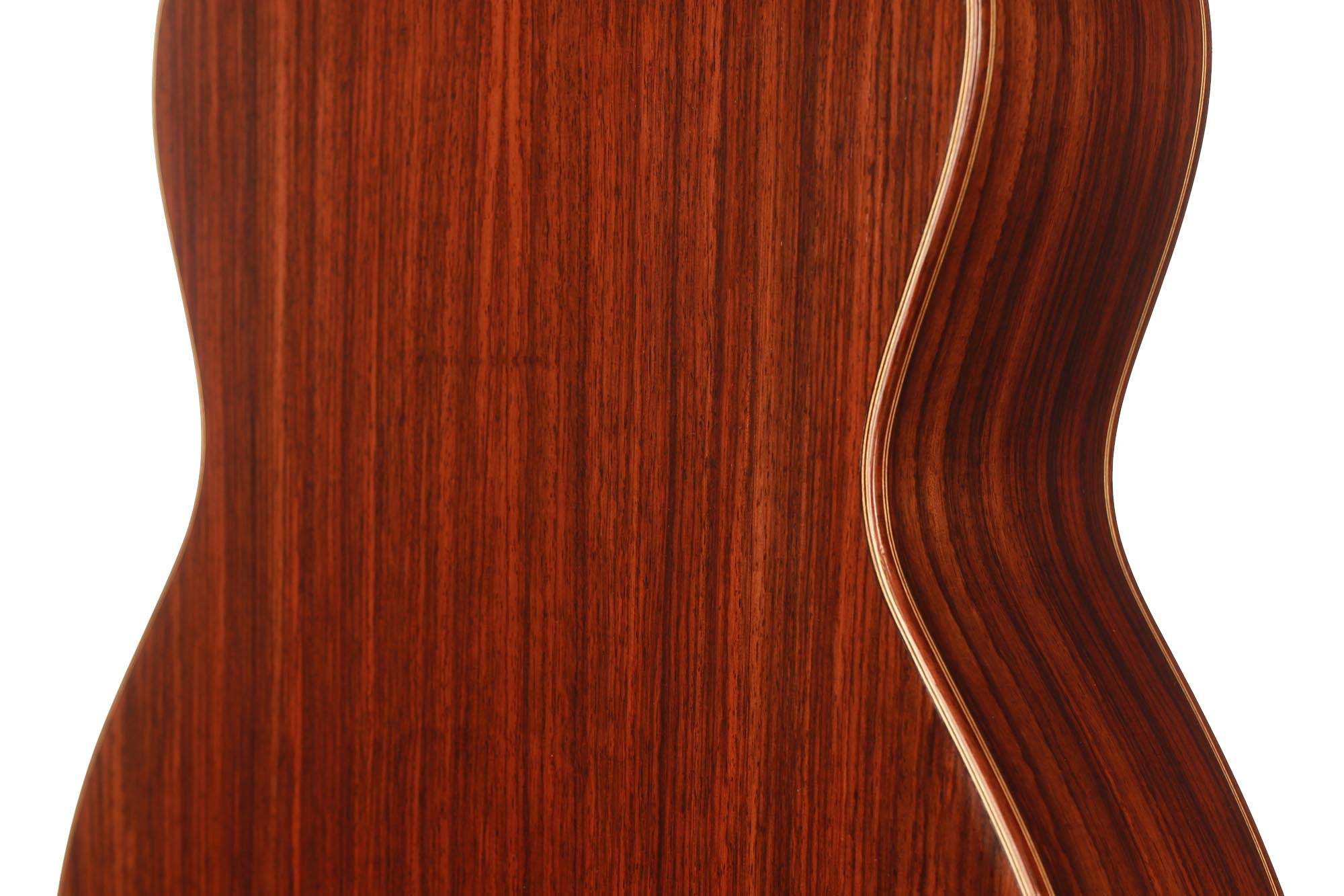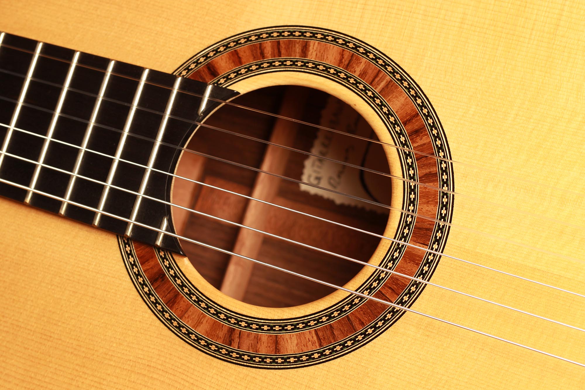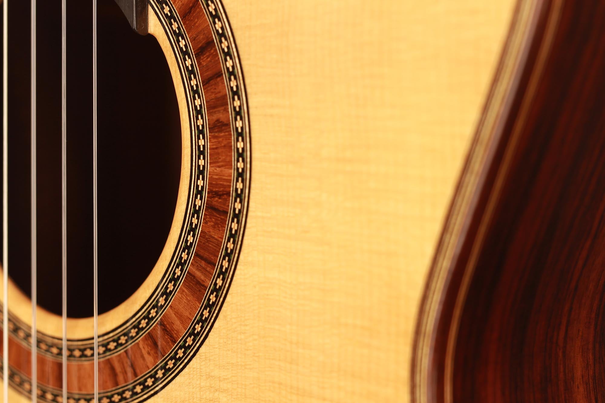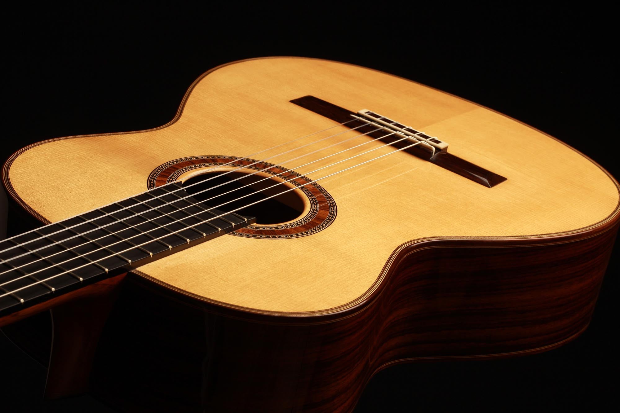 This 2016 built guitar has only few superficial signs of use and is in a very good condition. Back and sides are made of Indian rosewood and the spruce top is traditionally built with a 7-fan bracing. The guitar is equipped with Scheller quality tuners and has a very clear and appealing sound character. Especially the good separation of the voices and the crystalline treble merit special mention. The basses sound warm and give the instrument a beautiful carrying depth.