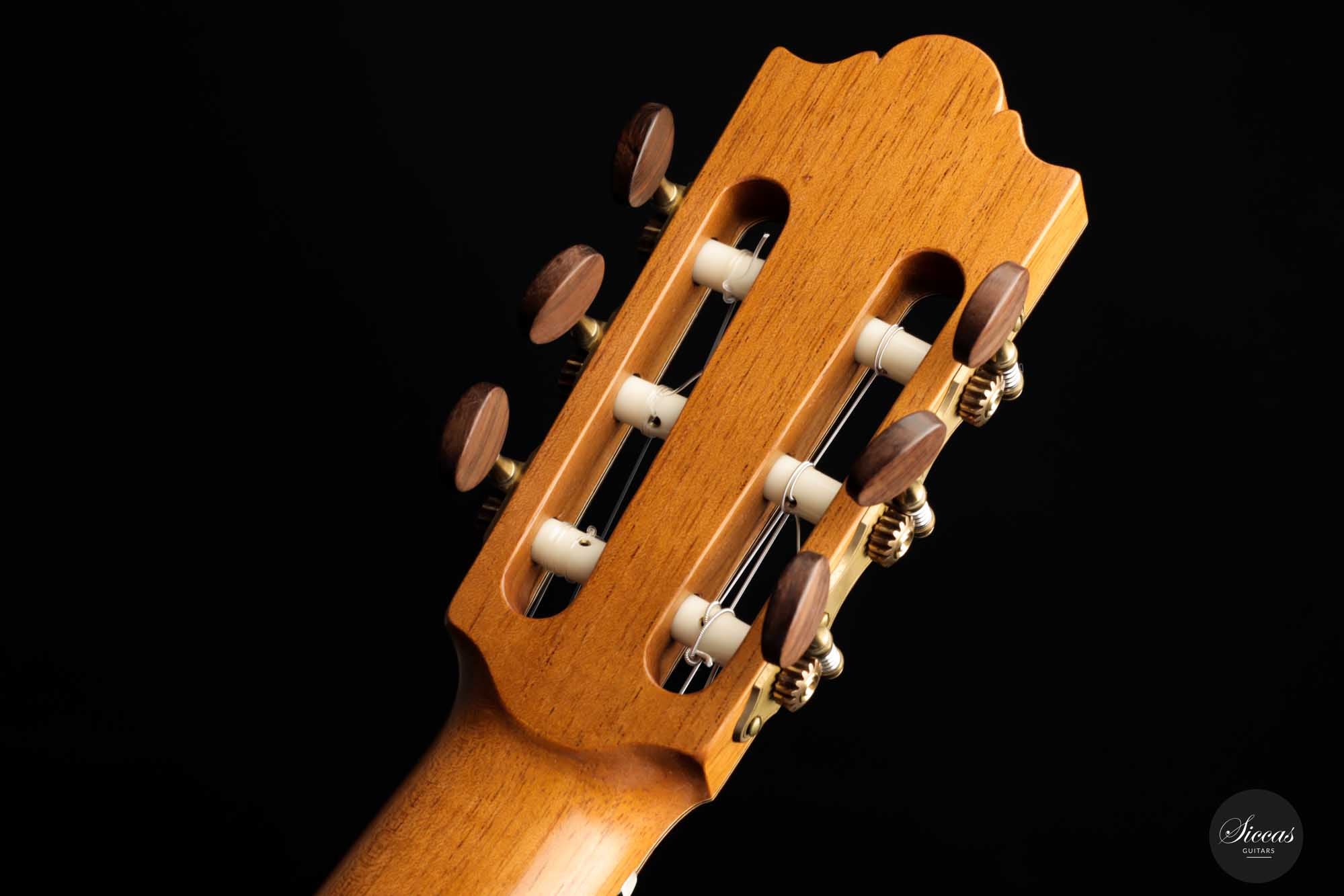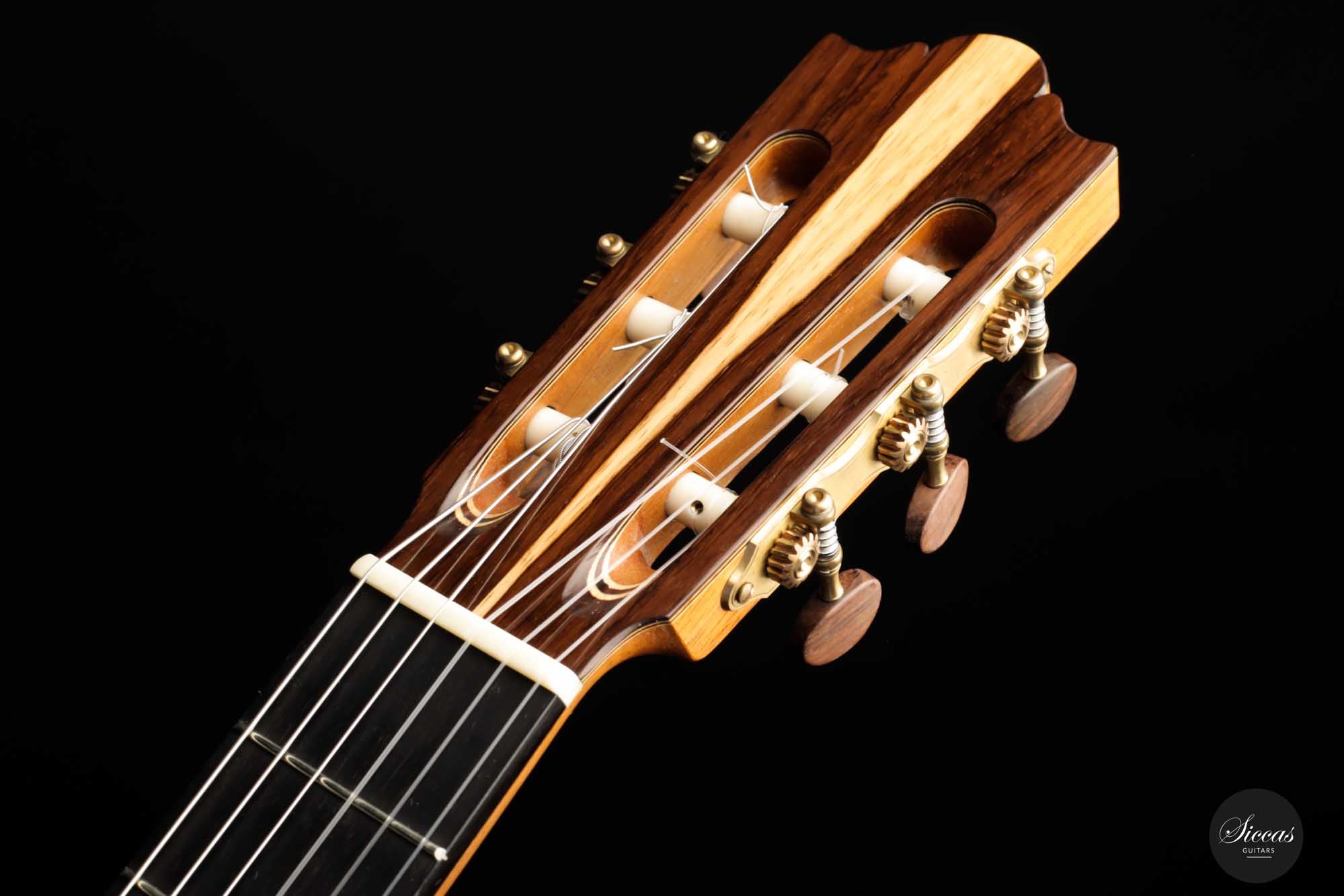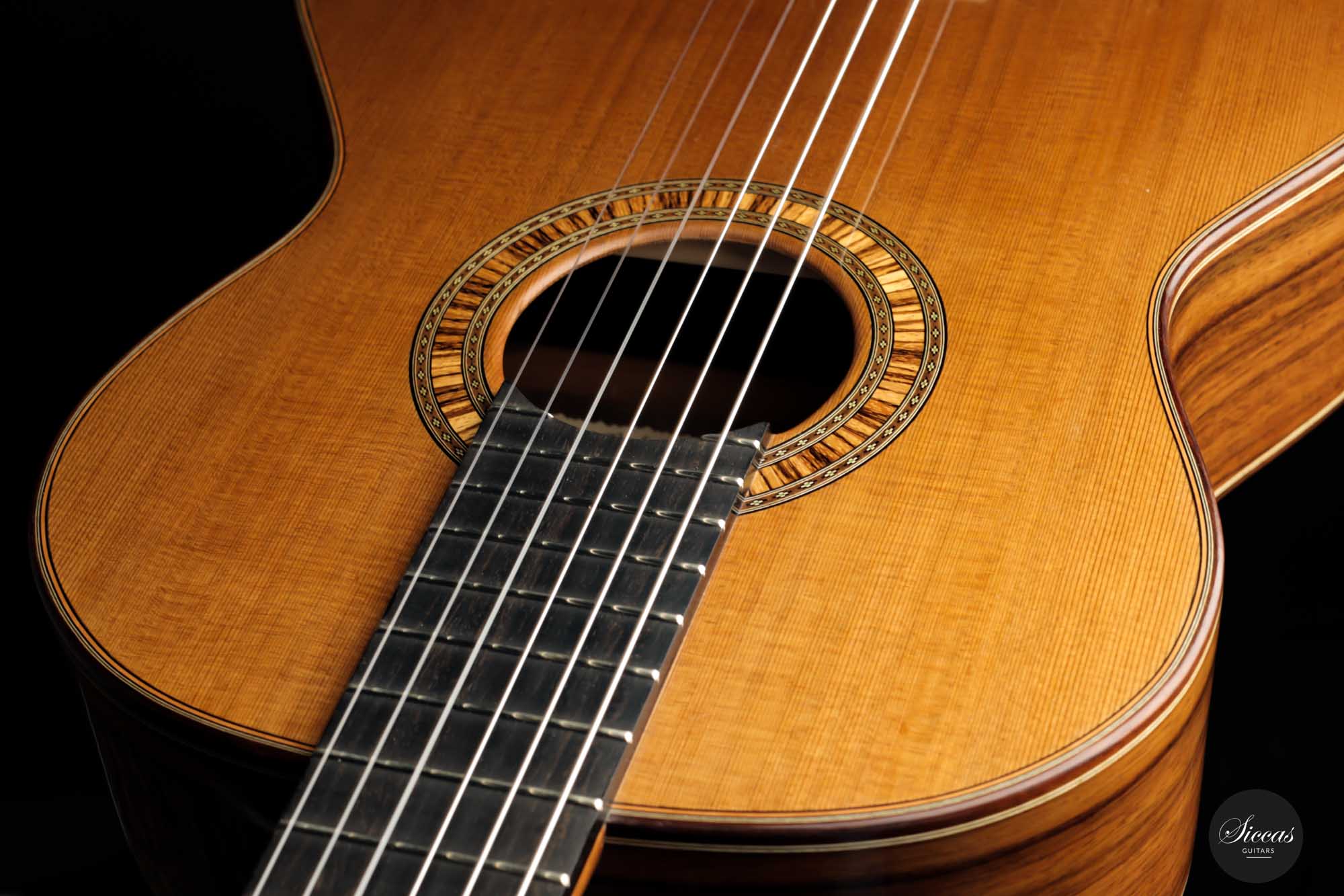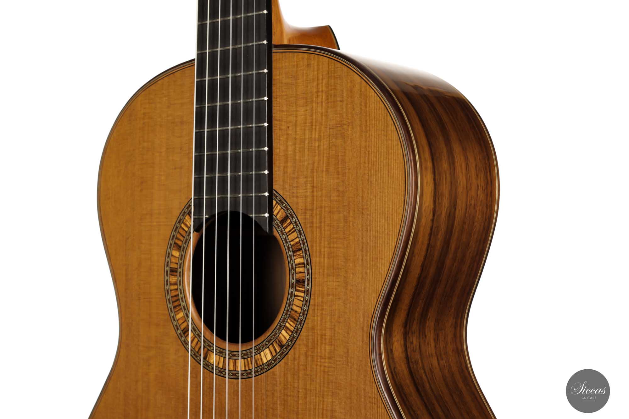 Diese neue Gitarre von 2022 hat eine Zederndecke und Boden und Zargen aus indischem Palisander. Sie hat eine saubere Verarbeitung, eine sehr kraftvolle, warme, zedernartige Stimme und eine fantastische Spielbarkeit. Es ist eine Konzertgitarre, die zum Spielen gemacht ist und die Bedürfnisse der Gitarristen befriedigt. Dieses feine Instrument ist mit erstklassigen Scheller-Mechaniken ausgestattet und ist komplett französisch poliert. Besonders hervorzuheben sind die hervorragende Trennung der Stimmen und der weiche, satte Diskant. Die Bässe klingen warm und geben dem Instrument eine schöne tragende Tiefe.