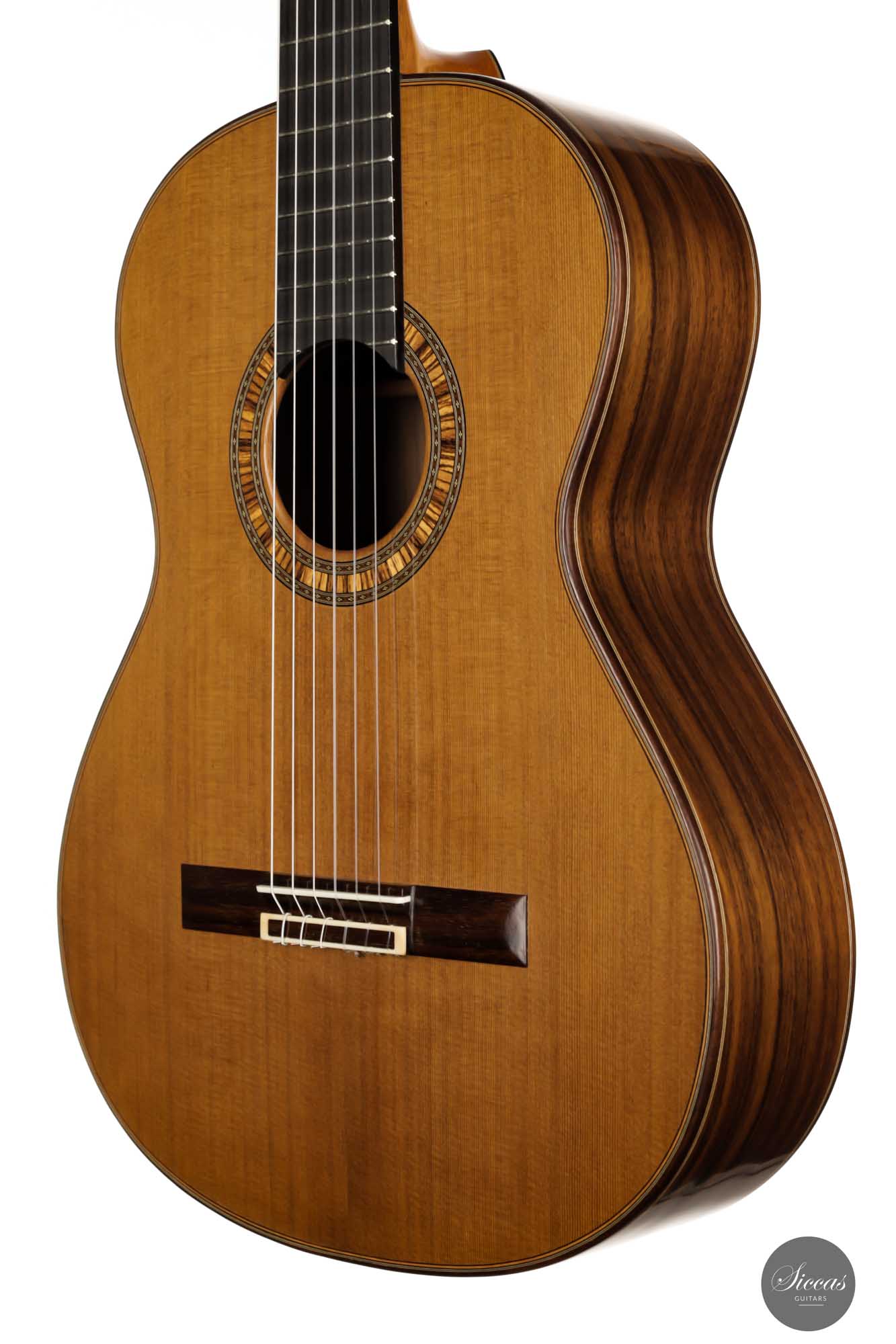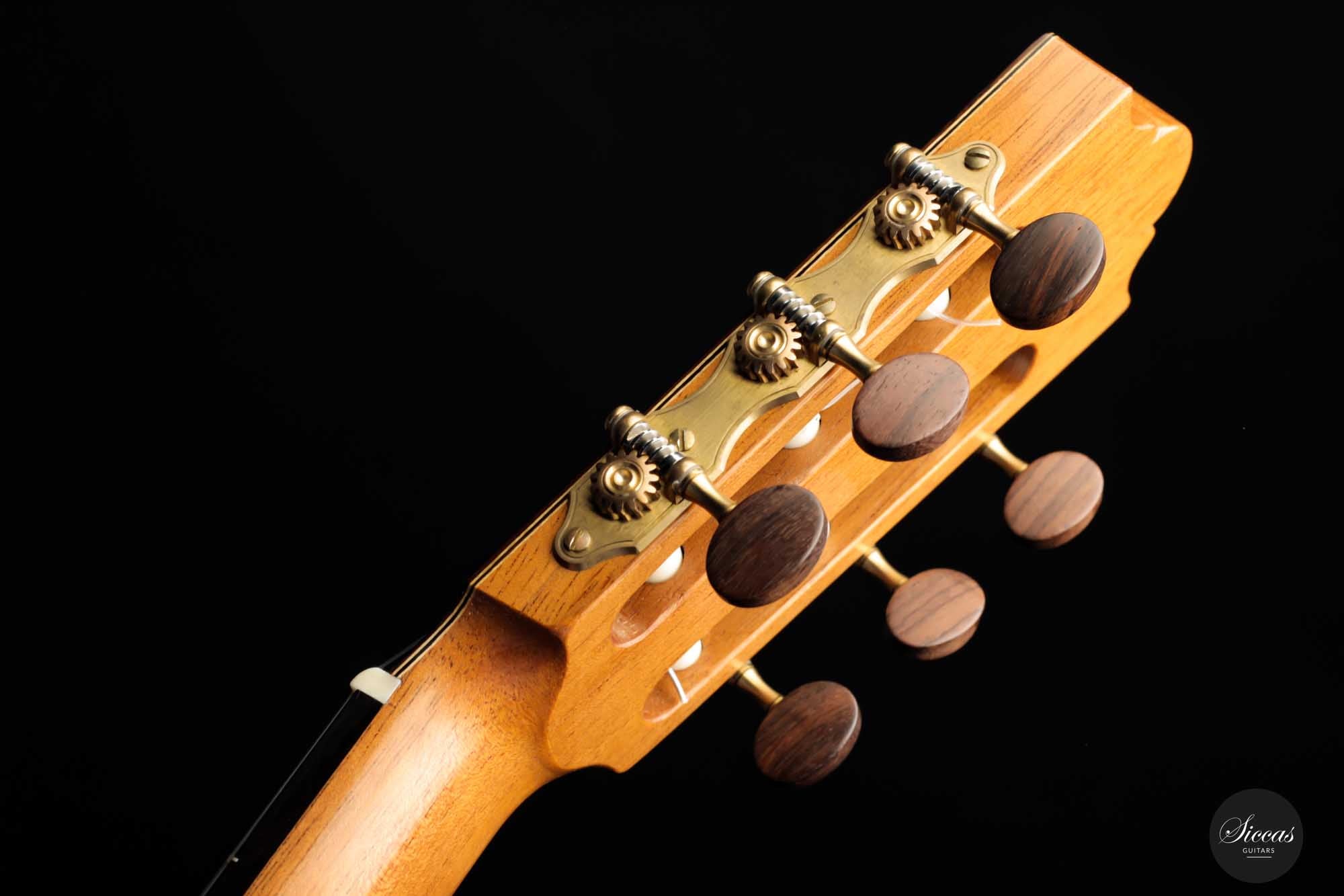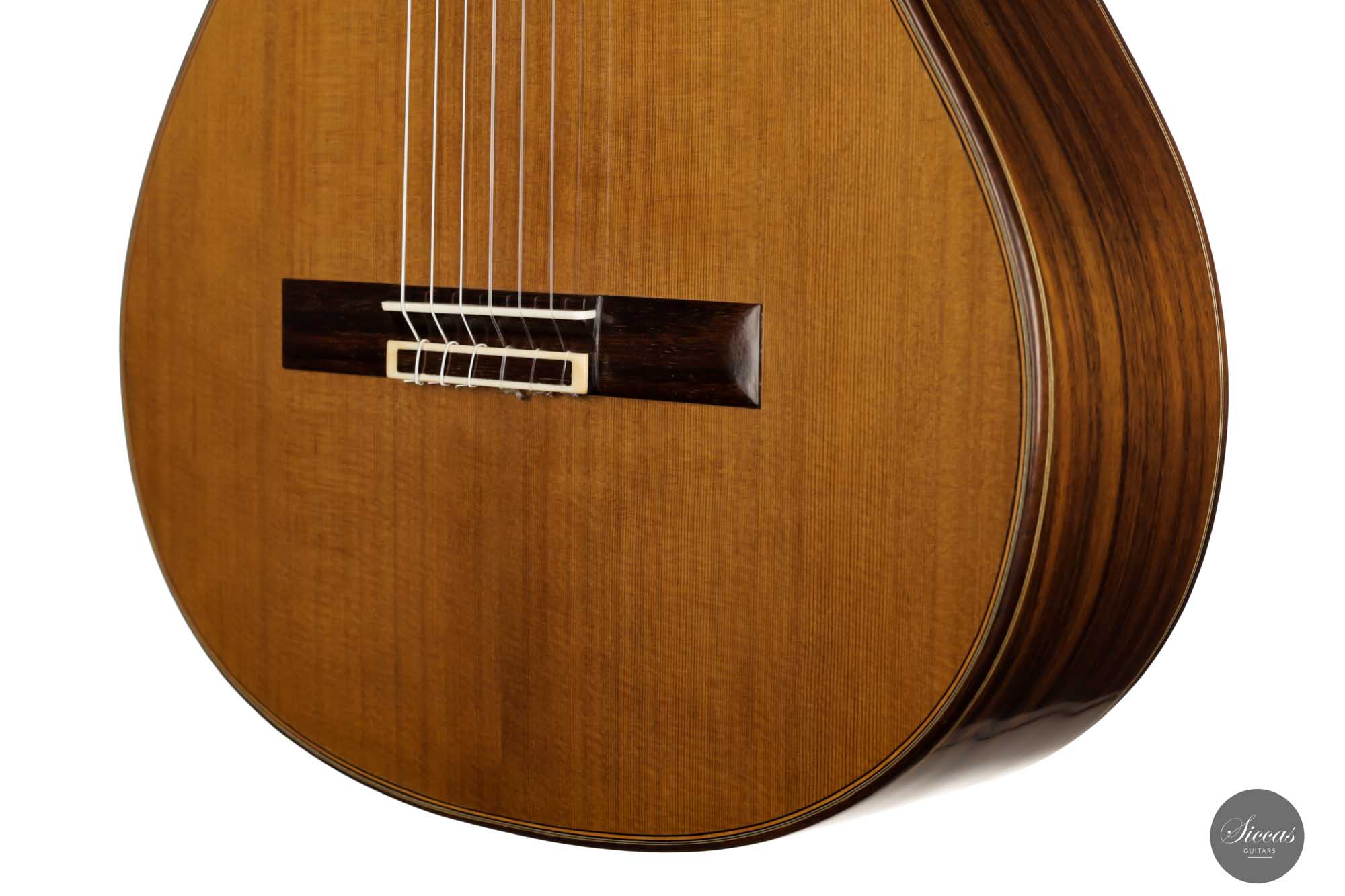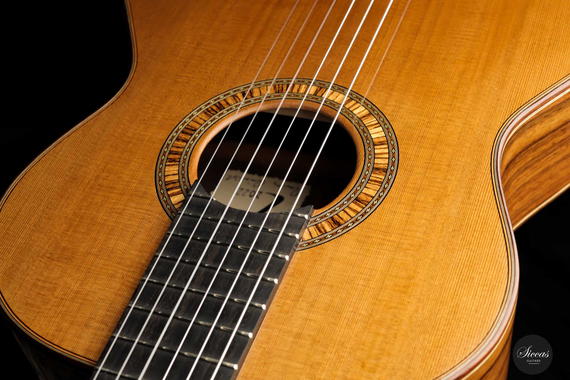 Diese neue Gitarre von 2022 hat eine Zederndecke und Boden und Zargen aus indischem Palisander. Sie hat eine saubere Verarbeitung, eine sehr kraftvolle, warme, zedernartige Stimme und eine fantastische Spielbarkeit. Es ist eine Konzertgitarre, die zum Spielen gemacht ist und die Bedürfnisse der Gitarristen befriedigt. Dieses feine Instrument ist mit erstklassigen Scheller-Mechaniken ausgestattet und ist komplett französisch poliert. Besonders hervorzuheben sind die hervorragende Trennung der Stimmen und der weiche, satte Diskant. Die Bässe klingen warm und geben dem Instrument eine schöne tragende Tiefe.