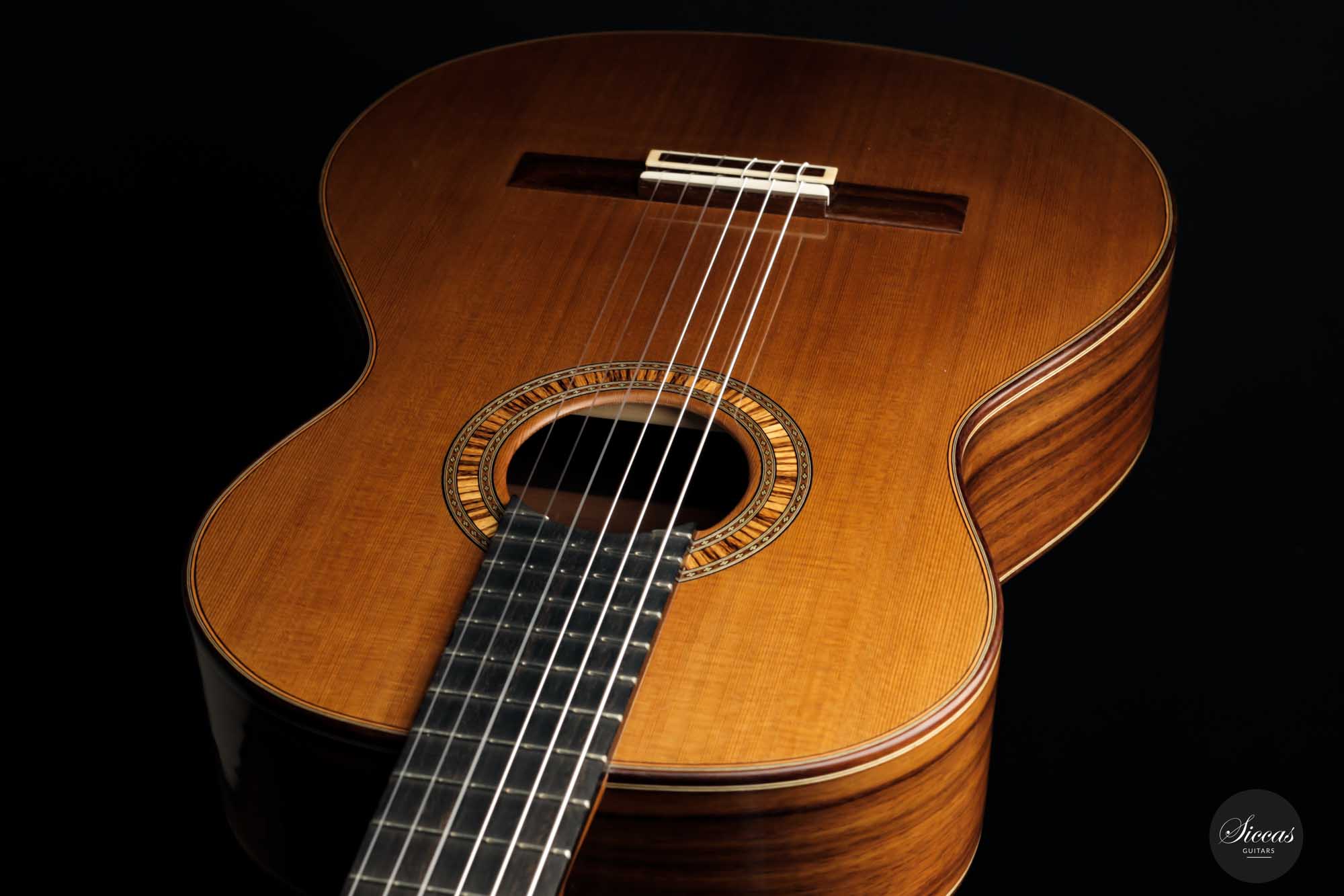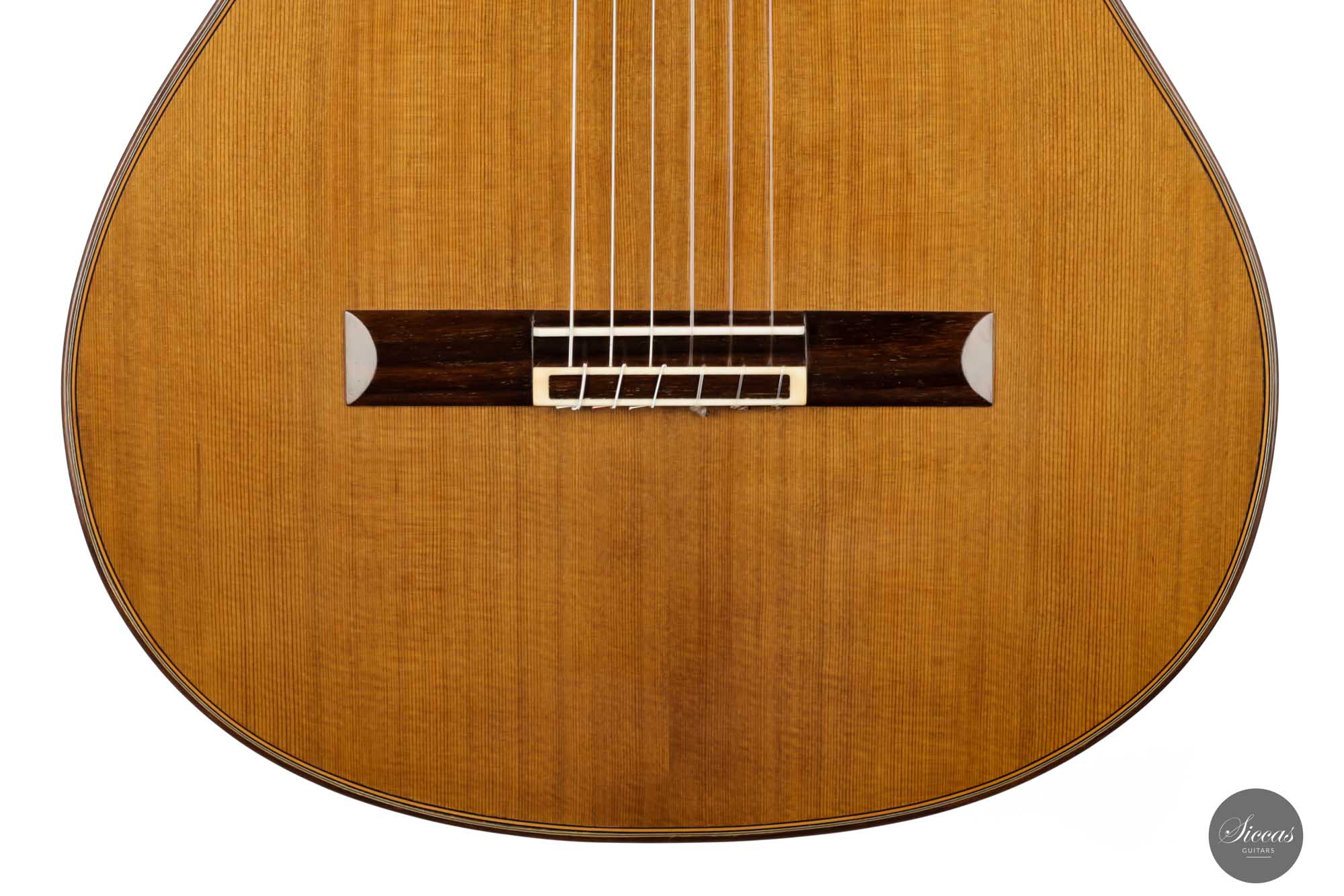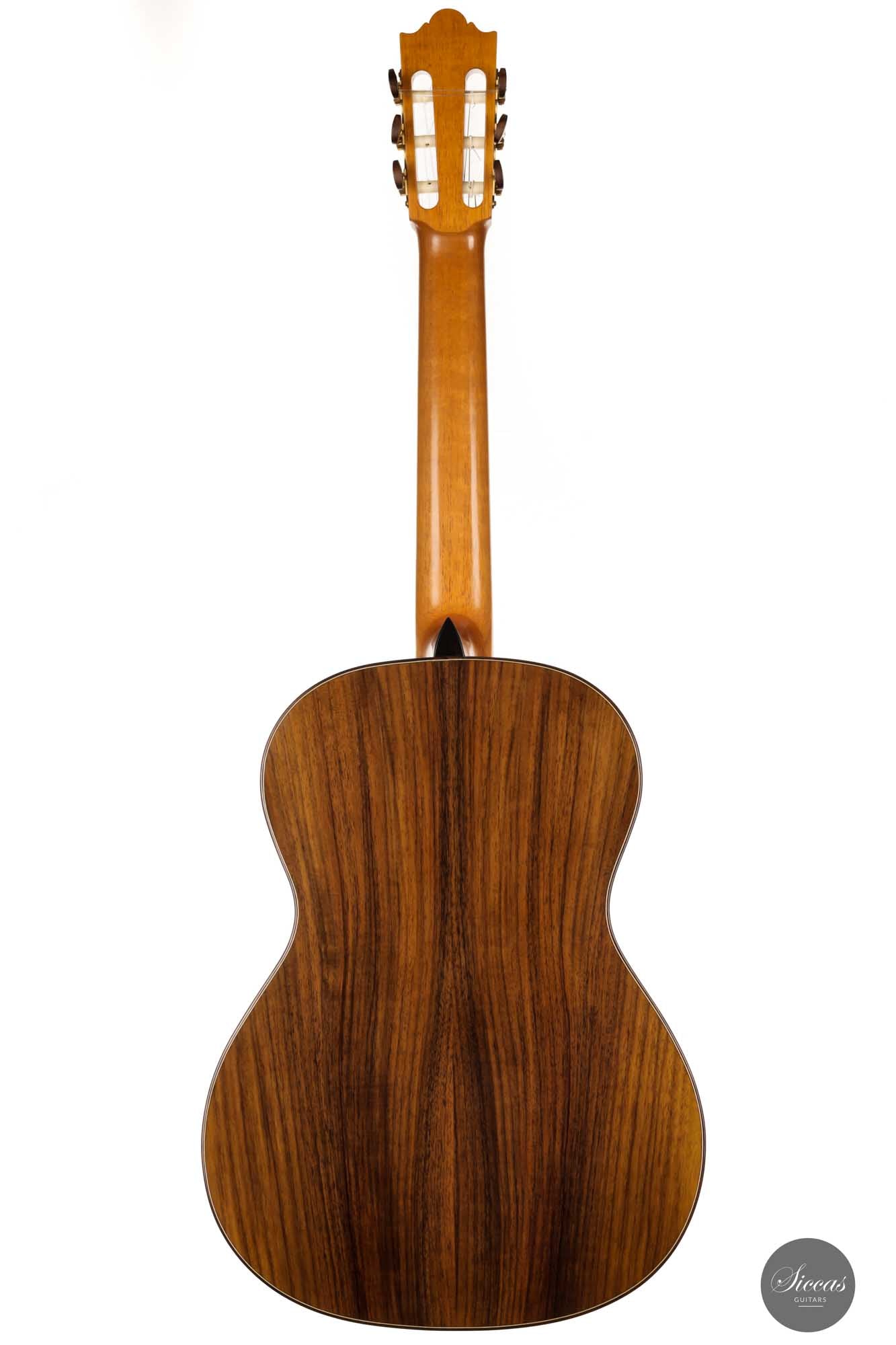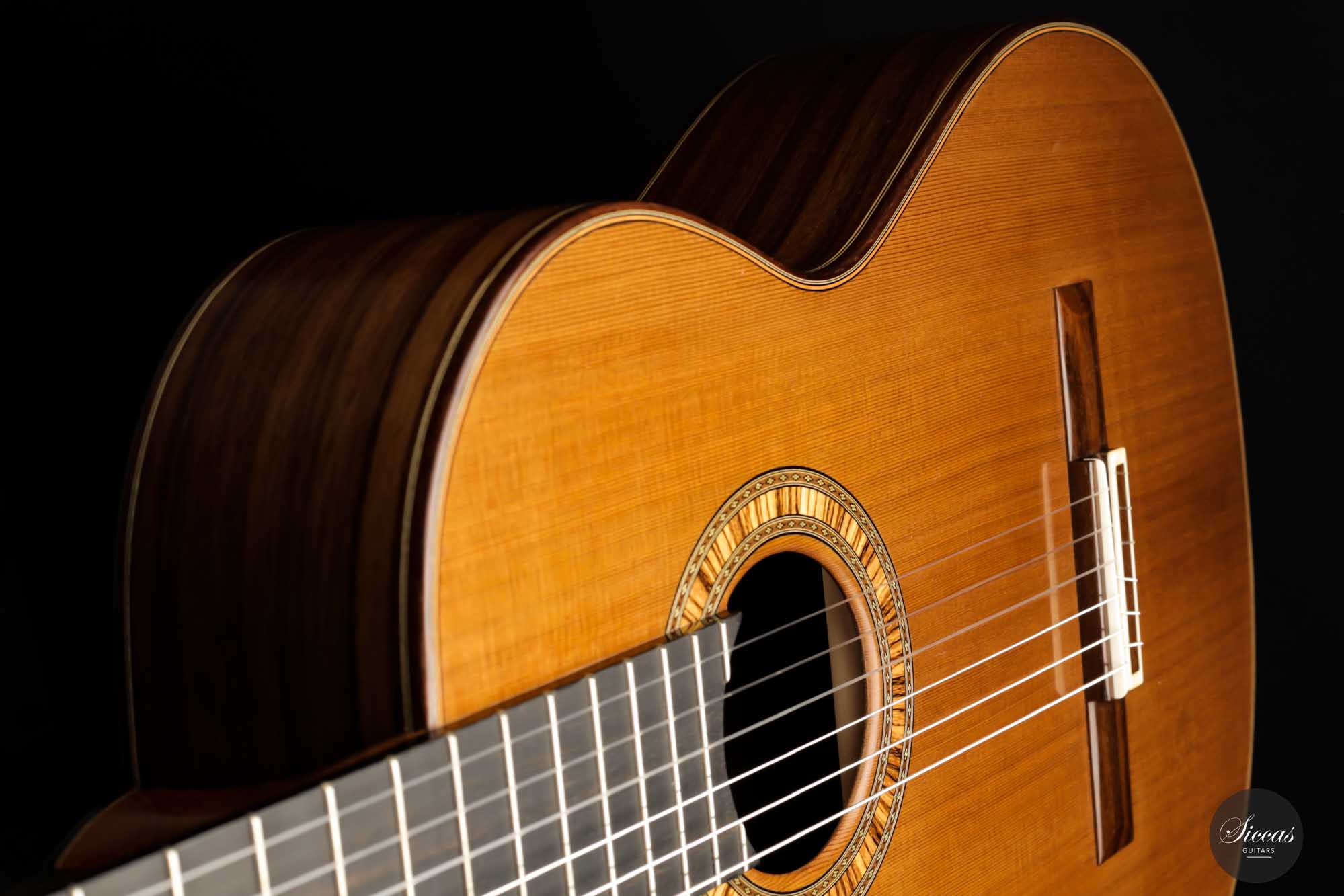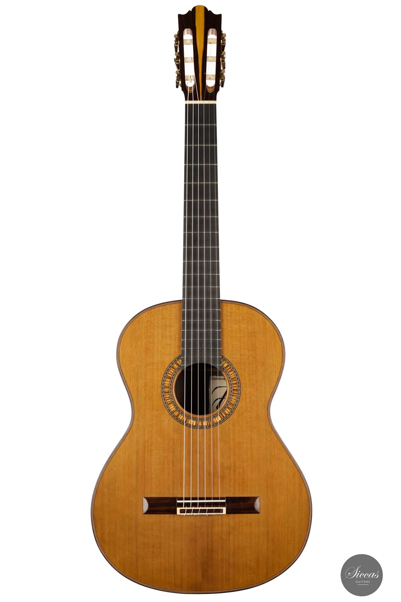 Diese neue Gitarre von 2022 hat eine Zederndecke und Boden und Zargen aus indischem Palisander. Sie hat eine saubere Verarbeitung, eine sehr kraftvolle, warme, zedernartige Stimme und eine fantastische Spielbarkeit. Es ist eine Konzertgitarre, die zum Spielen gemacht ist und die Bedürfnisse der Gitarristen befriedigt. Dieses feine Instrument ist mit erstklassigen Scheller-Mechaniken ausgestattet und ist komplett französisch poliert. Besonders hervorzuheben sind die hervorragende Trennung der Stimmen und der weiche, satte Diskant. Die Bässe klingen warm und geben dem Instrument eine schöne tragende Tiefe.