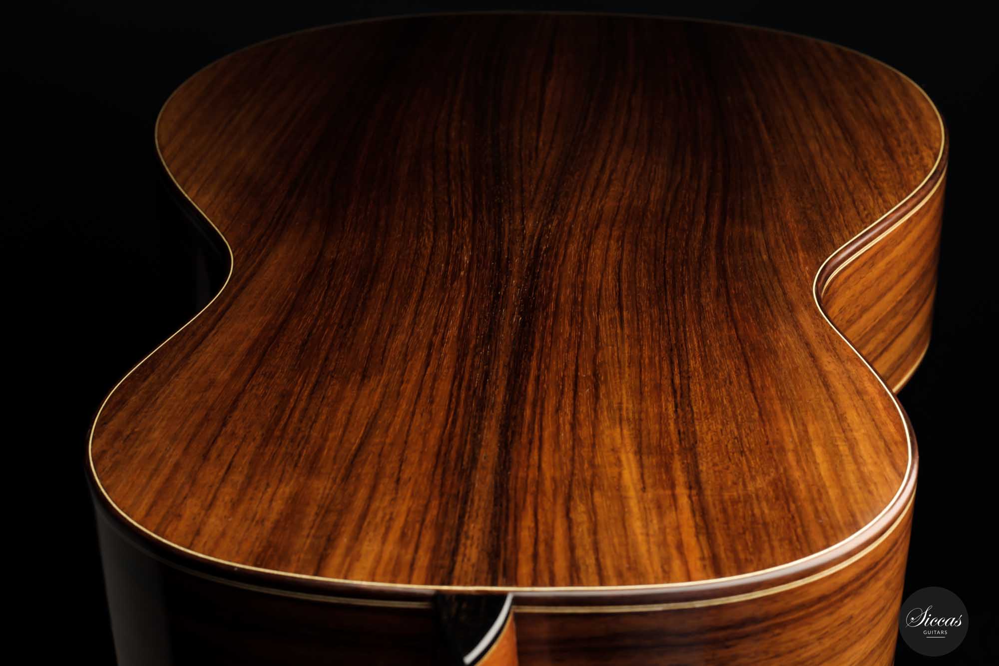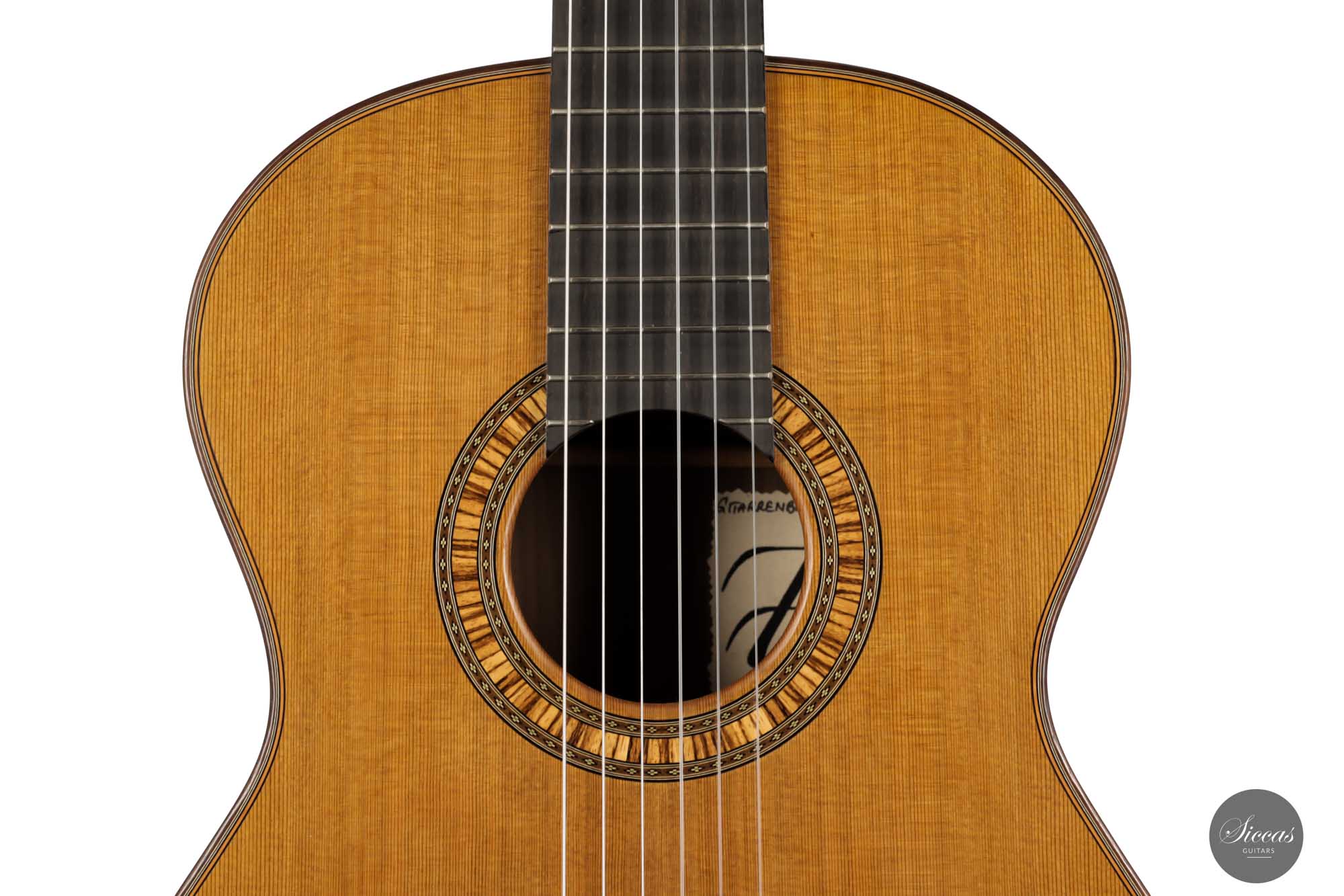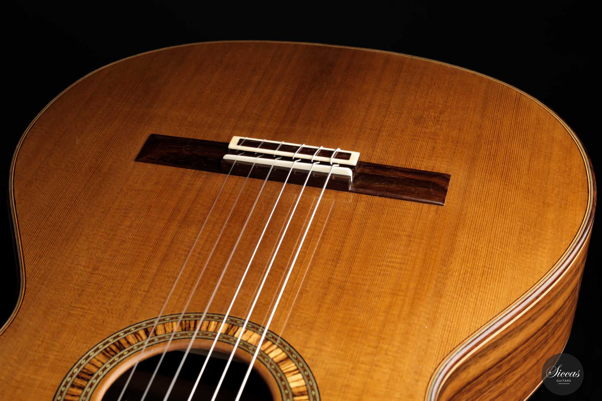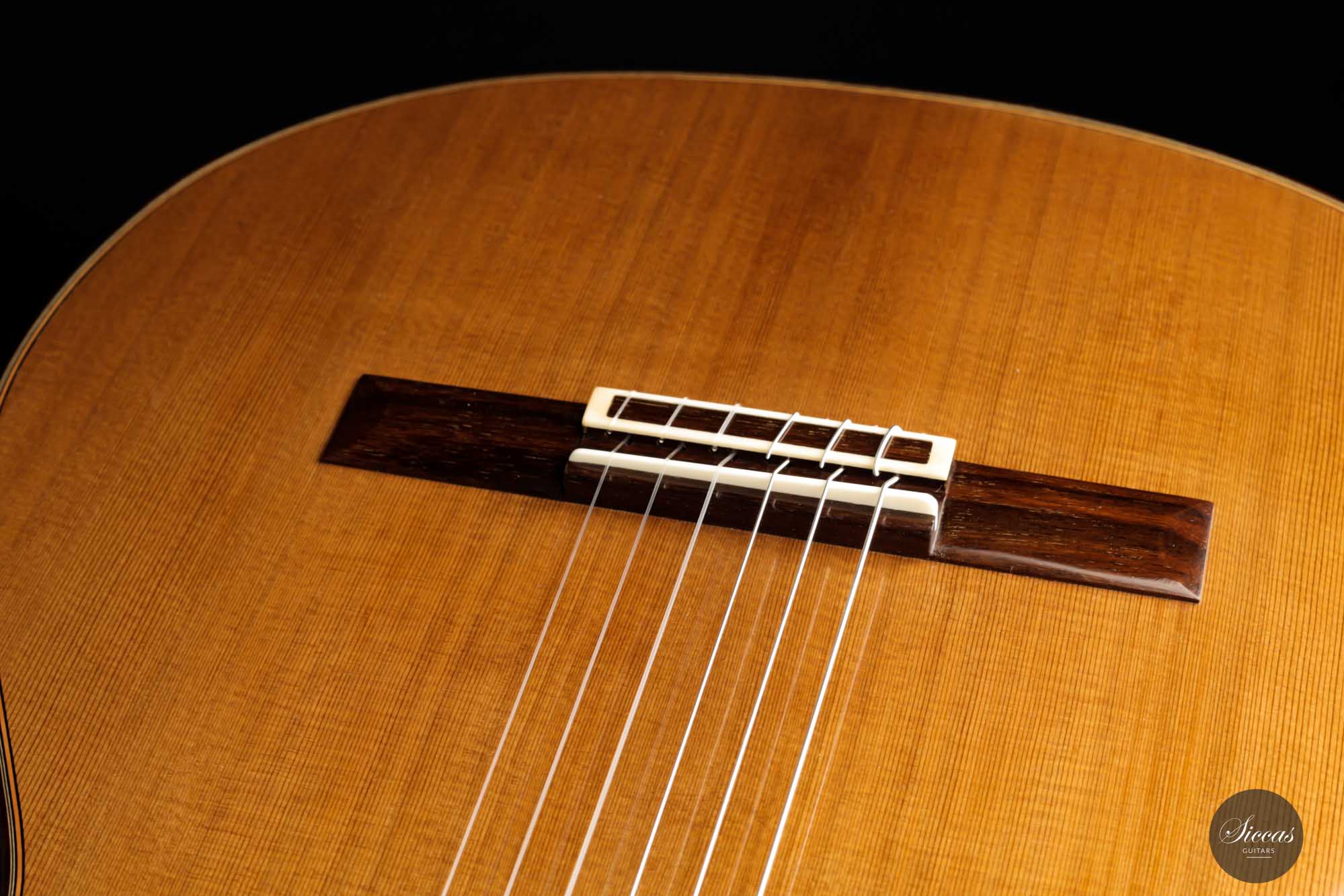 Diese neue Gitarre von 2022 hat eine Zederndecke und Boden und Zargen aus indischem Palisander. Sie hat eine saubere Verarbeitung, eine sehr kraftvolle, warme, zedernartige Stimme und eine fantastische Spielbarkeit. Es ist eine Konzertgitarre, die zum Spielen gemacht ist und die Bedürfnisse der Gitarristen befriedigt. Dieses feine Instrument ist mit erstklassigen Scheller-Mechaniken ausgestattet und ist komplett französisch poliert. Besonders hervorzuheben sind die hervorragende Trennung der Stimmen und der weiche, satte Diskant. Die Bässe klingen warm und geben dem Instrument eine schöne tragende Tiefe.