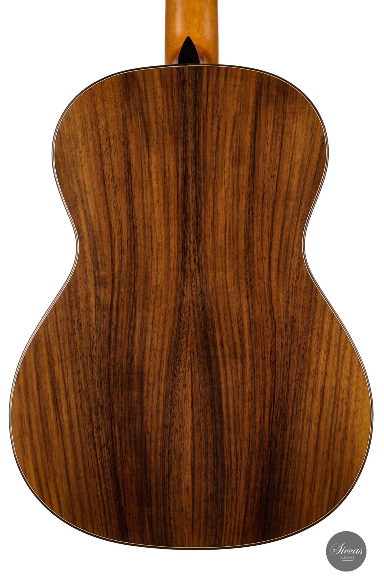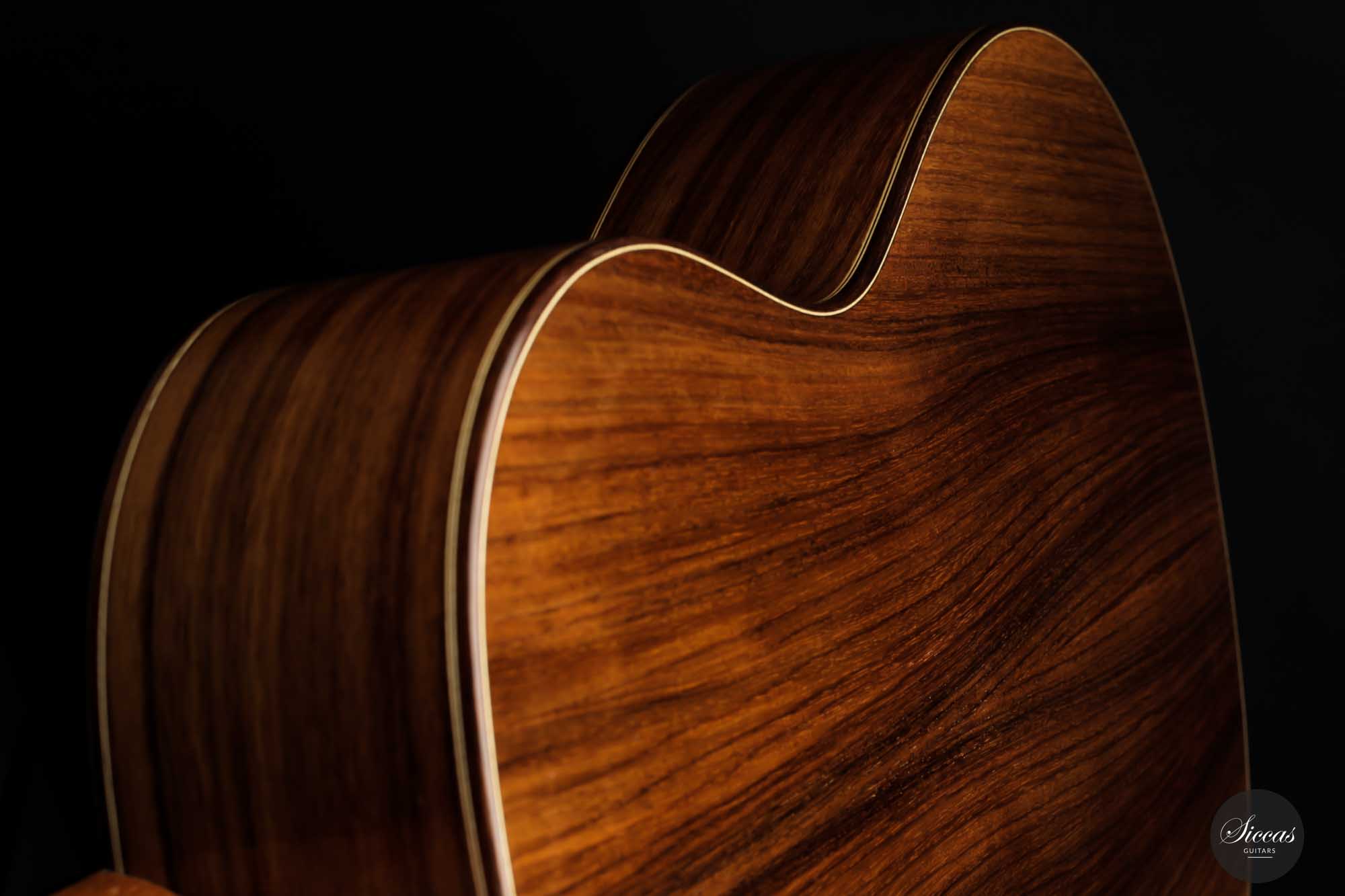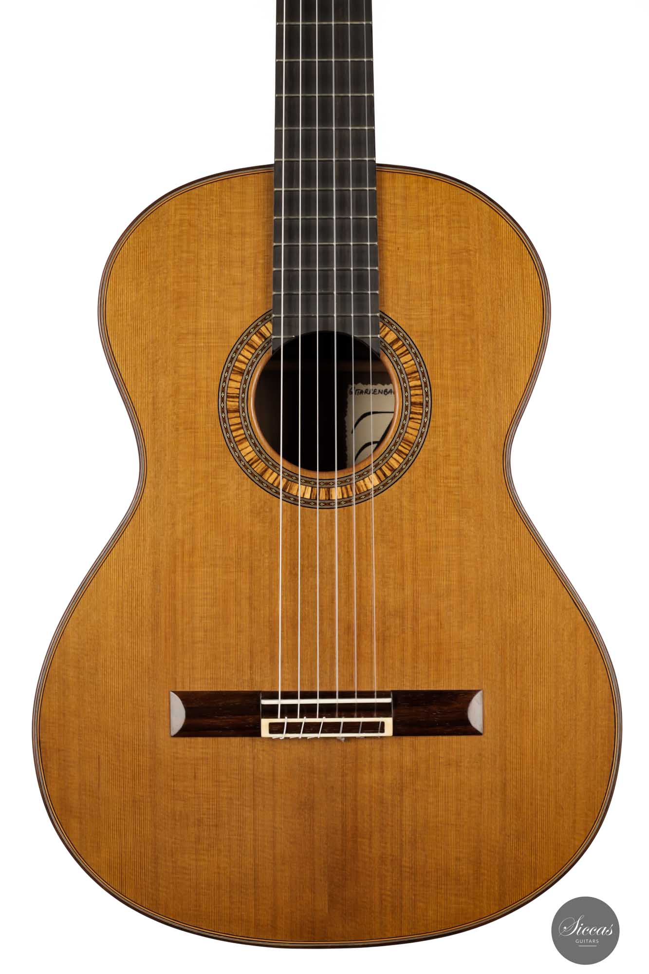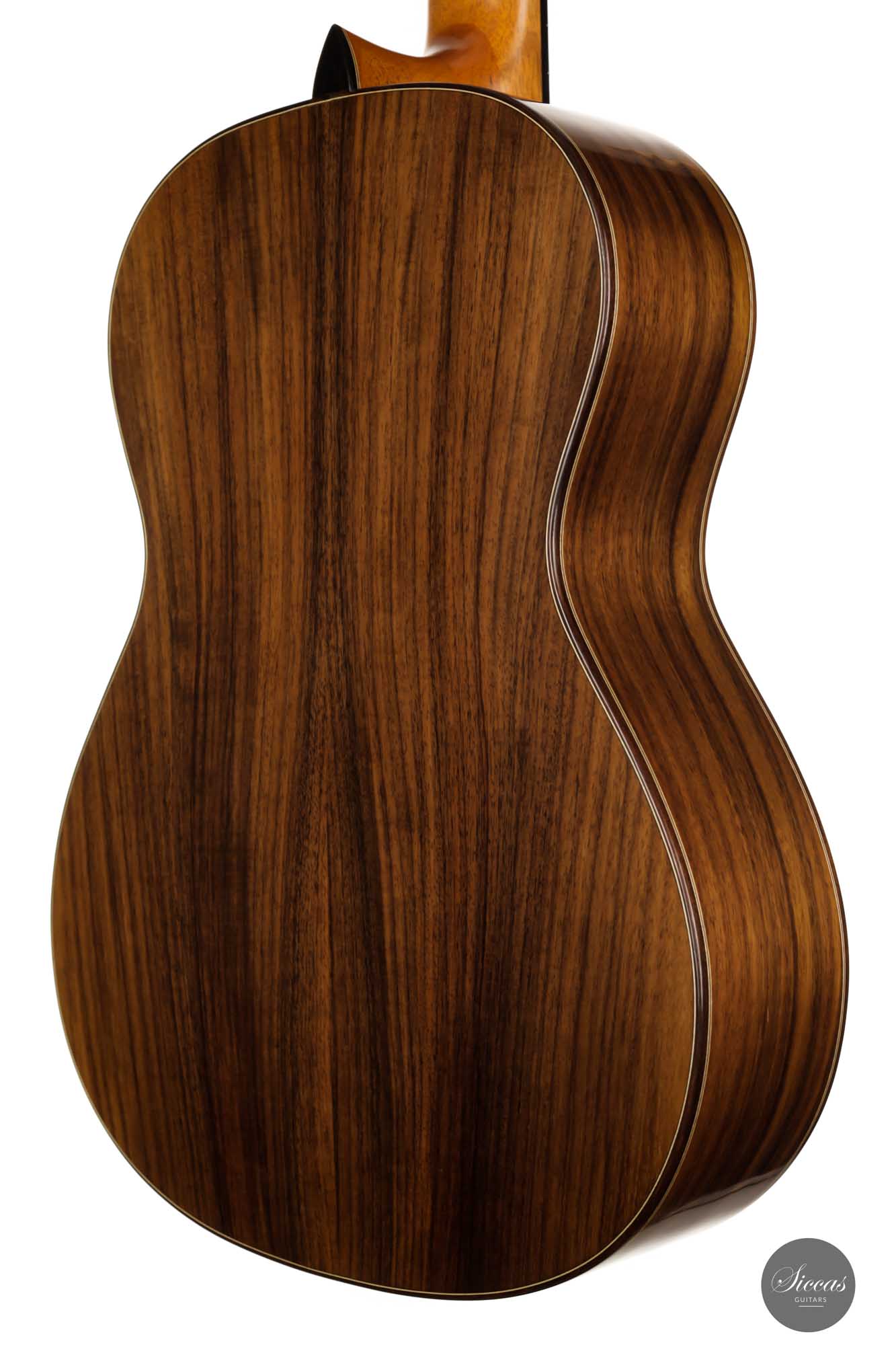 Diese neue Gitarre von 2022 hat eine Zederndecke und Boden und Zargen aus indischem Palisander. Sie hat eine saubere Verarbeitung, eine sehr kraftvolle, warme, zedernartige Stimme und eine fantastische Spielbarkeit. Es ist eine Konzertgitarre, die zum Spielen gemacht ist und die Bedürfnisse der Gitarristen befriedigt. Dieses feine Instrument ist mit erstklassigen Scheller-Mechaniken ausgestattet und ist komplett französisch poliert. Besonders hervorzuheben sind die hervorragende Trennung der Stimmen und der weiche, satte Diskant. Die Bässe klingen warm und geben dem Instrument eine schöne tragende Tiefe.