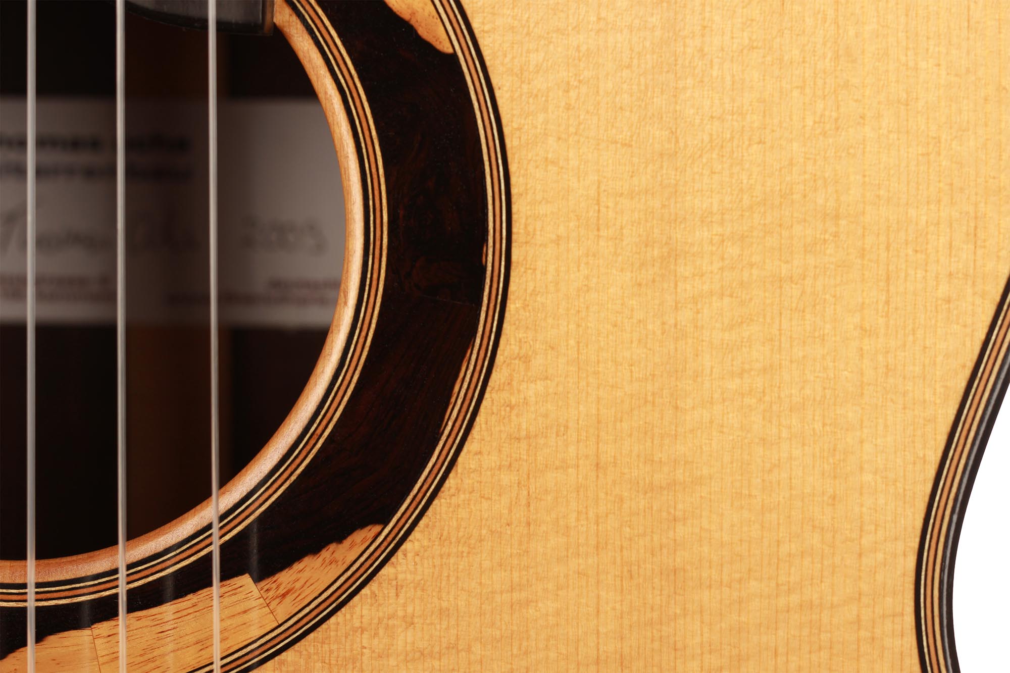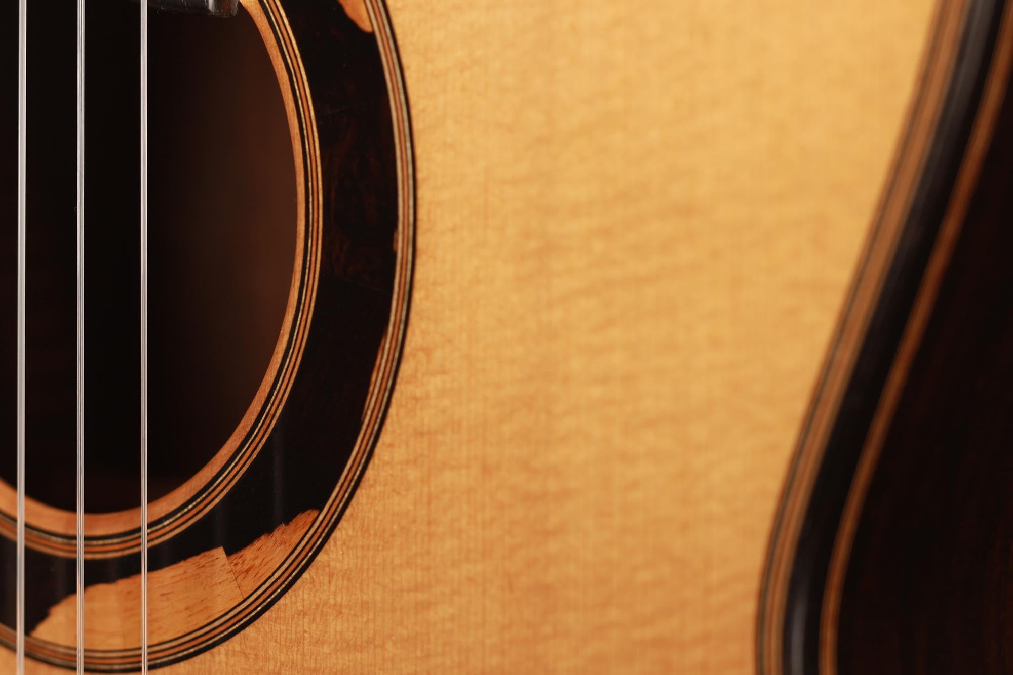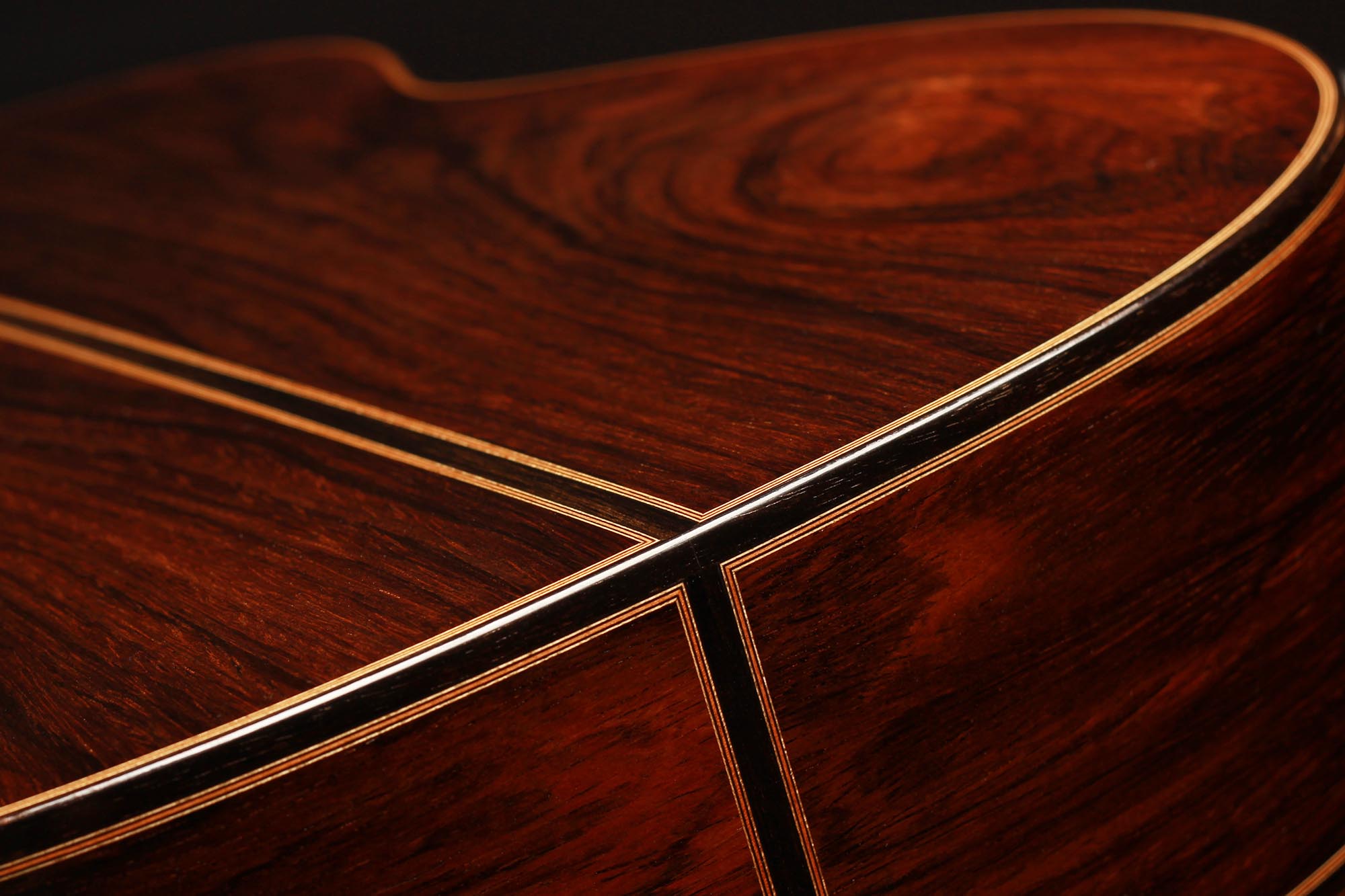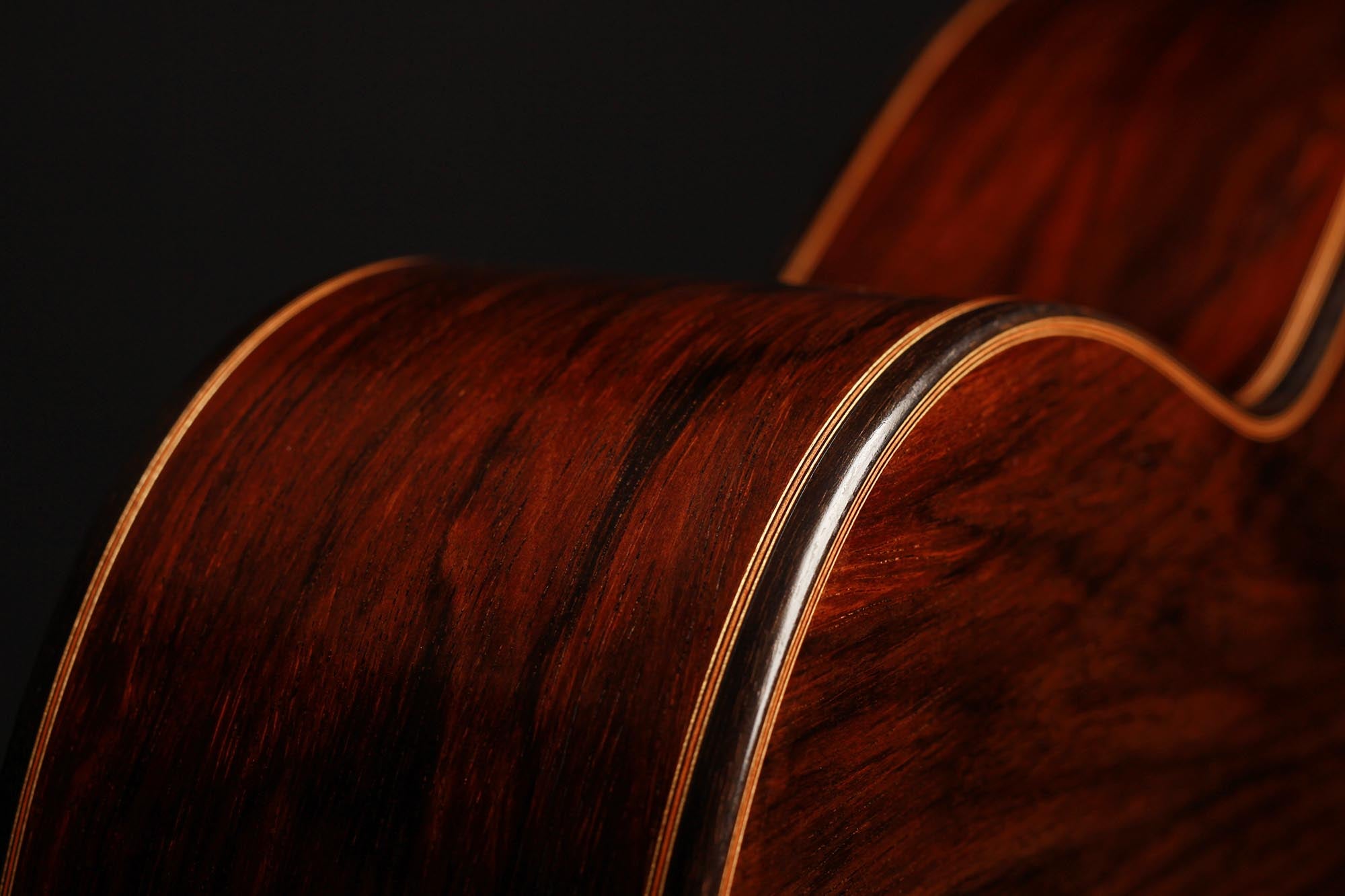 The spruce top has a traditional symmetrical seven-fan bracing and both top and back are slightly arched. A gorgeous Madagascar rosewood set with a deep dark colour and lovely figured grain was chosen for this guitar. The ornaments are classy elegant, with a rosette of solid wood inlays that are distinctive of Thomas Ochs guitars.