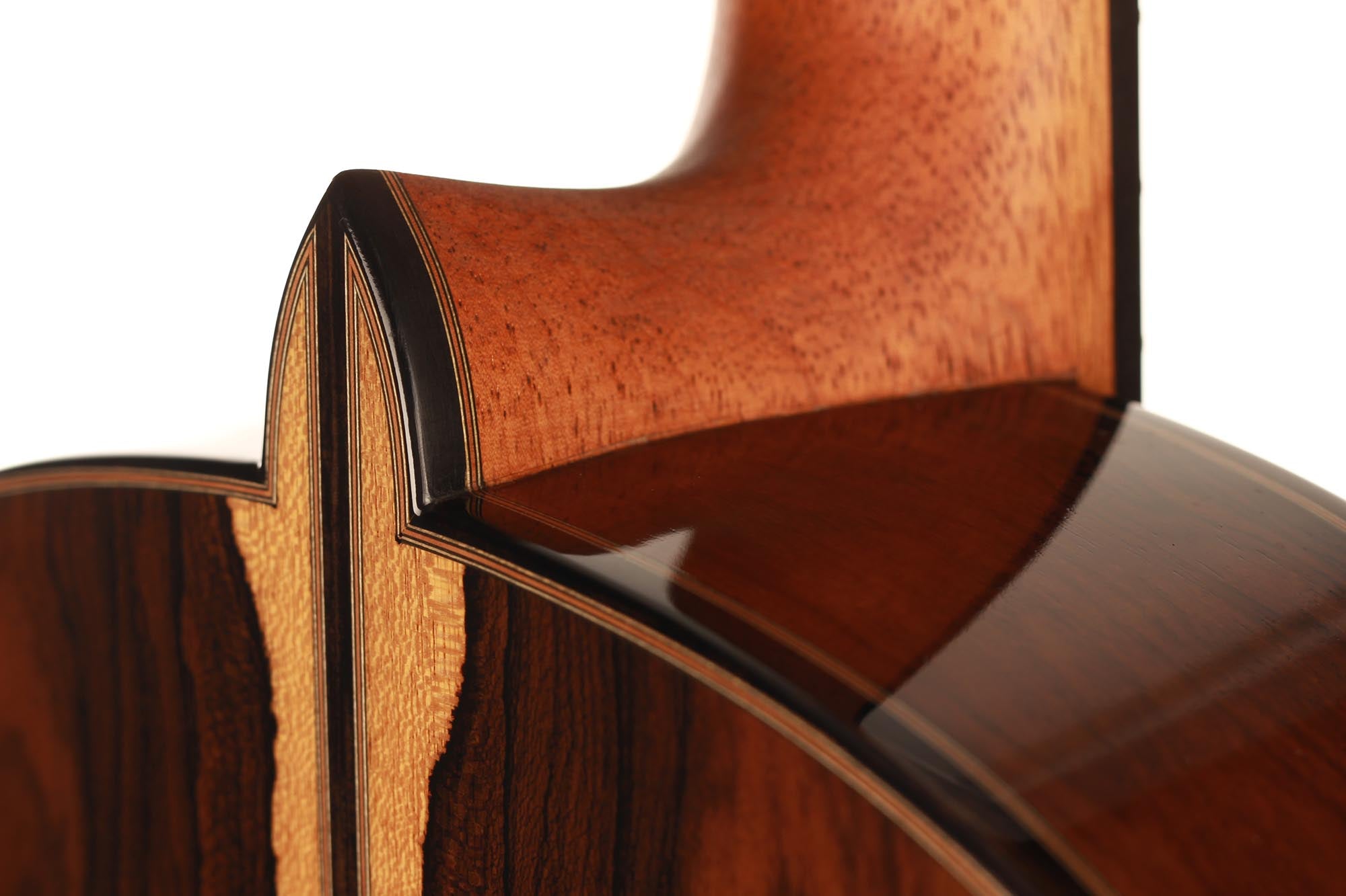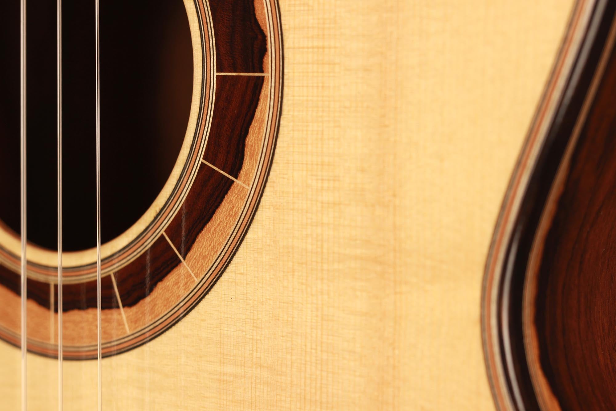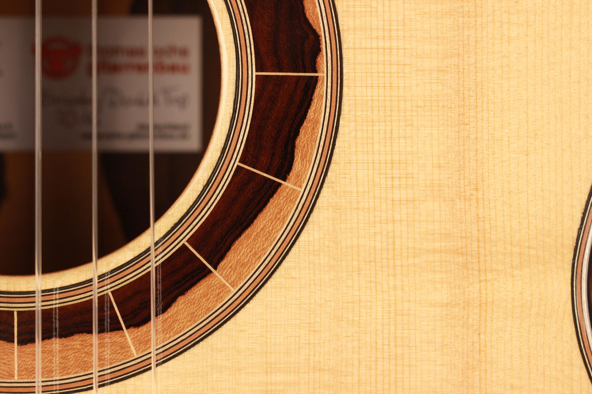 This guitar was designed to be easy to play. It features an ergonomic waxed neck, an elevated fingerboard and a lightly rounded fretboard. The sound is direct and powerful with clear and brilliant trebles. It is overall very balanced and has a mature complex tone. It is a very fine doubletop guitar with a very stable and interesting sound.