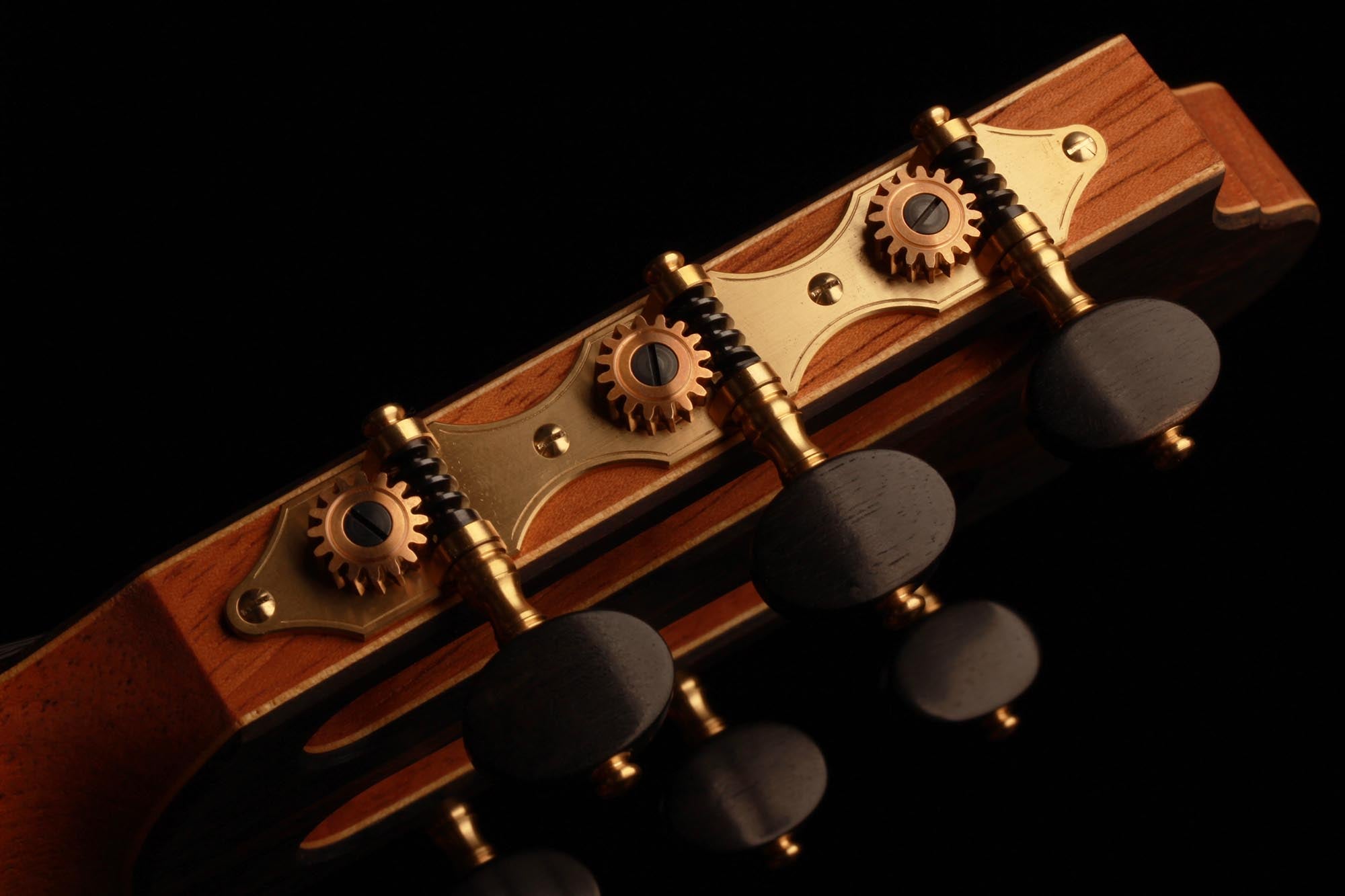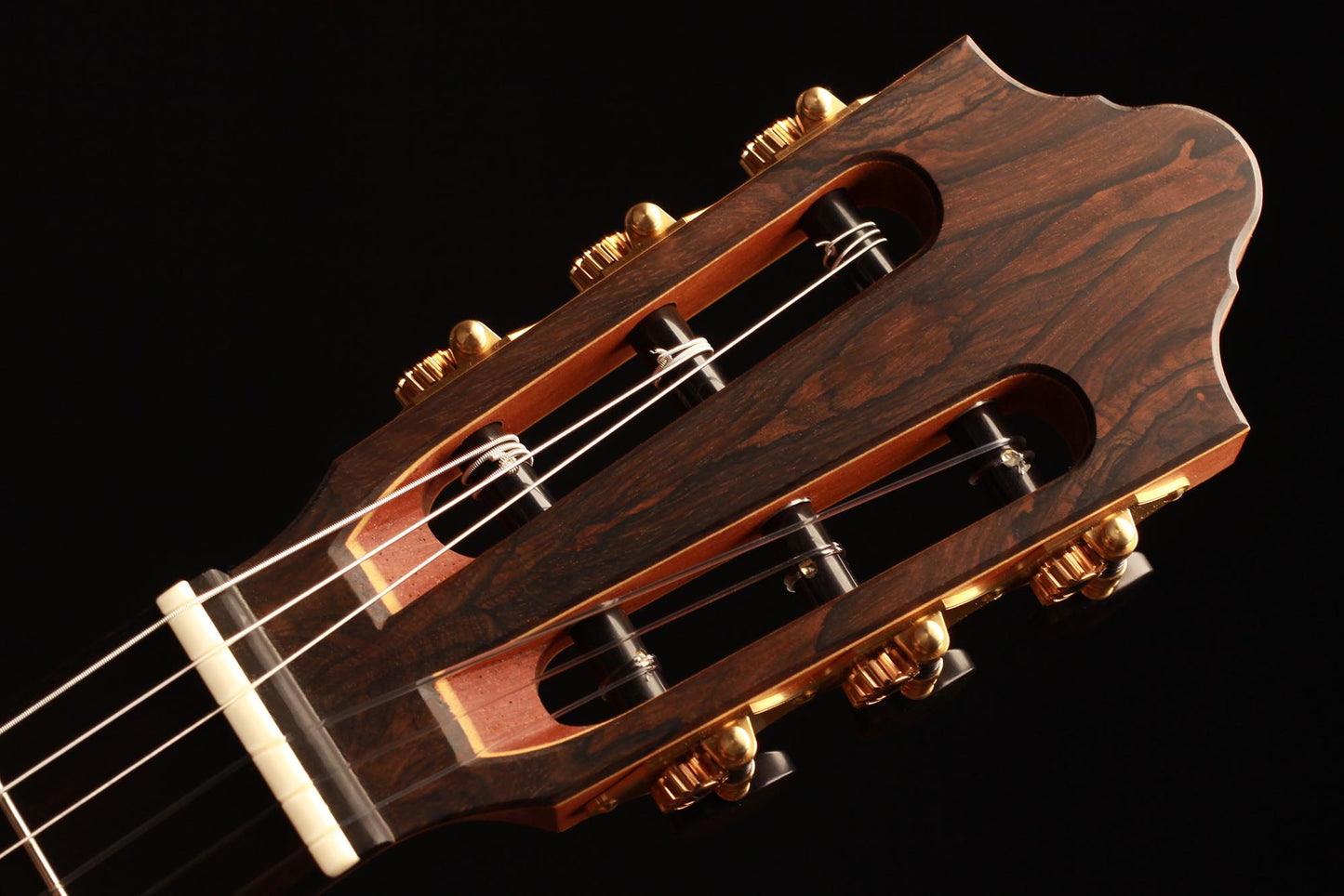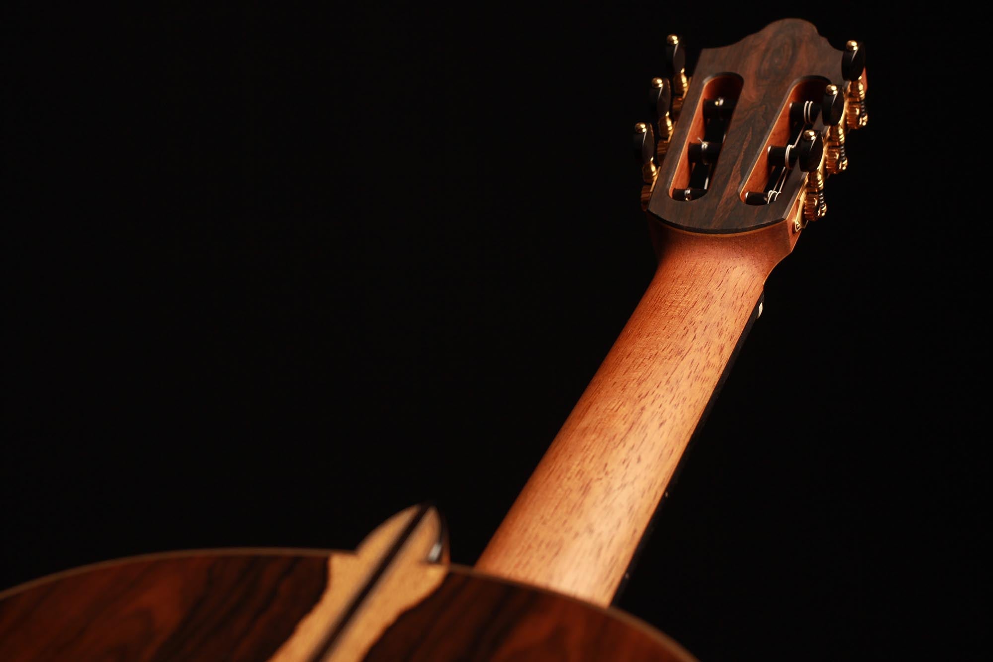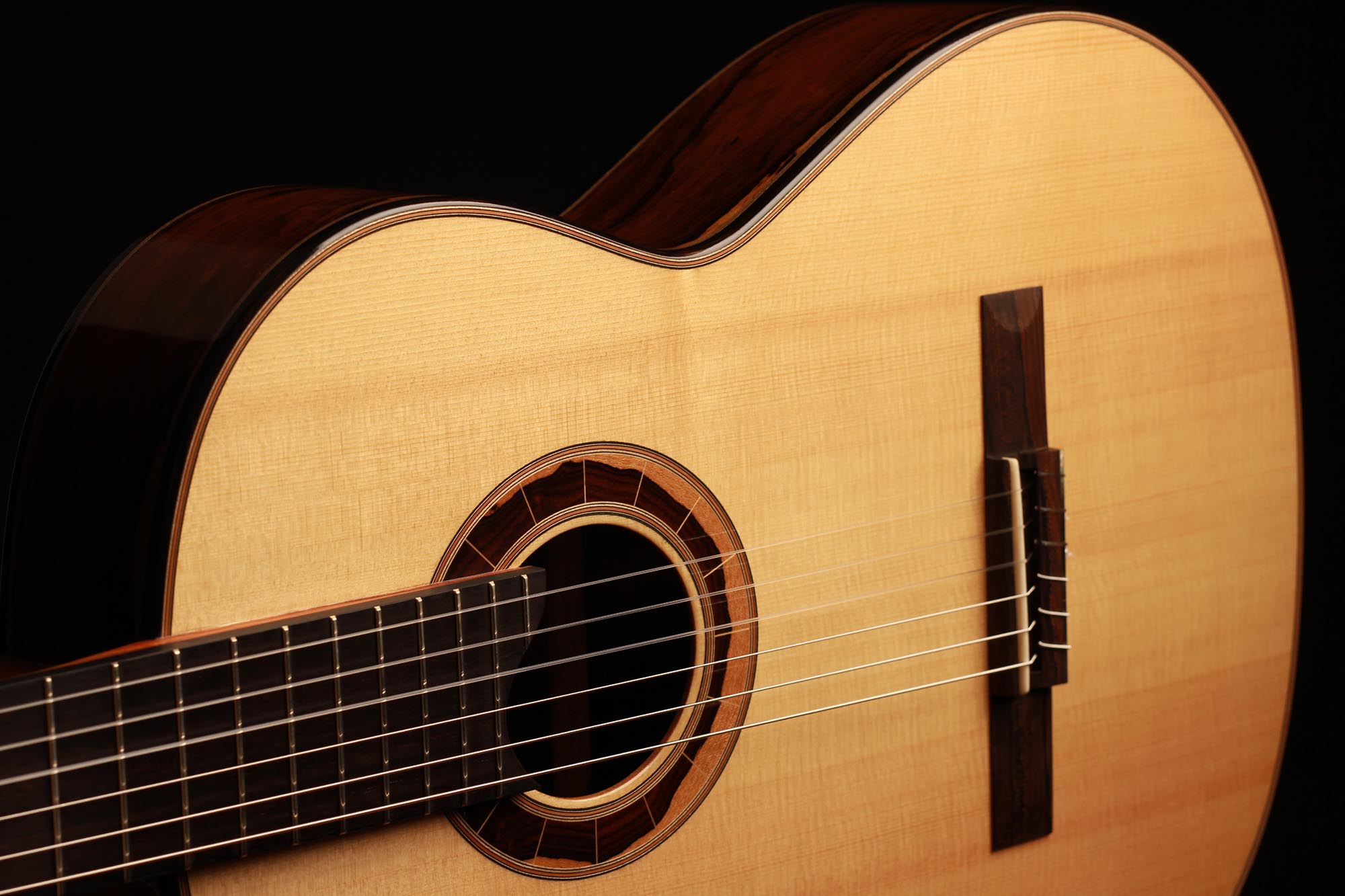 This guitar was designed to be easy to play. It features an ergonomic waxed neck, an elevated fingerboard and a lightly rounded fretboard. The sound is direct and powerful with clear and brilliant trebles. It is overall very balanced and has a mature complex tone. It is a very fine doubletop guitar with a very stable and interesting sound.
